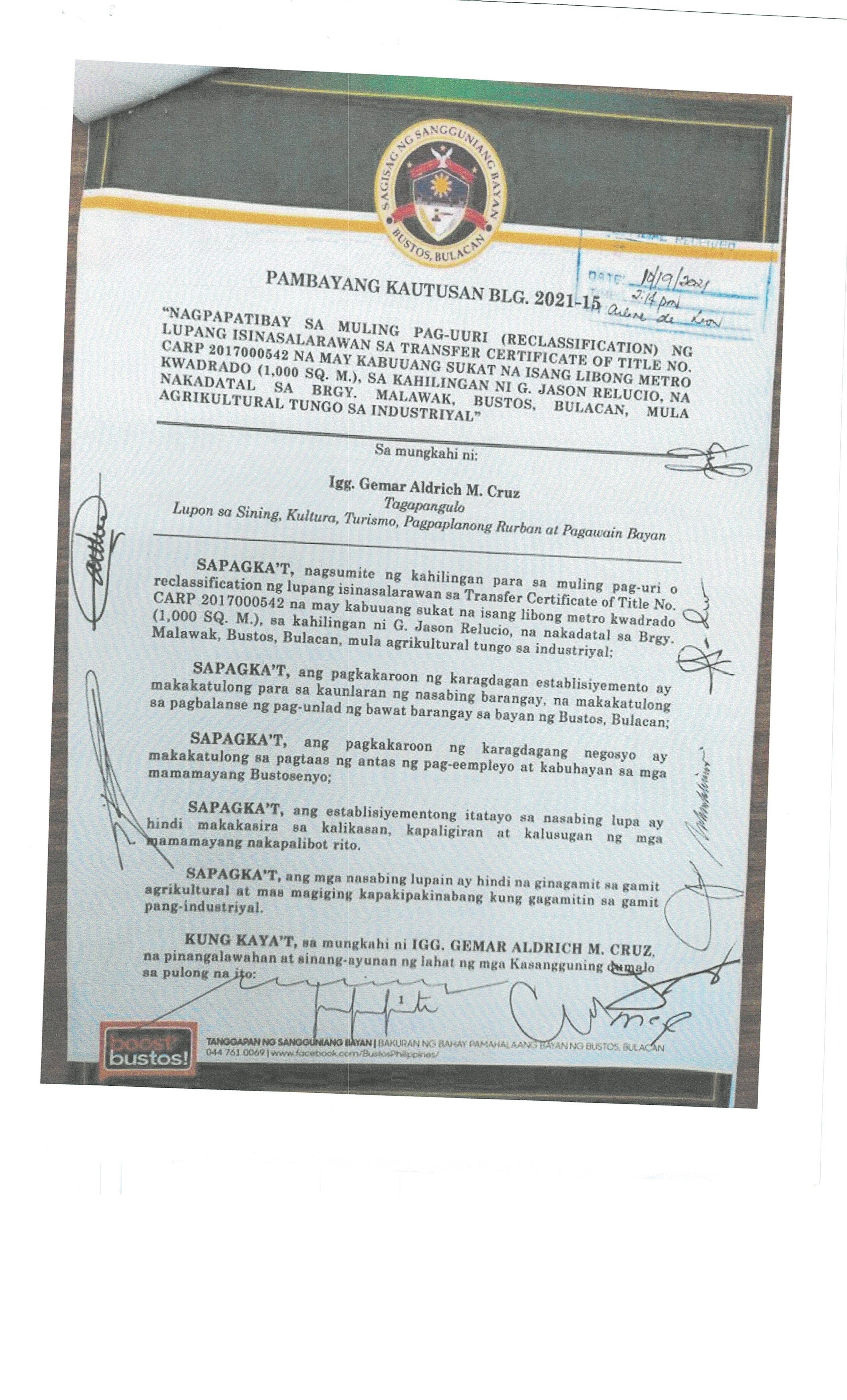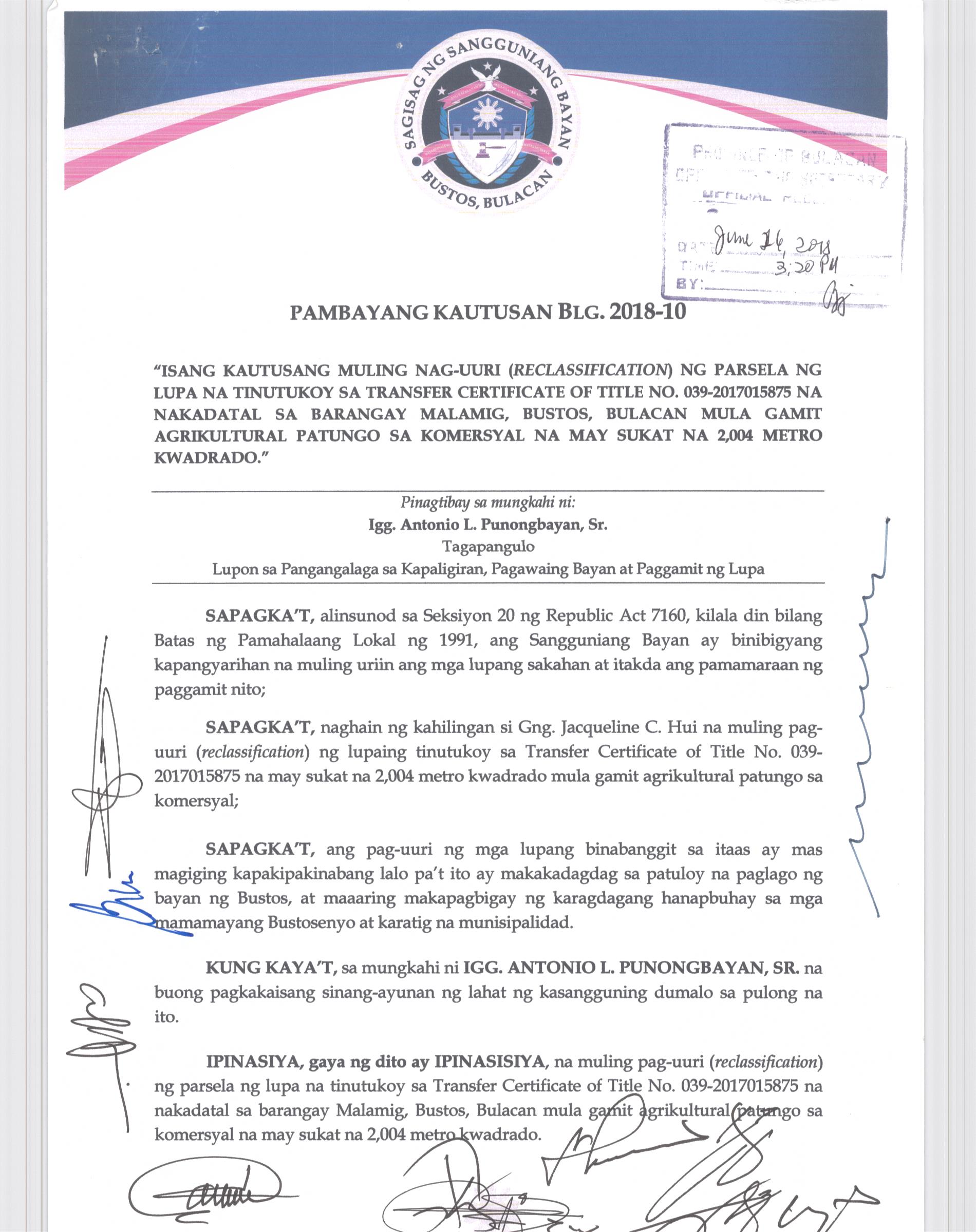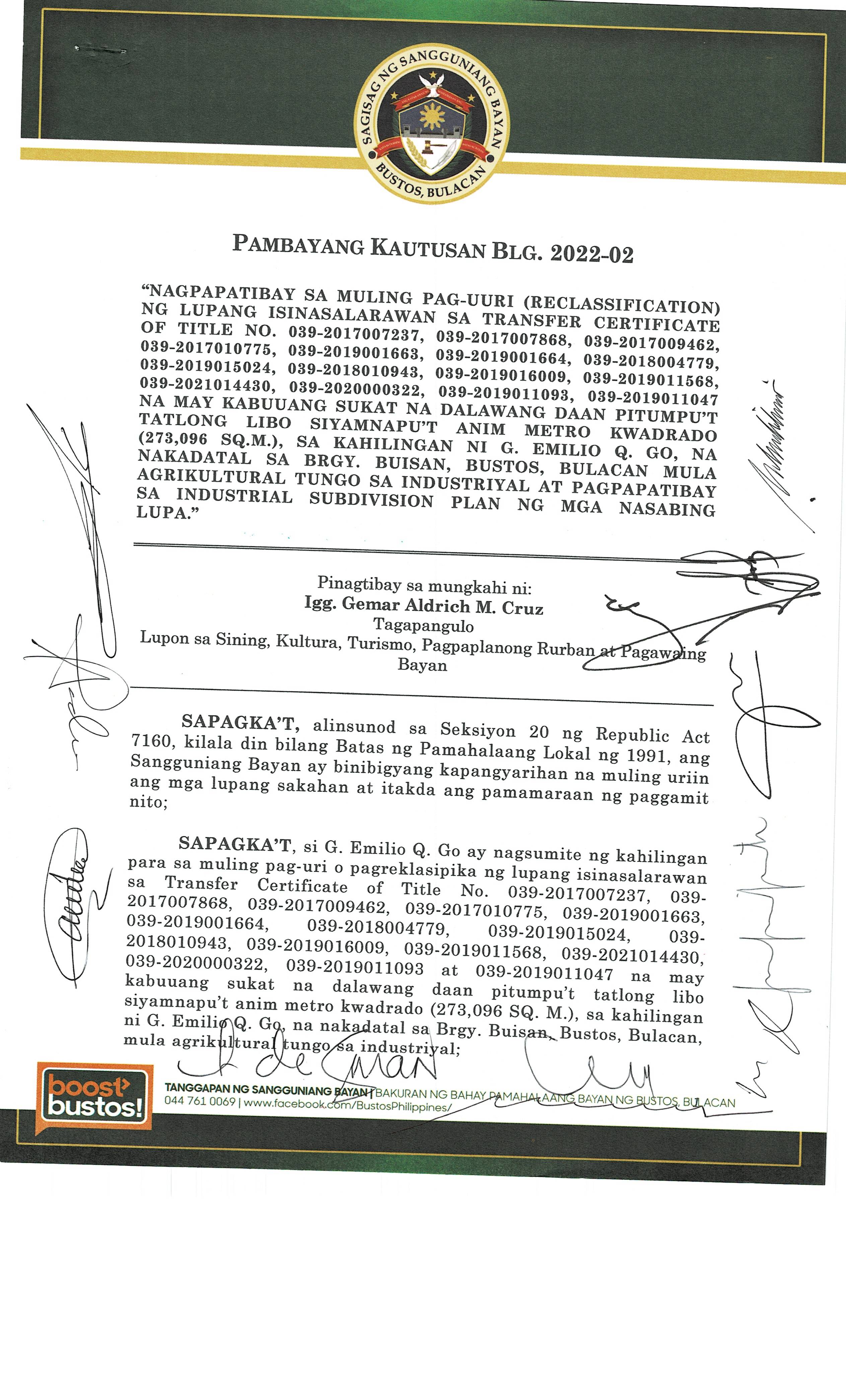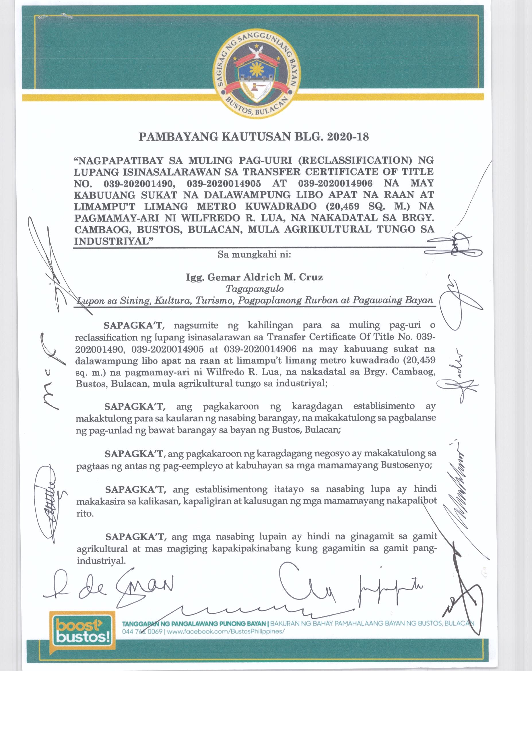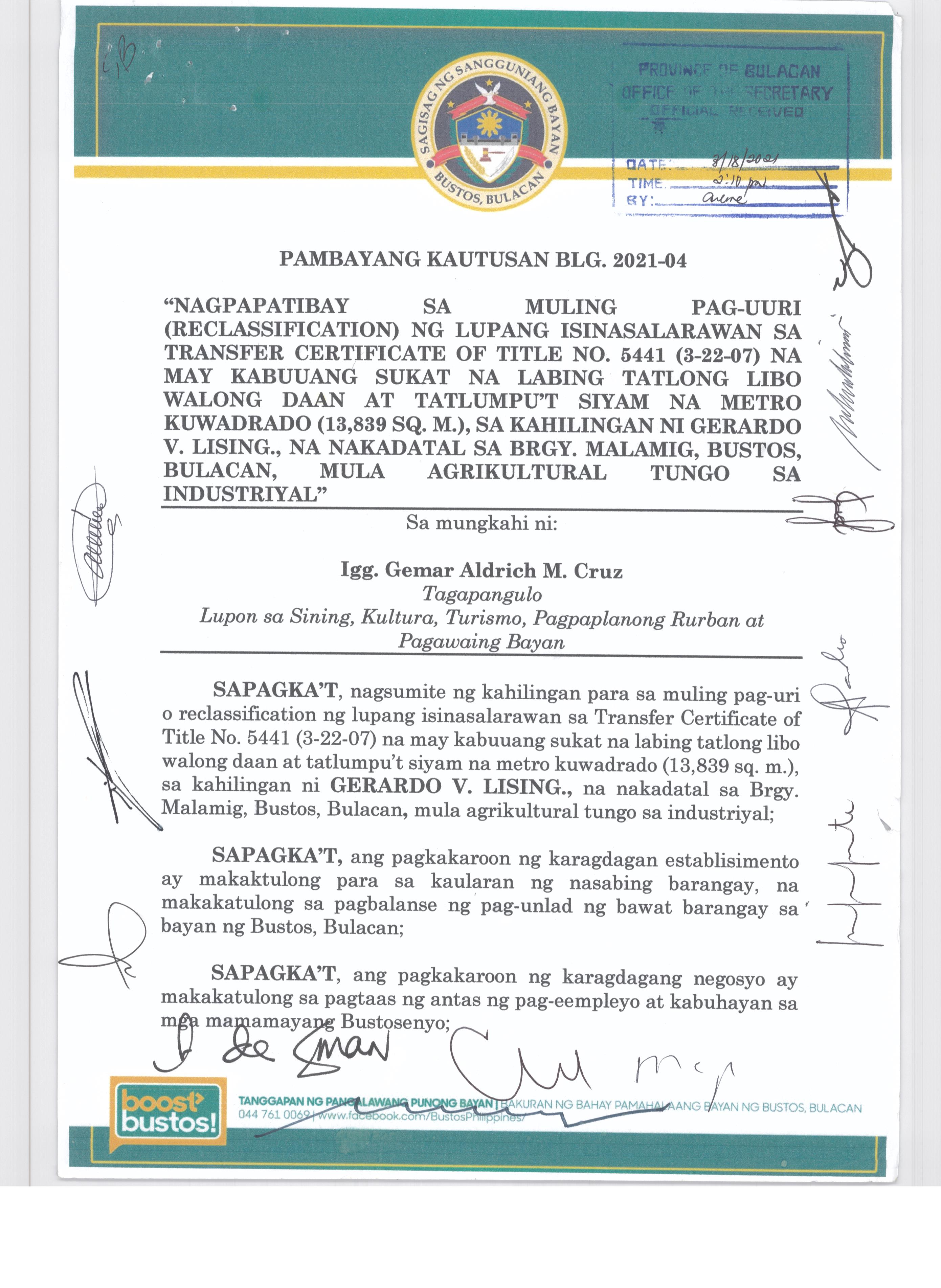 Pambayang Kautusang nagpapatibay sa kahilingan ni G. Adrian G. Santiago na muling pag-uuri ng lupa sa Barangay Bonga Menor Bustos Bulacan na may sukat na 2 ektarya buhat sa kabuuangsukat na 4.3 ektarya na isinasalarawan sa Transfer Certificate Title No. 039-2016006393 (LOT 4-A of the Subd. Plan PSD-03-177744)