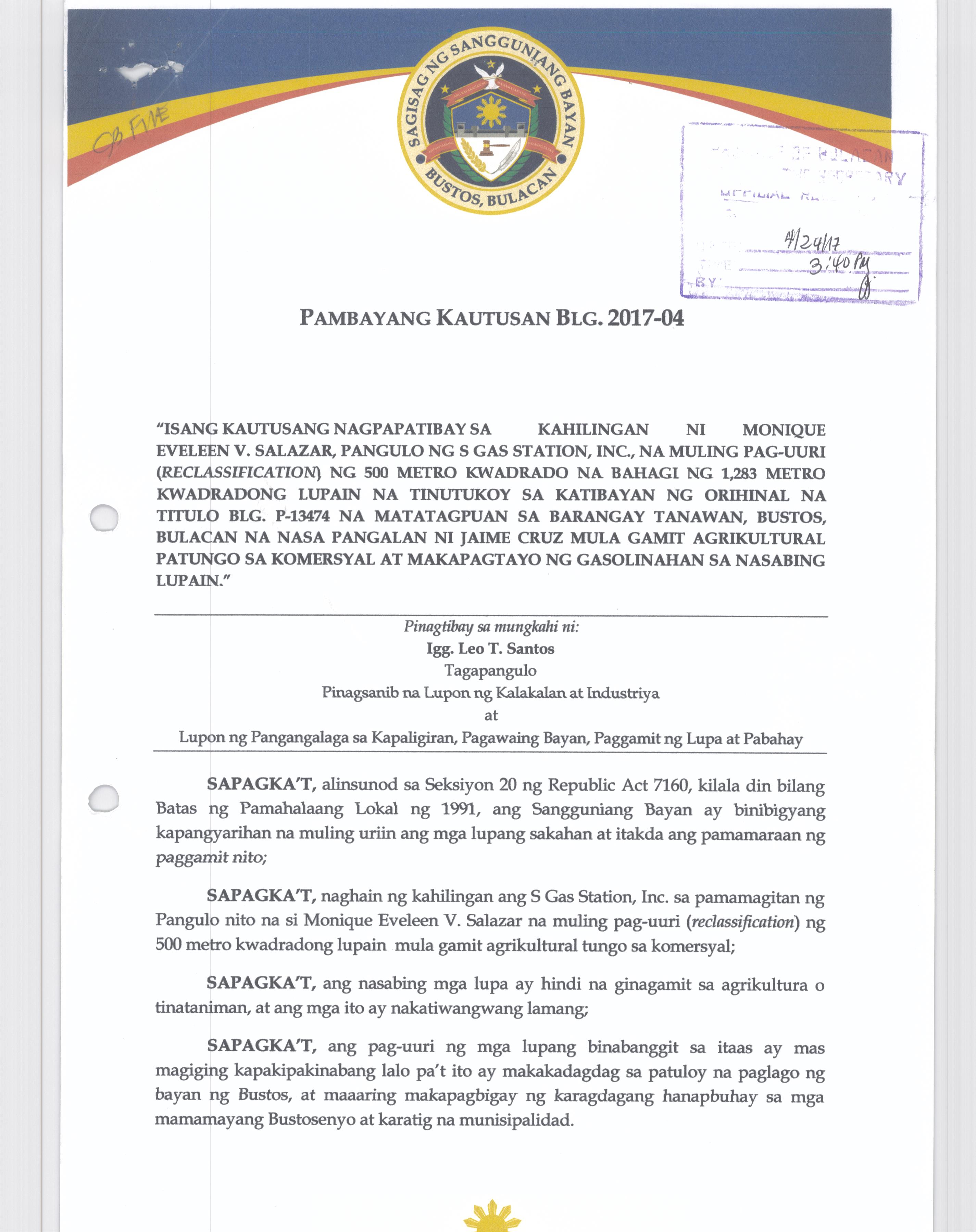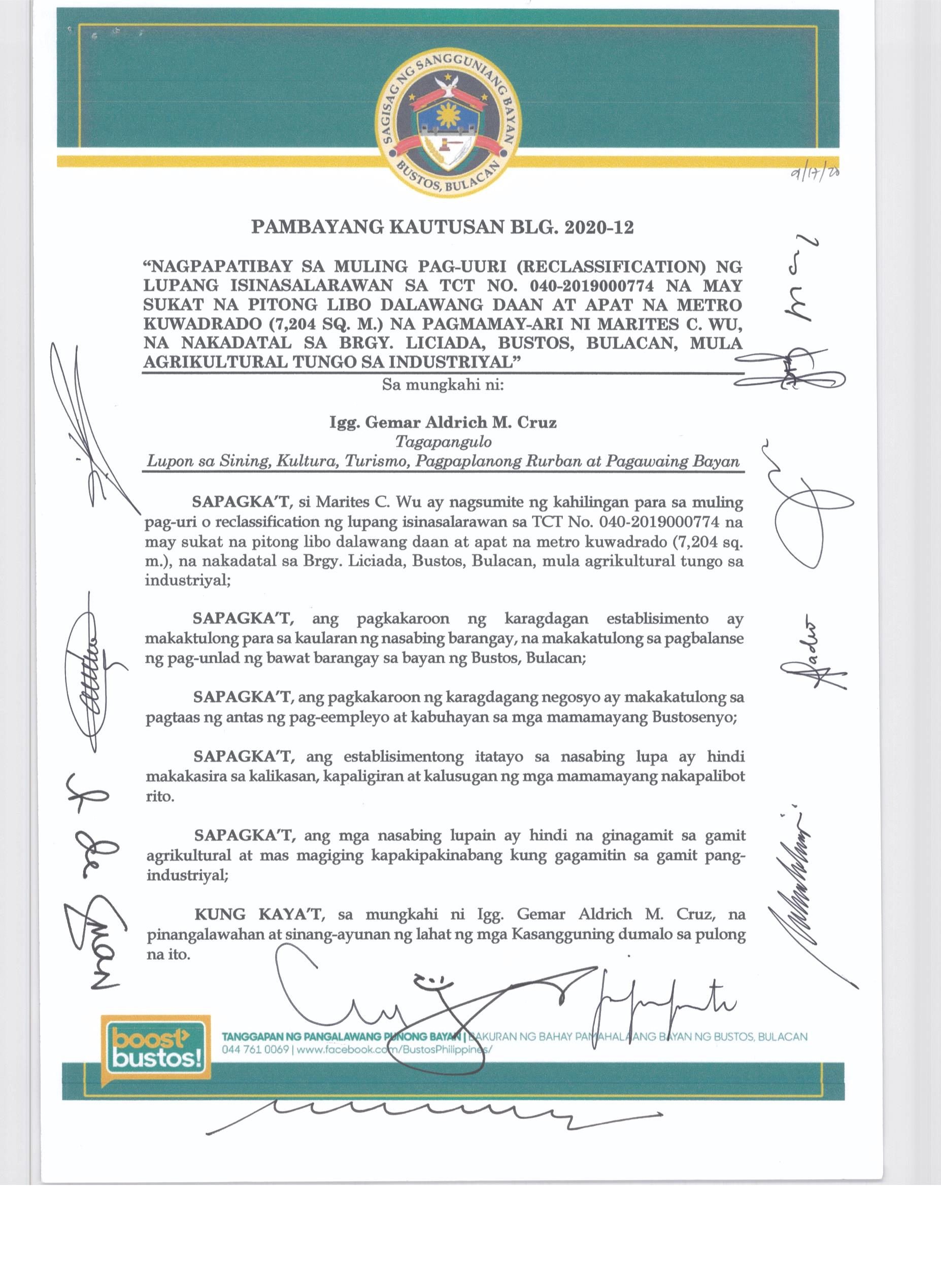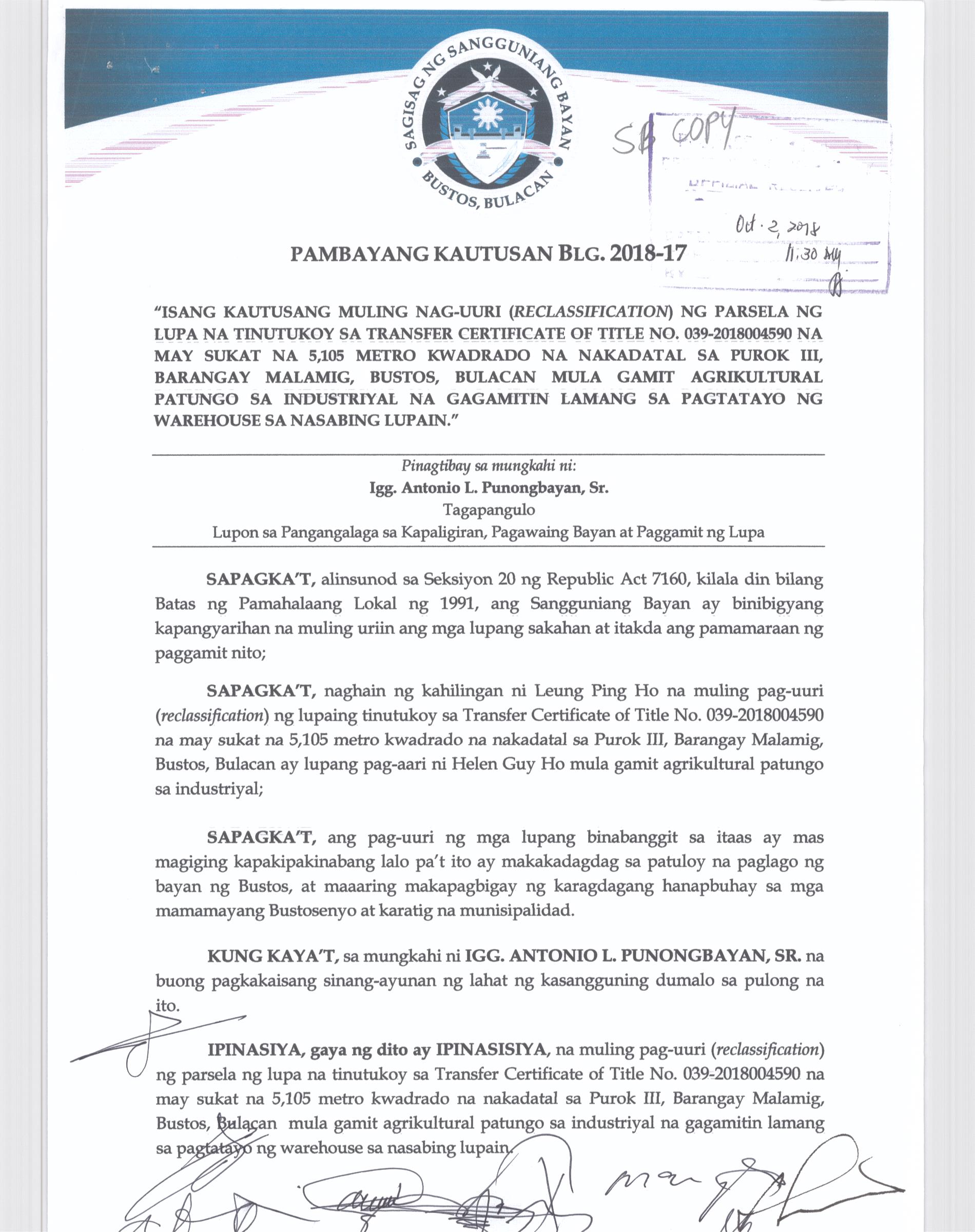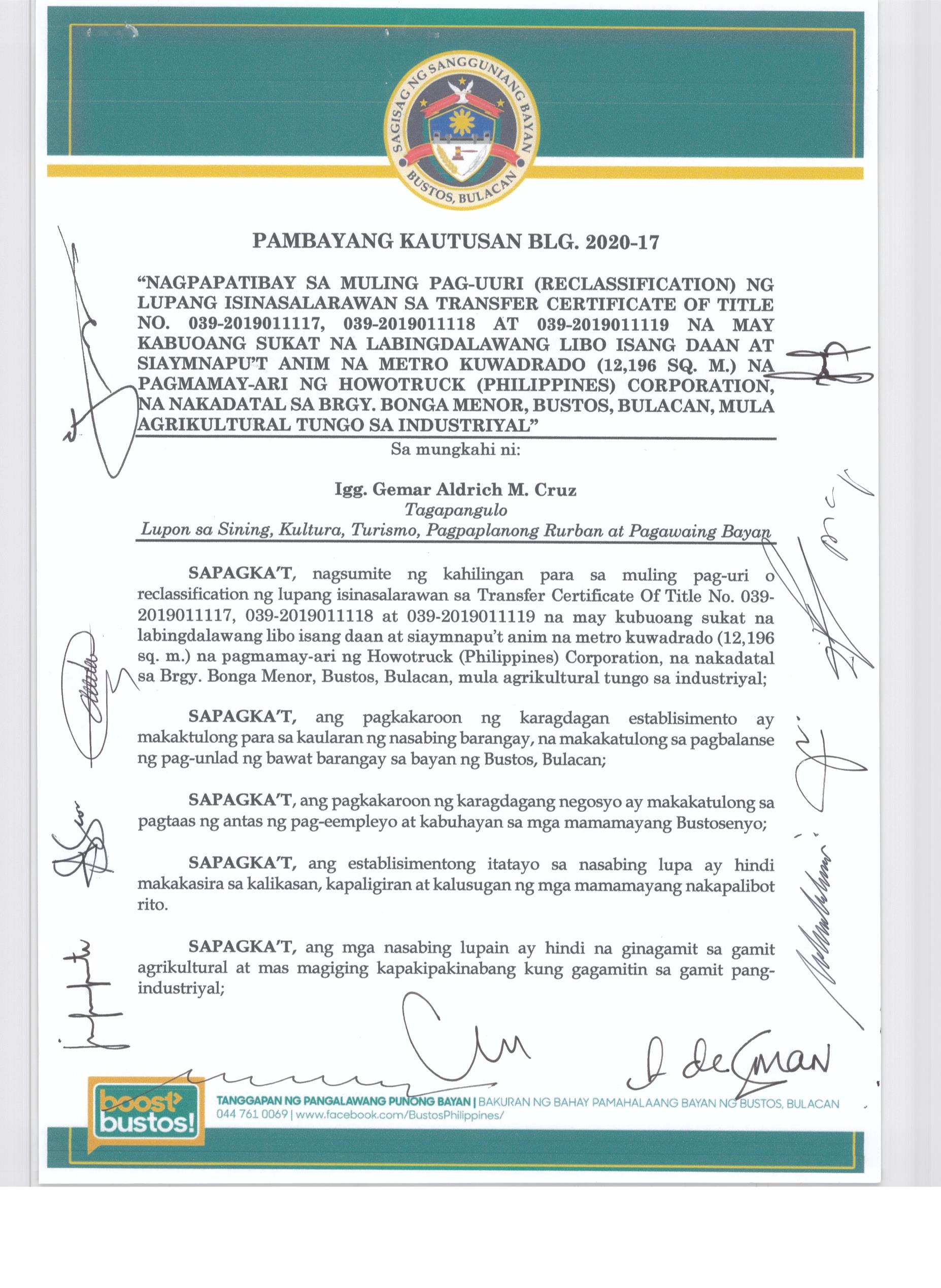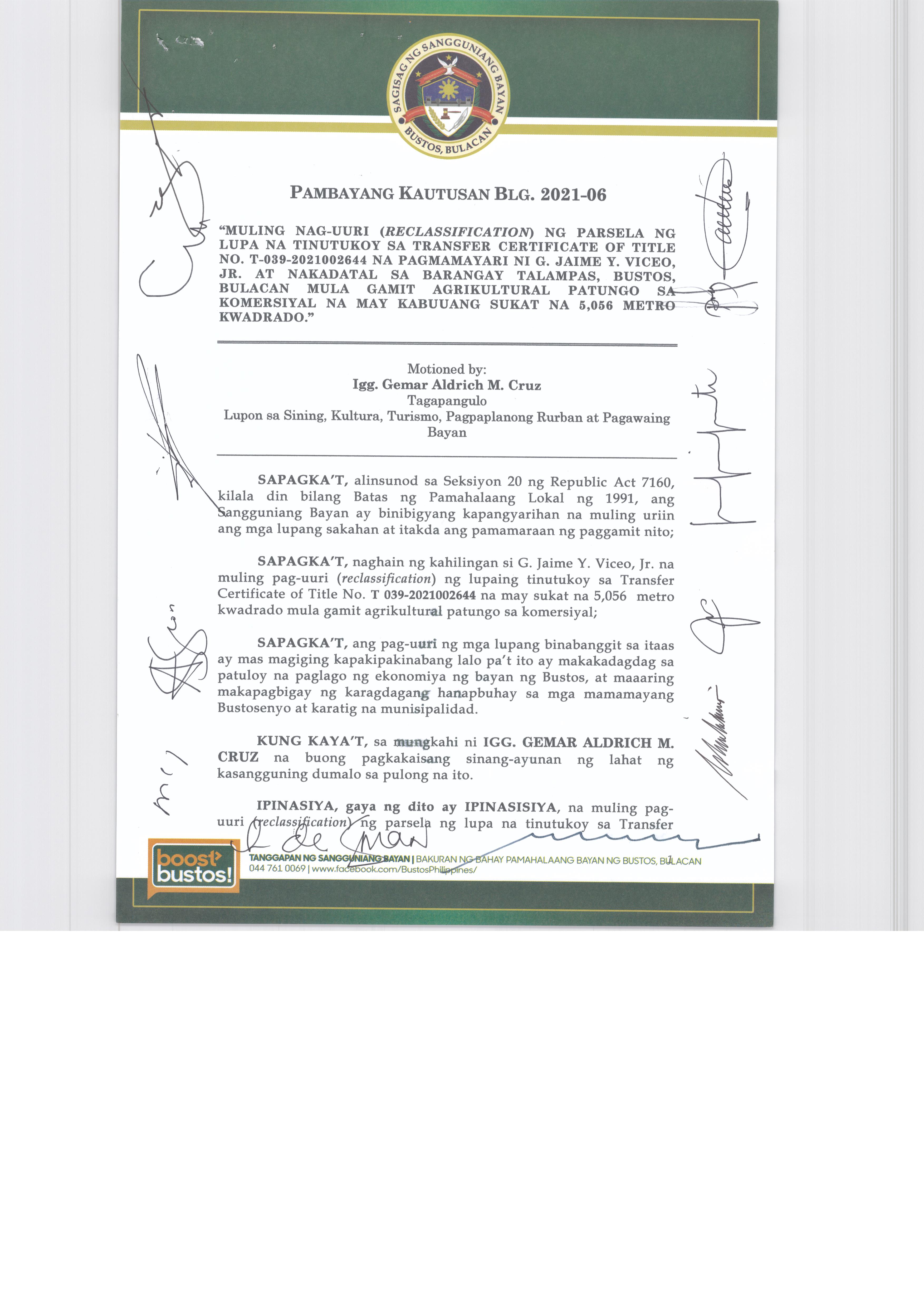 Pambayang Kautusang nagpapatibay sa kahilingan ni G. Adrian G. Santiago na muling pag-uuri ng lupa sa Barangay Bonga Menor Bustos Bulacan na may sukat na 2 ektarya buhat sa kabuuangsukat na 4.3 ektarya na isinasalarawan sa Transfer Certificate Title No. 039-2016006393 (LOT 4-A of the Subd. Plan PSD-03-177744)