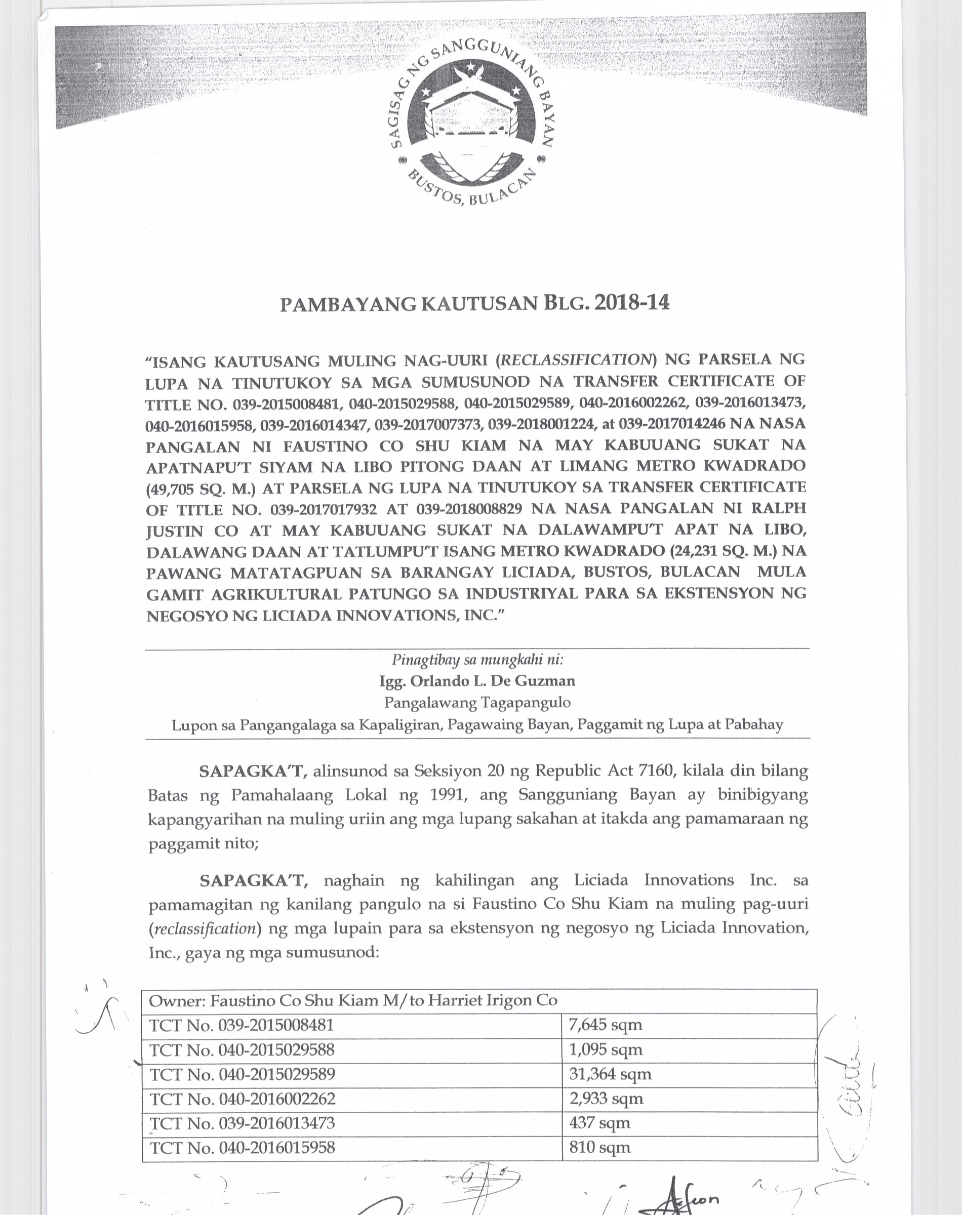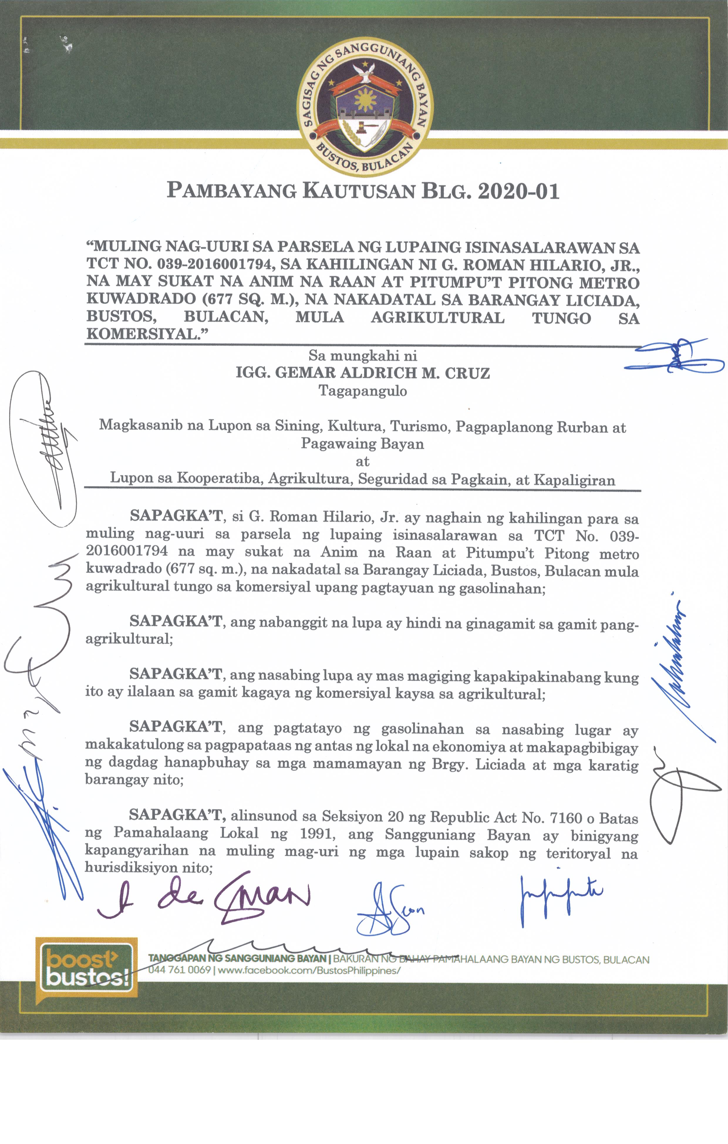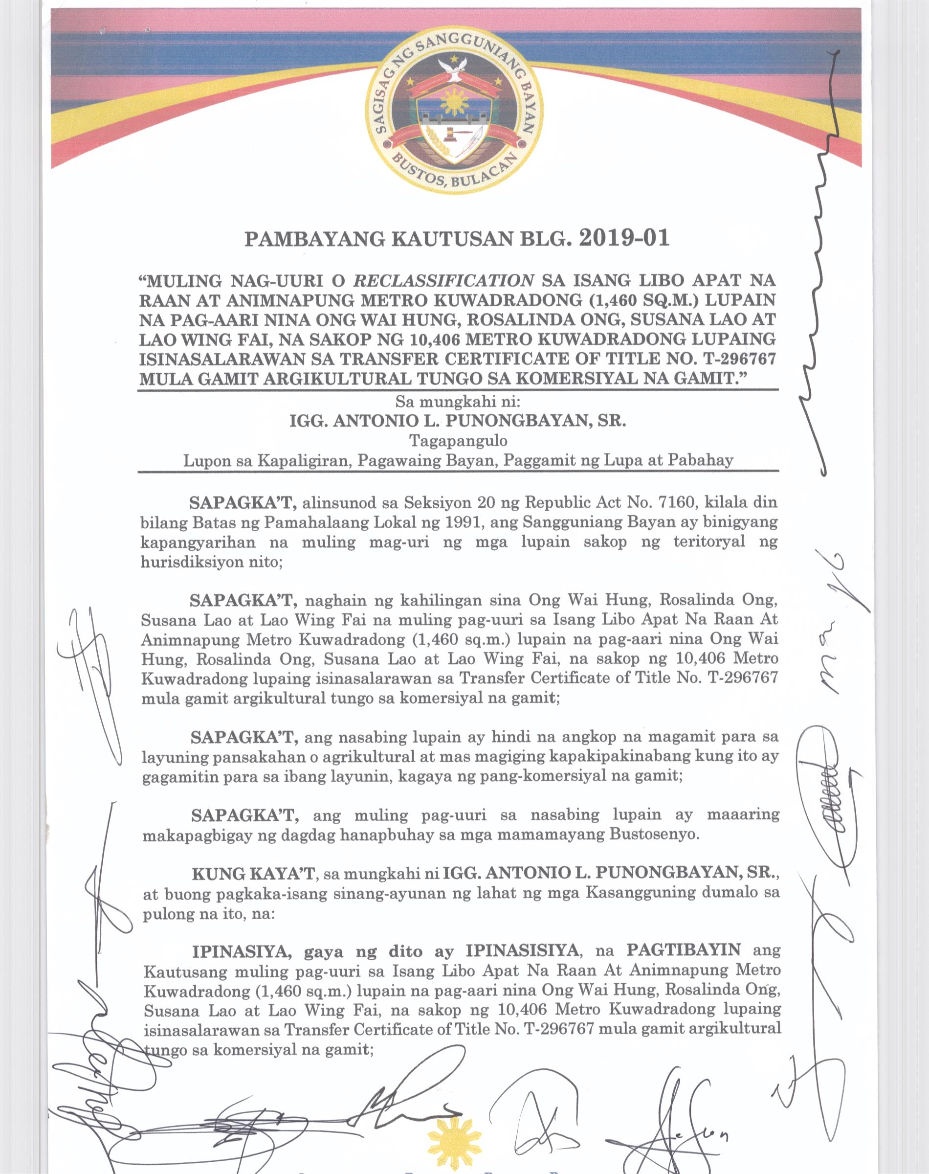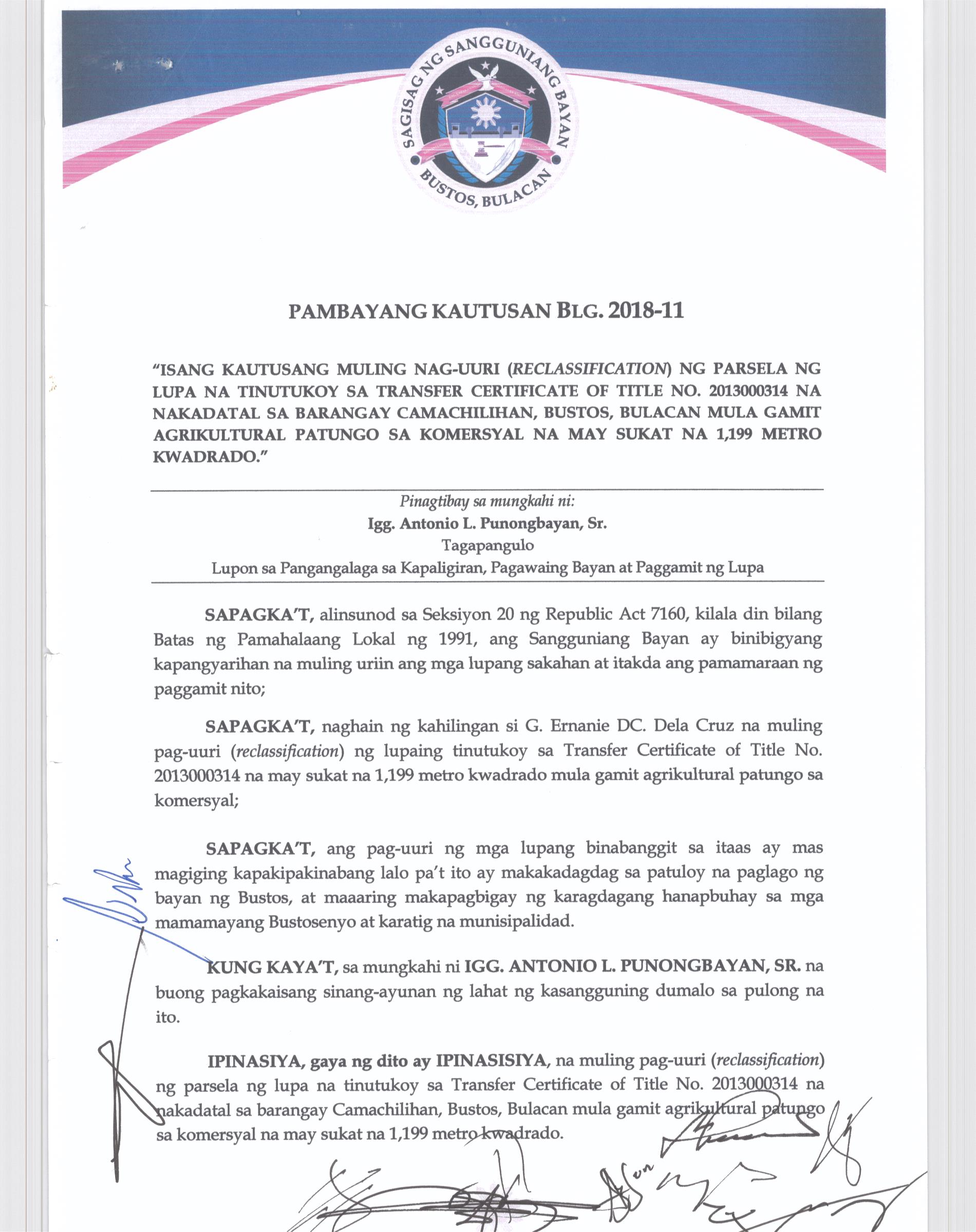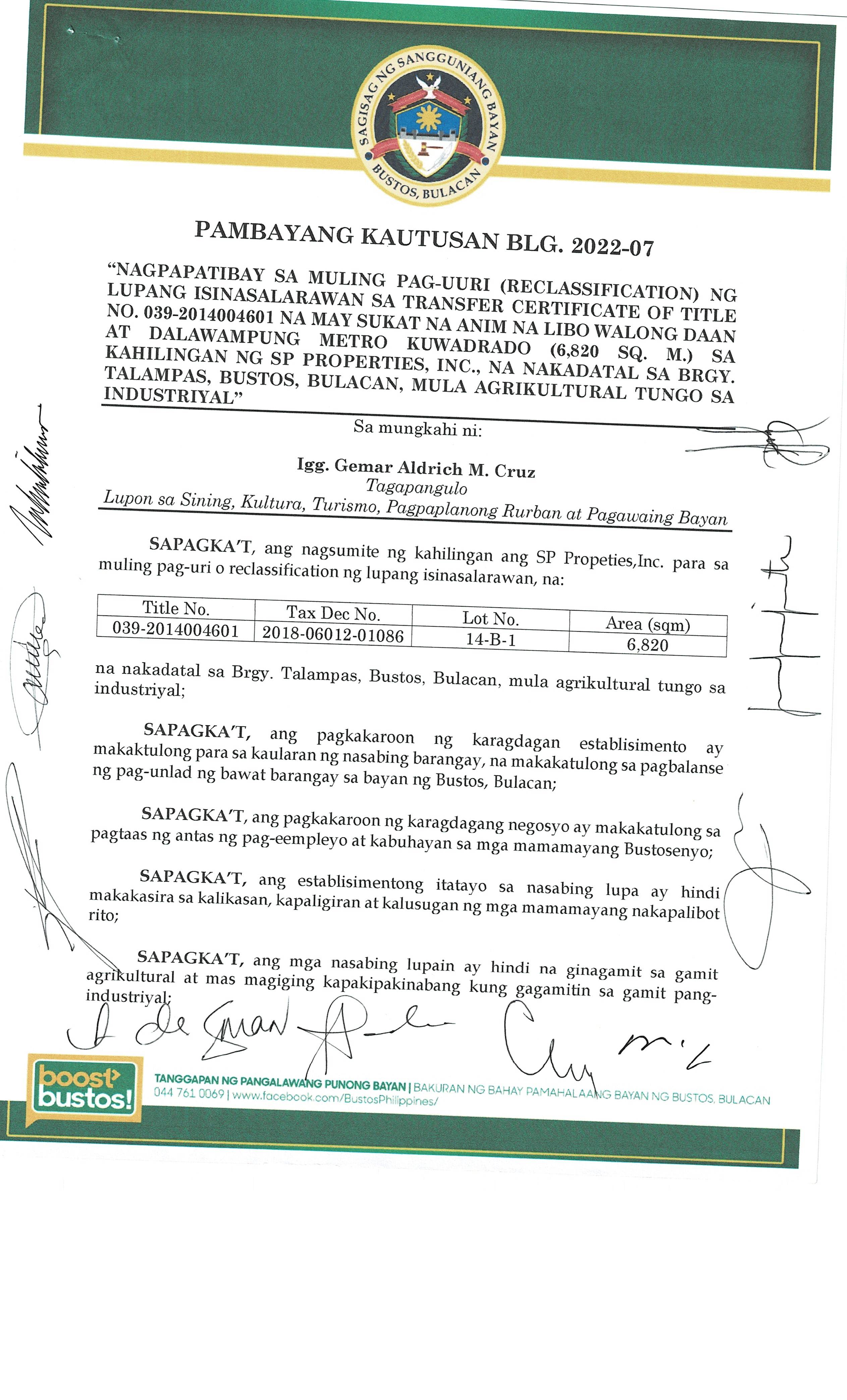 Pambayang Kautusang nagpapatibay sa kahilingan ni G. Adrian G. Santiago na muling pag-uuri ng lupa sa Barangay Bonga Menor Bustos Bulacan na may sukat na 2 ektarya buhat sa kabuuangsukat na 4.3 ektarya na isinasalarawan sa Transfer Certificate Title No. 039-2016006393 (LOT 4-A of the Subd. Plan PSD-03-177744)