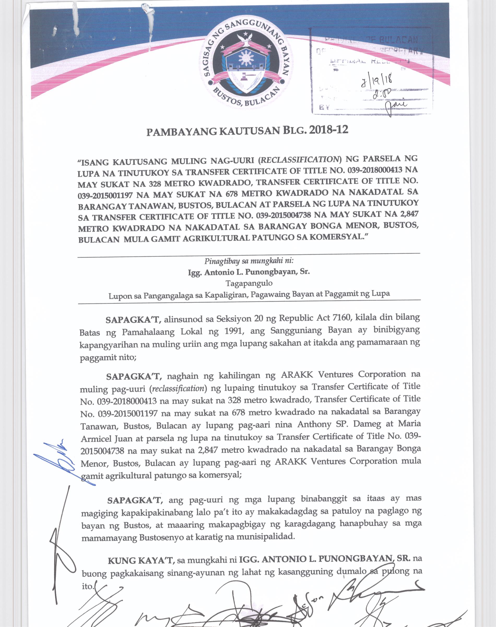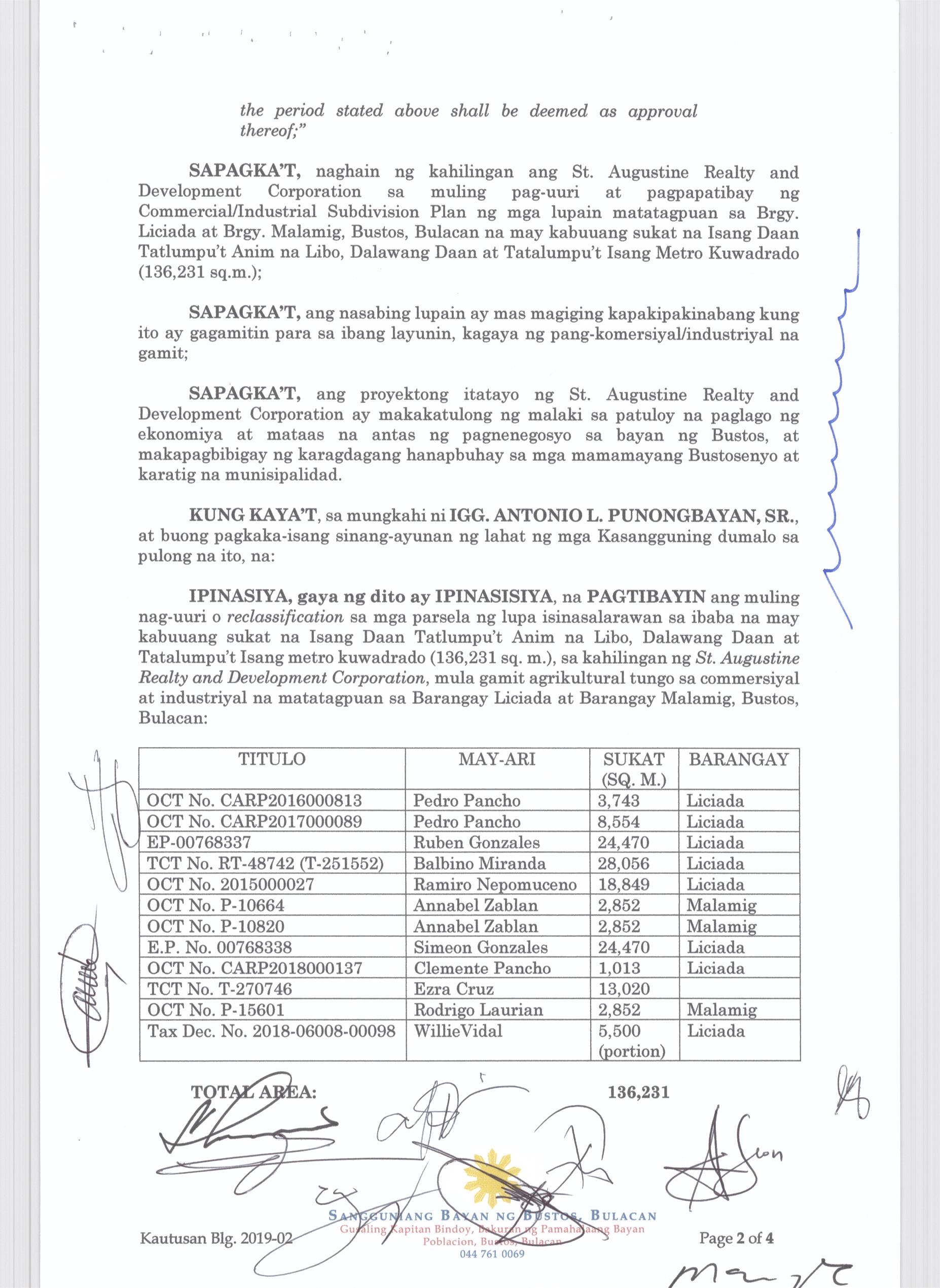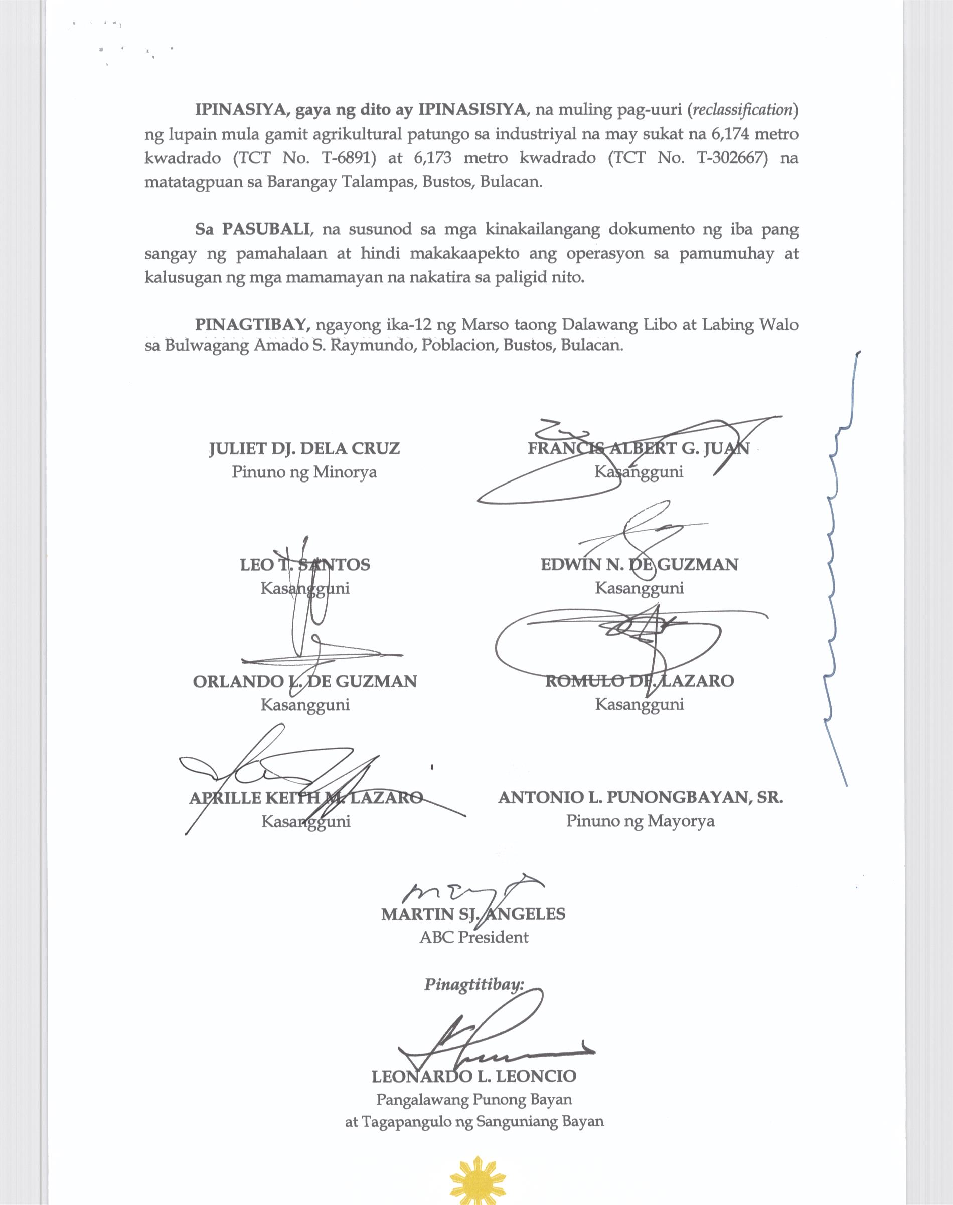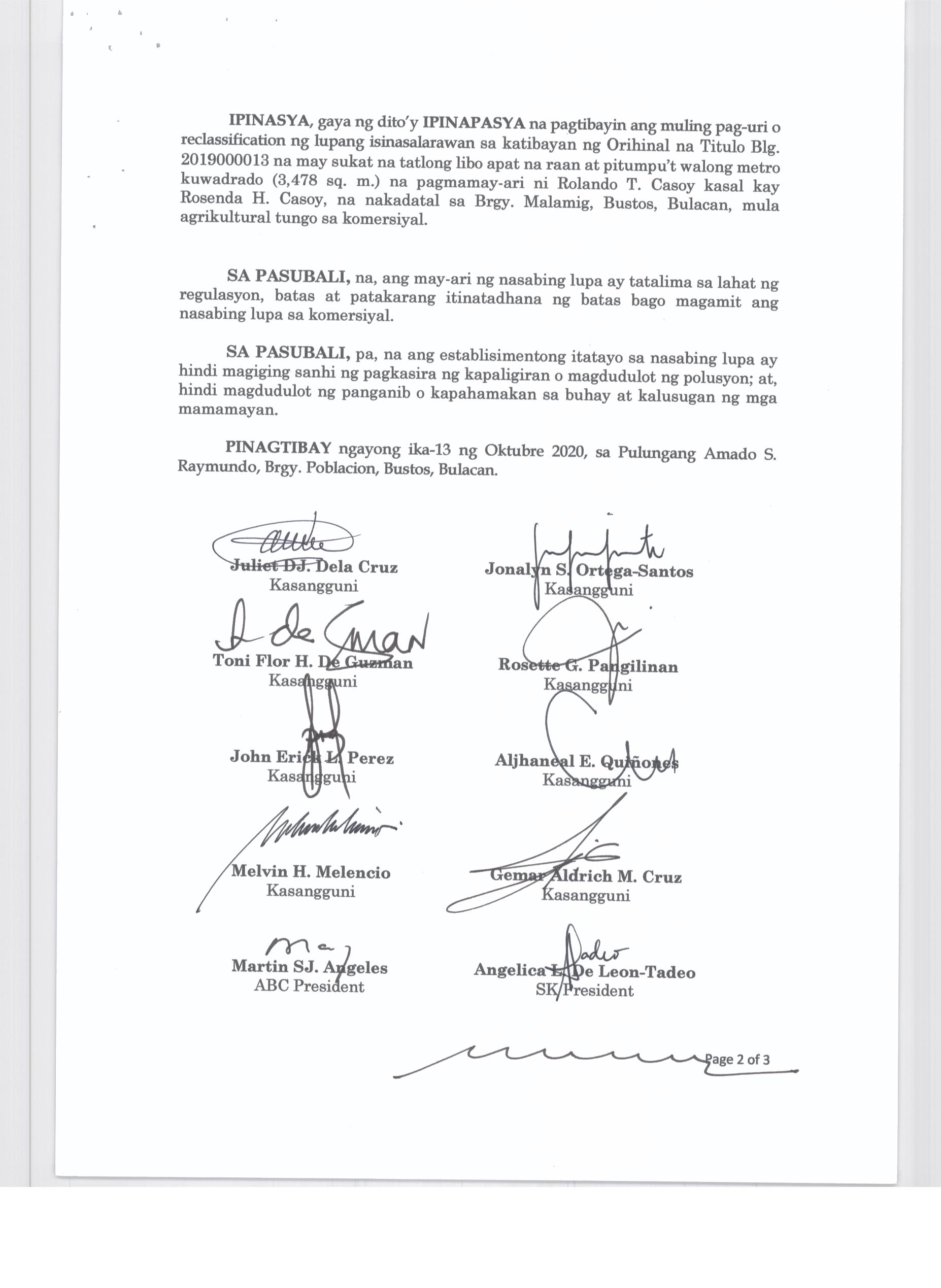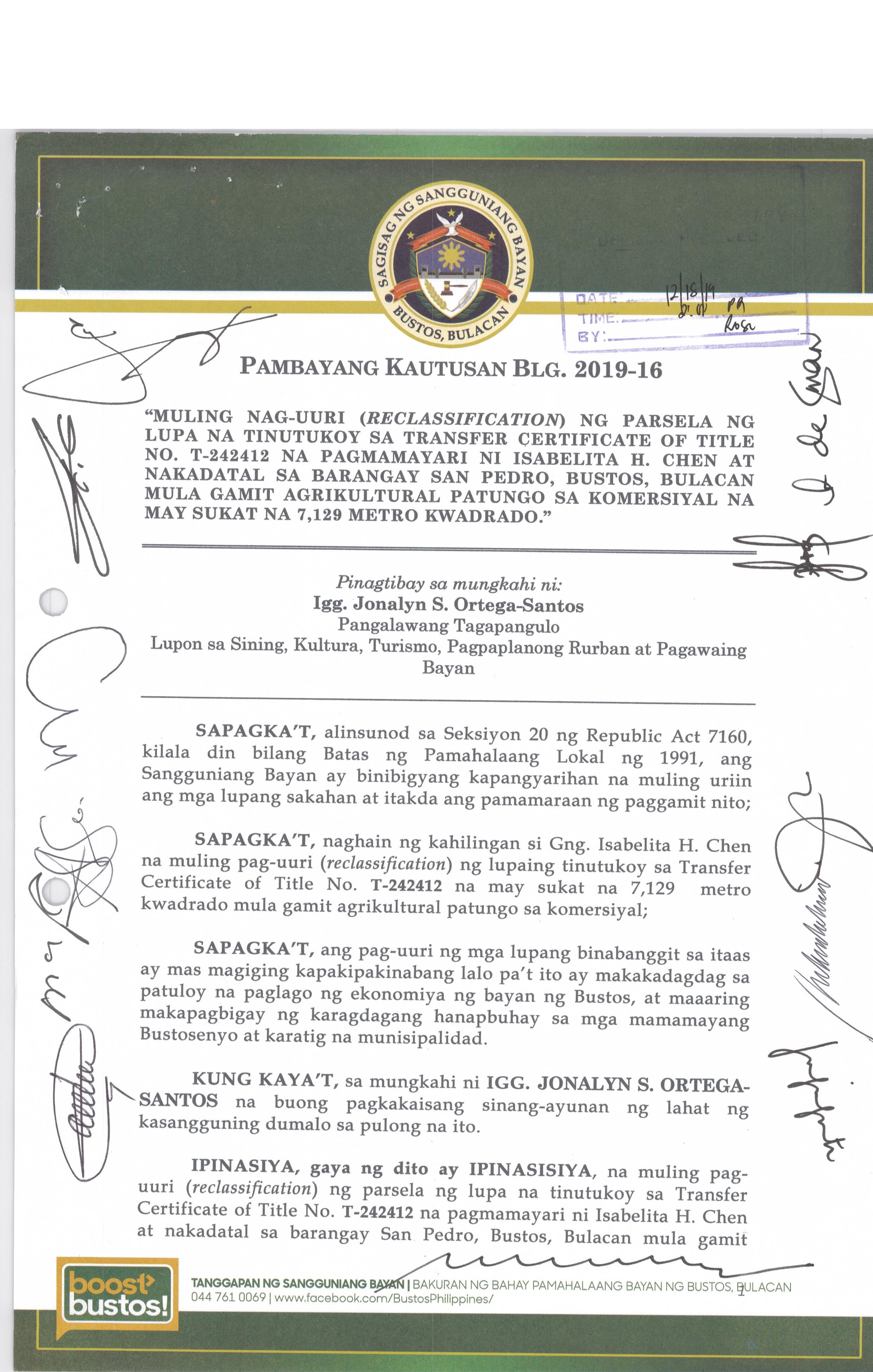 Pambayang Kautusang nagpapatibay sa kahilingan ni G. Adrian G. Santiago na muling pag-uuri ng lupa sa Barangay Bonga Menor Bustos Bulacan na may sukat na 2 ektarya buhat sa kabuuangsukat na 4.3 ektarya na isinasalarawan sa Transfer Certificate Title No. 039-2016006393 (LOT 4-A of the Subd. Plan PSD-03-177744)