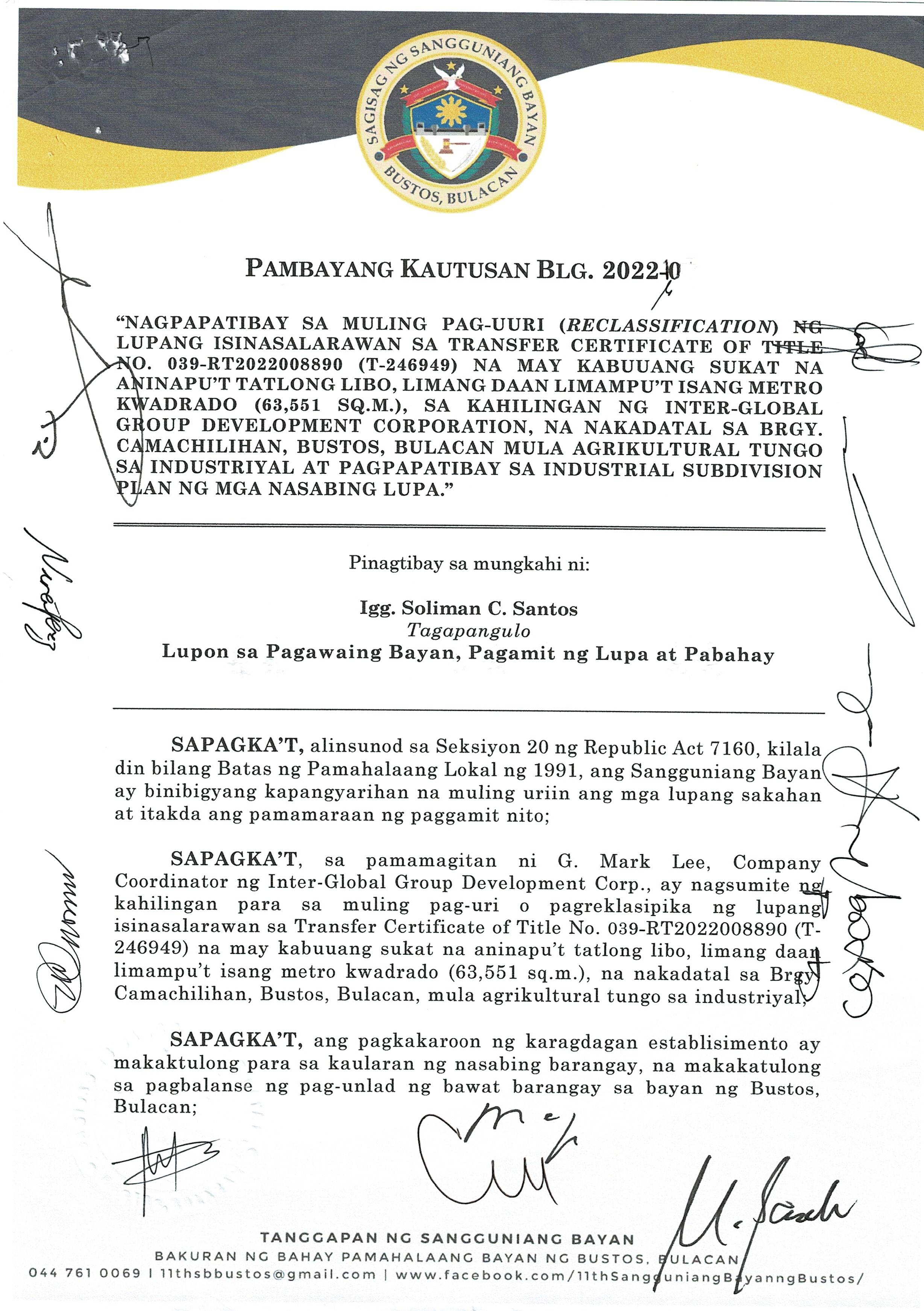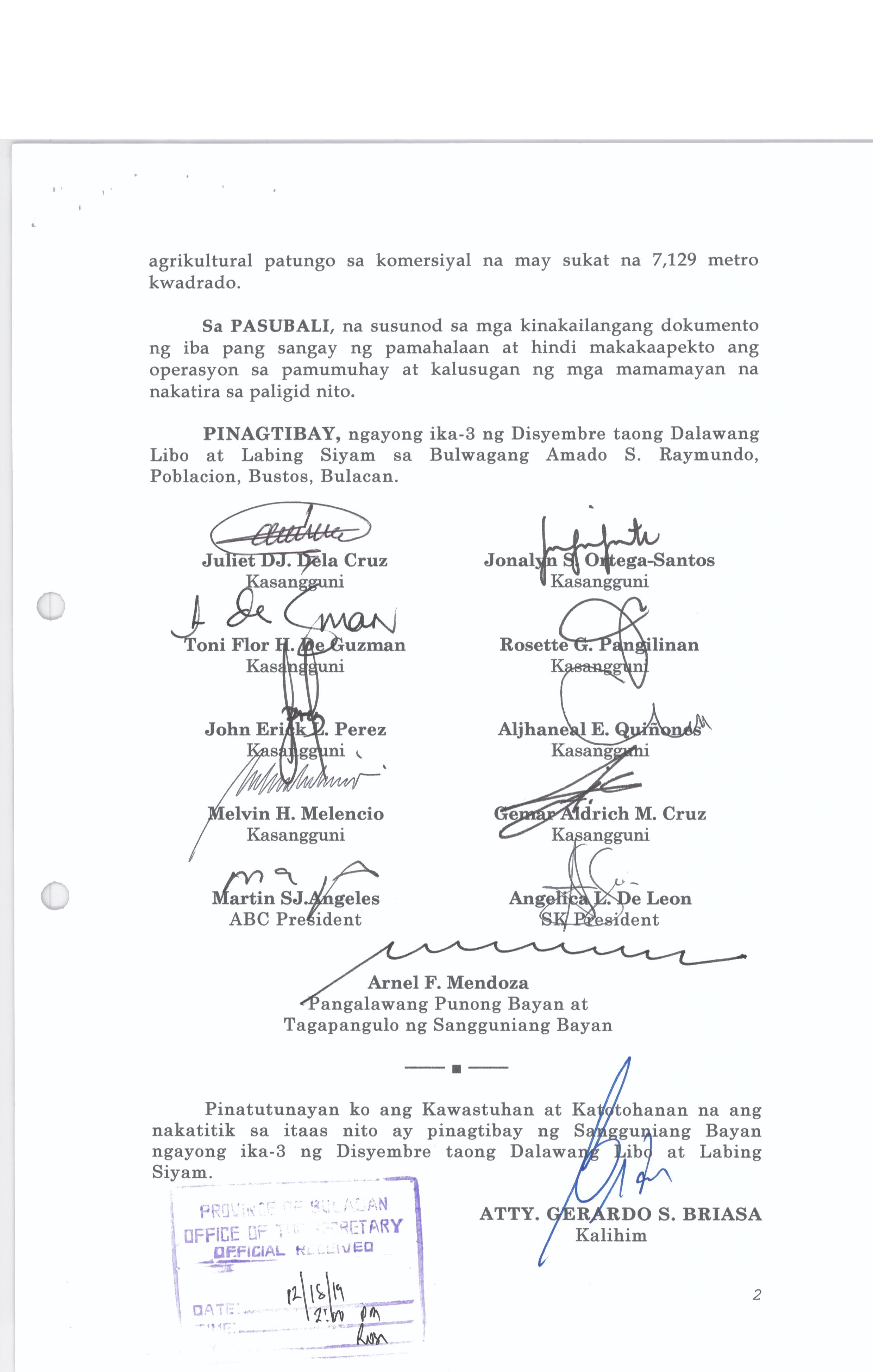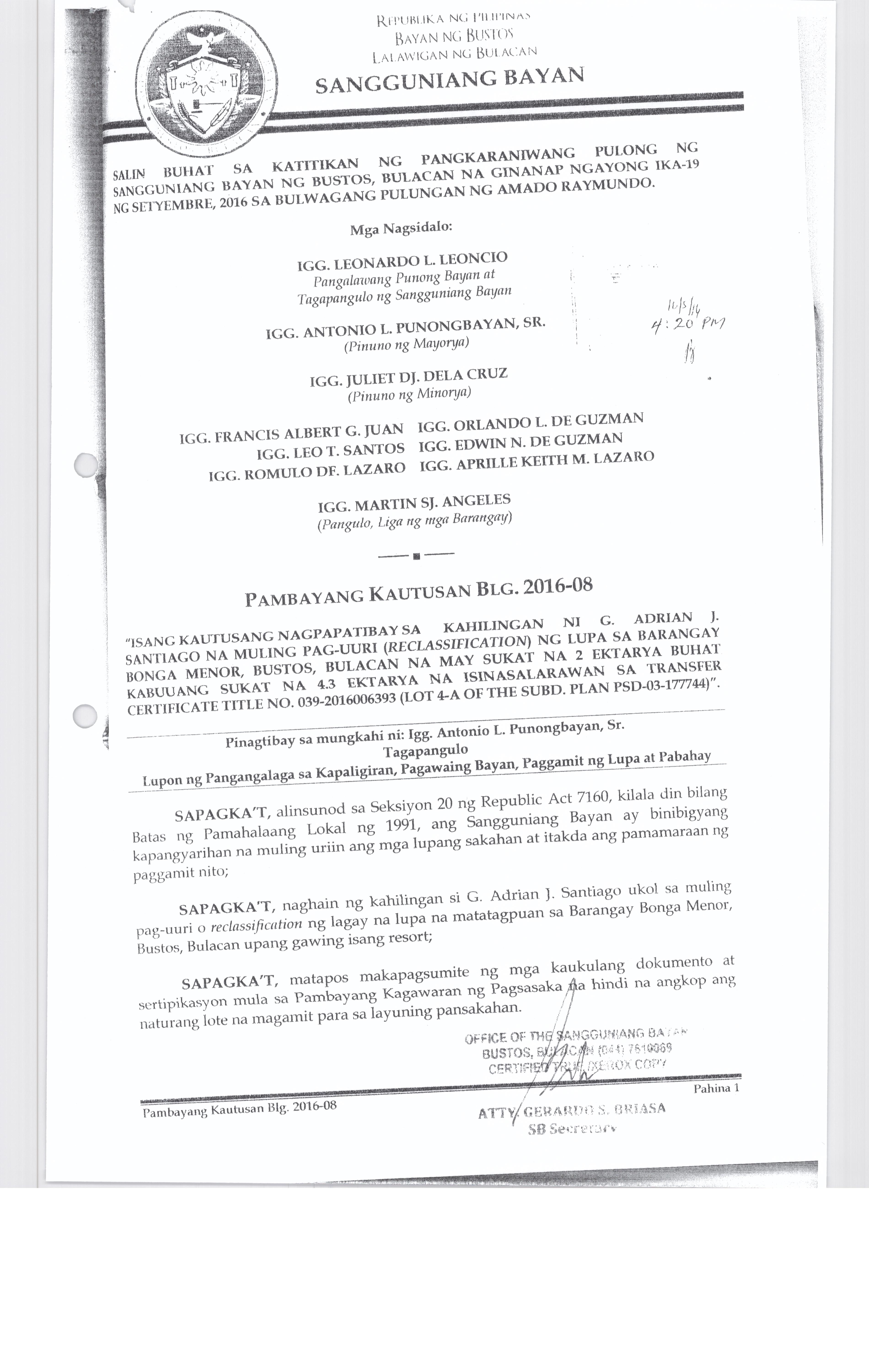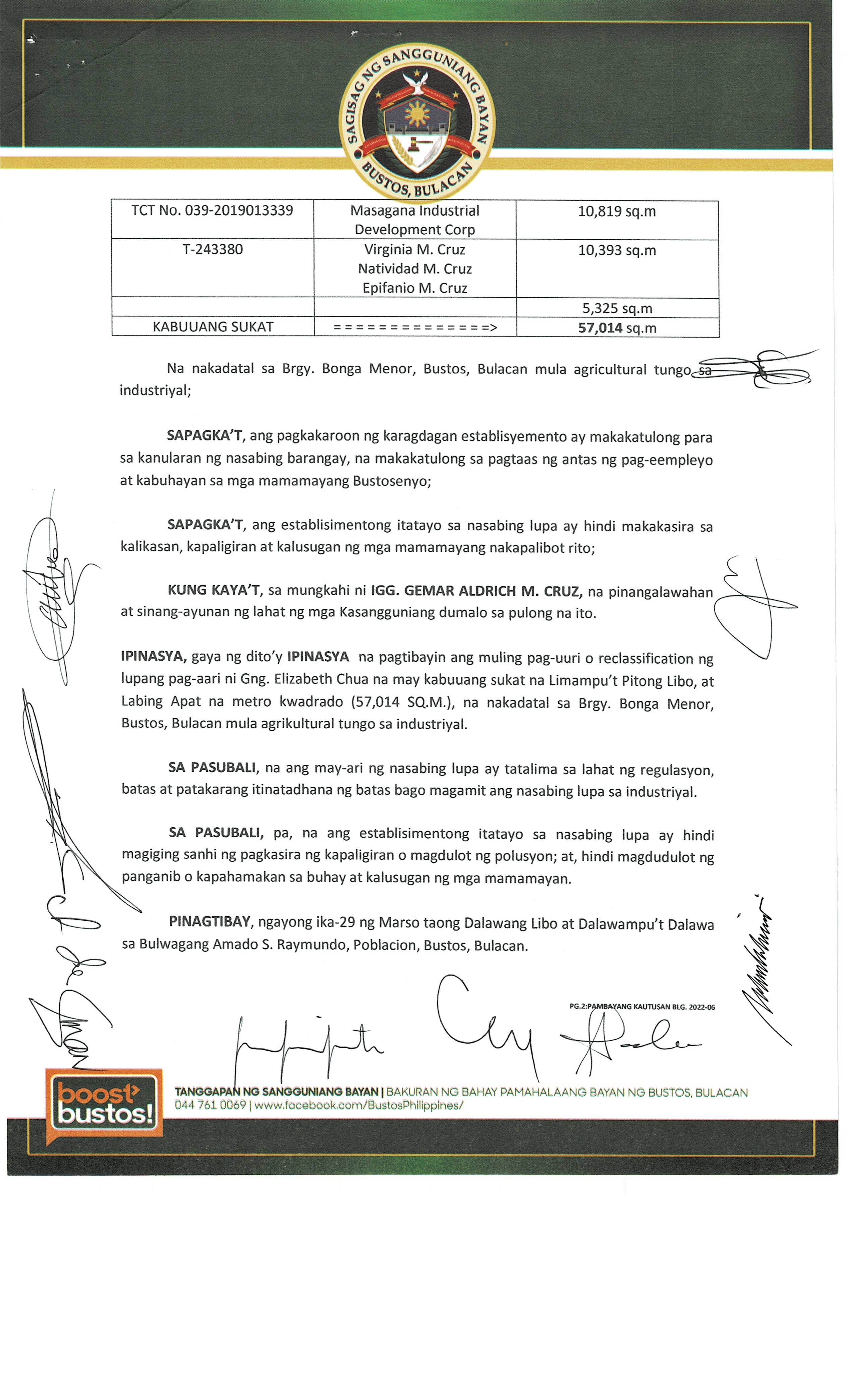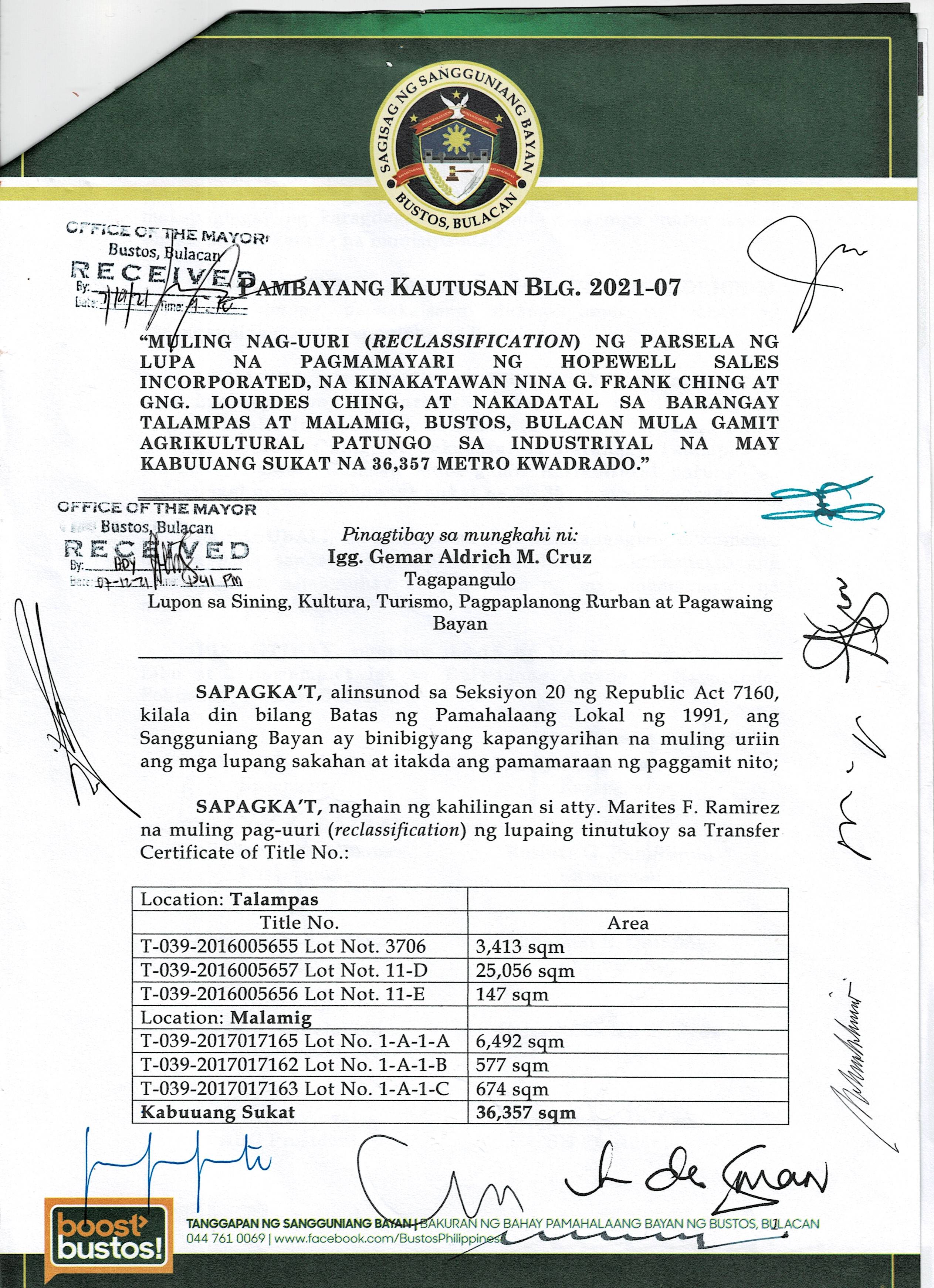 Pambayang Kautusang nagpapatibay sa kahilingan ni G. Adrian G. Santiago na muling pag-uuri ng lupa sa Barangay Bonga Menor Bustos Bulacan na may sukat na 2 ektarya buhat sa kabuuangsukat na 4.3 ektarya na isinasalarawan sa Transfer Certificate Title No. 039-2016006393 (LOT 4-A of the Subd. Plan PSD-03-177744)
