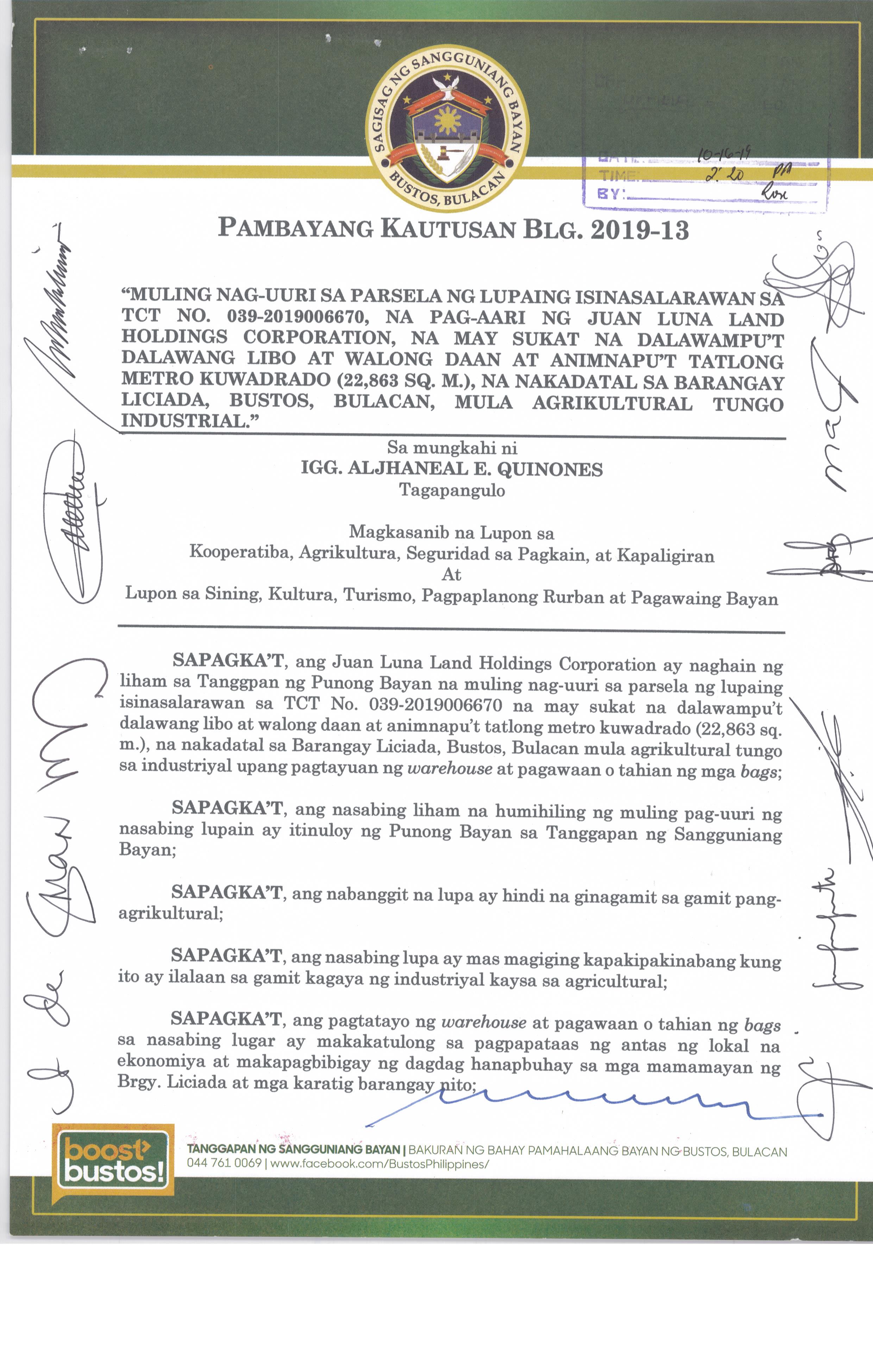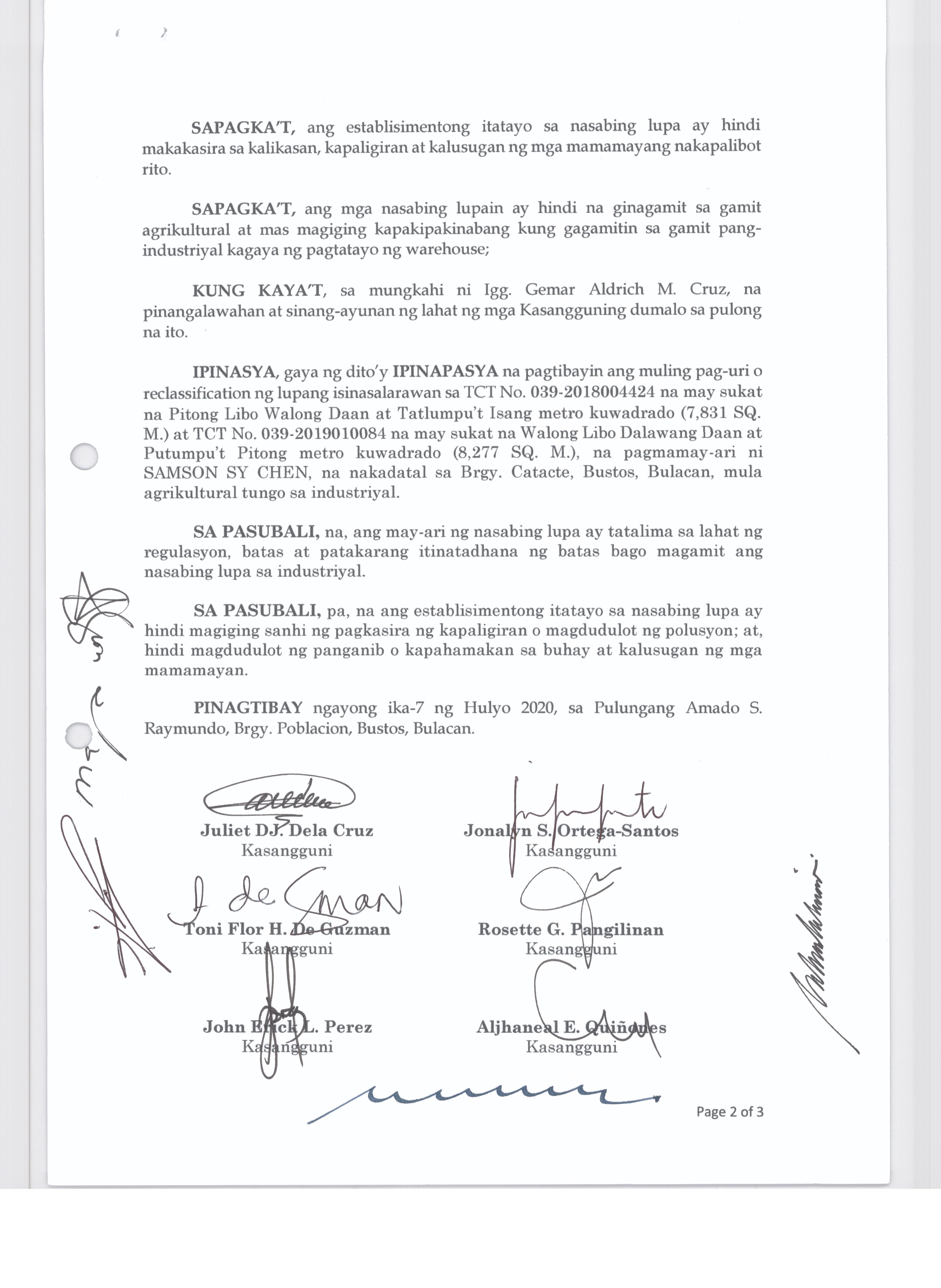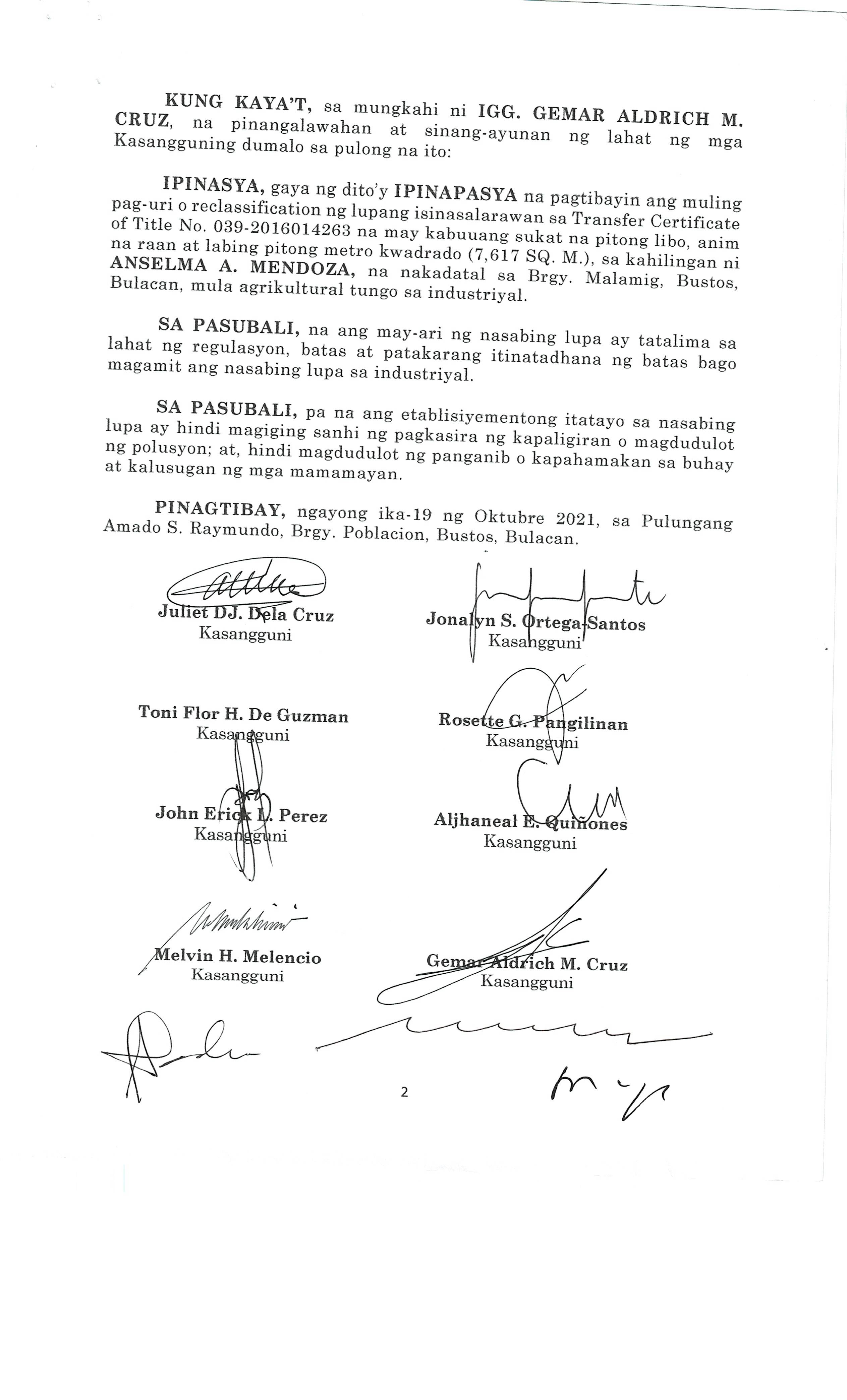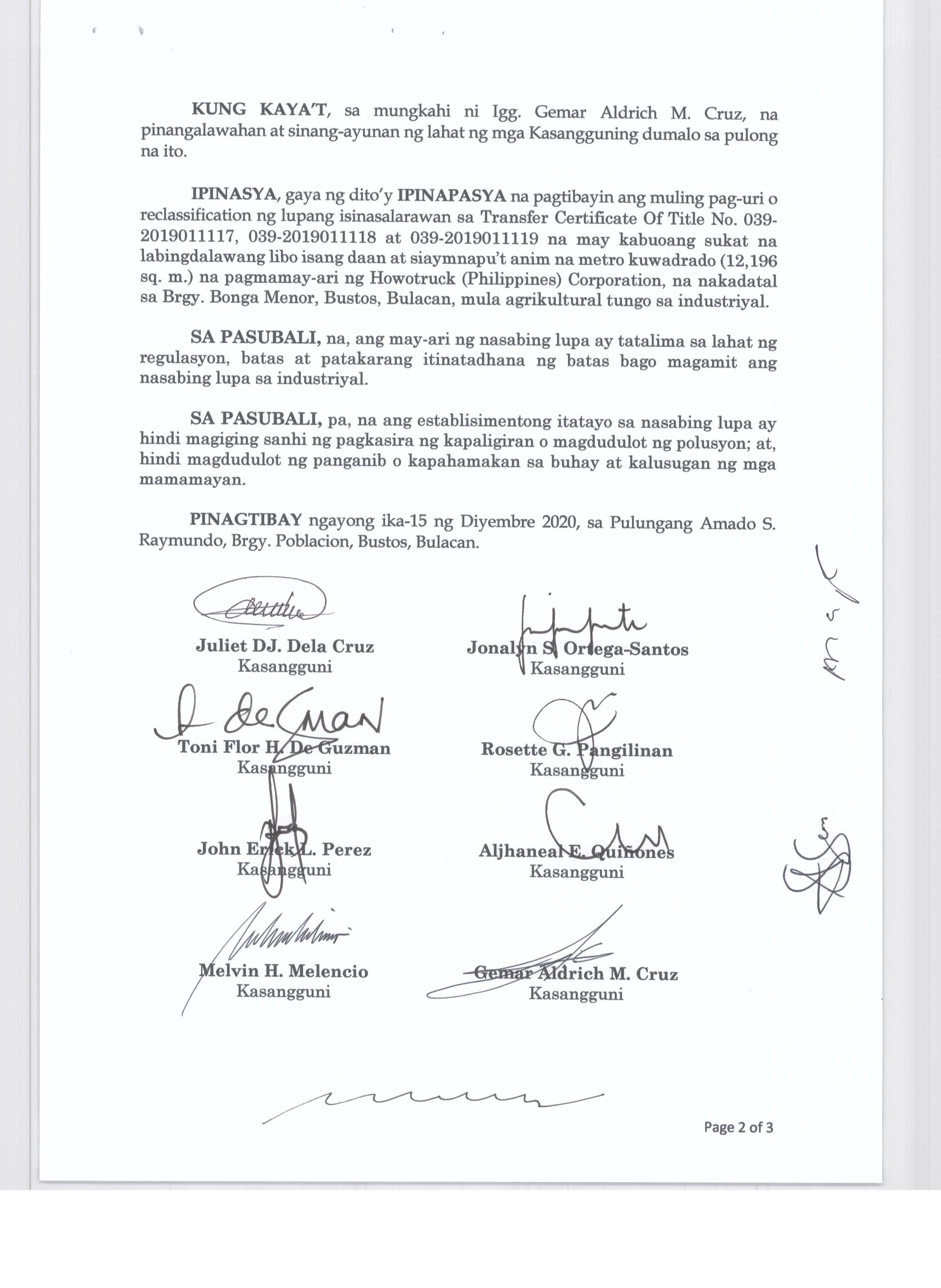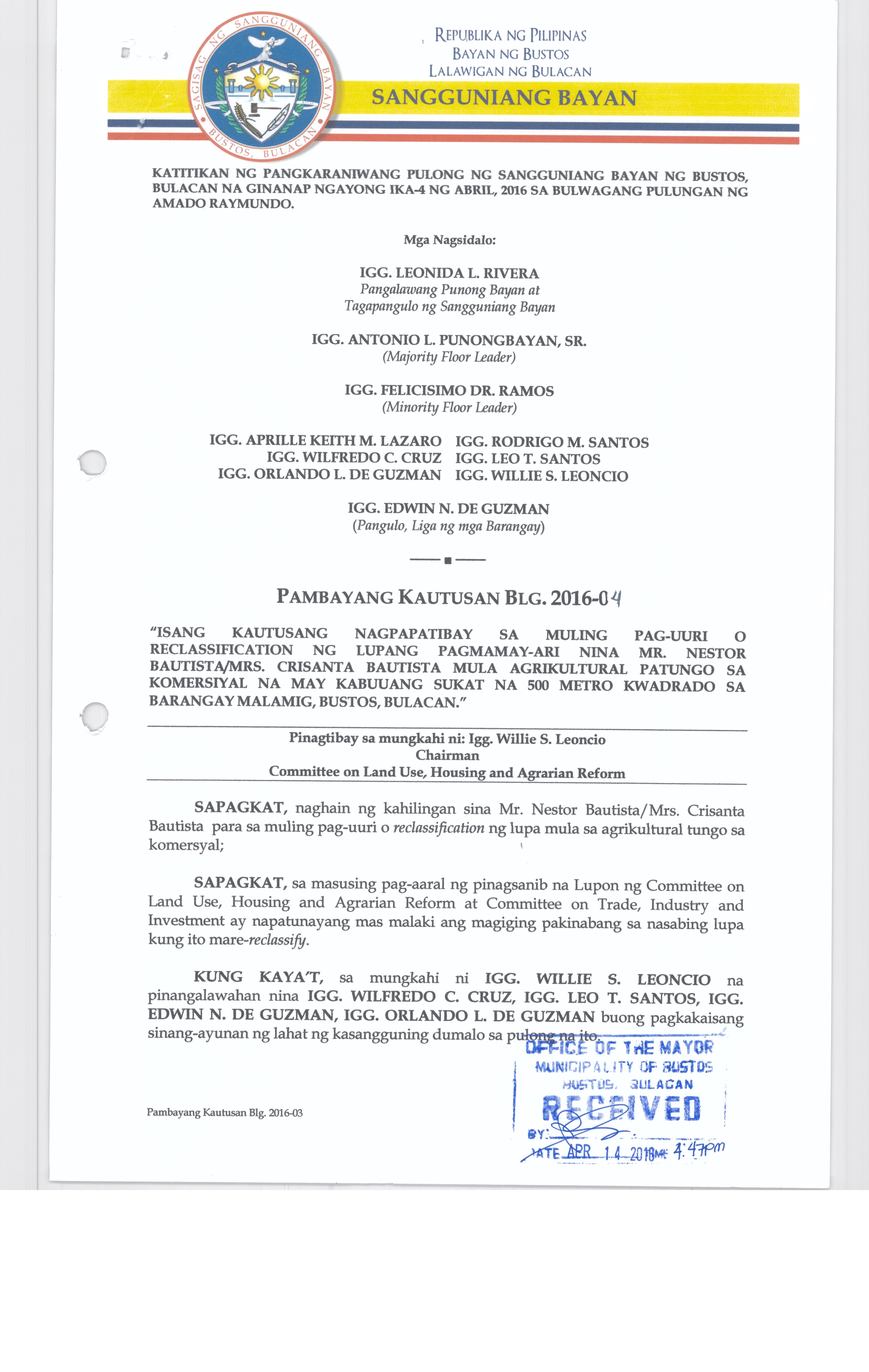 Pambayang Kautusang nagpapatibay sa kahilingan ni G. Adrian G. Santiago na muling pag-uuri ng lupa sa Barangay Bonga Menor Bustos Bulacan na may sukat na 2 ektarya buhat sa kabuuangsukat na 4.3 ektarya na isinasalarawan sa Transfer Certificate Title No. 039-2016006393 (LOT 4-A of the Subd. Plan PSD-03-177744)
