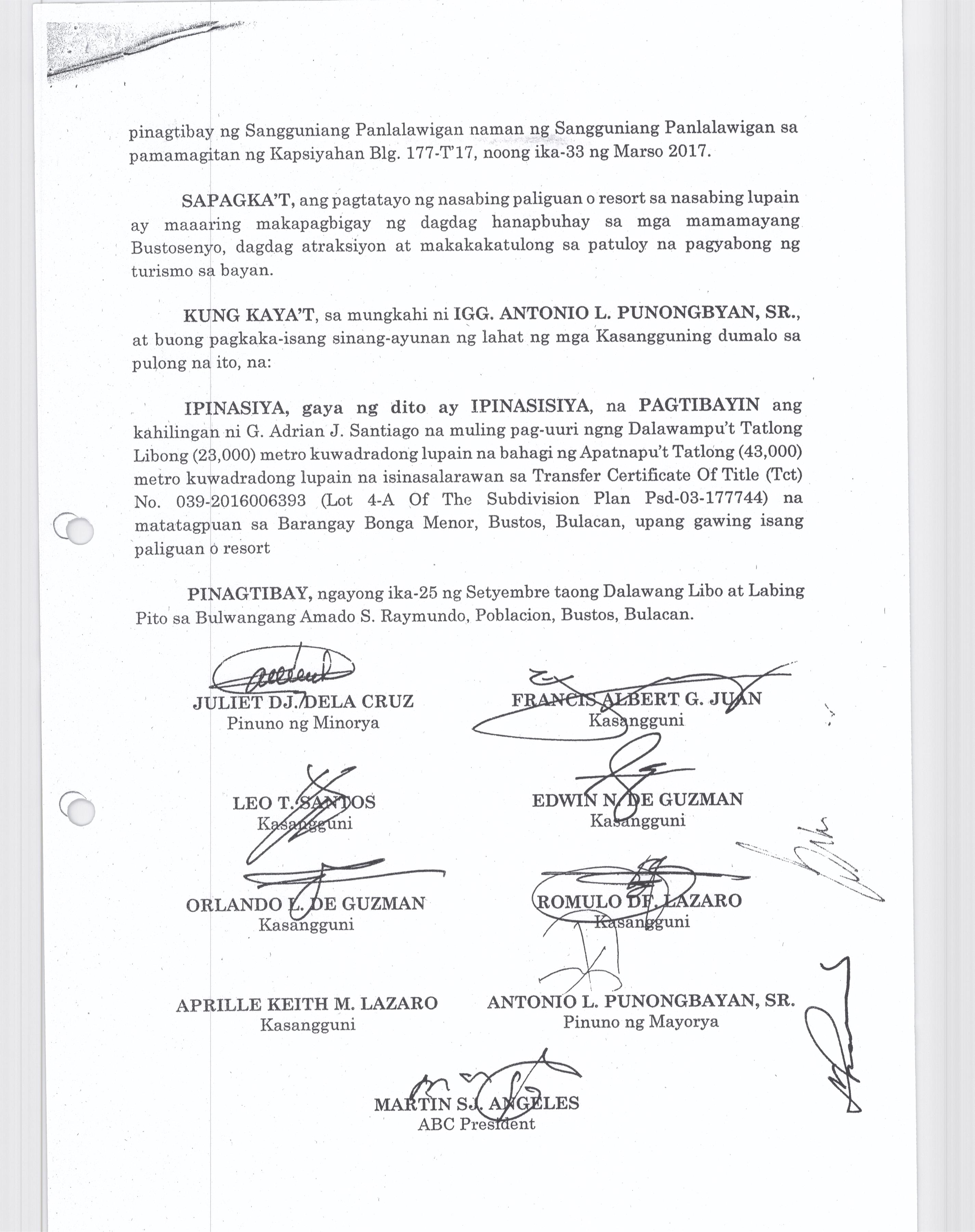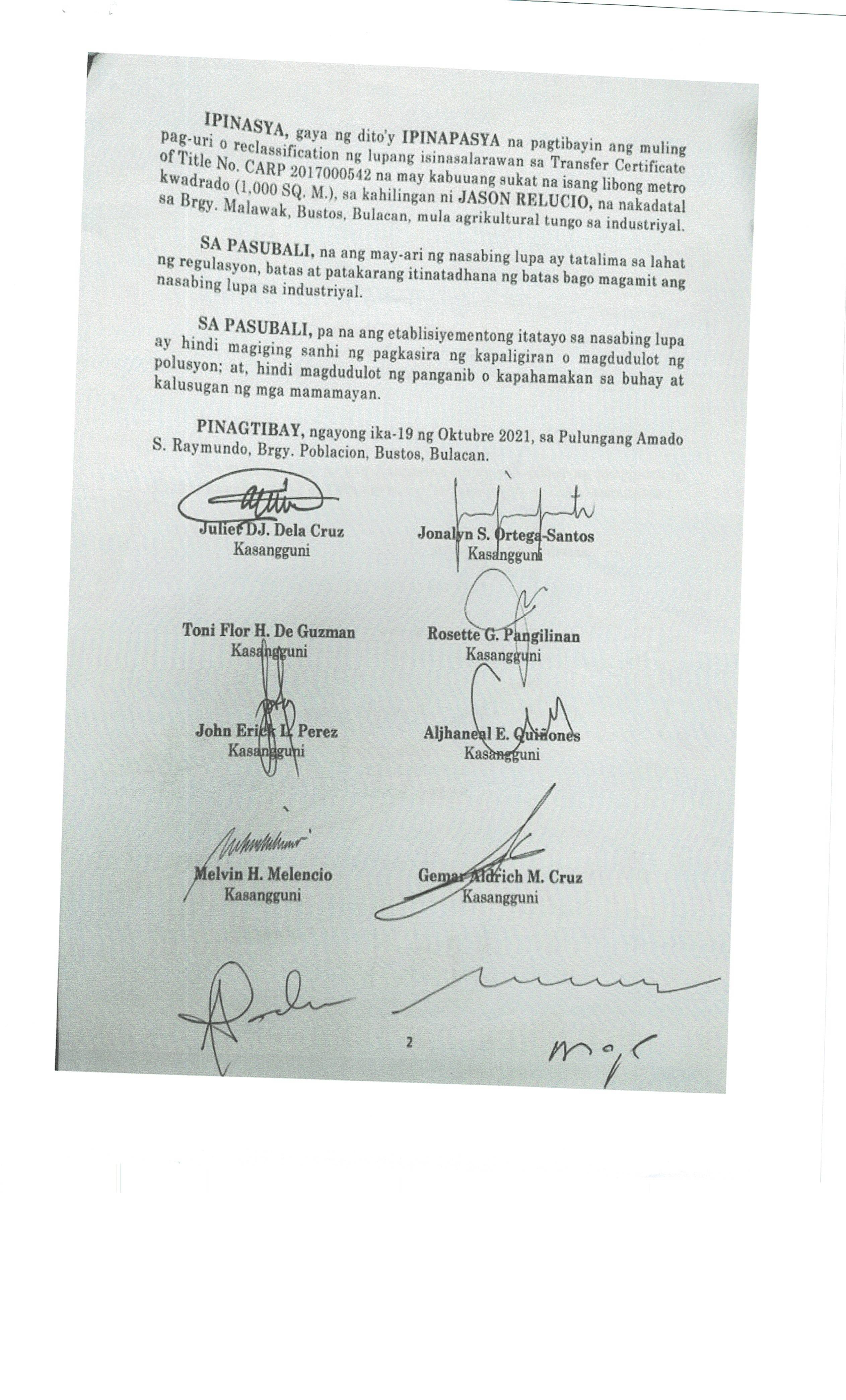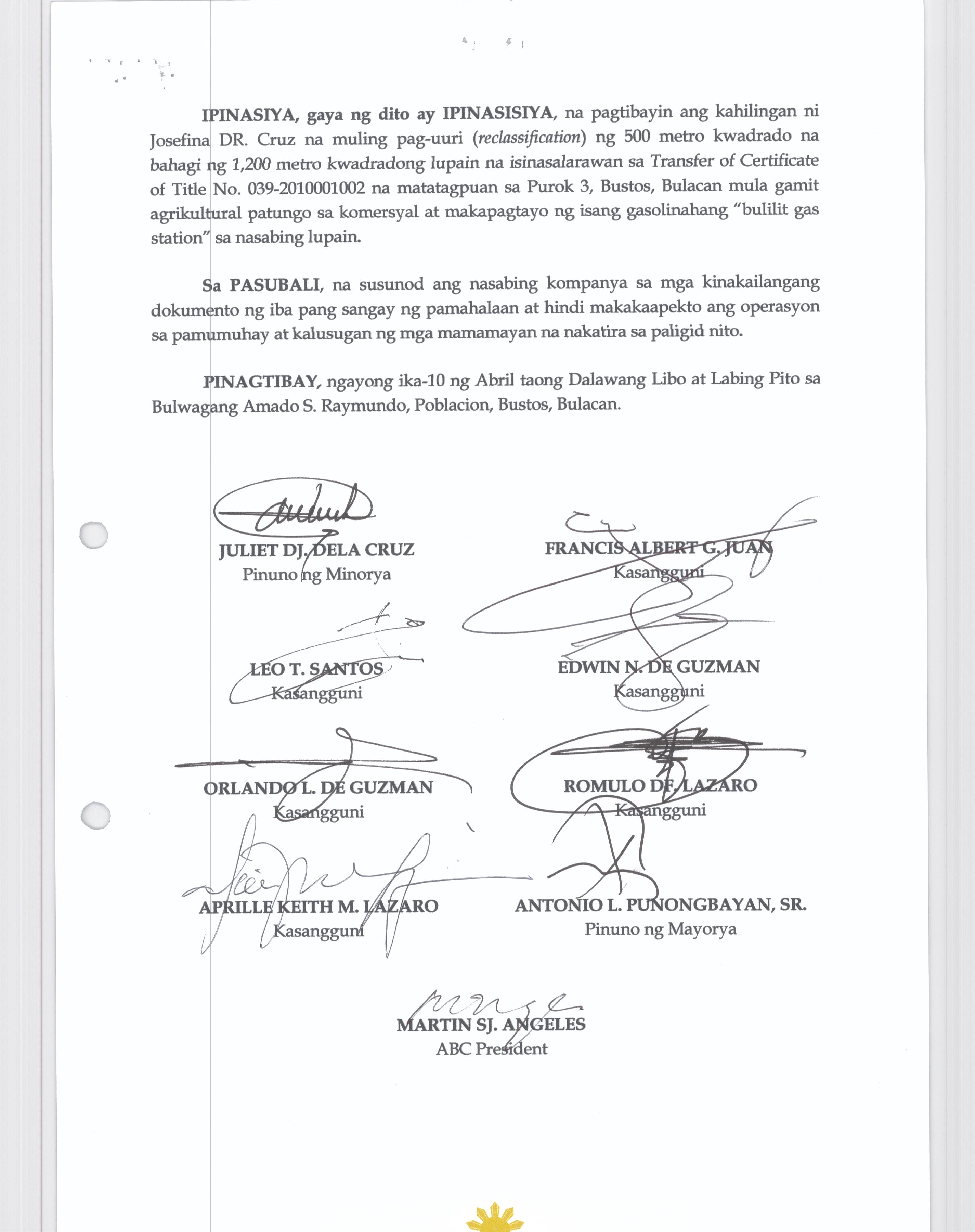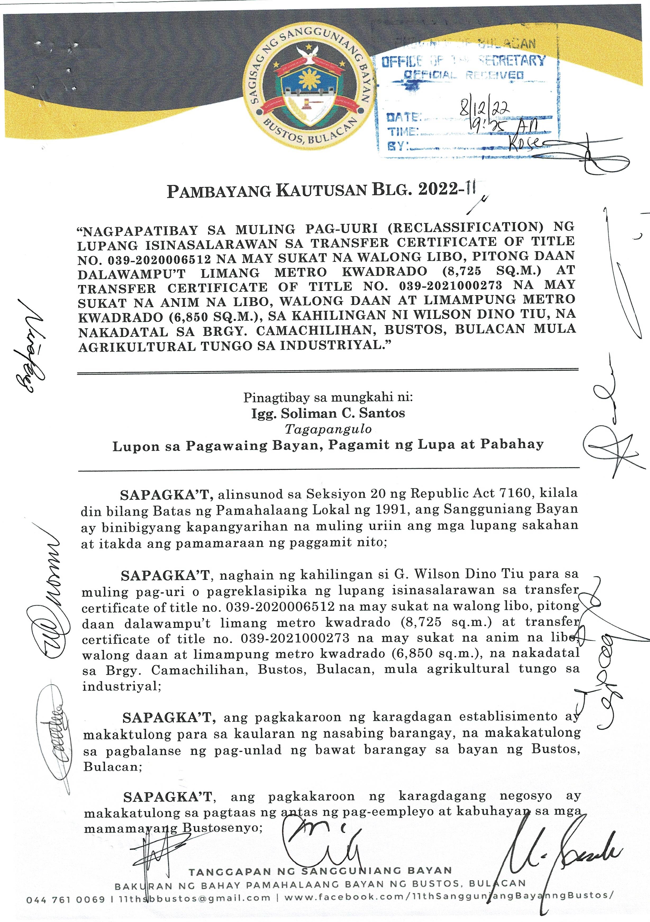 Pambayang Kautusang nagpapatibay sa kahilingan ni G. Adrian G. Santiago na muling pag-uuri ng lupa sa Barangay Bonga Menor Bustos Bulacan na may sukat na 2 ektarya buhat sa kabuuangsukat na 4.3 ektarya na isinasalarawan sa Transfer Certificate Title No. 039-2016006393 (LOT 4-A of the Subd. Plan PSD-03-177744)