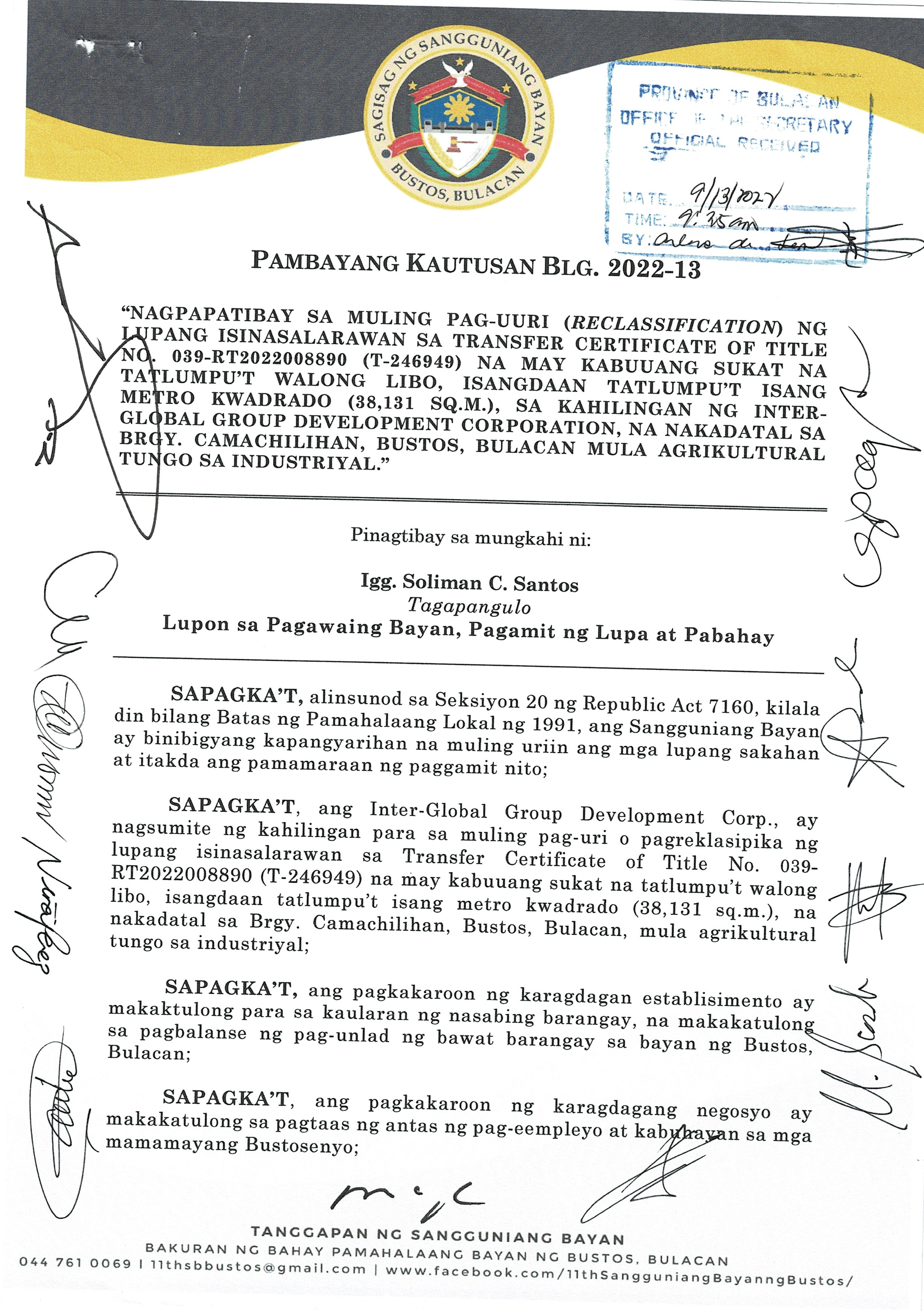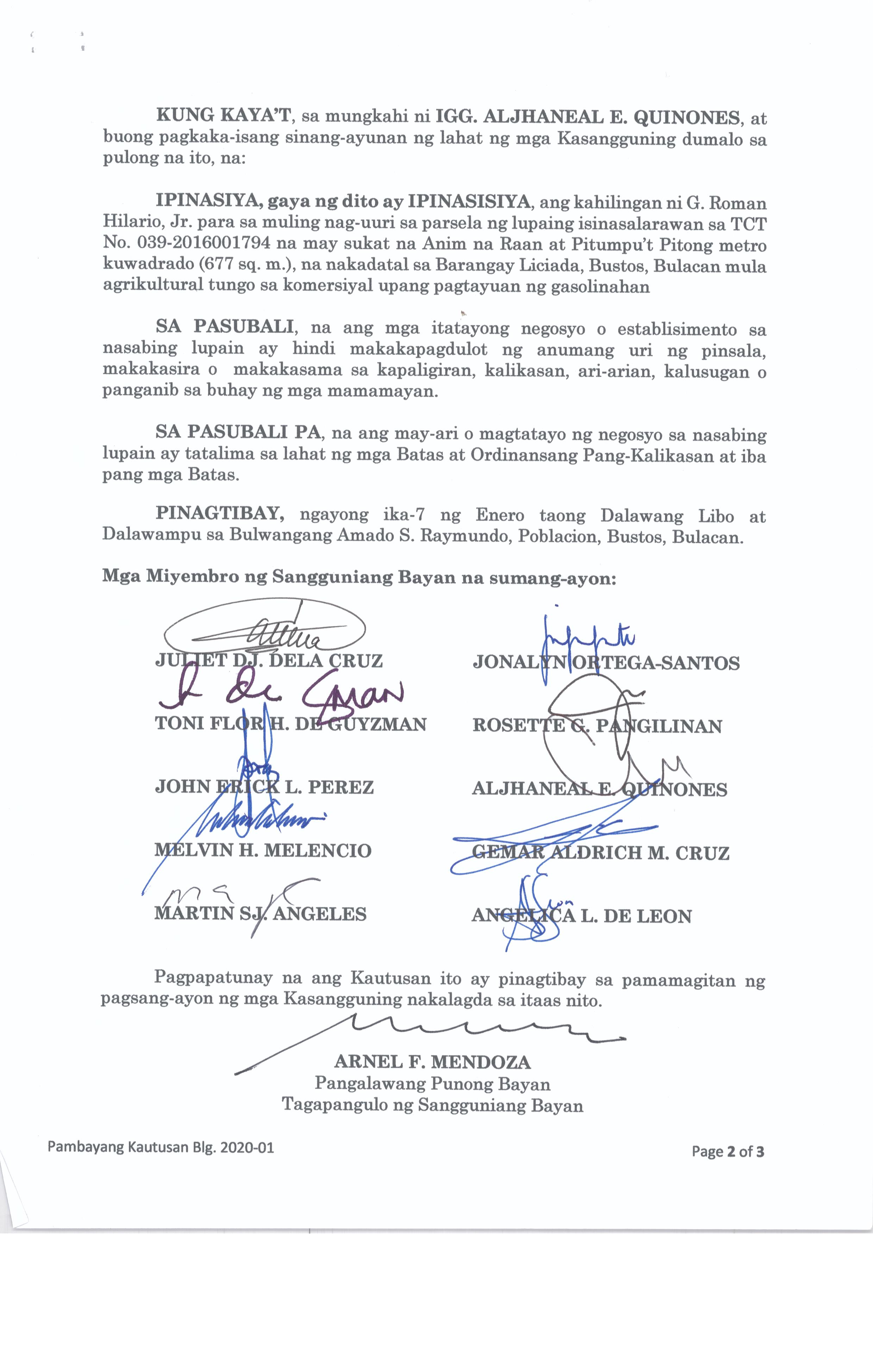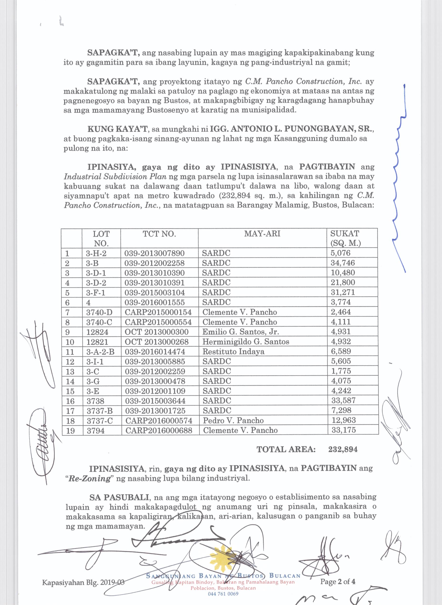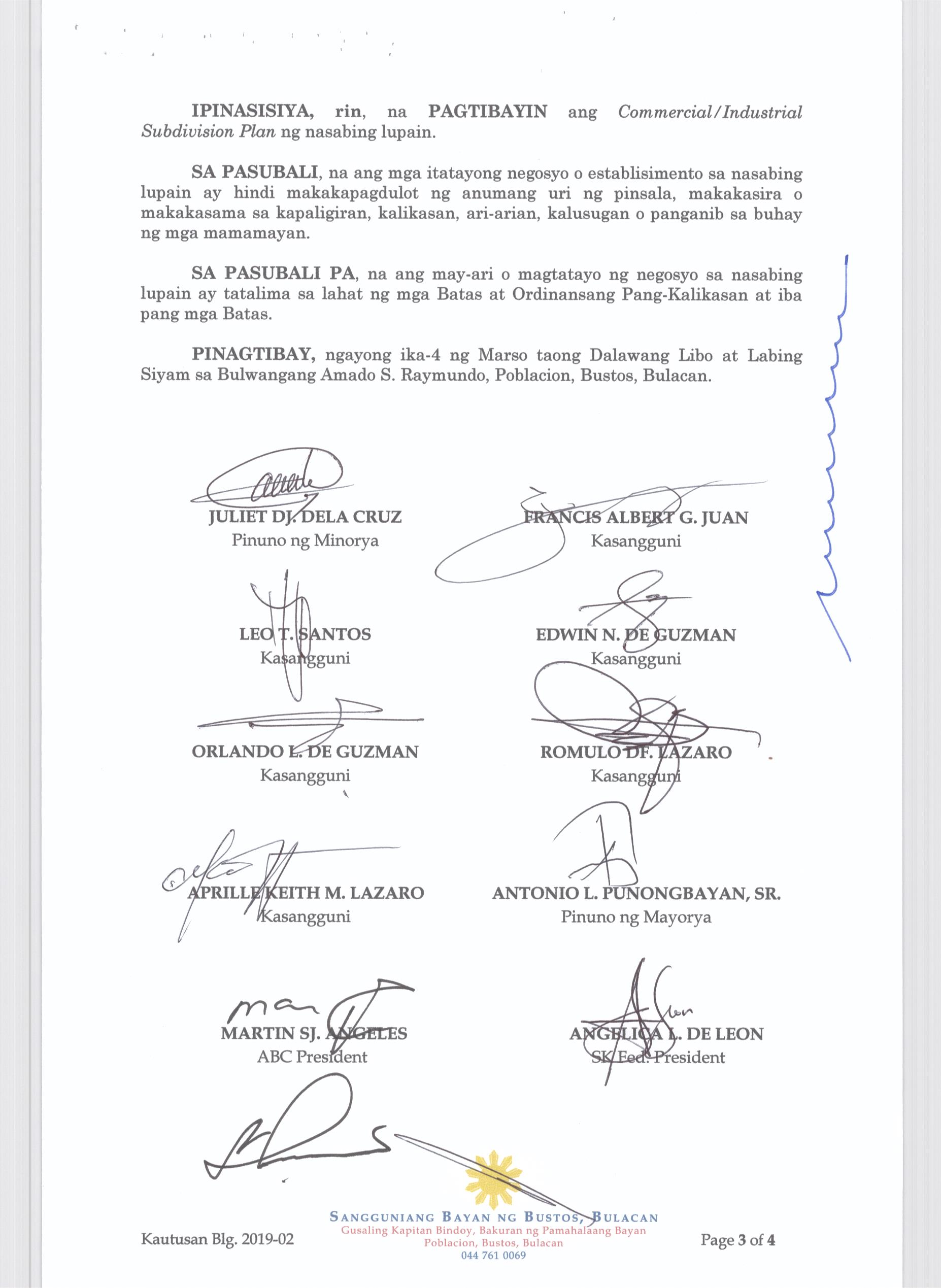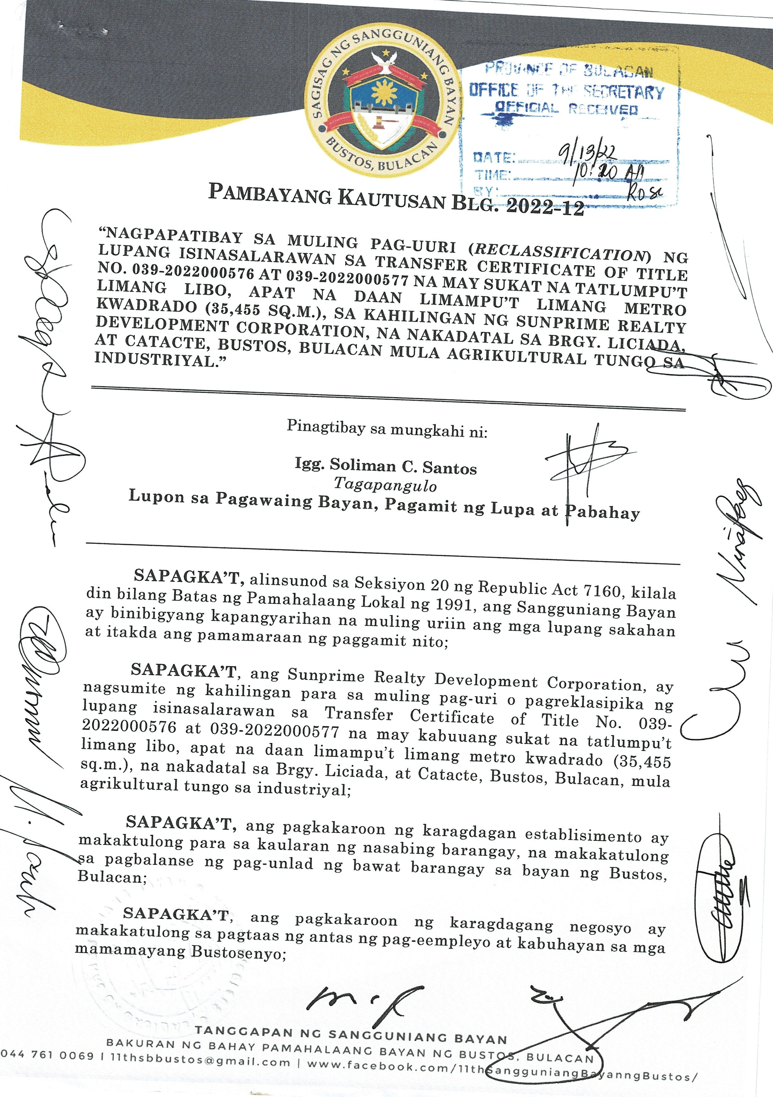 Pambayang Kautusang nagpapatibay sa kahilingan ni G. Adrian G. Santiago na muling pag-uuri ng lupa sa Barangay Bonga Menor Bustos Bulacan na may sukat na 2 ektarya buhat sa kabuuangsukat na 4.3 ektarya na isinasalarawan sa Transfer Certificate Title No. 039-2016006393 (LOT 4-A of the Subd. Plan PSD-03-177744)
