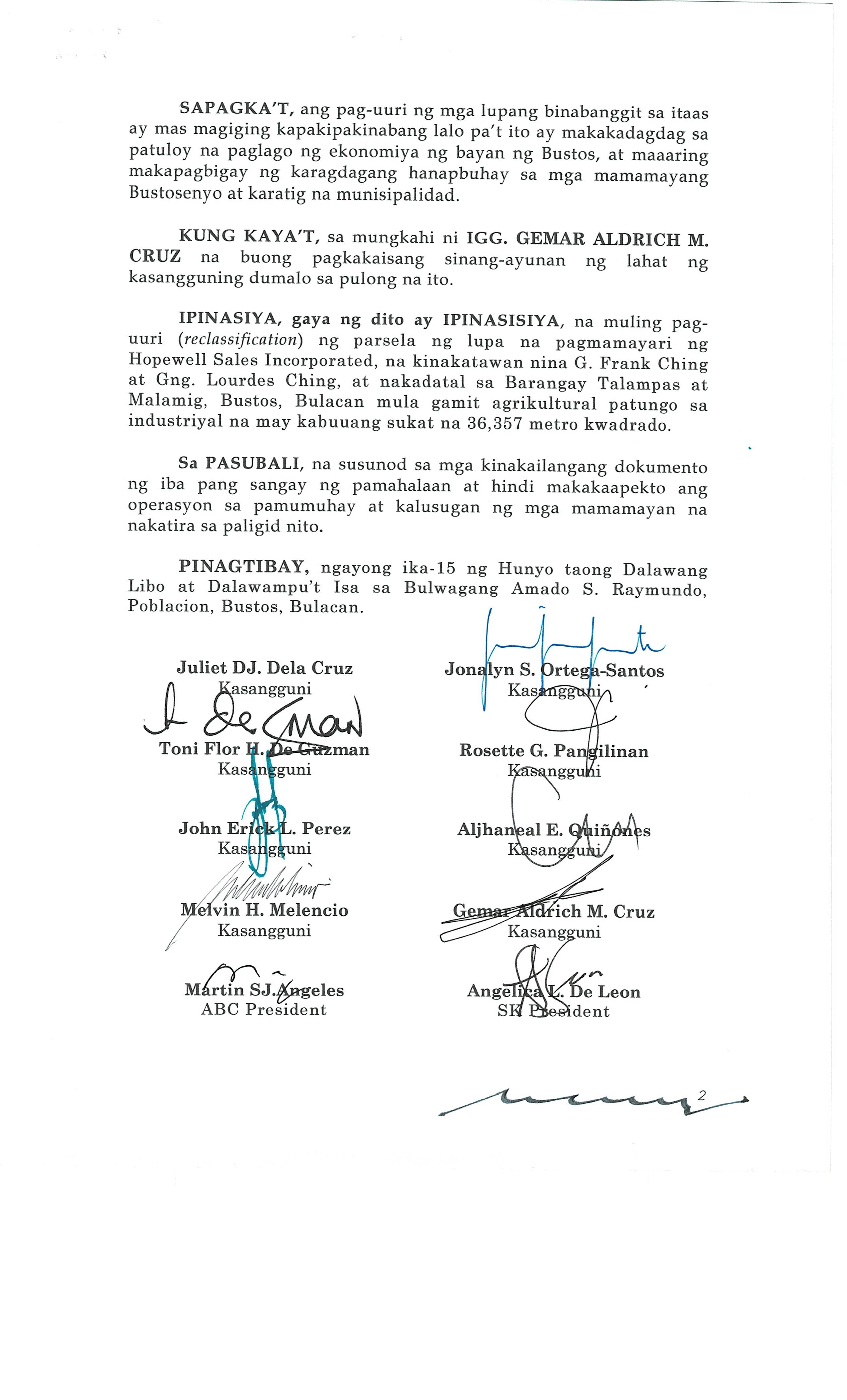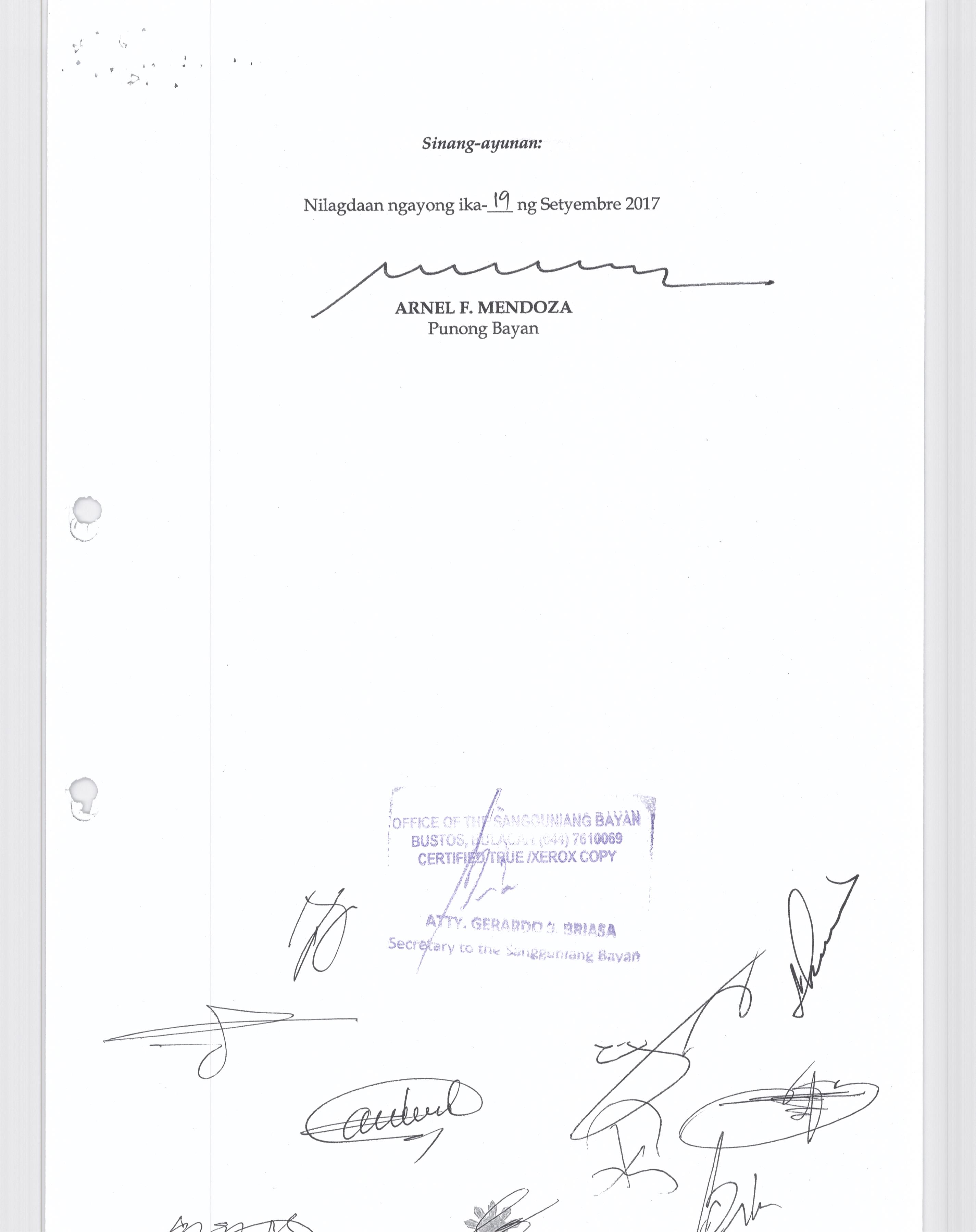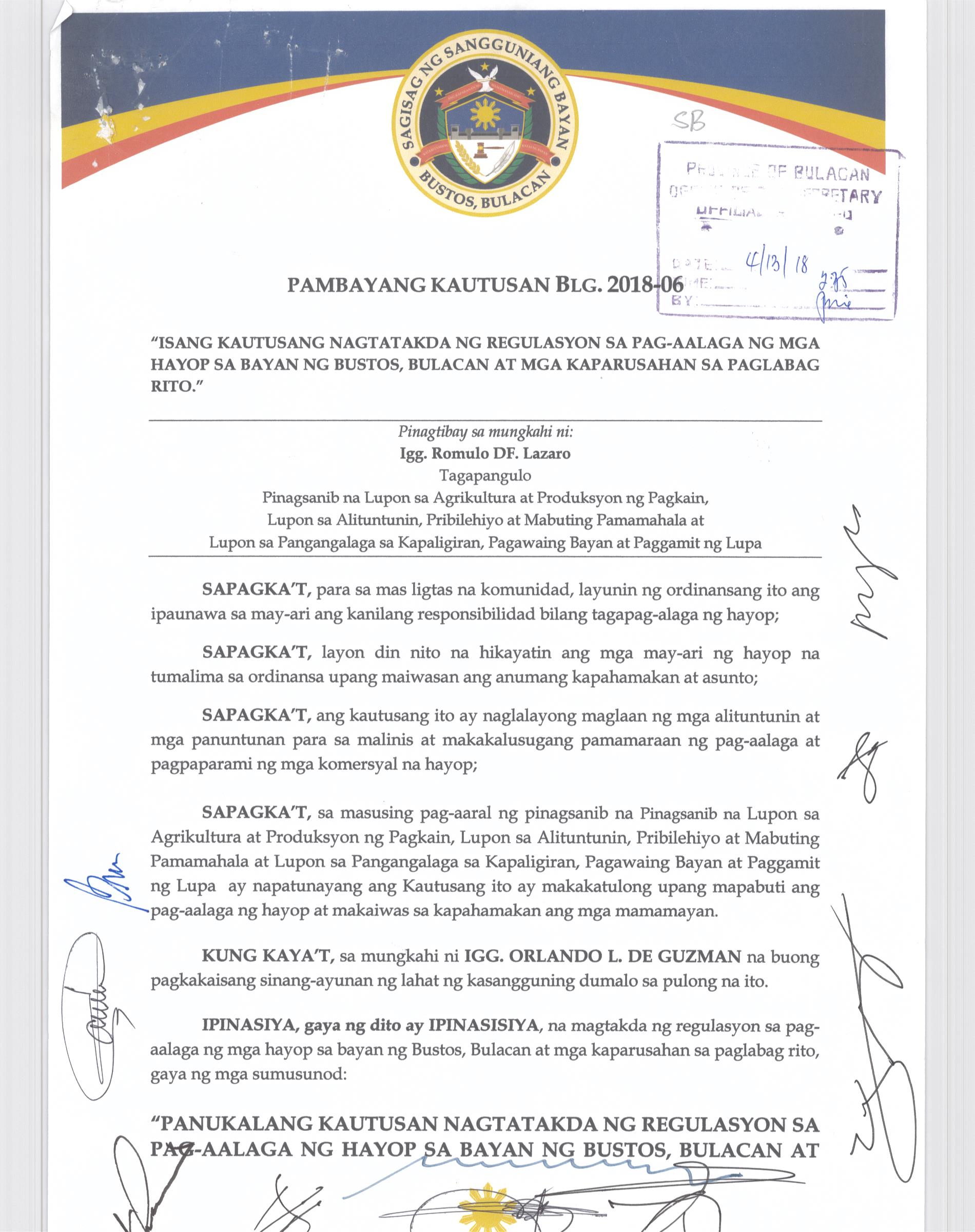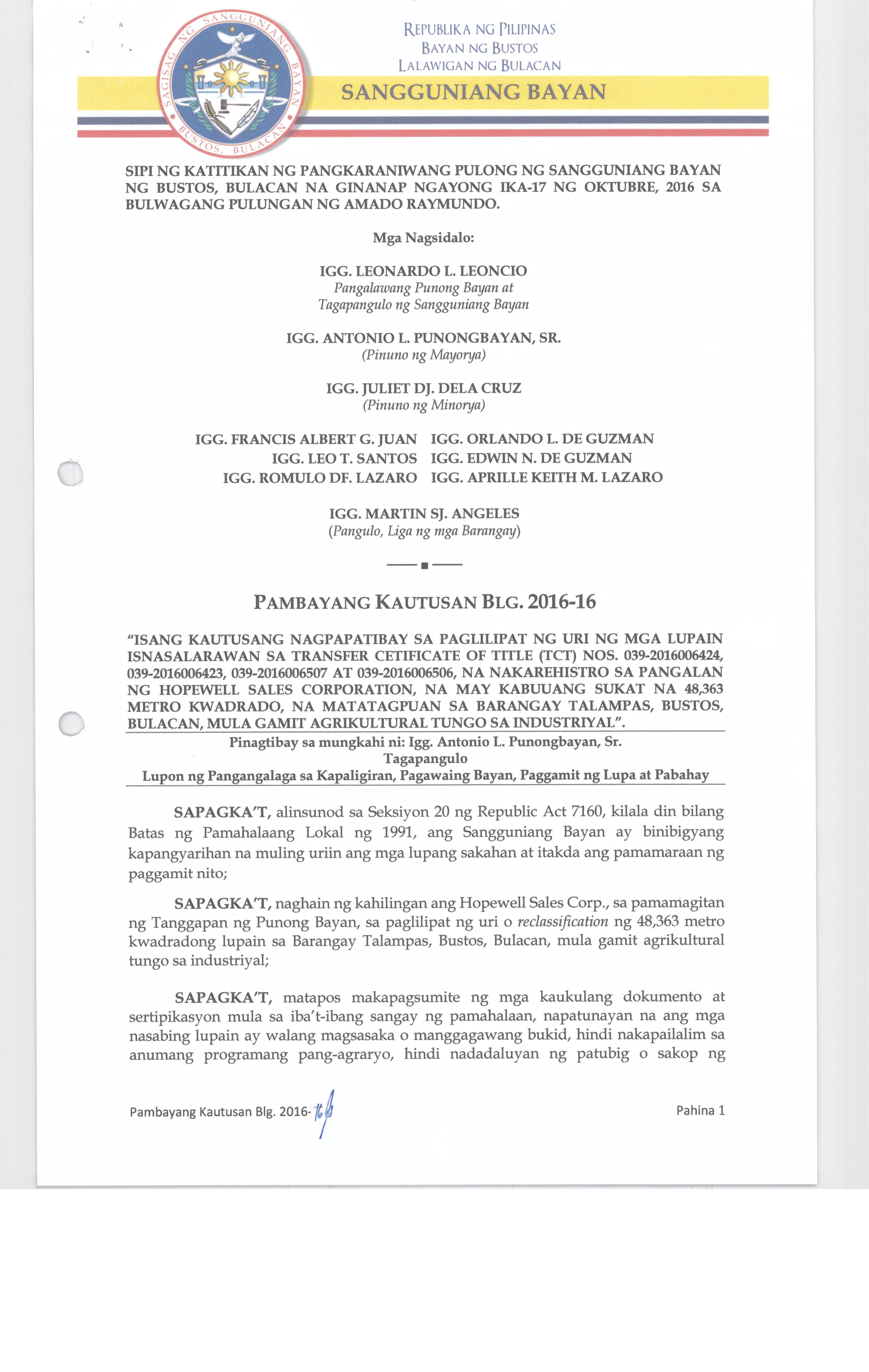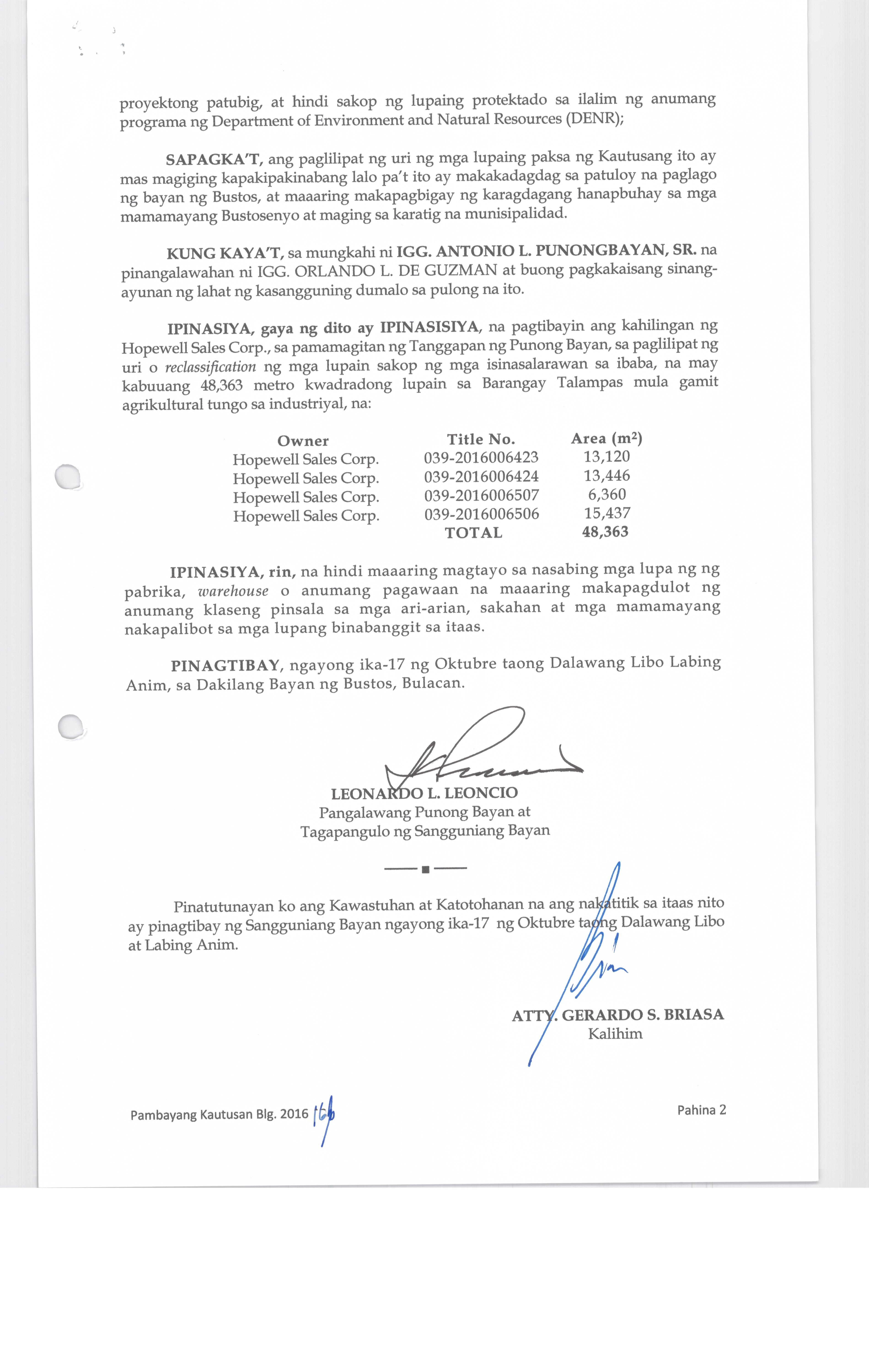Pambayang Kautusang nagpapatibay sa kahilingan ni G. Adrian G. Santiago na muling pag-uuri ng lupa sa Barangay Bonga Menor Bustos Bulacan na may sukat na 2 ektarya buhat sa kabuuangsukat na 4.3 ektarya na isinasalarawan sa Transfer Certificate Title No. 039-2016006393 (LOT 4-A of the Subd. Plan PSD-03-177744)