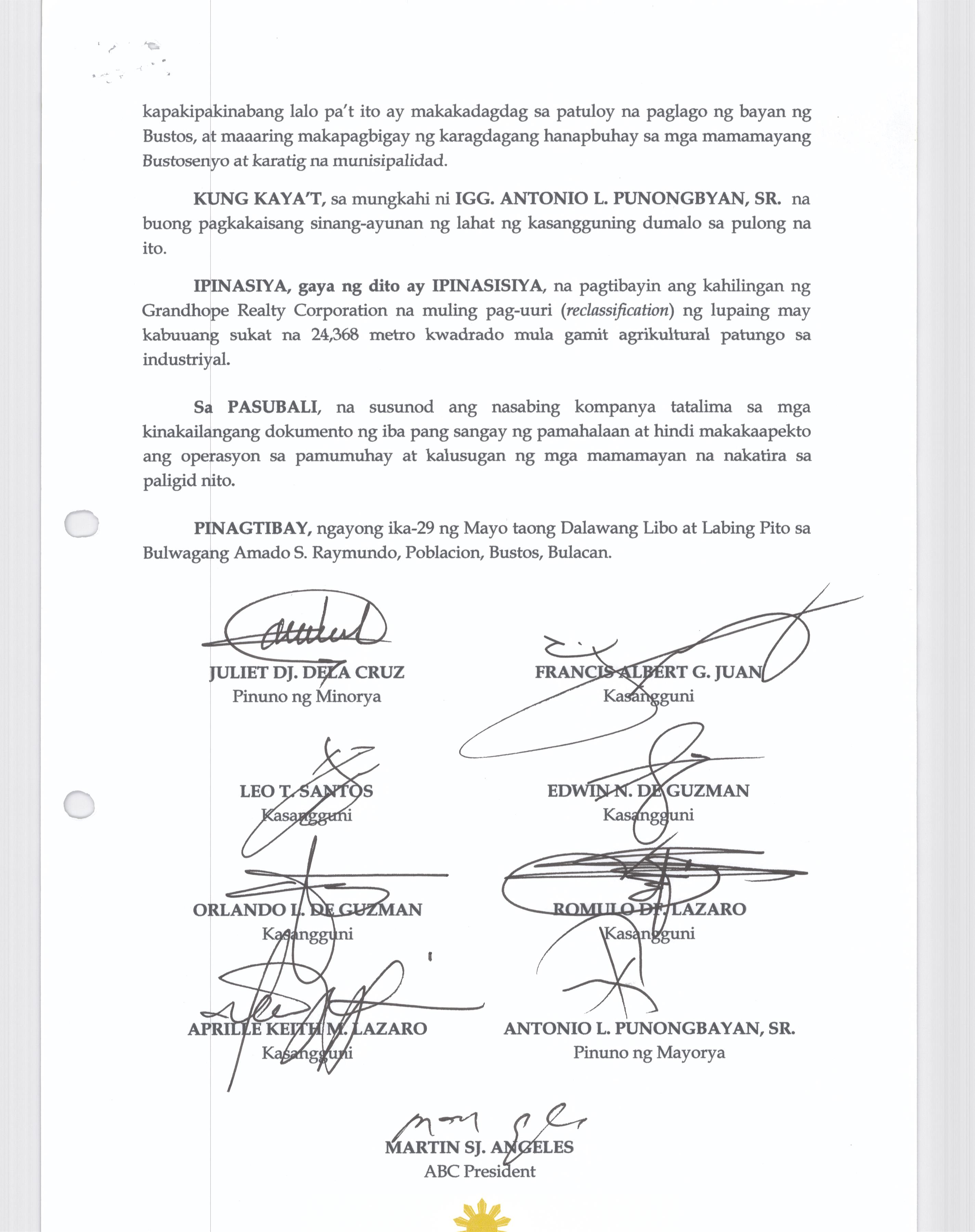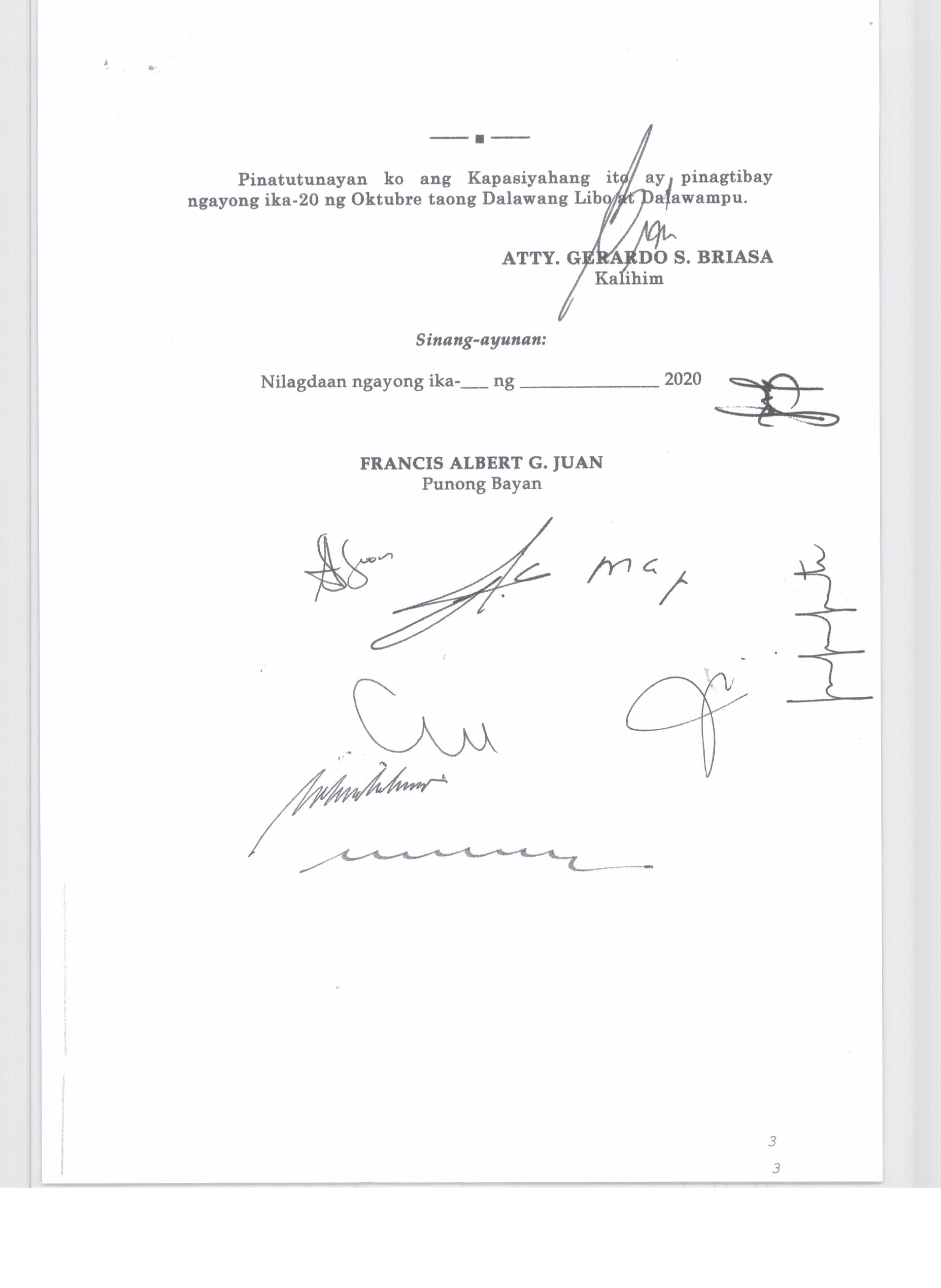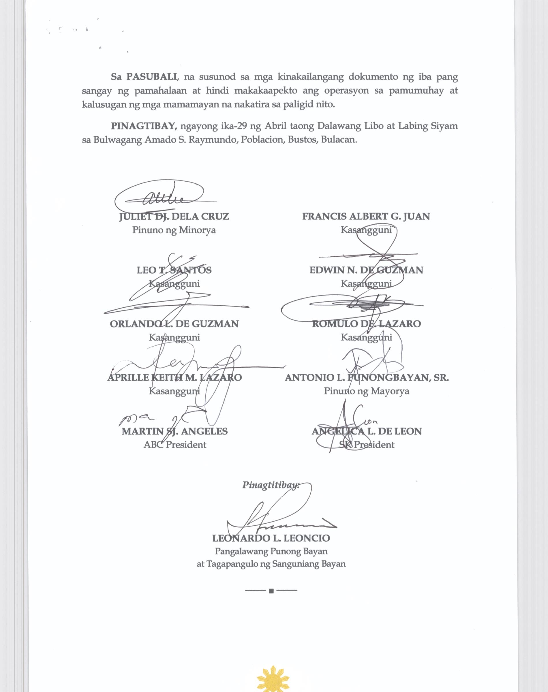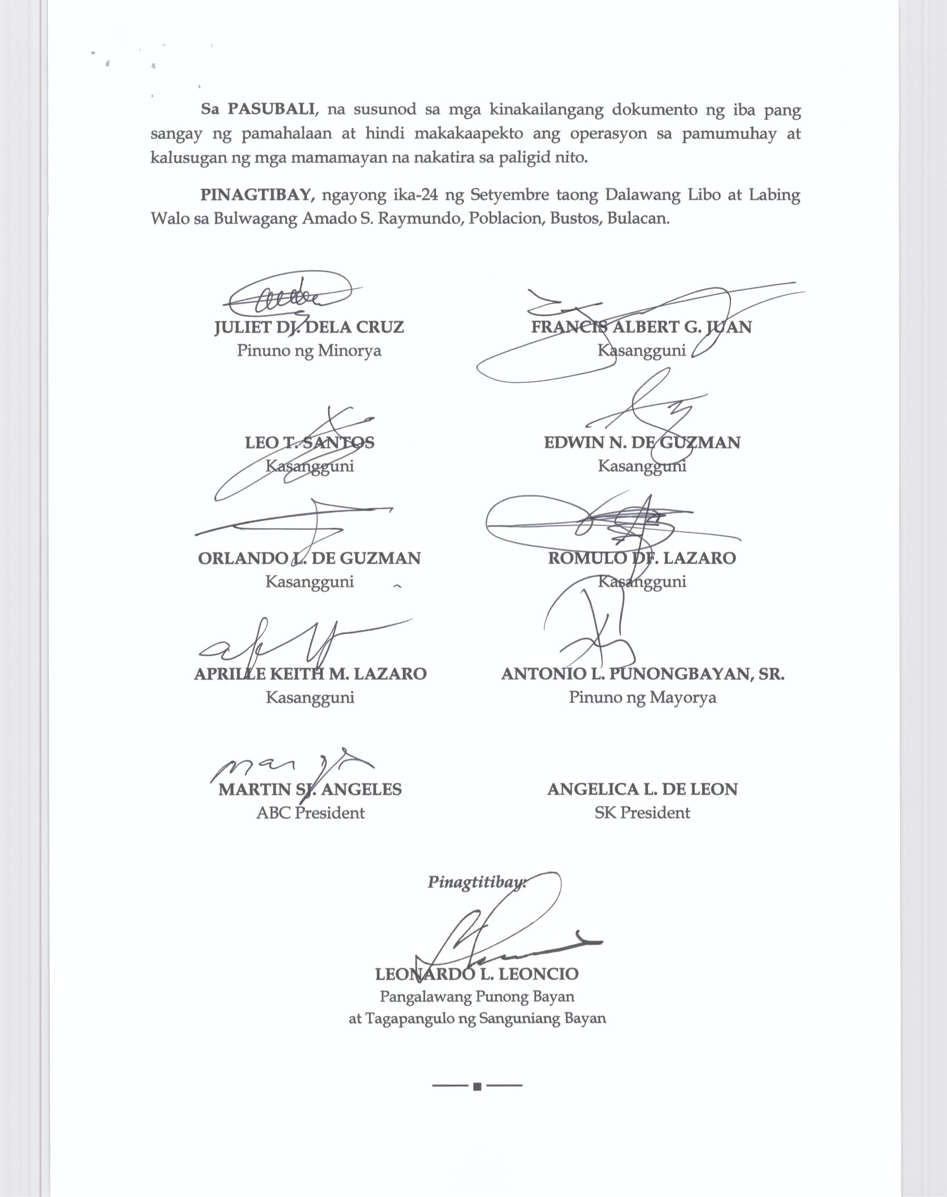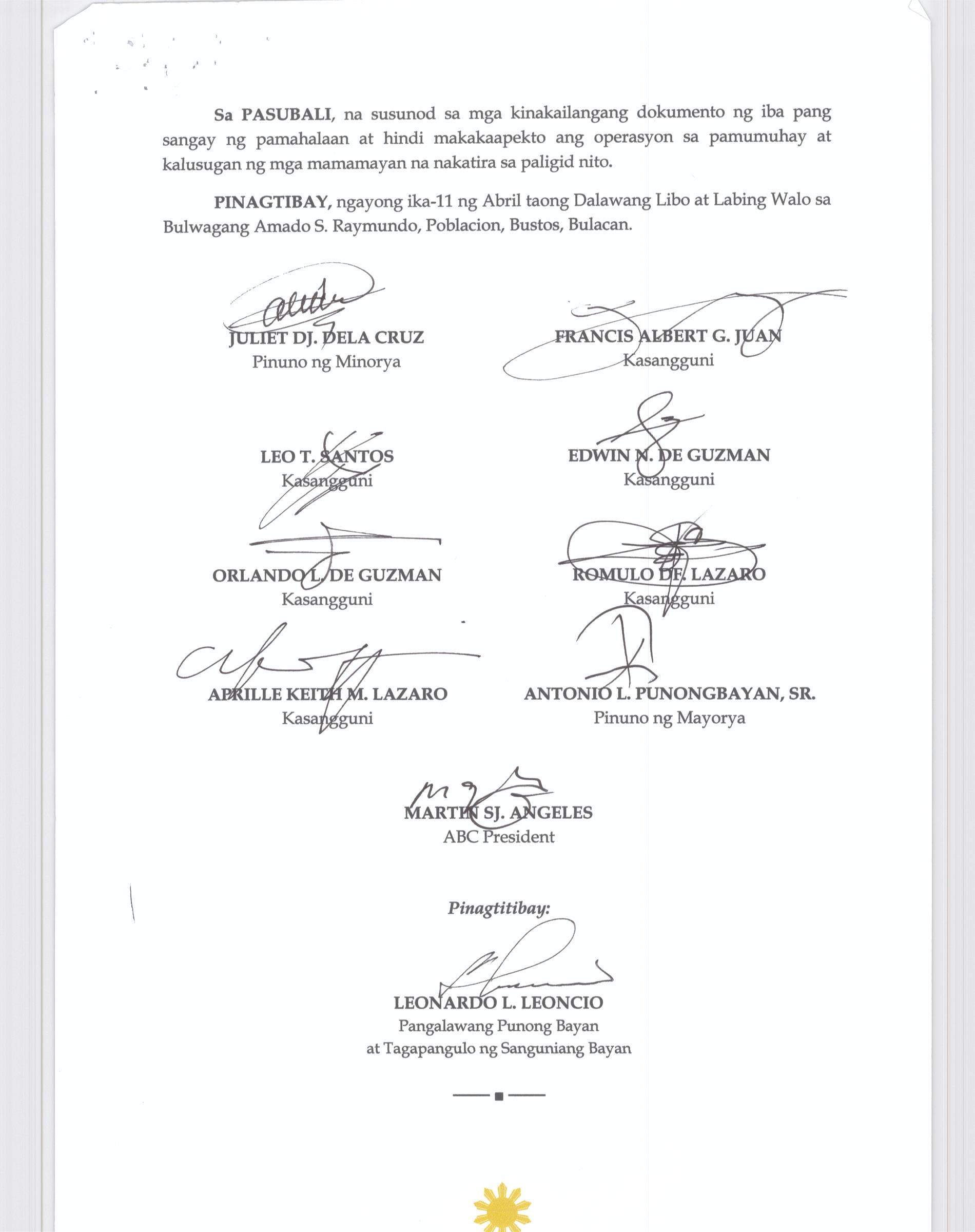 Pambayang Kautusang nagpapatibay sa kahilingan ni G. Adrian G. Santiago na muling pag-uuri ng lupa sa Barangay Bonga Menor Bustos Bulacan na may sukat na 2 ektarya buhat sa kabuuangsukat na 4.3 ektarya na isinasalarawan sa Transfer Certificate Title No. 039-2016006393 (LOT 4-A of the Subd. Plan PSD-03-177744)