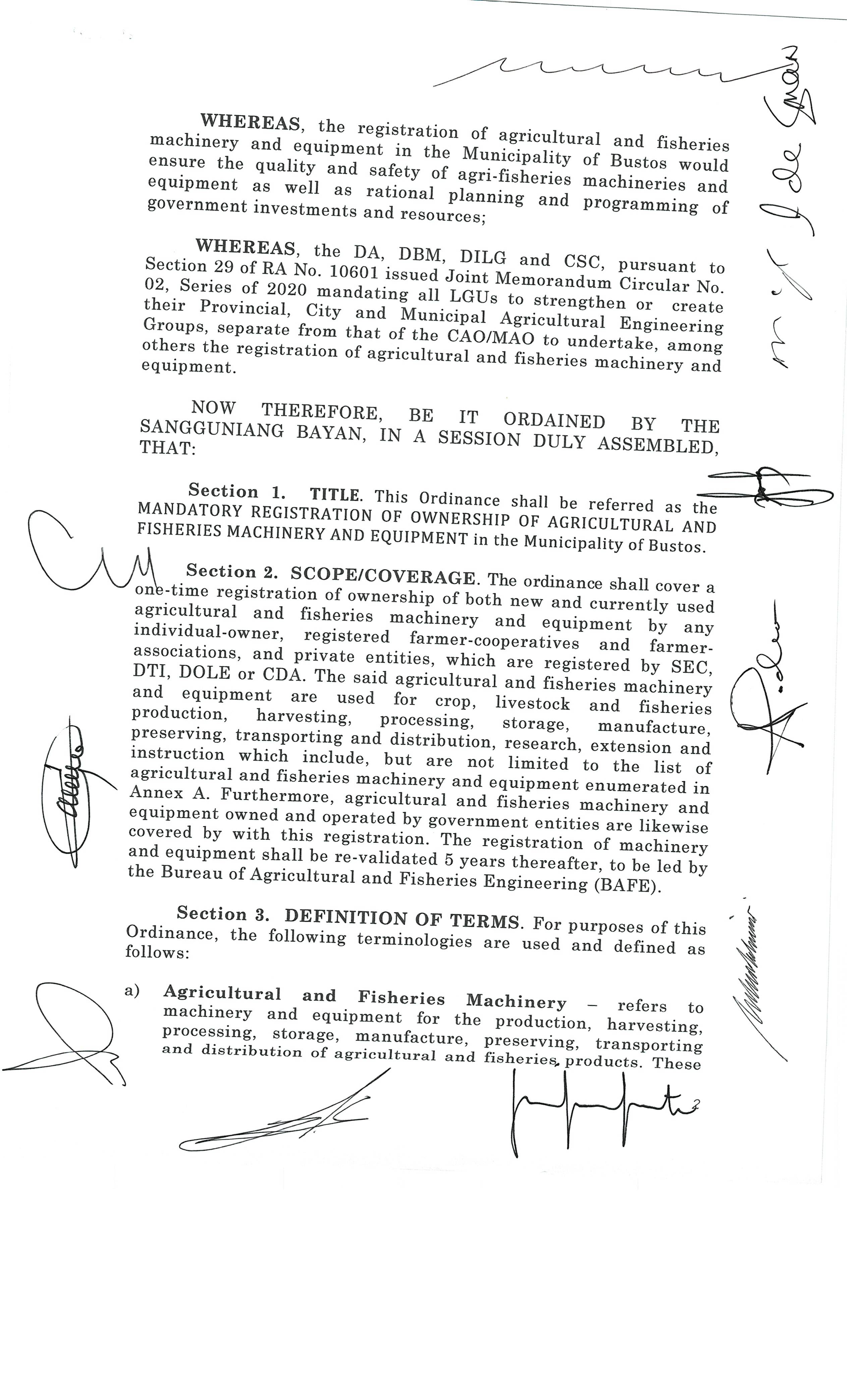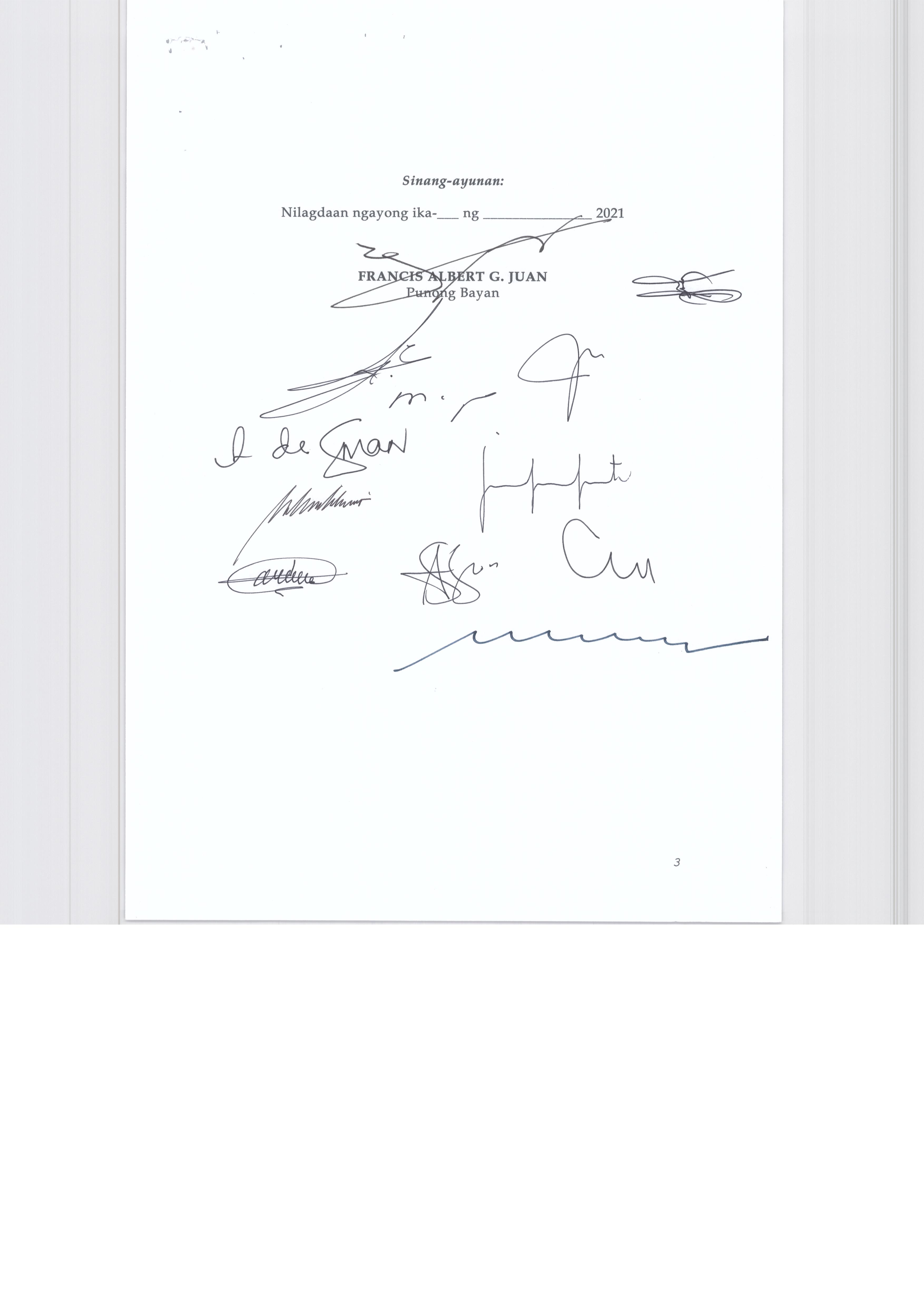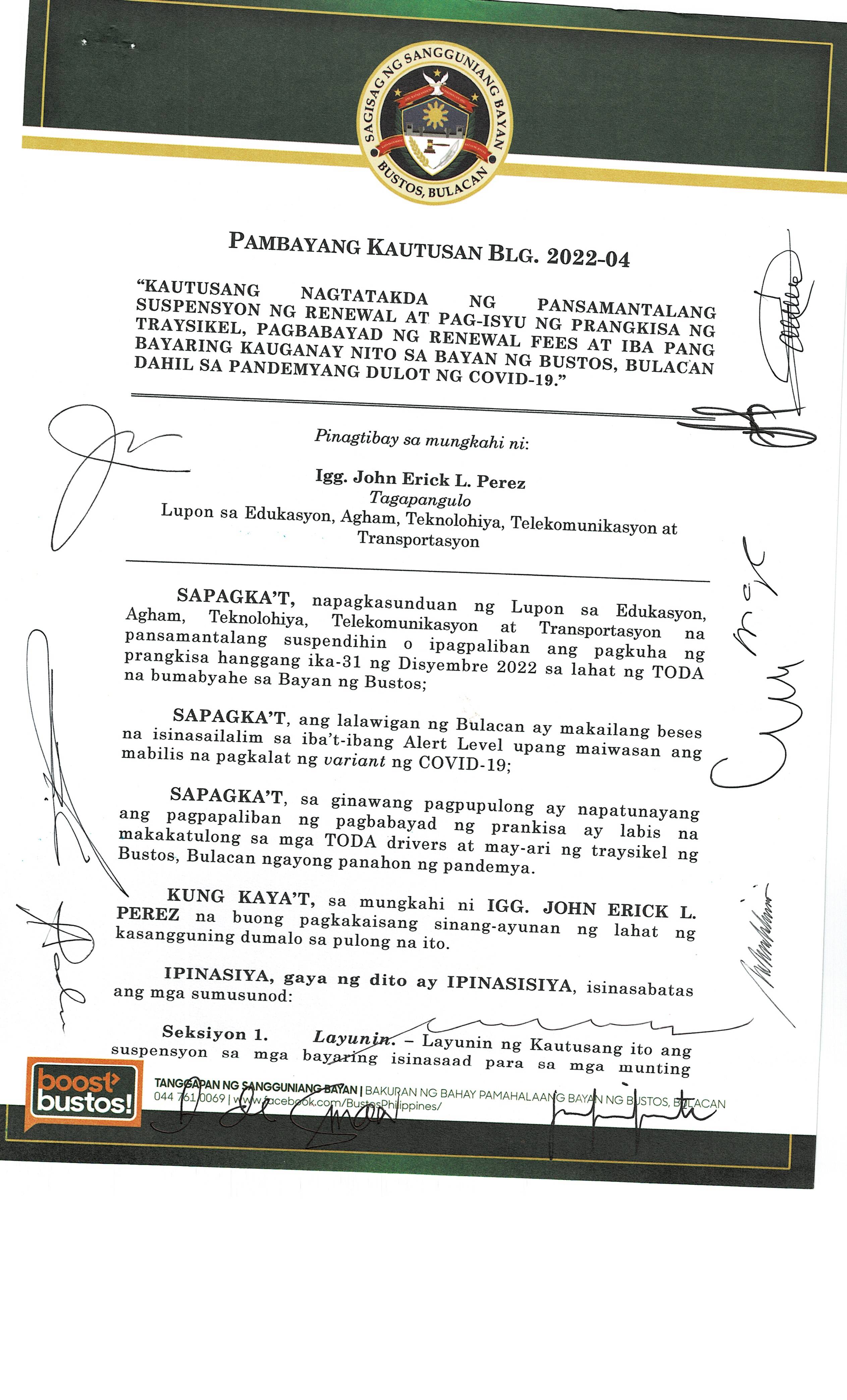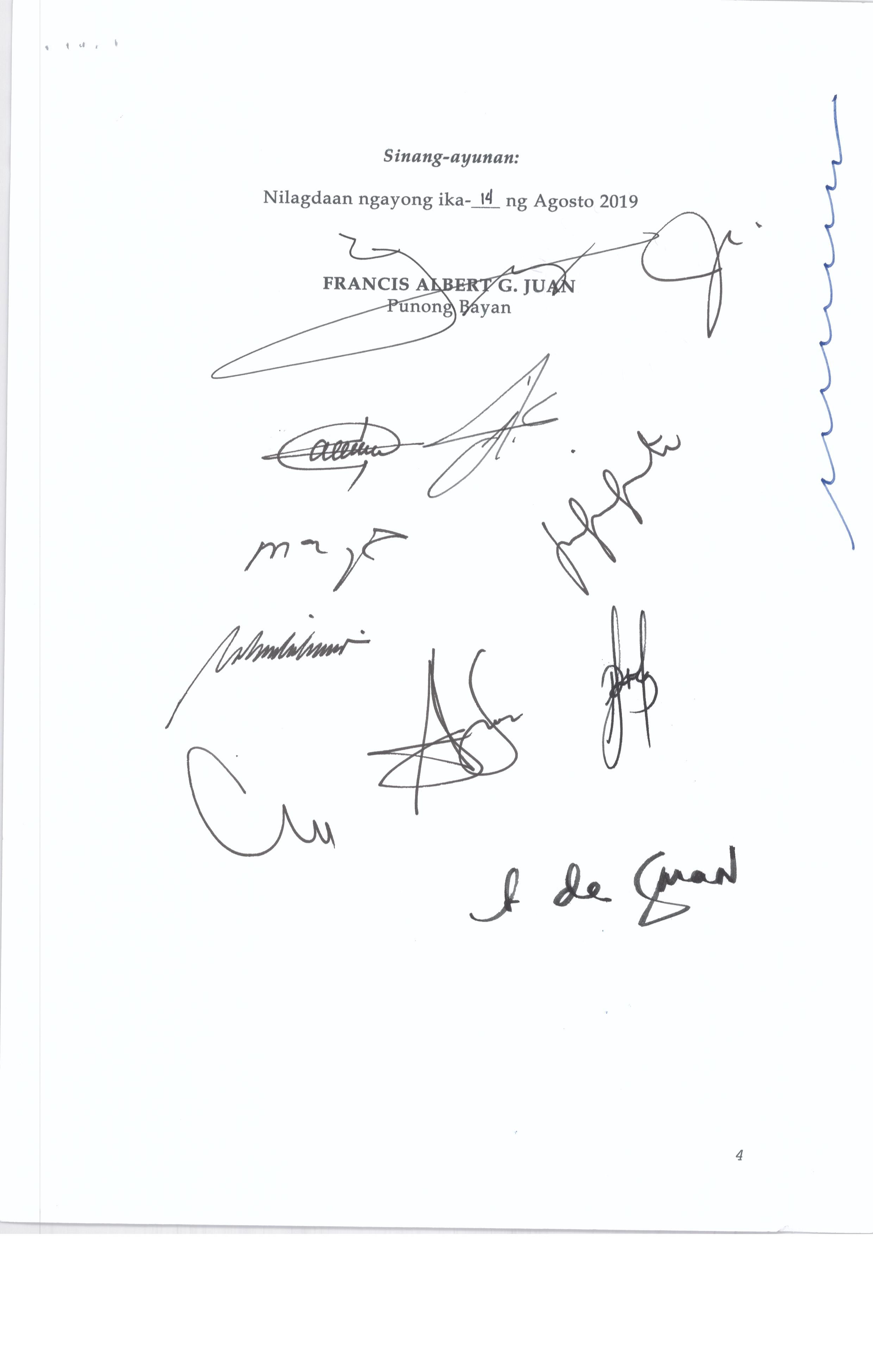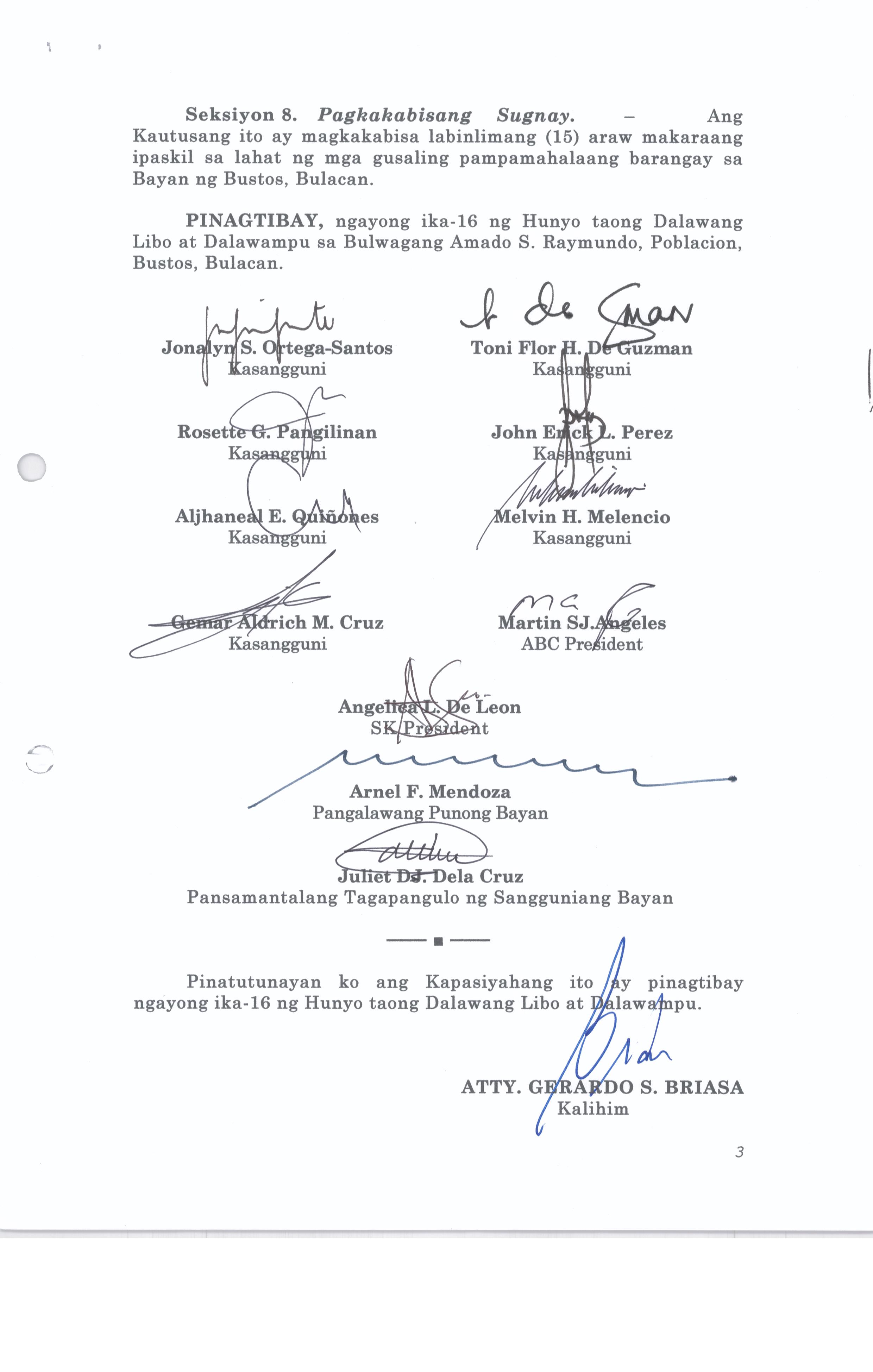 Pambayang Kautusang nagpapatibay sa kahilingan ni G. Adrian G. Santiago na muling pag-uuri ng lupa sa Barangay Bonga Menor Bustos Bulacan na may sukat na 2 ektarya buhat sa kabuuangsukat na 4.3 ektarya na isinasalarawan sa Transfer Certificate Title No. 039-2016006393 (LOT 4-A of the Subd. Plan PSD-03-177744)