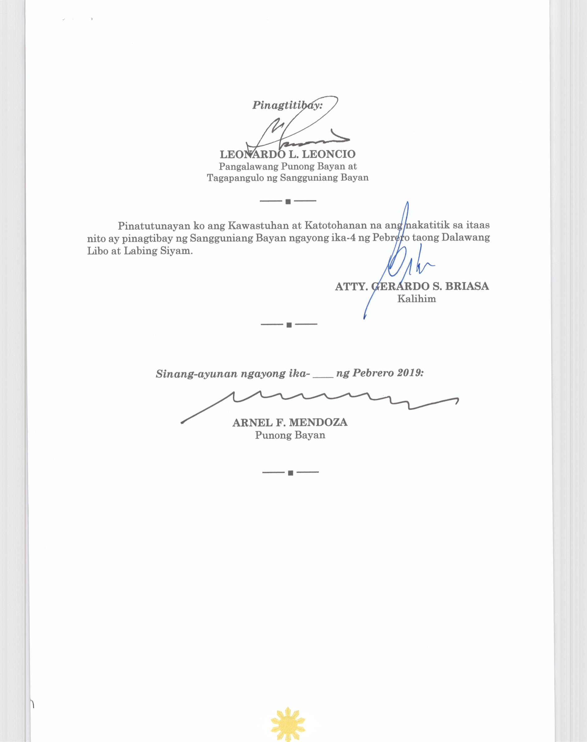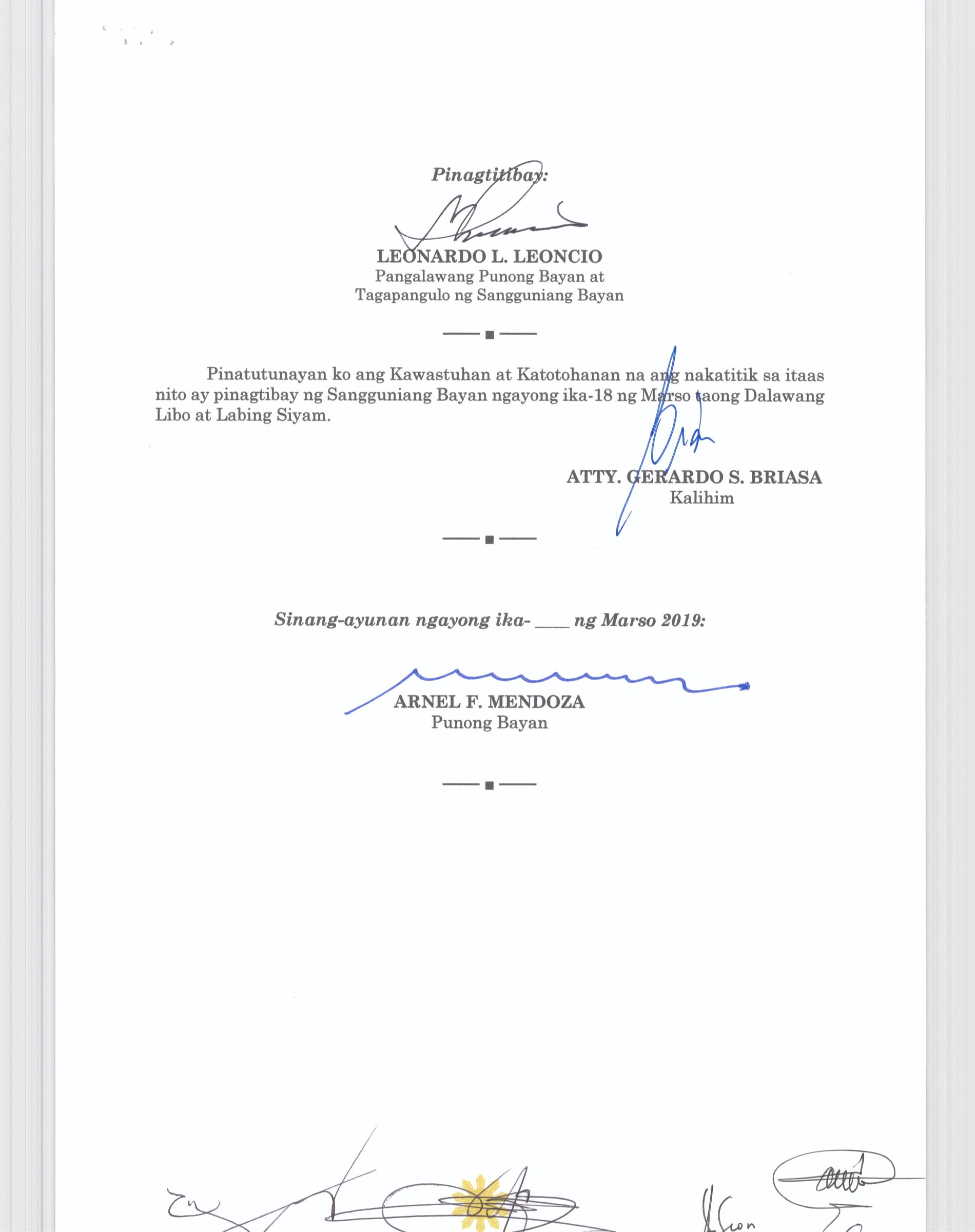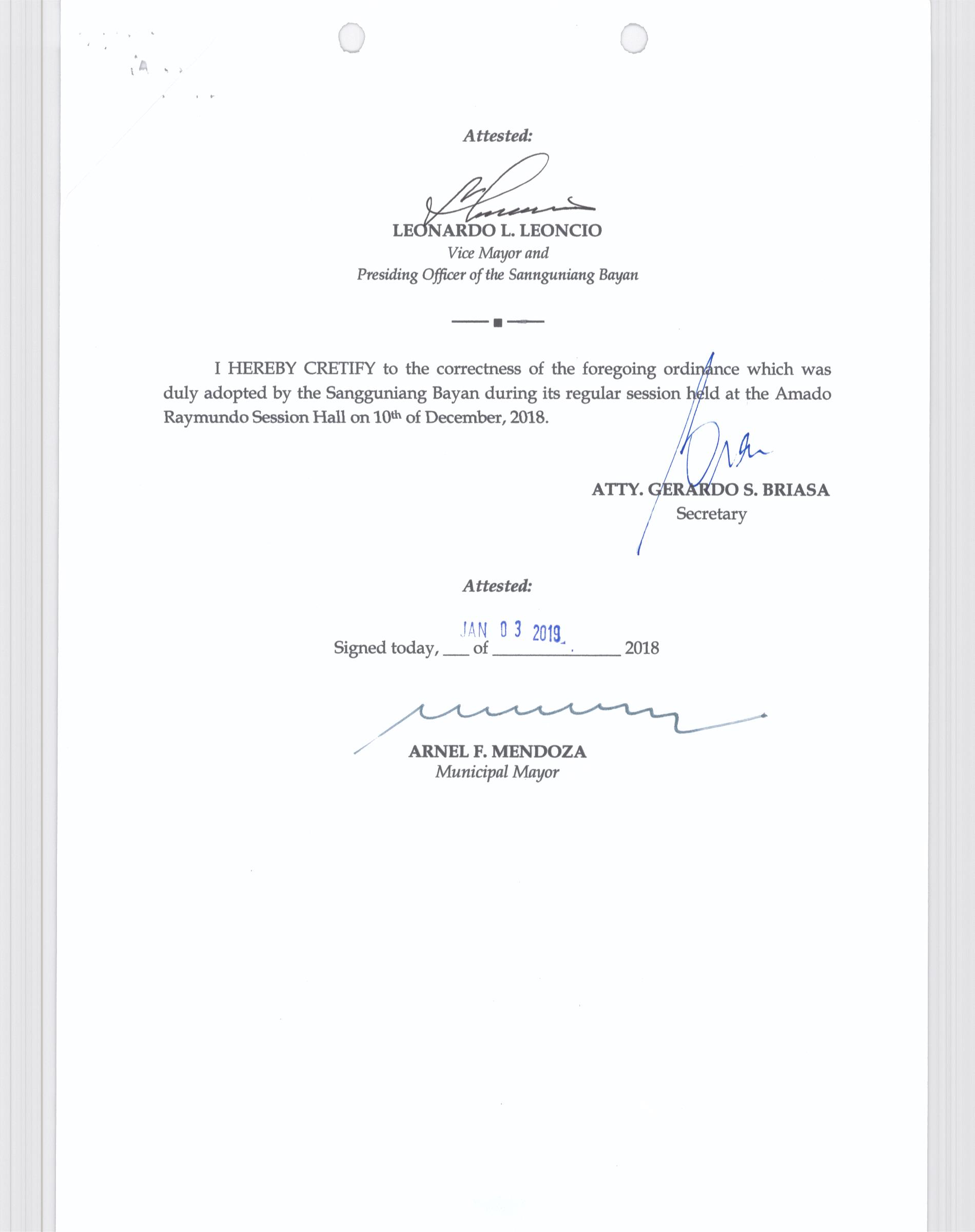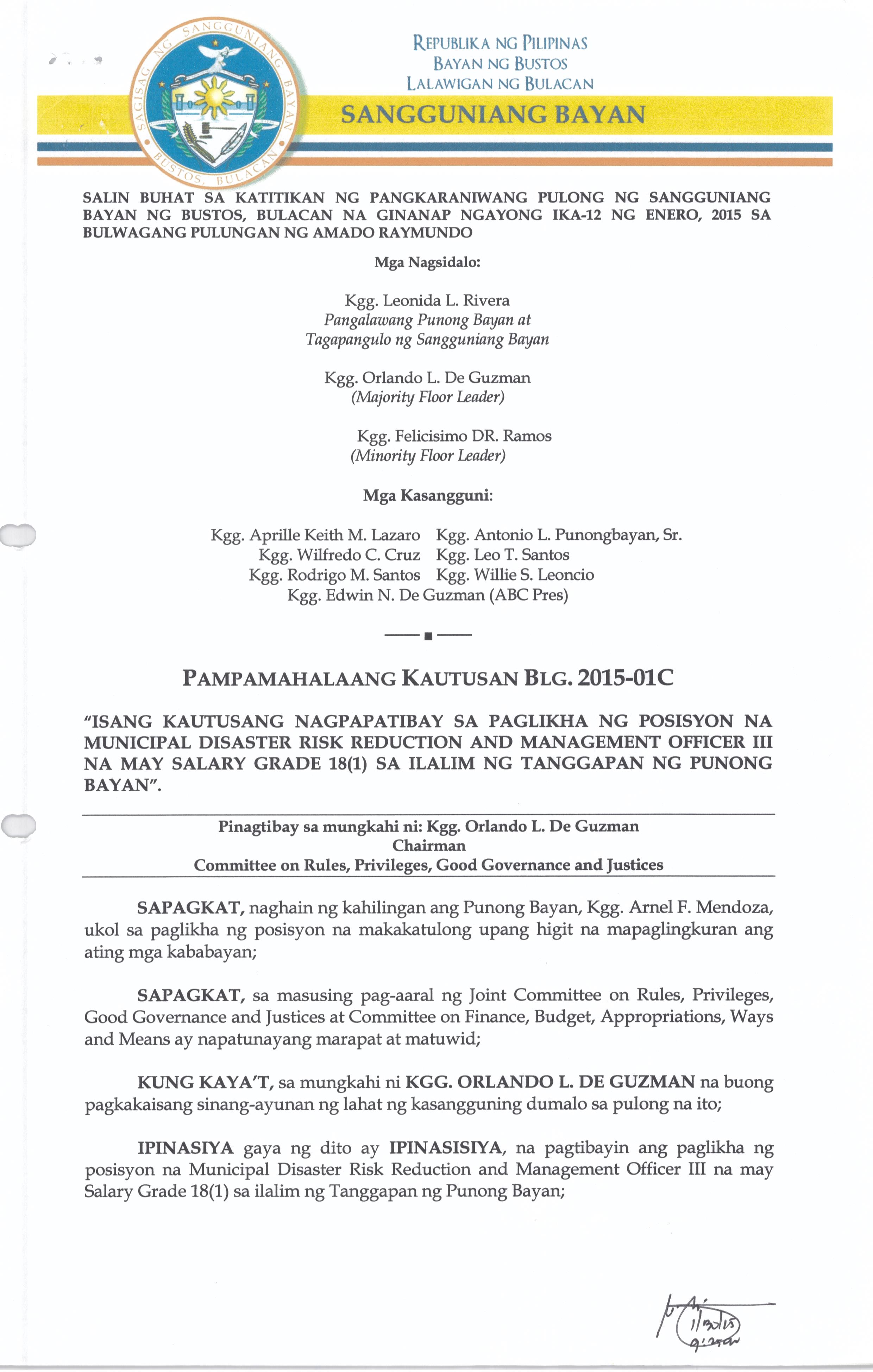 Isang Kautusang nagpapatibay sa Paglikha ng Posisyon ng Municipal risk Reduction and Management Officer lll na may salary Grade 18 (1) sa Ilalim ng Tanggapan ng Punong Bayan.