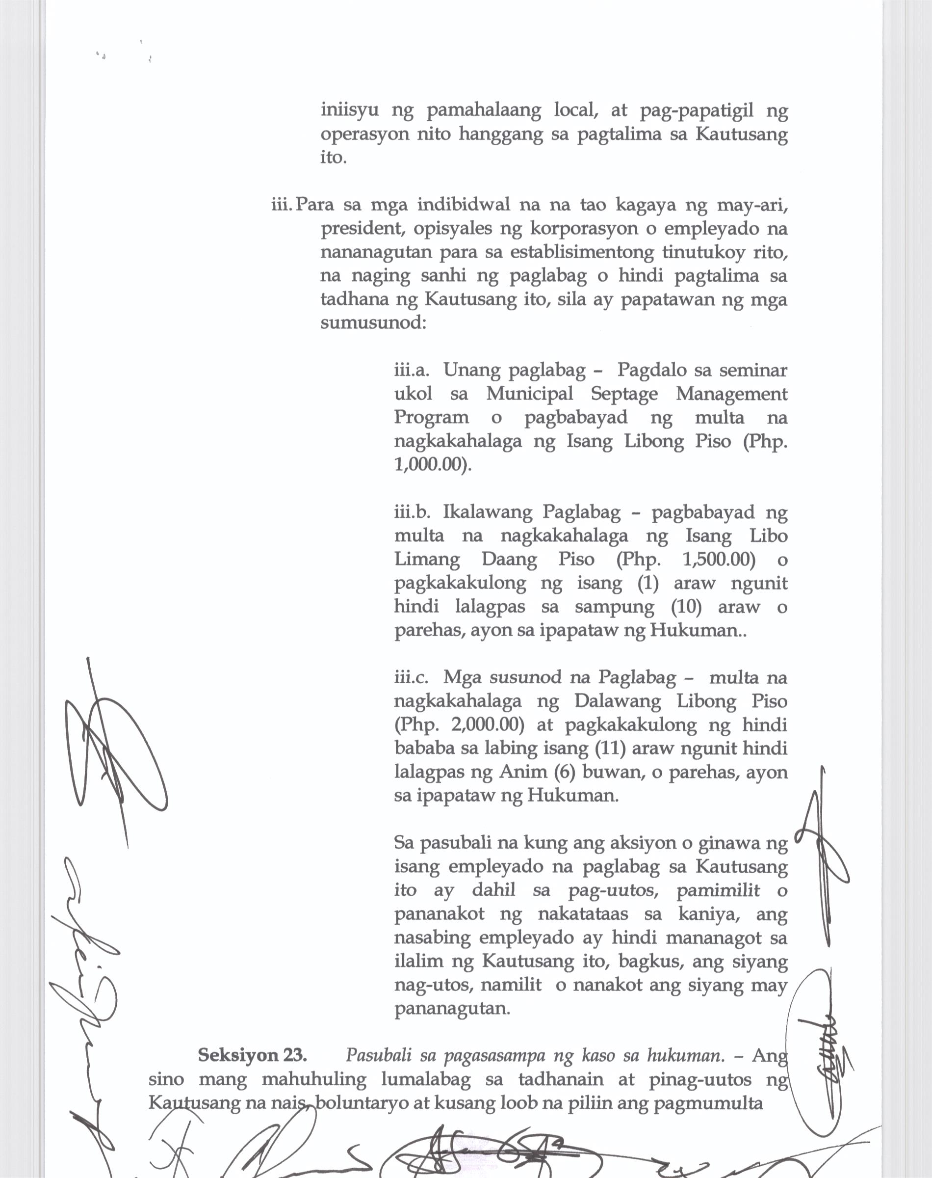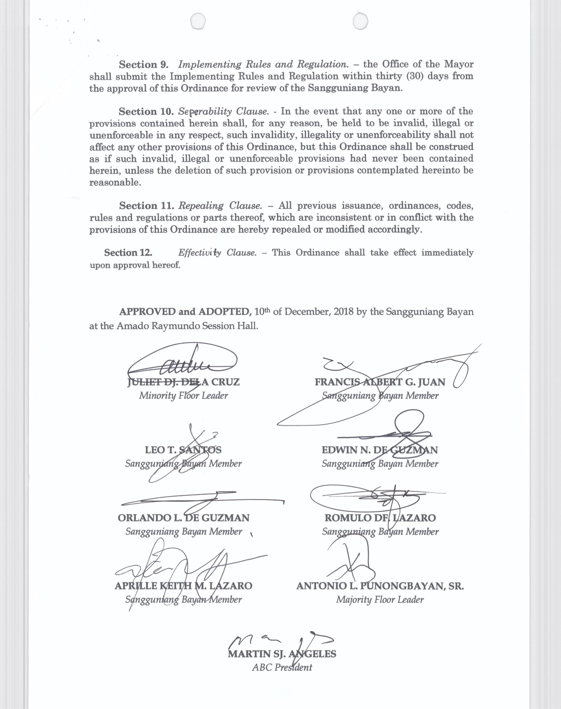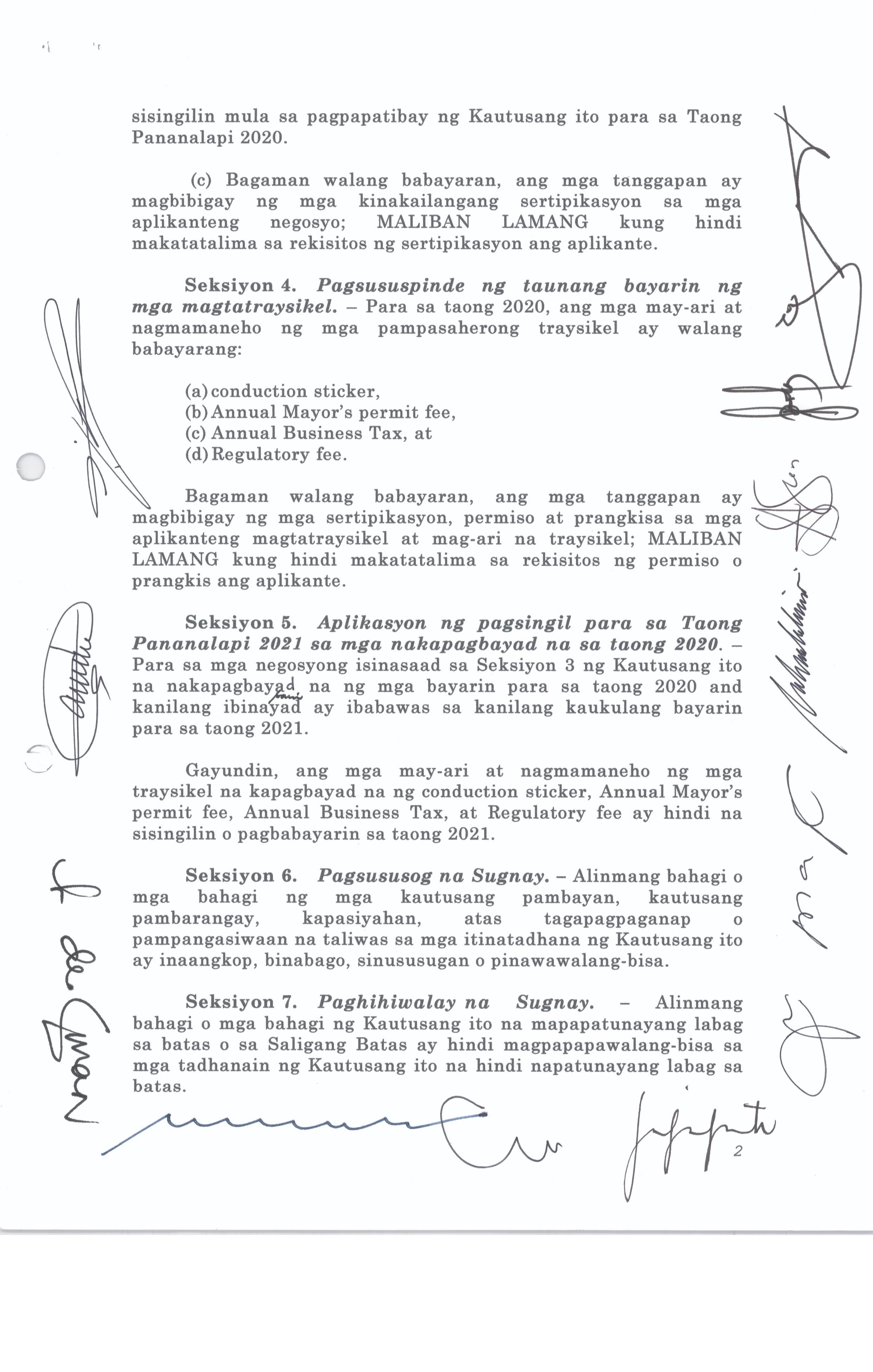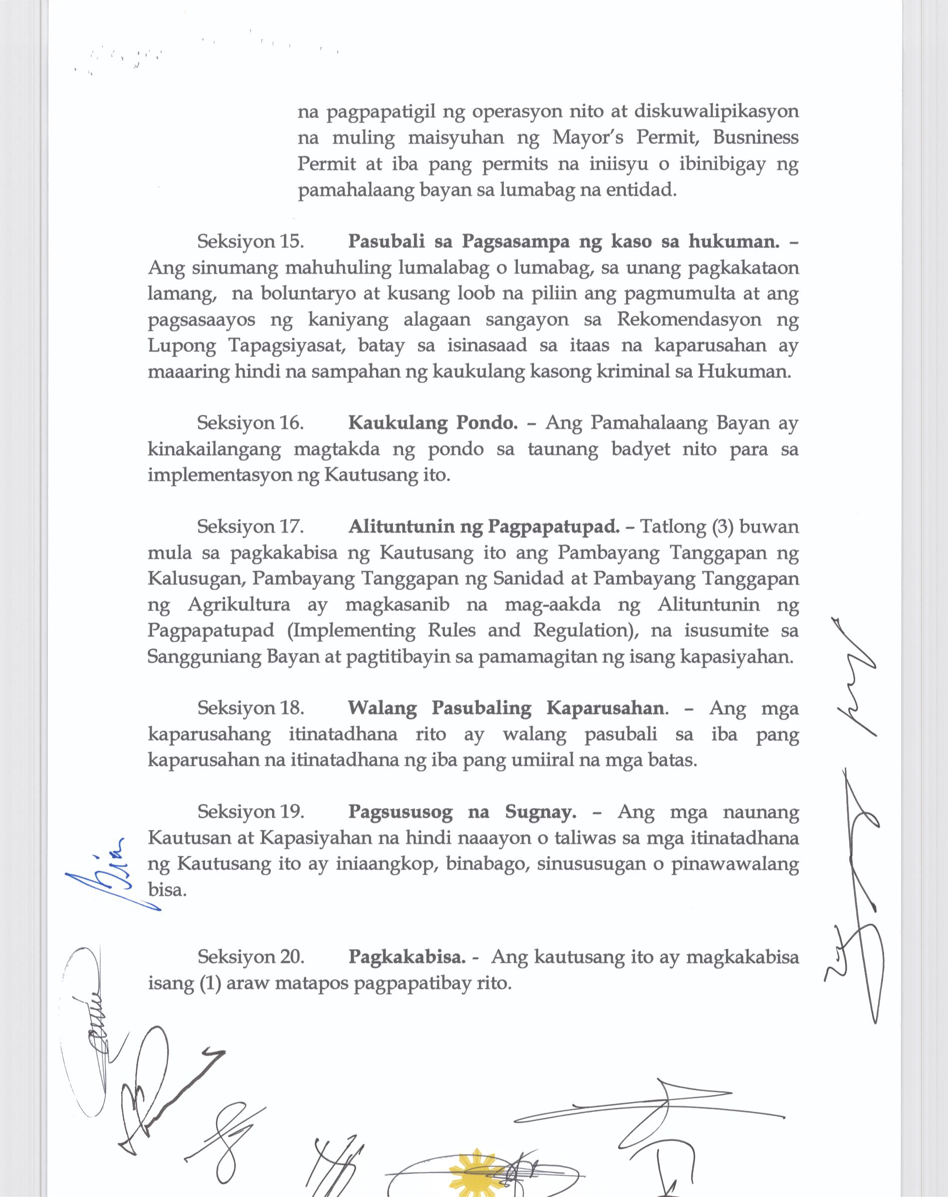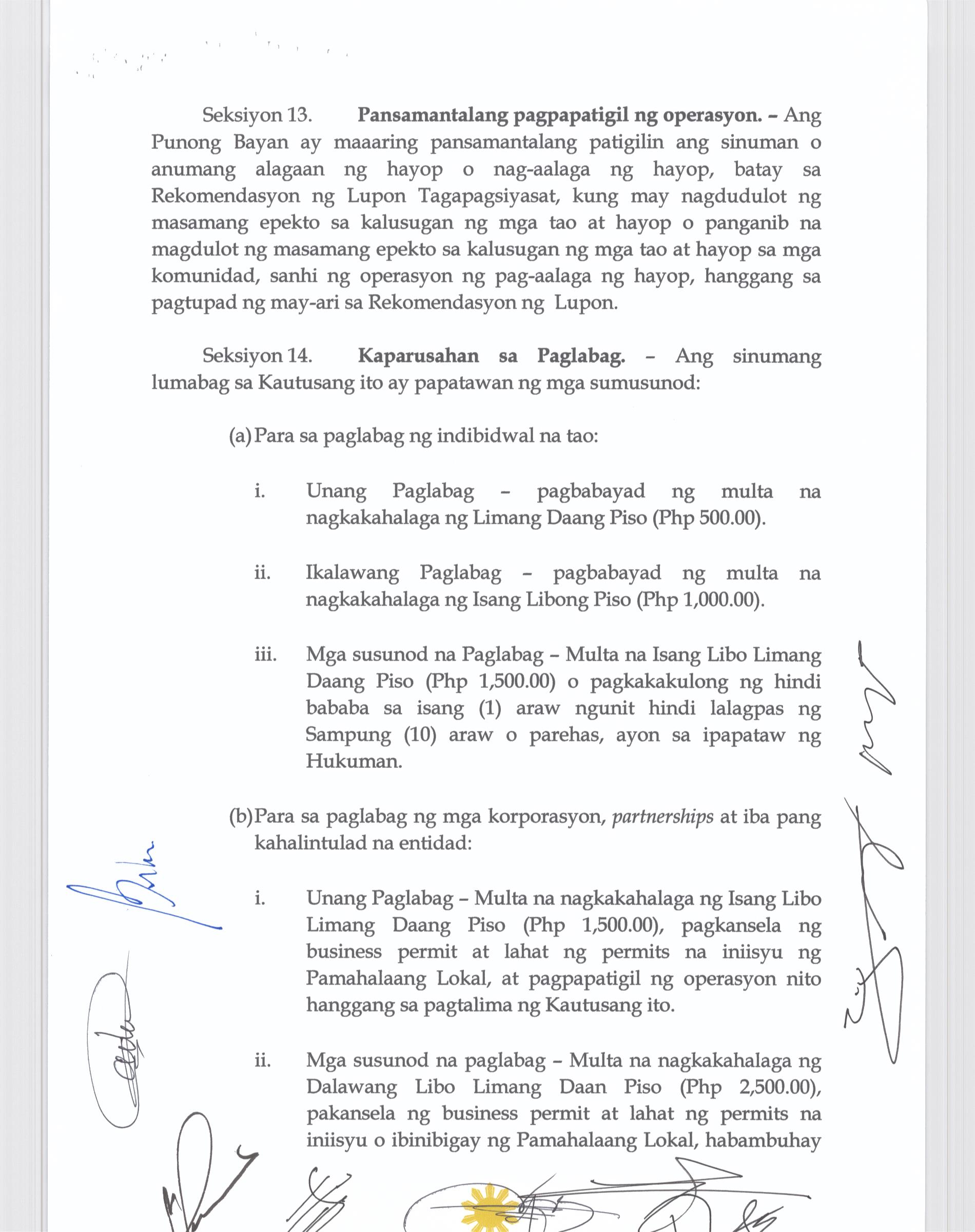 Isang Kautusang Nagpapatibay sa Pagsususog sa Seksiyon 114 at 117 ng Municipal Ordinance No. 2014-004.