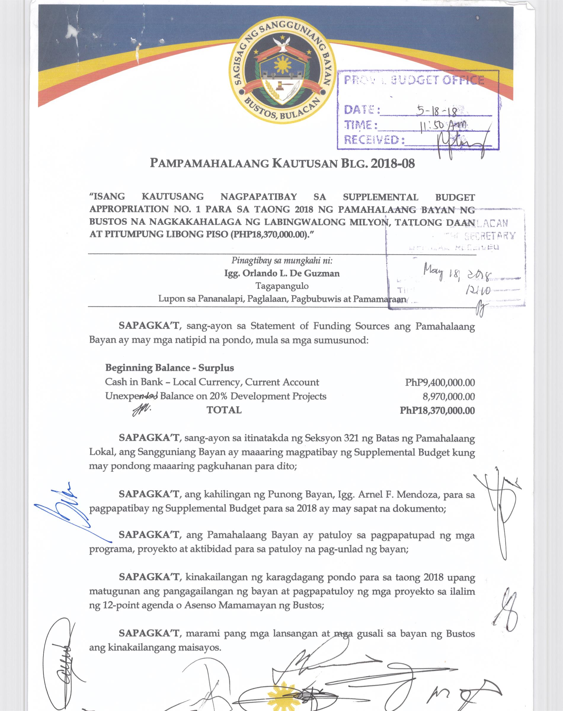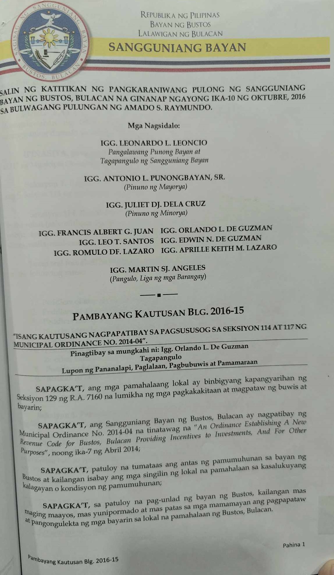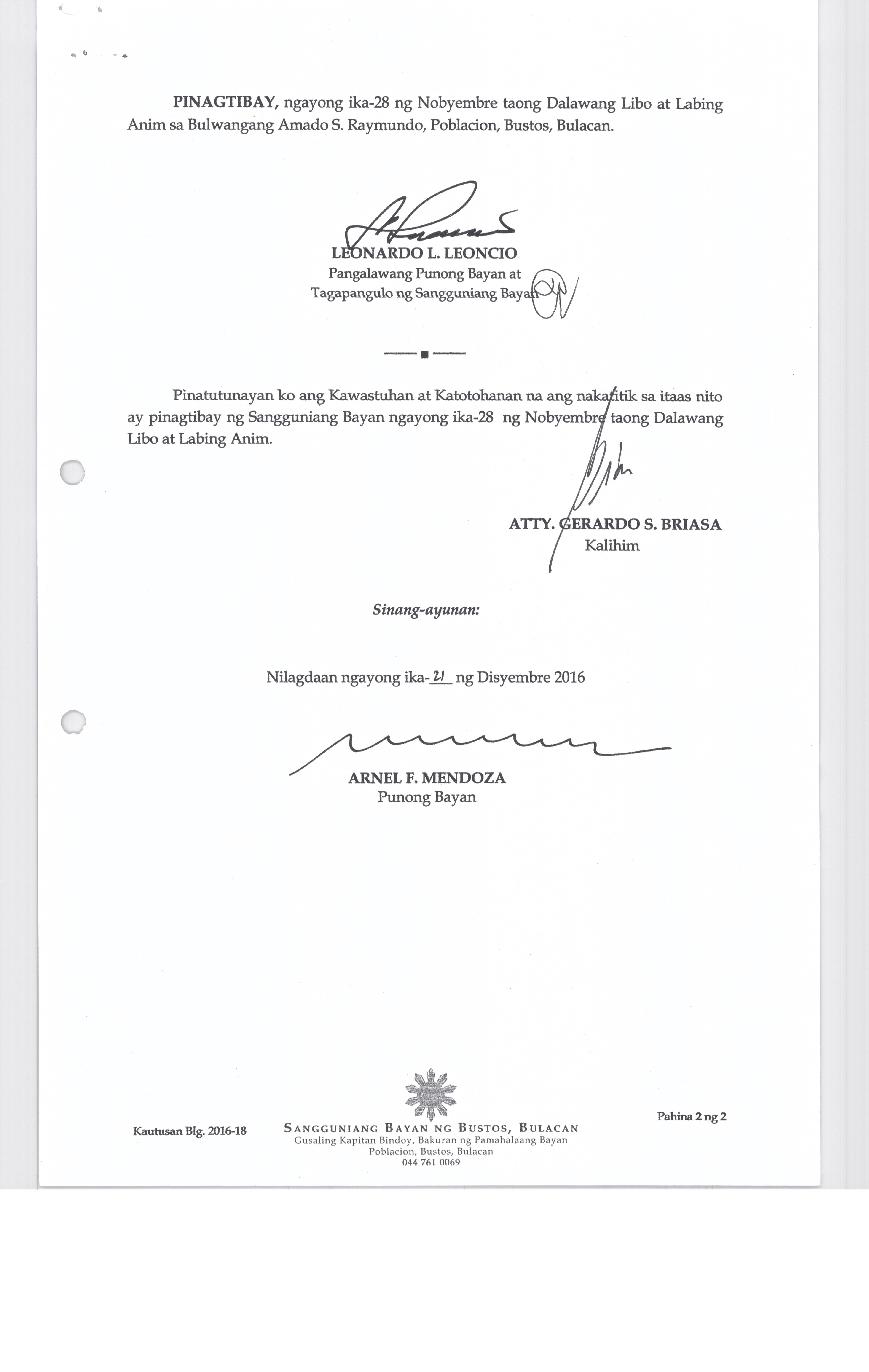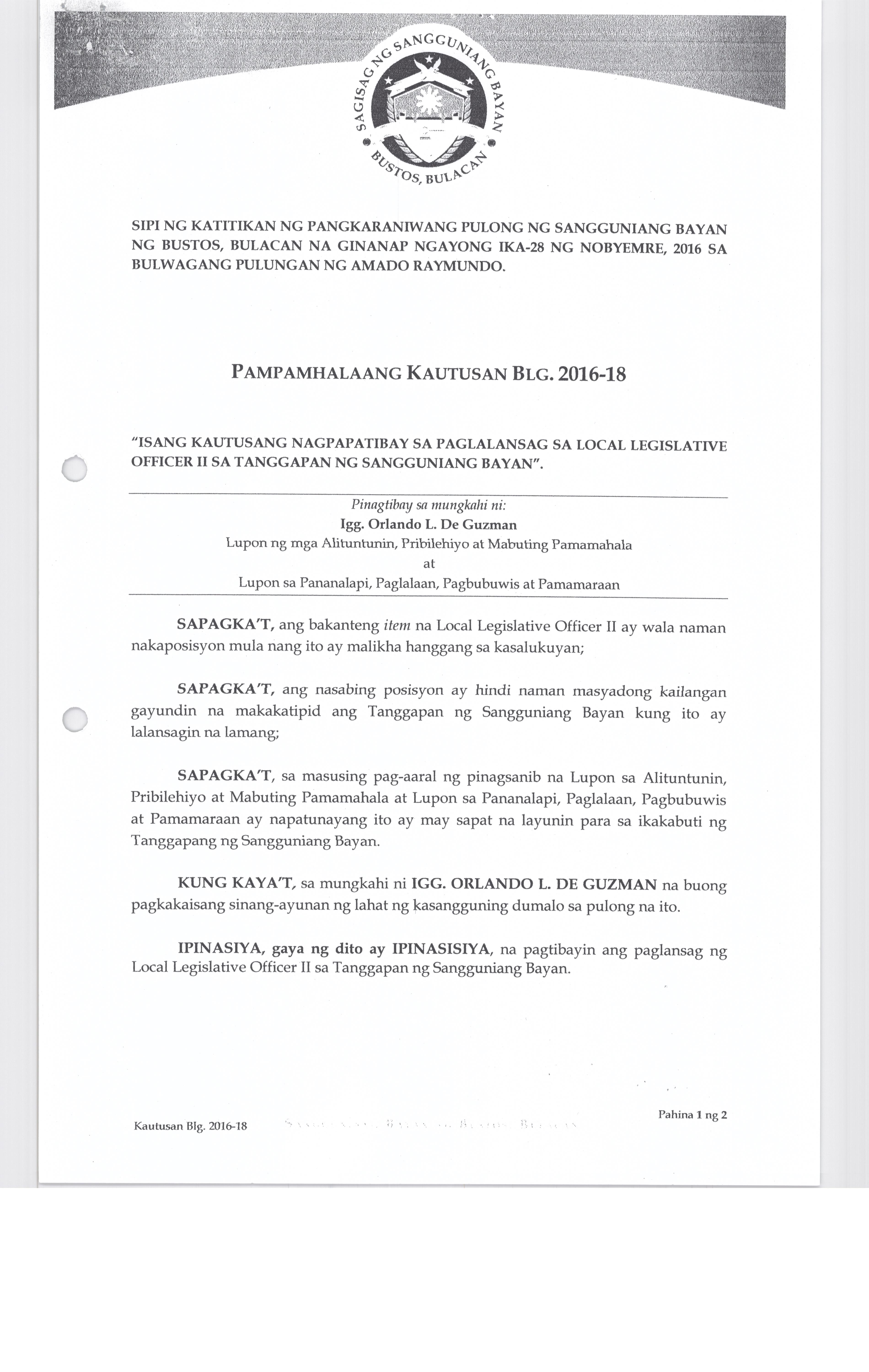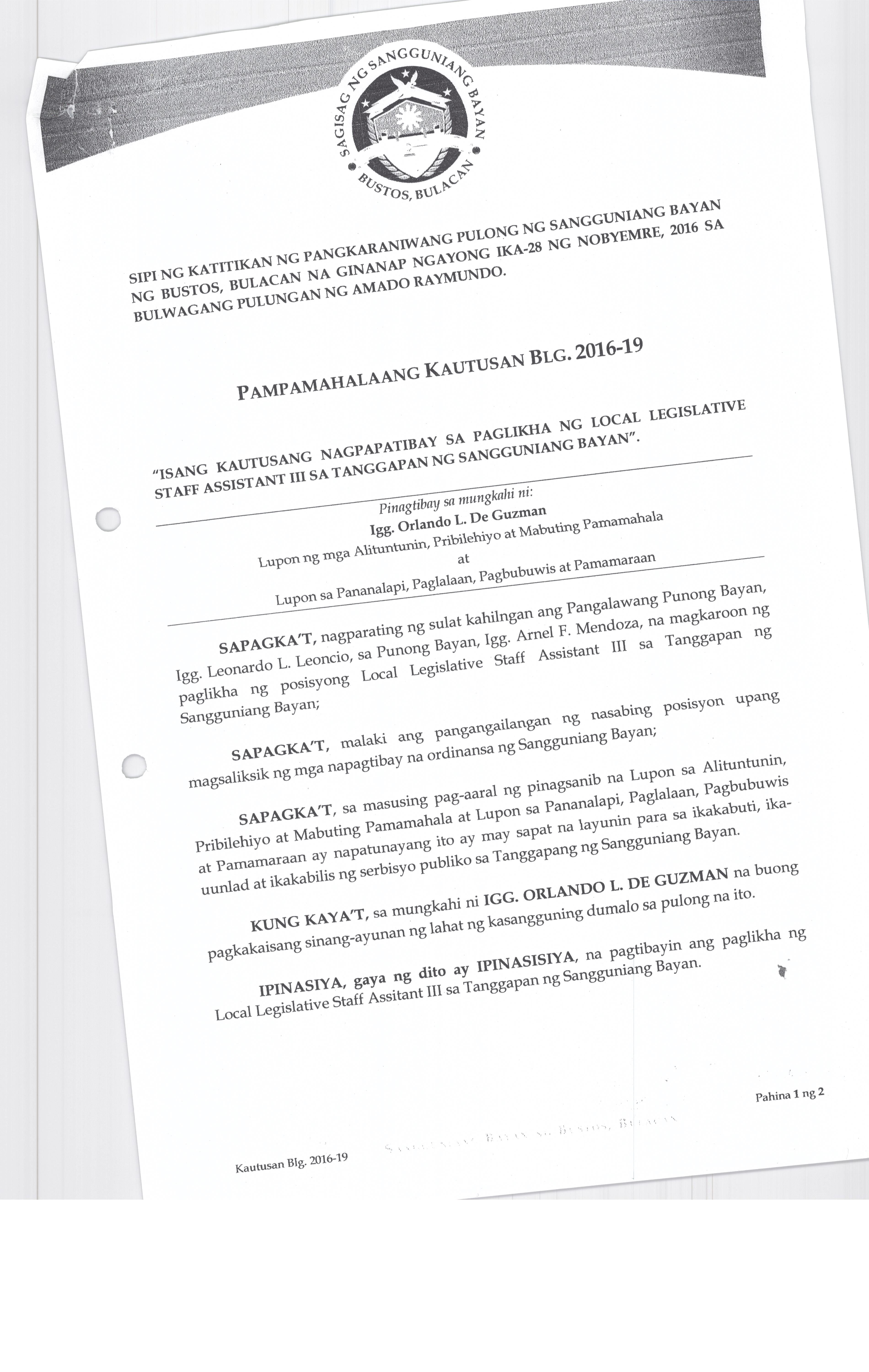 Isang Kautusan nagpapatibay sa Supplemental Budget No. 1 ng Pamahalaang Bayan ng Bustos para sa taong 2016 sa halagang Php.7,260,000.00.
