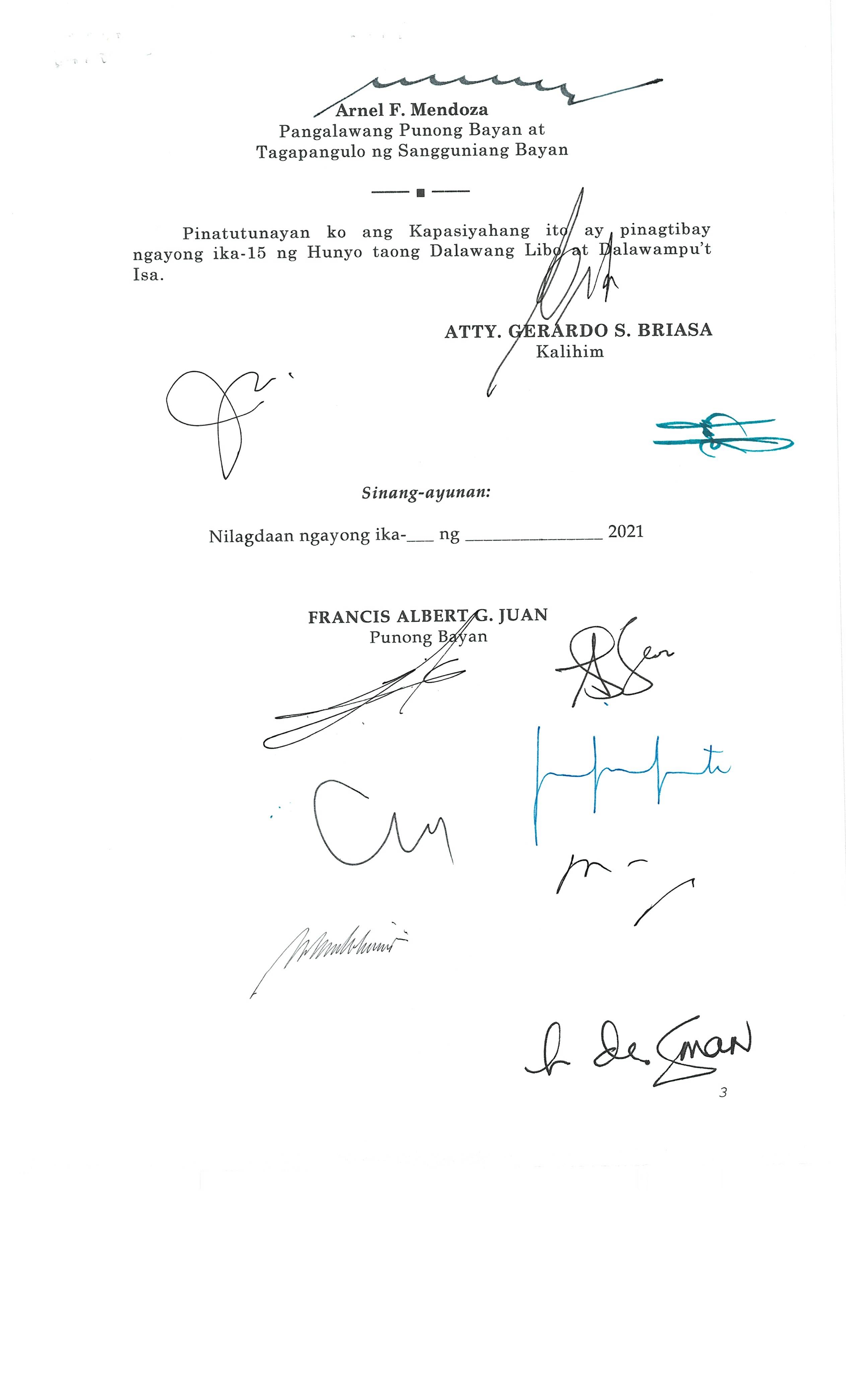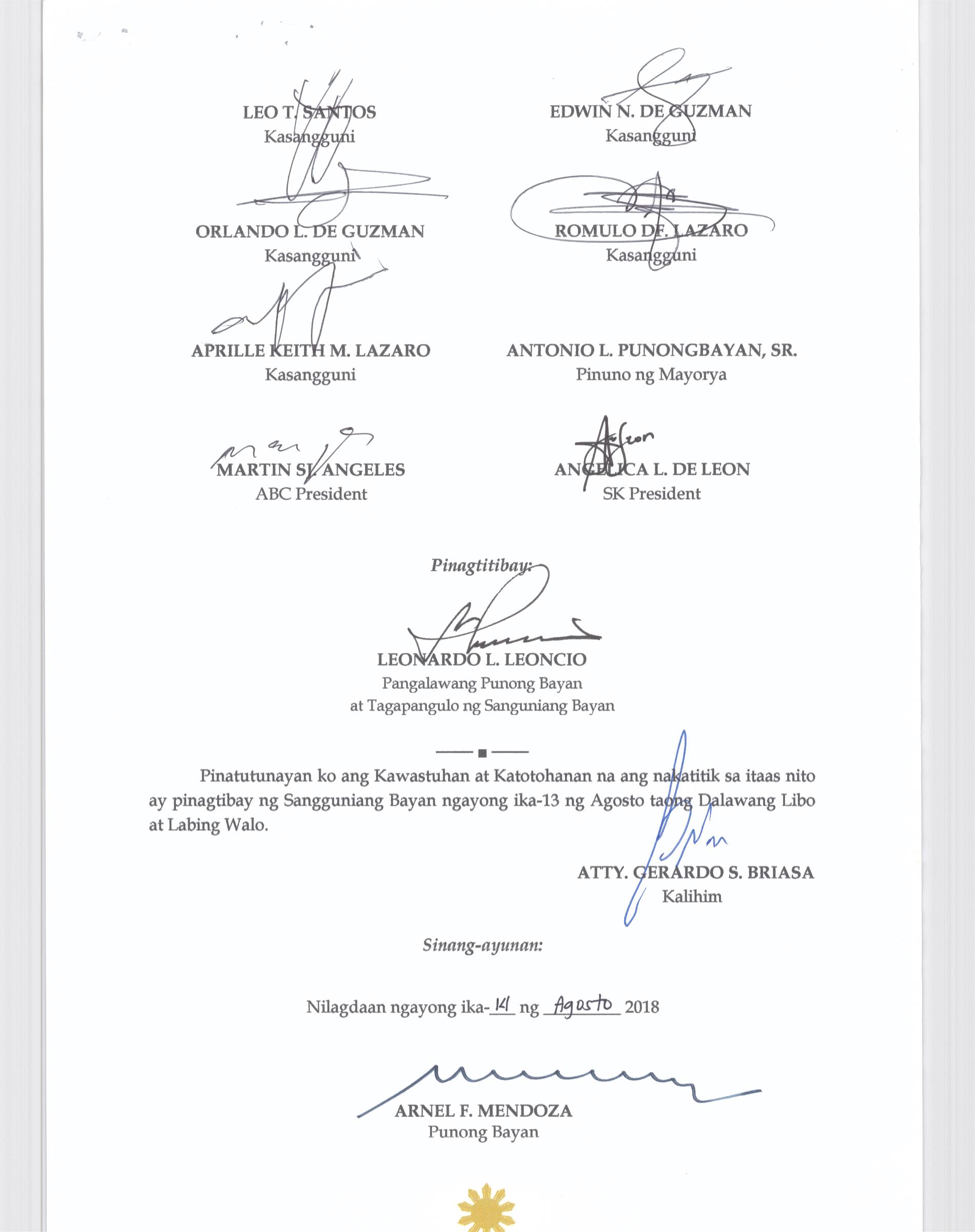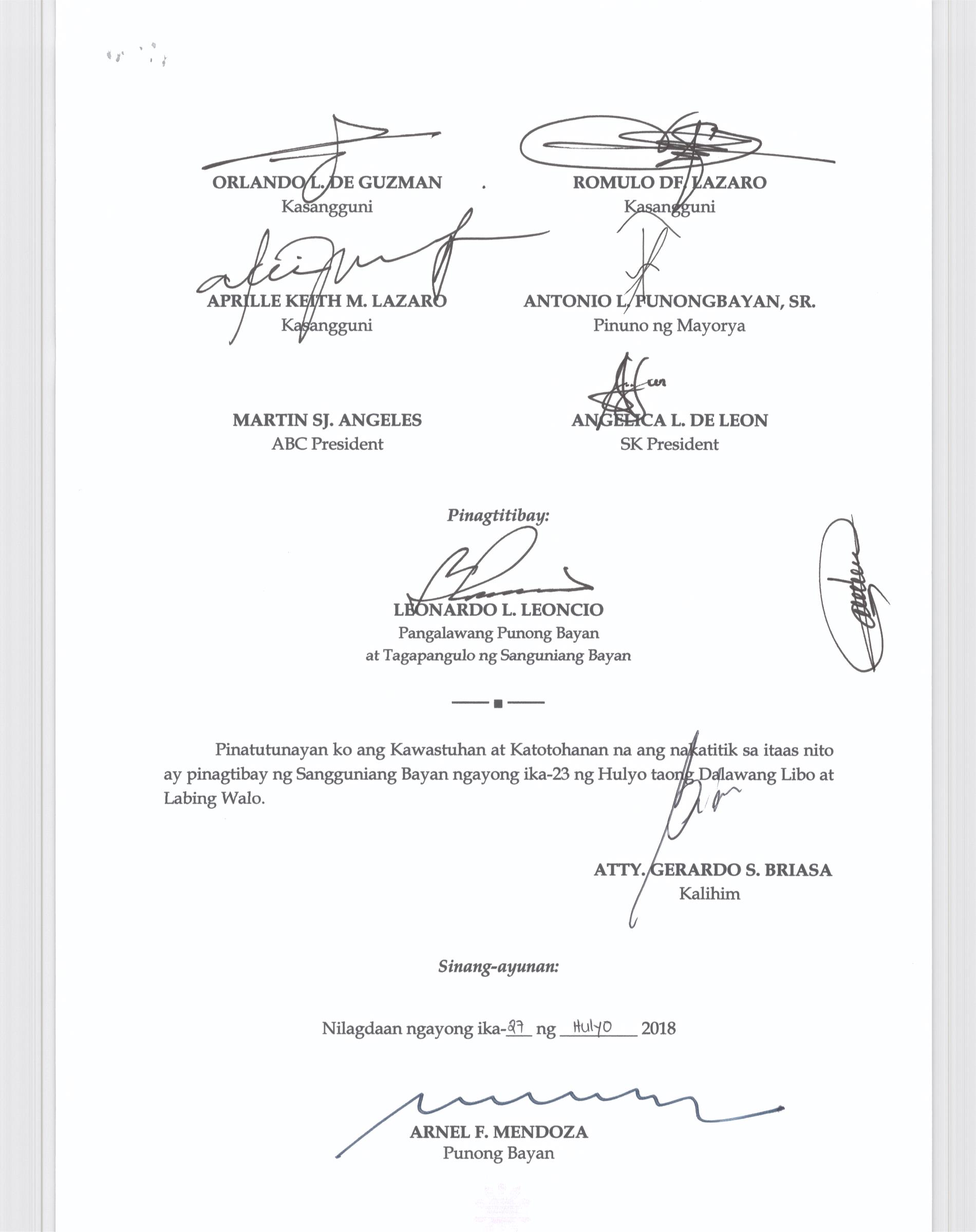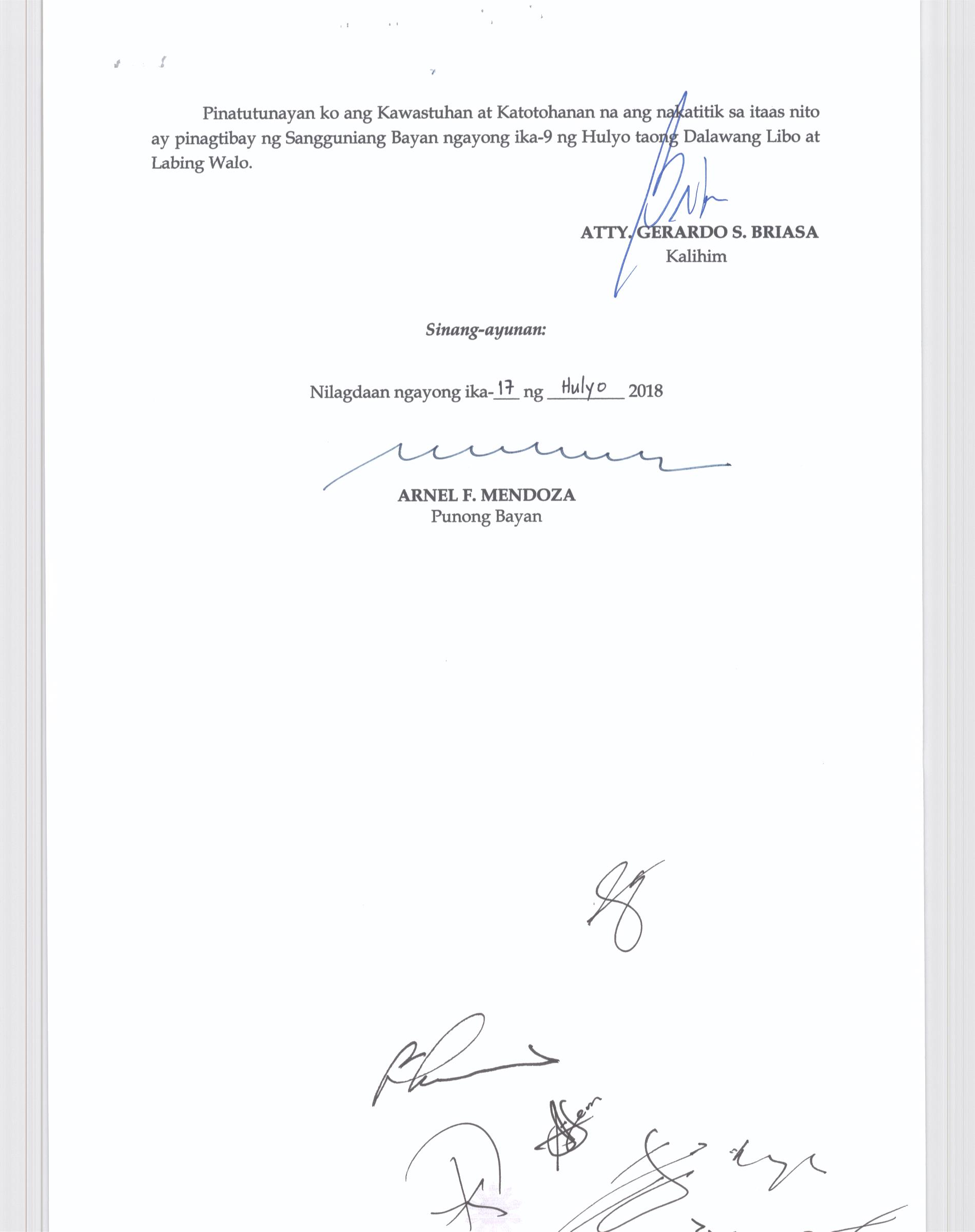 Isang kautusang nagpapatibay sa kahilingan ng Mega land Estate Corporation, sa pamamagitan ng Tanggapan ng Punong Bayan na muling pag-uuri (reclassification) ng 45 ektaryang lupain na sumasaklaw sa Barangay Liciada, Buisan at Camachilihan mula gamit agricultural tungo sa Industriyal.