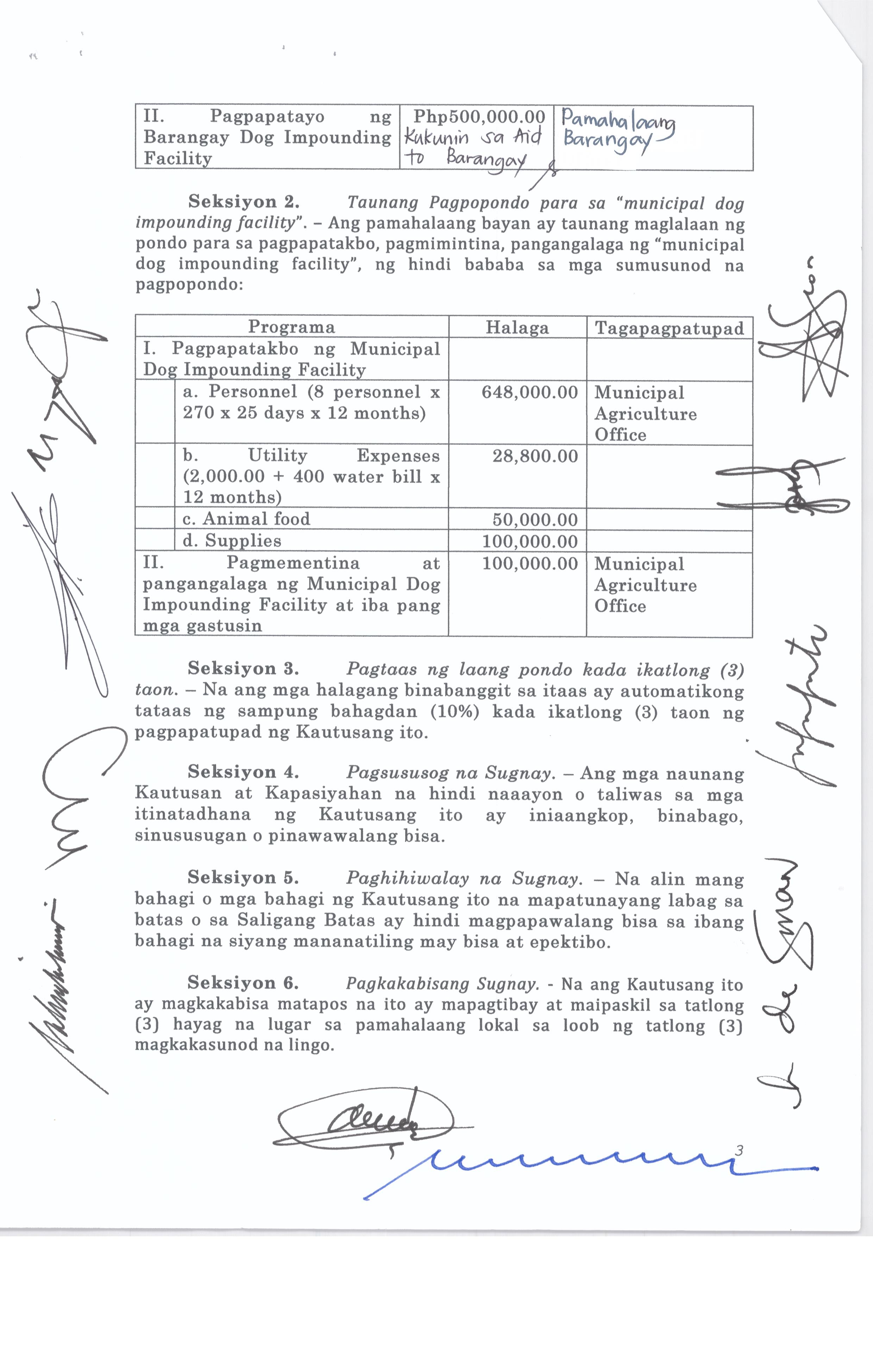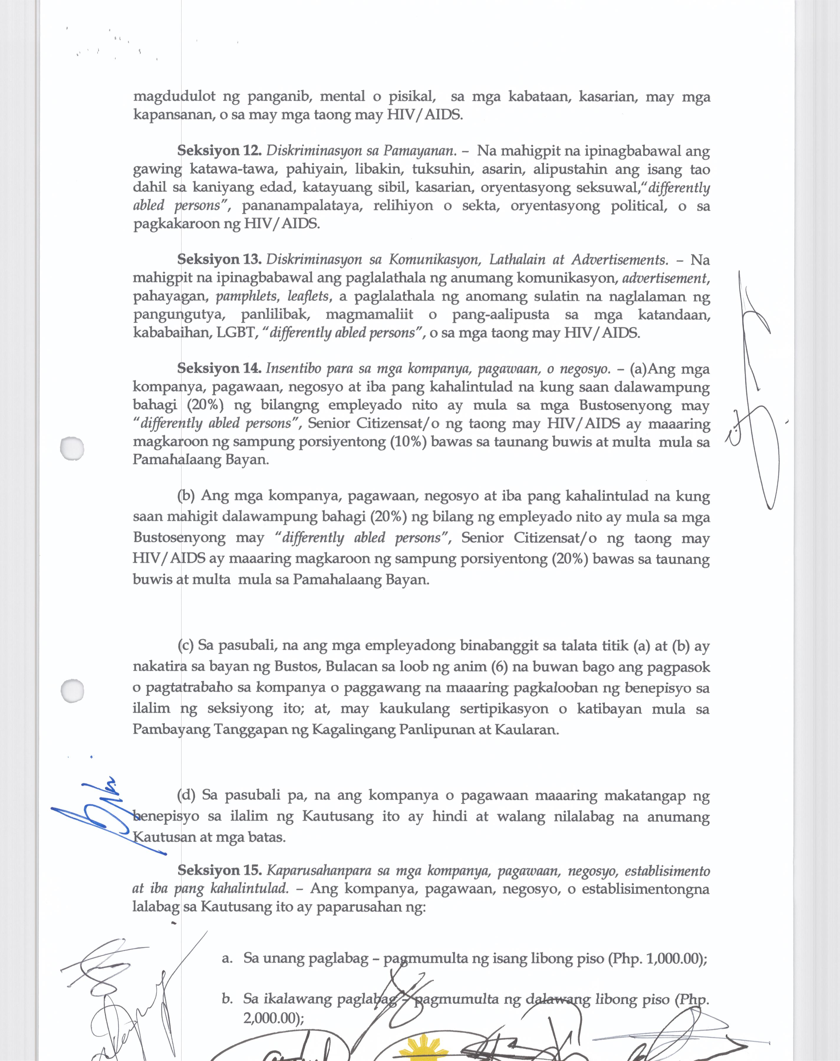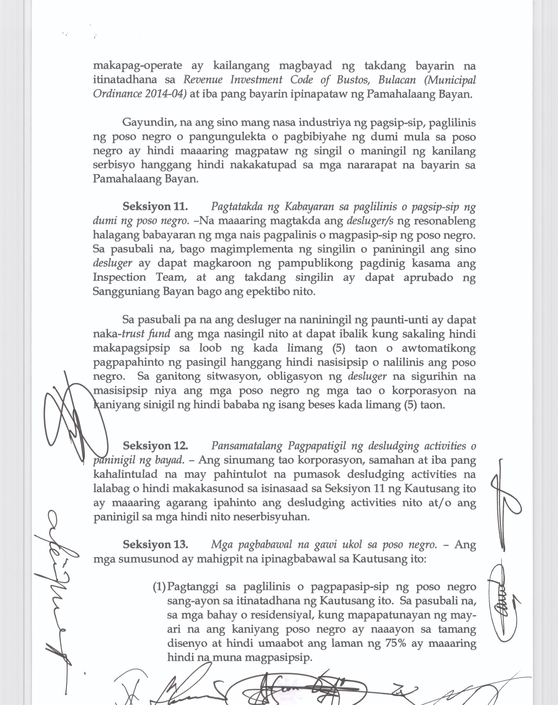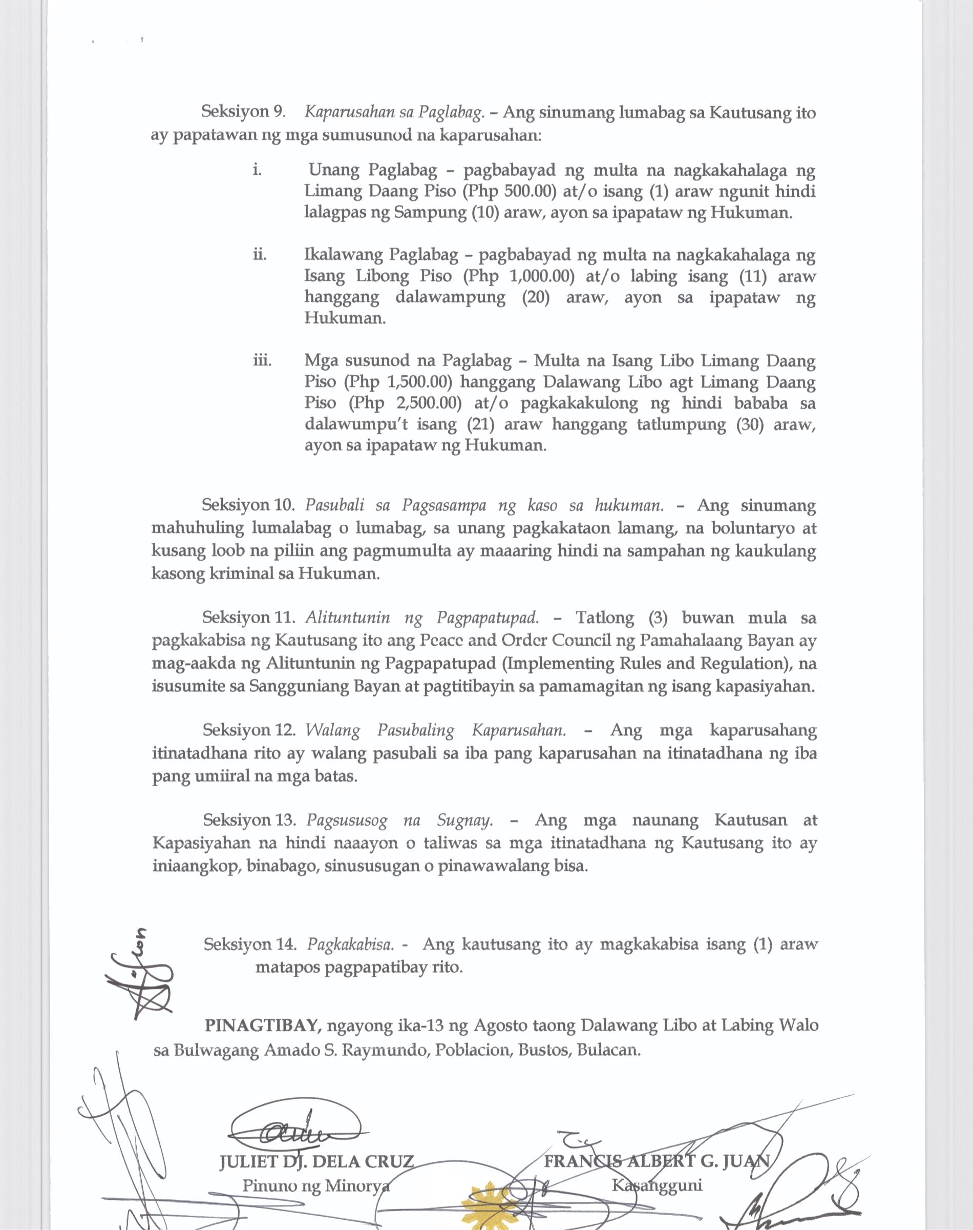 Isang kautusang Nagsususog sa Revenue and Investment Incentives Code ng Bustos BUalcan, Partikular sa Section 266 kung saan ang halaga ng Post Mortem Inspection na Php. 140.00 ay Gagawaing Php.100.00 na lamang.