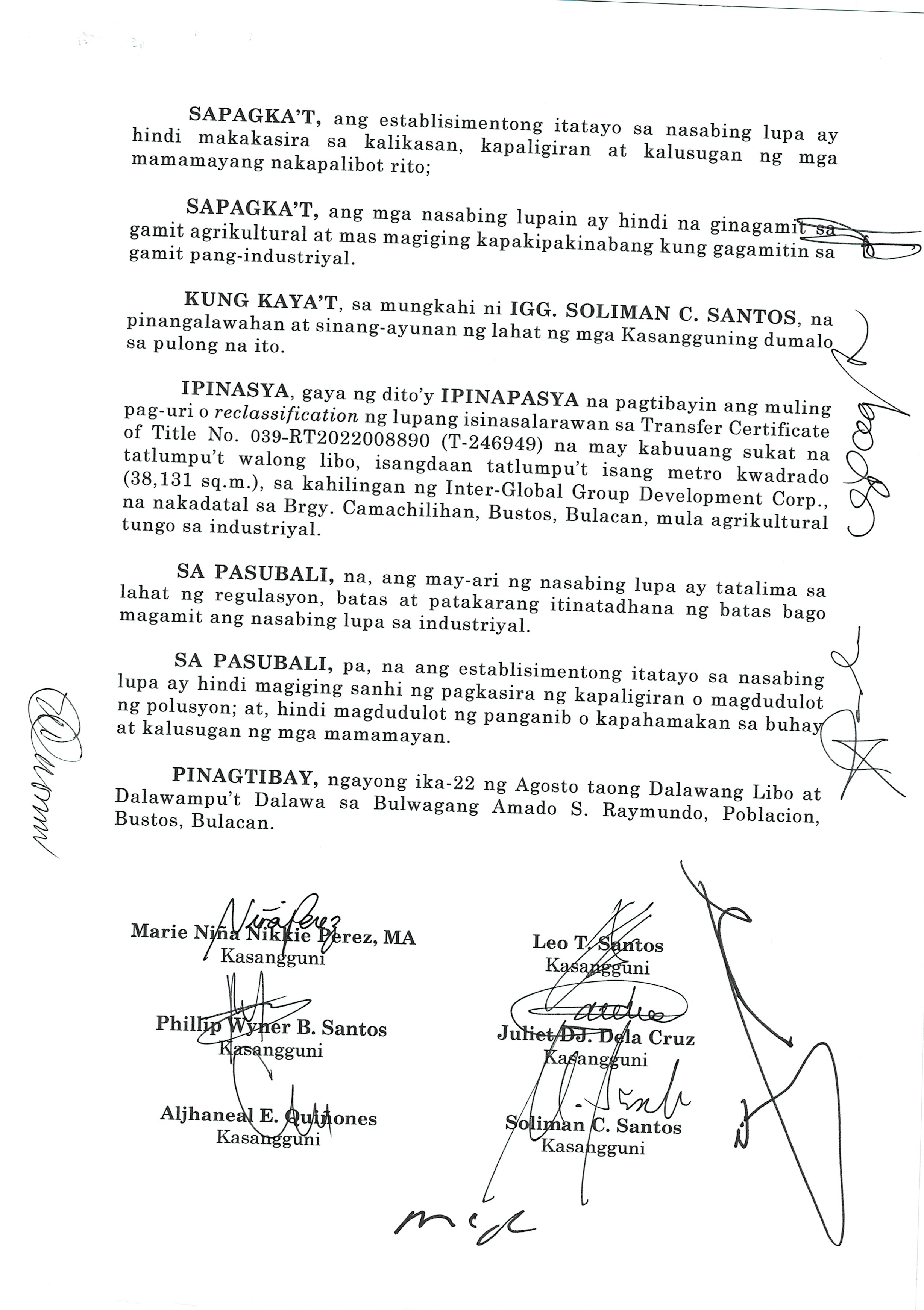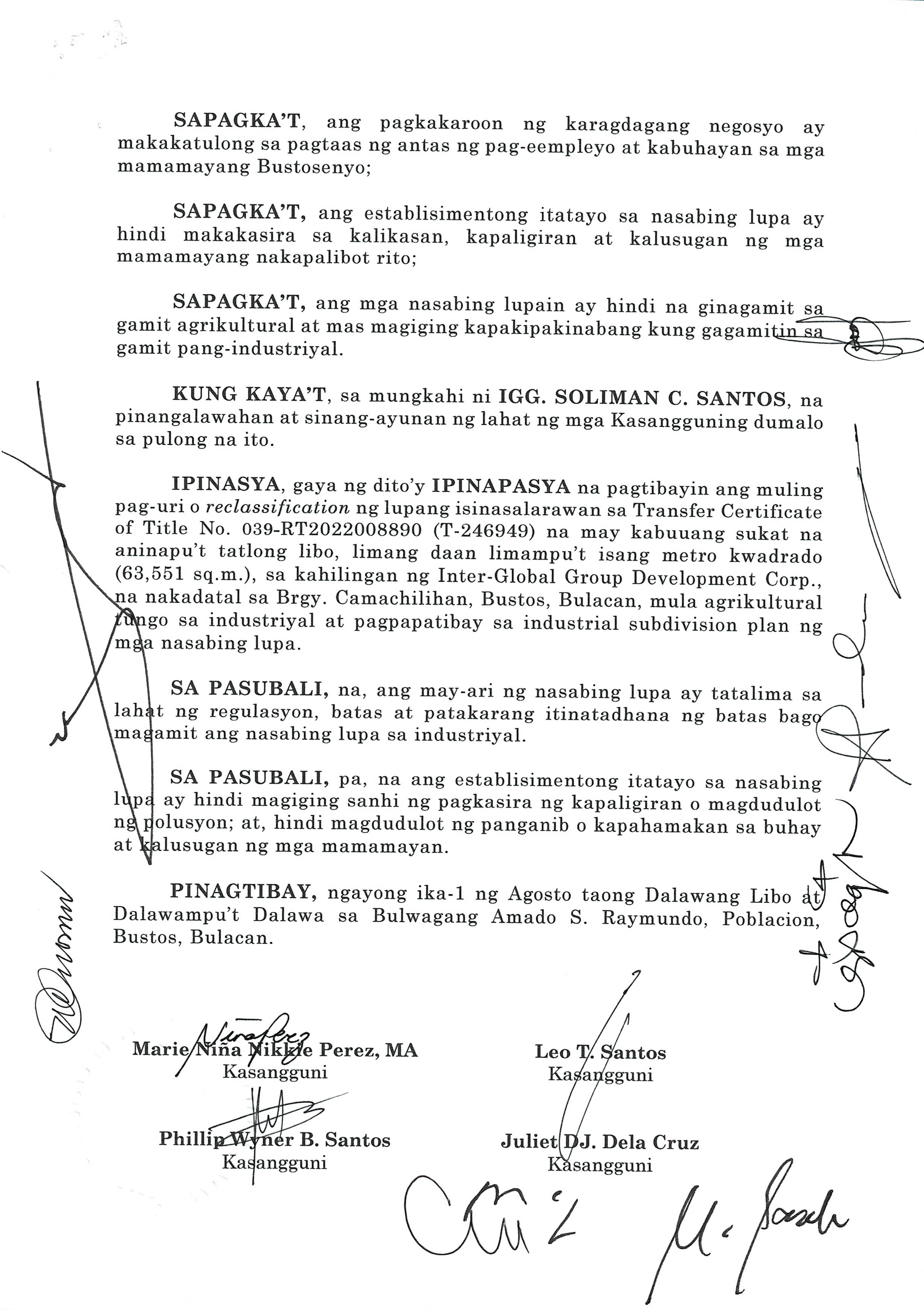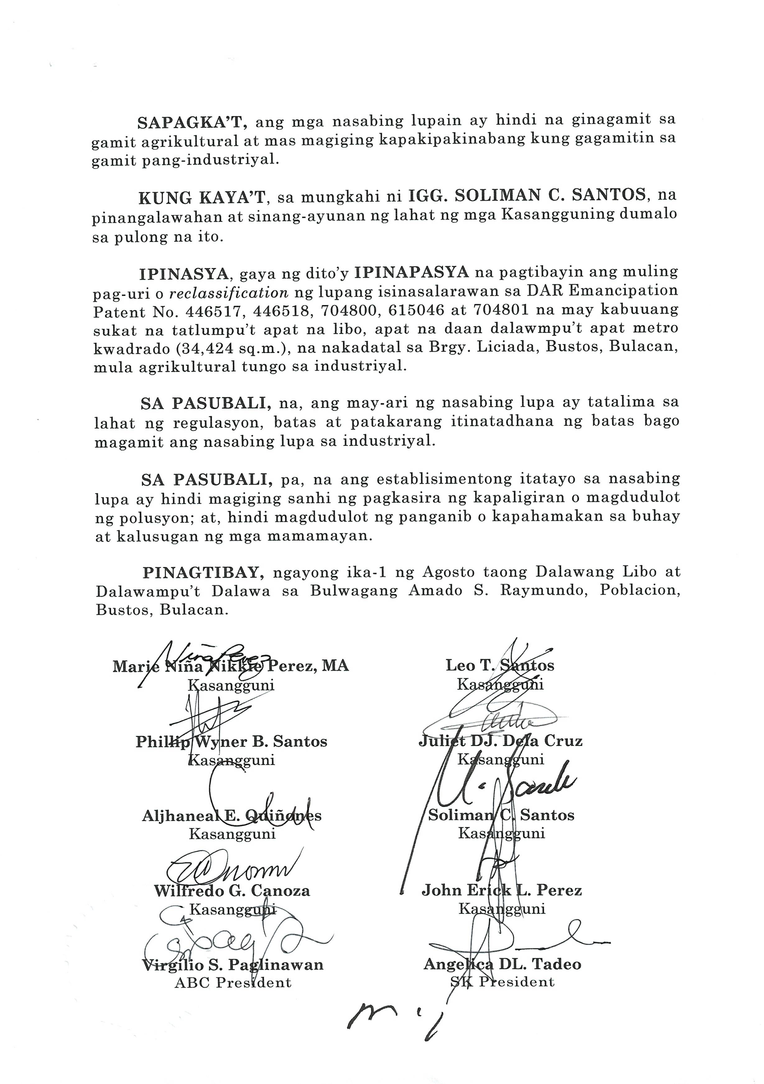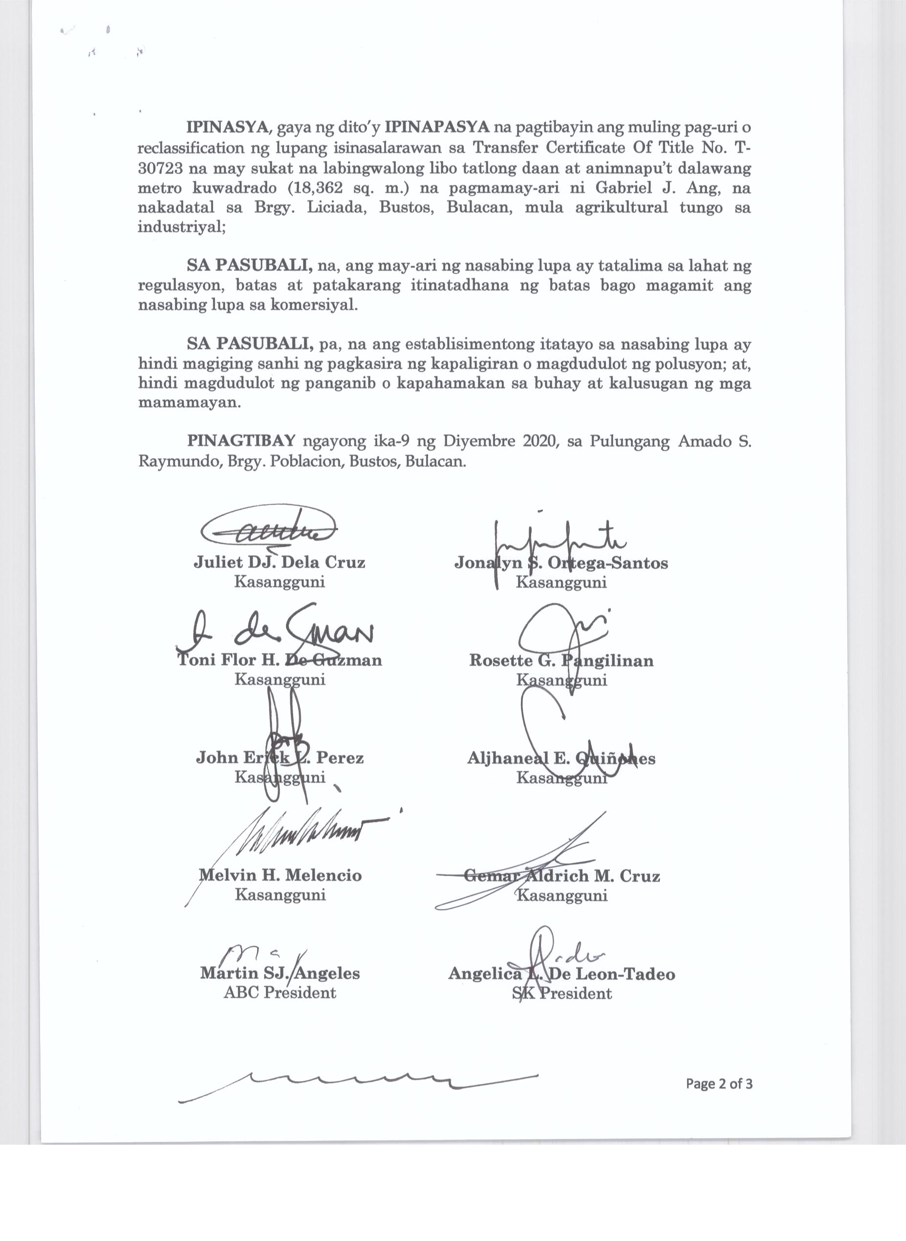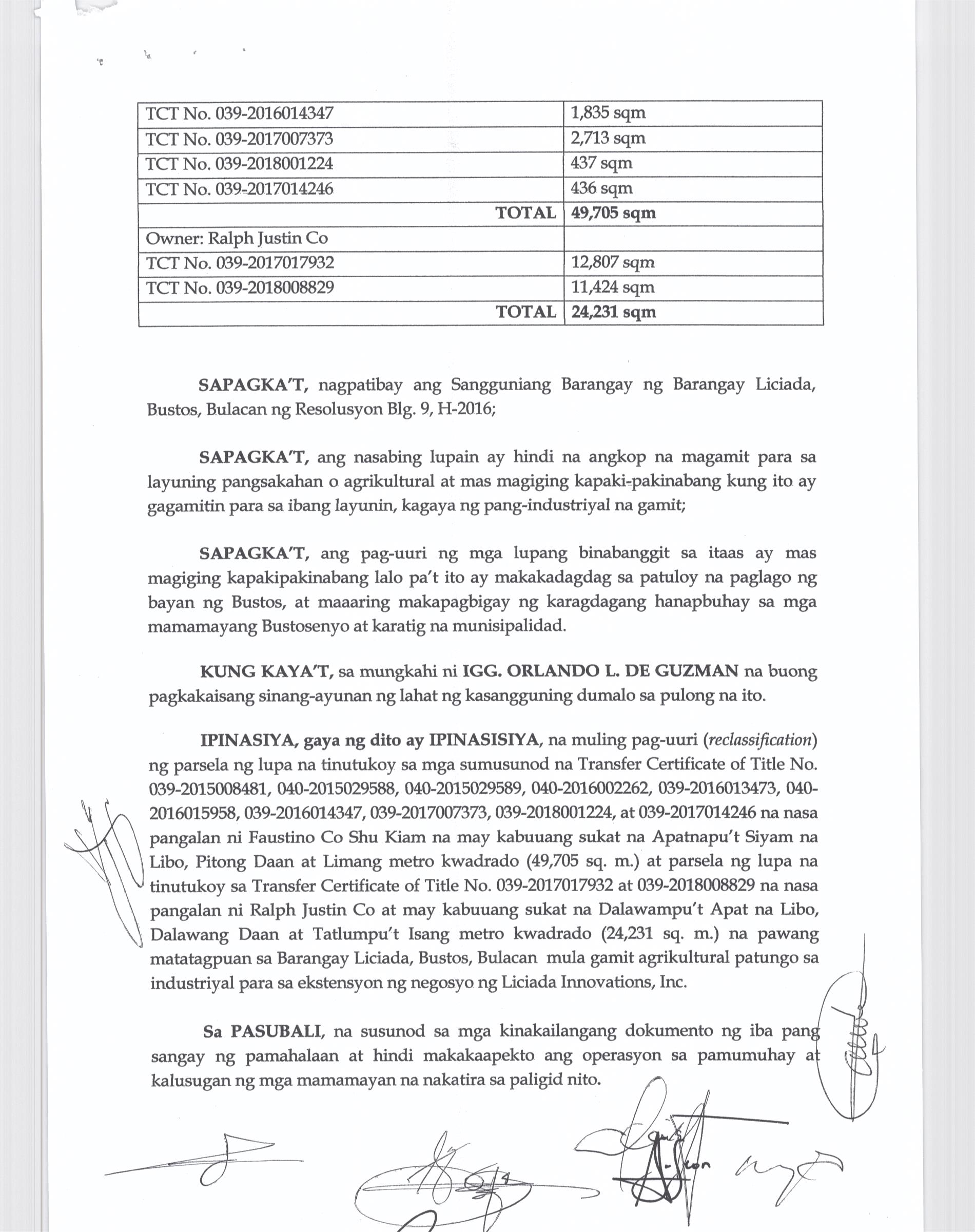 ''NAGPAPATIBAY SA MULING PAG-UURI (RECLASSIFICATION) NG LUPANG ISINASALARAWAN SA TCT No. T-58638/TD ARP No. 2024-06008-01859, TD/ARP No. 2024-06008-02477, TD/ARP No. 2024-06008-00998, TD/ARP No. 2024-06008-00980/TCT No. 039-2022023412, TCT No. 039-2023007154/TD ARP No. 2024-06008-01830, TC ARP No. 2024-06004-00907, TD/ARP No. 2024-06004-00368, TD/ARP No. 2024-06008-02474, TCT No. 039-2019014230, TD/ARP No. 2024-06004-00805/TCT No. P-761 TD/ARP No. 2024-06004-008-2/TCT No. P-760, TD/ARP No. 2024-06004-00804/TCT No. P-759, TD/ARP No. 2024-06008-02633/TCT No. 2025000132, OCT No. 039-R02024000553 (P-10964), TD/ARP No. 2024-06005-01088 NA MAY KABUUANG SUKAT NA ISANG DAAN DALAMPU'T SIYAM NA LIBO, ISANG DAAAN LABING DALAWA AT PITUMPU'T SIYAM NA METRO KWADRADO (129,112.79 SQ. M) NA PAGMAMAY-ARI NG MEGA LAND PRIME ESTATE CORPORATION NA NAKADATAL SA BARANGAY LICIADA, BUISAN AT CAMACHILIHAN BUSTOS, BULACAN MULA AGRIKULTURAL TUNGO SA INDUSTRIYAL.''