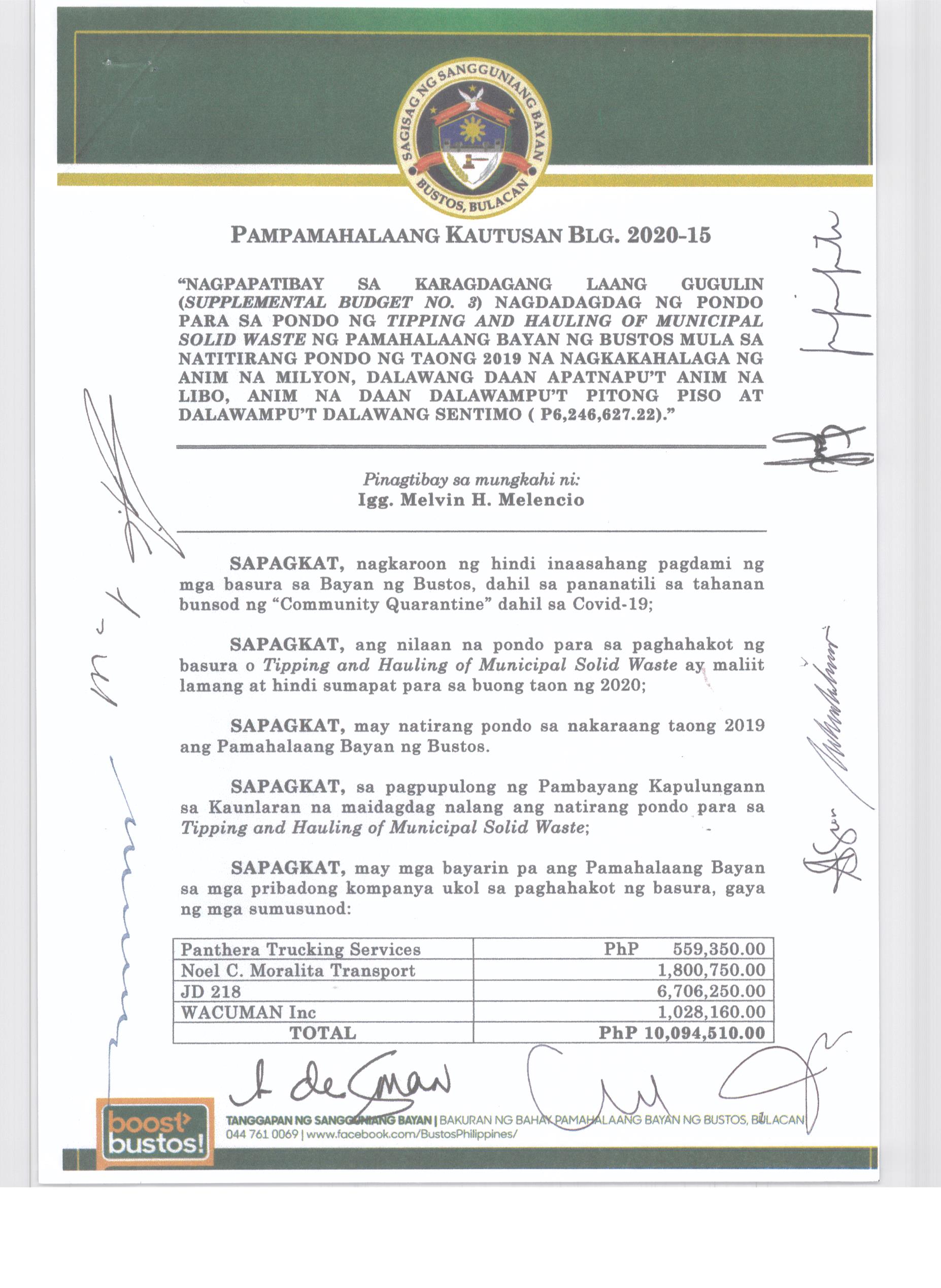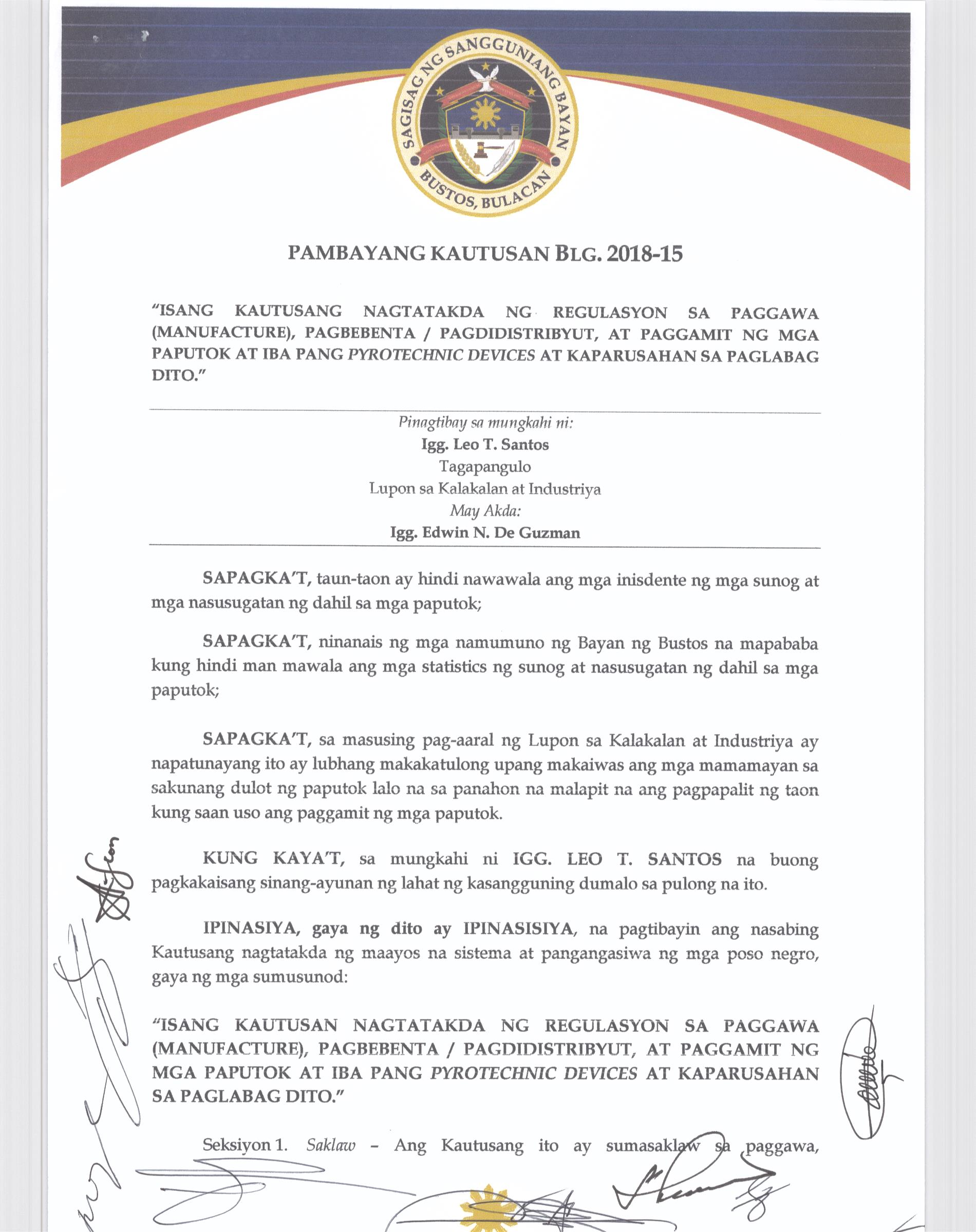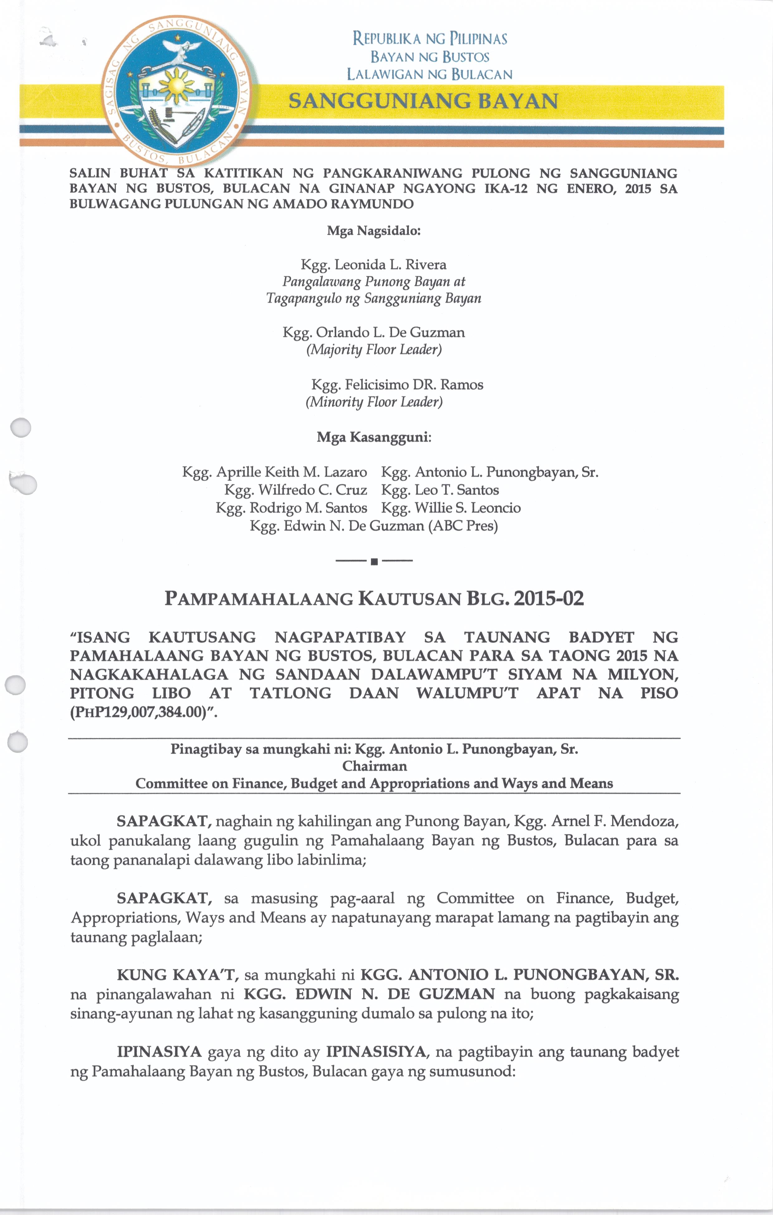 Isang Kautusan nagpapatibay sa TaunangBadyet ng Pamahalaang Bayan ng Bustos Bulacan para sa Taong 2015 na nagkakahalaga ng Php. 129,007,348.