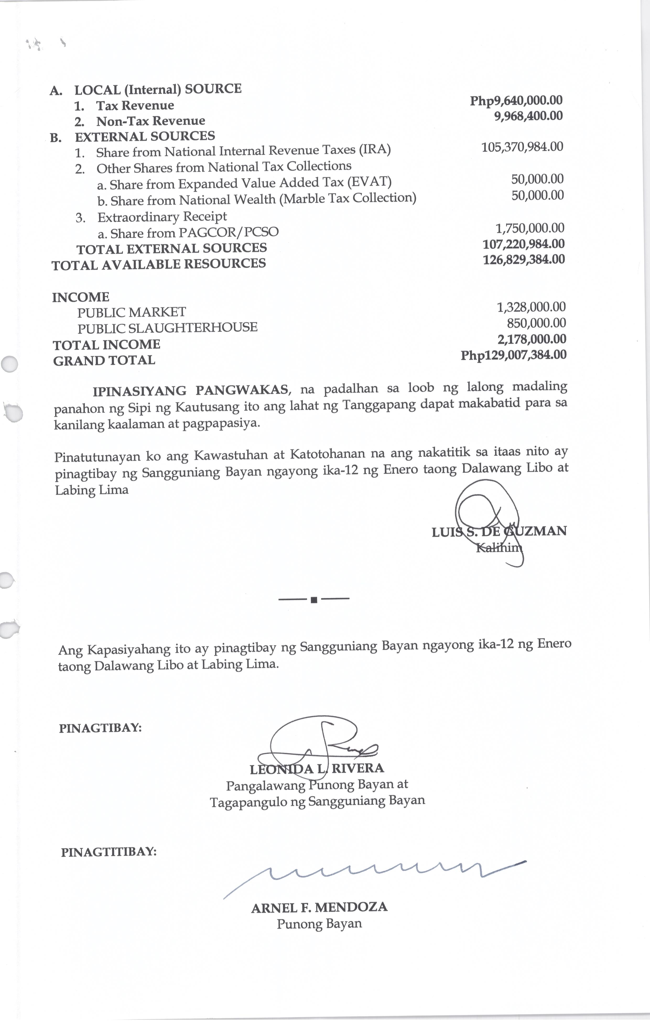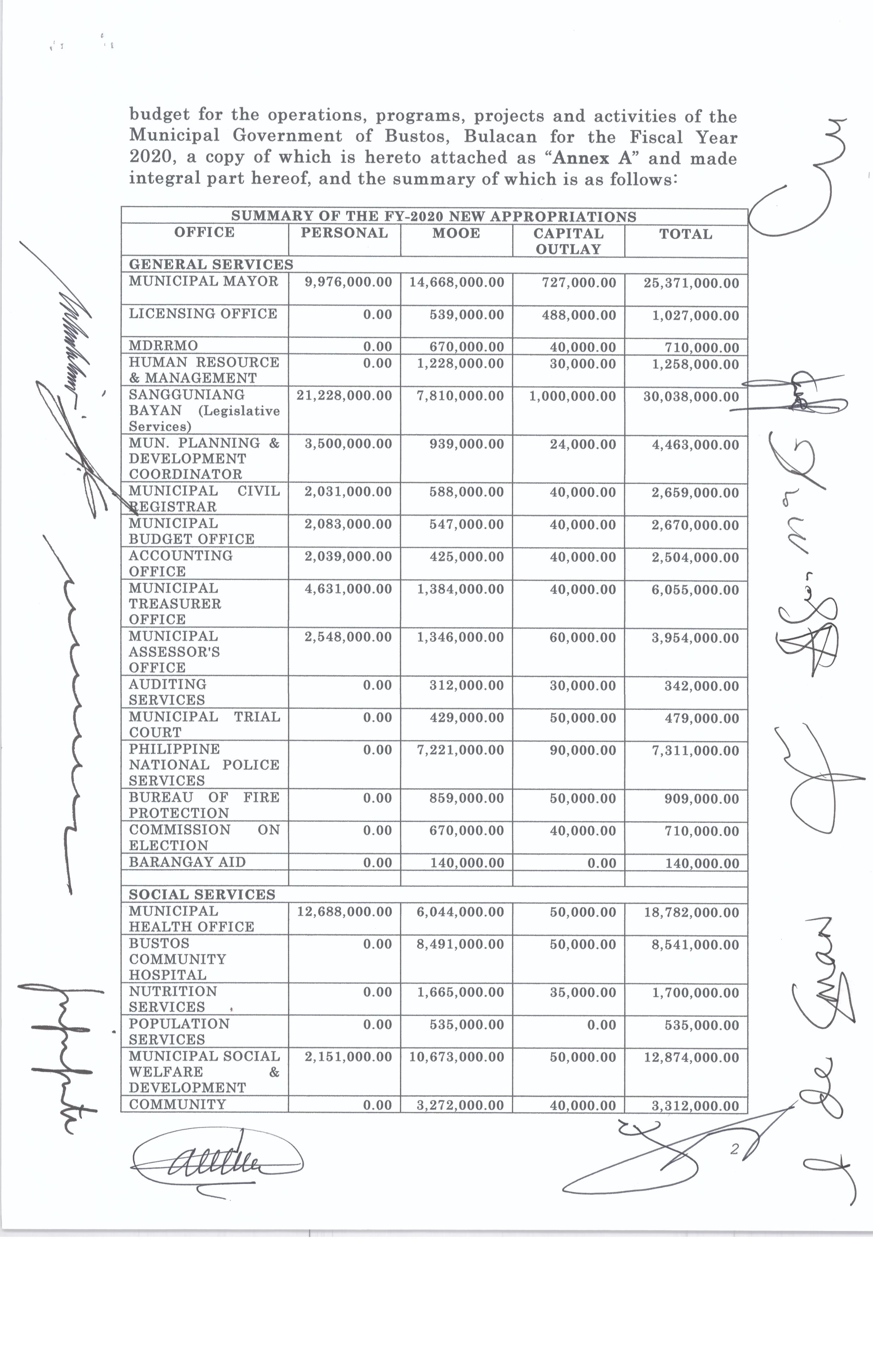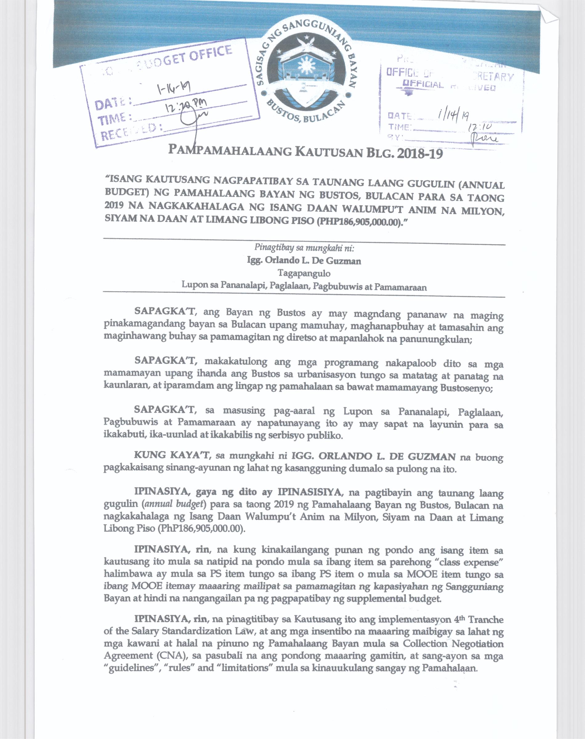 Napapatibay sa taunang laang guguling (annual budget) ng pamahalaang bayan ng bustos, bulacan para sa taong 2023 na nagkakahalaga ng dalawang daan pit...