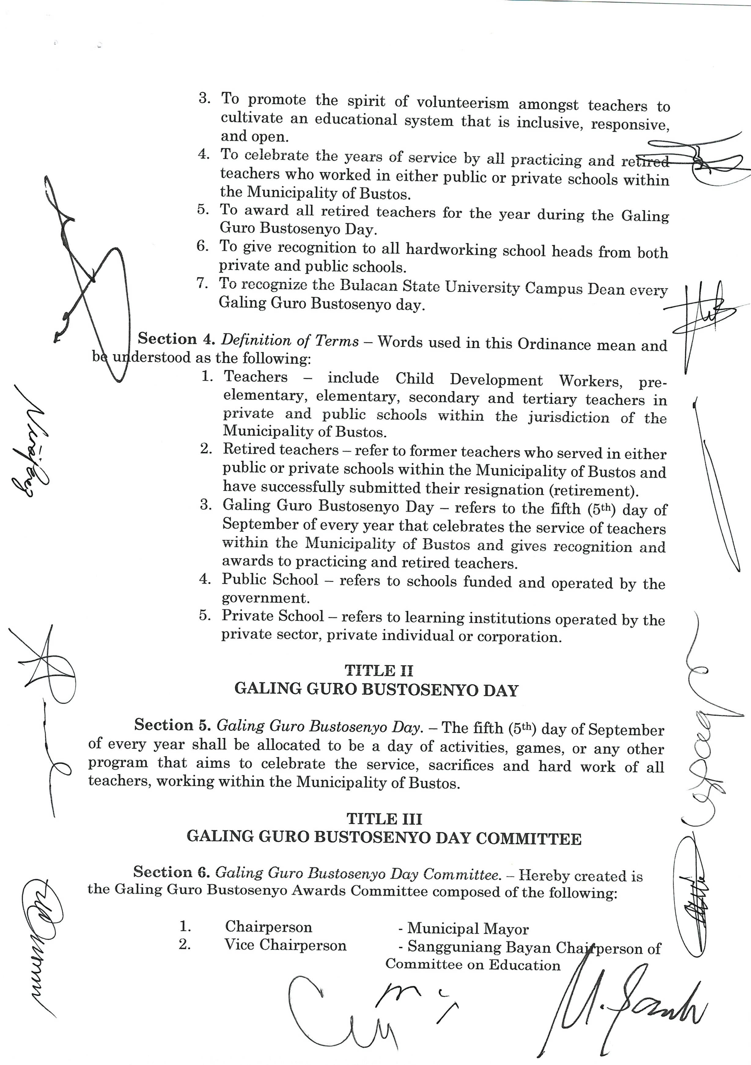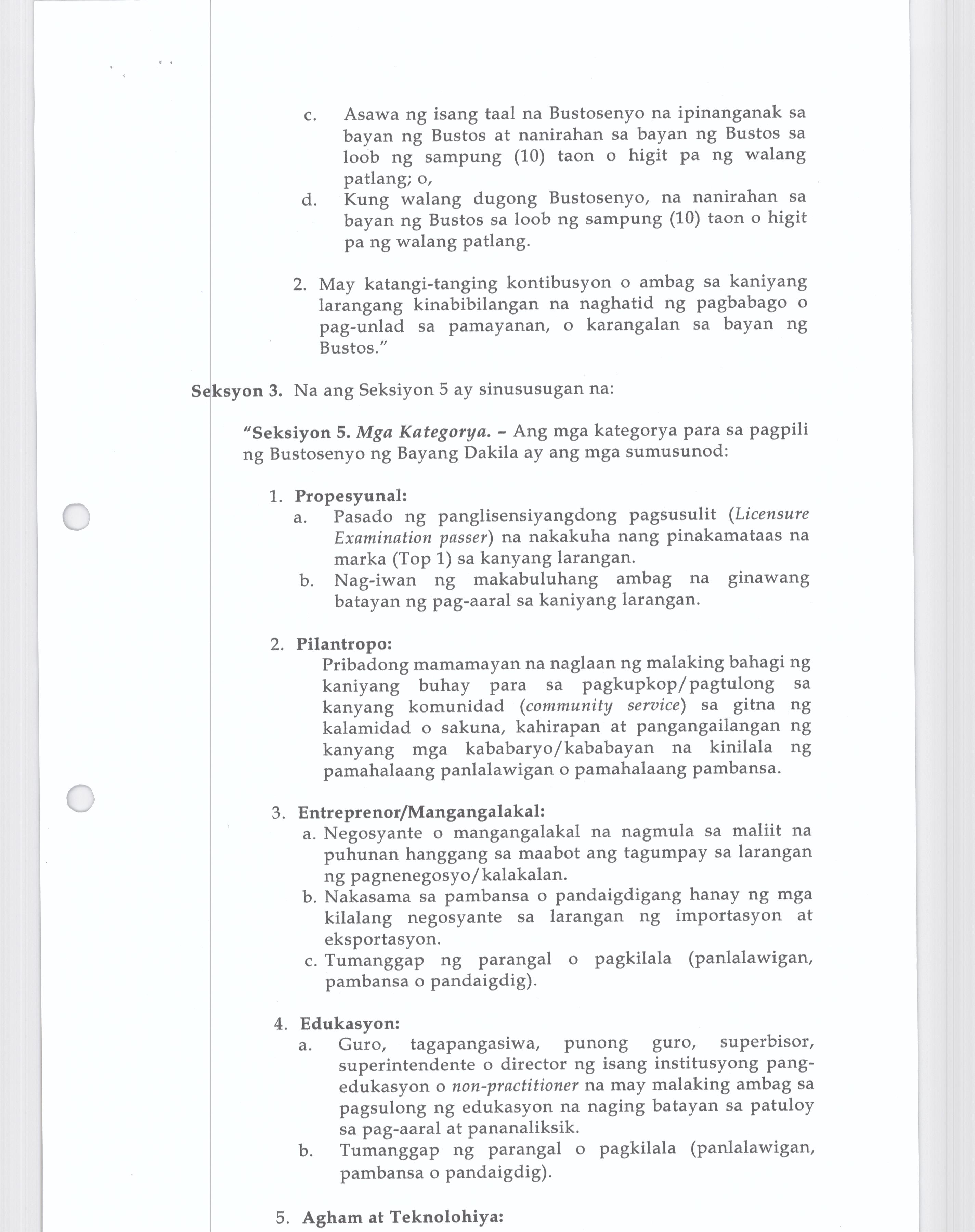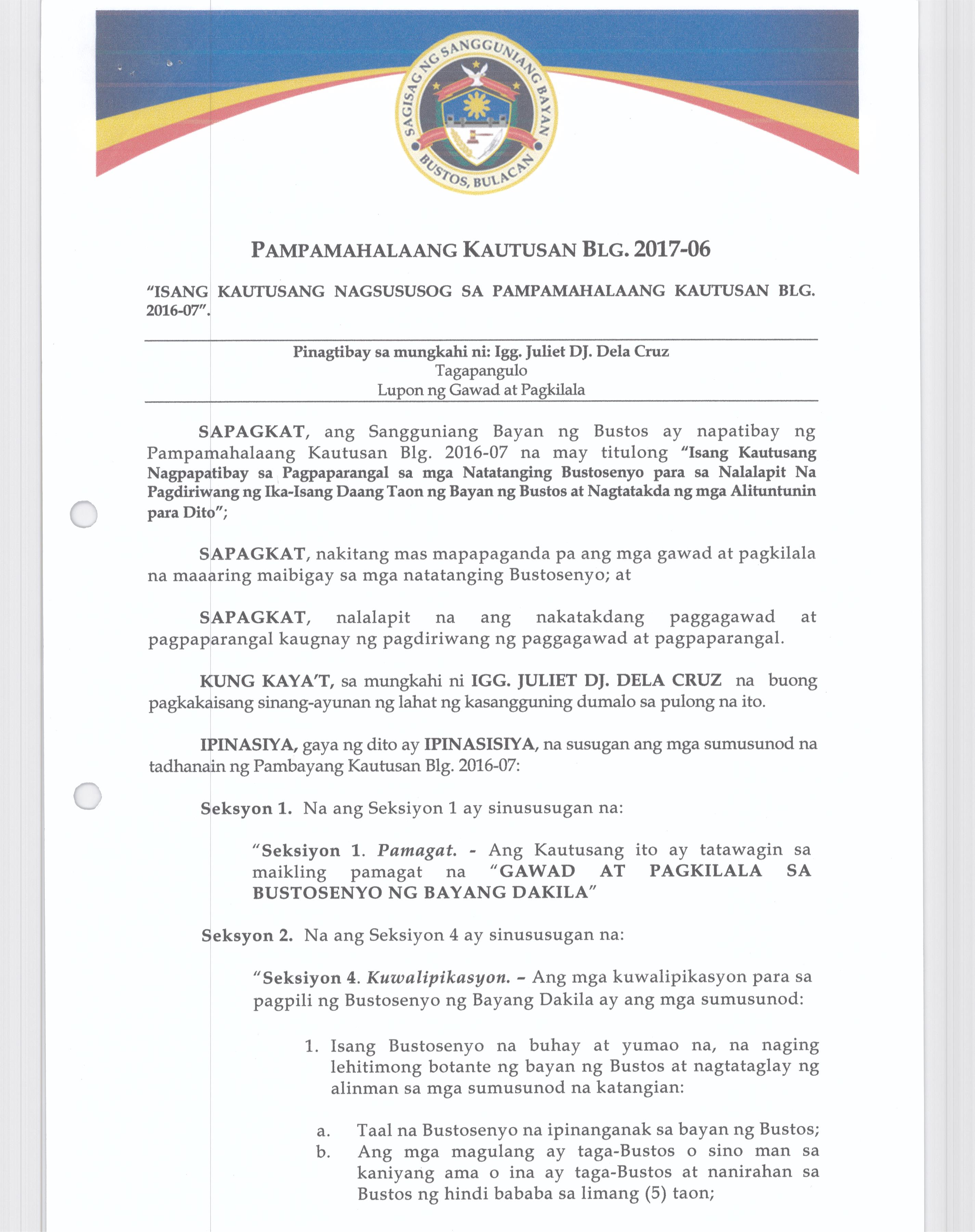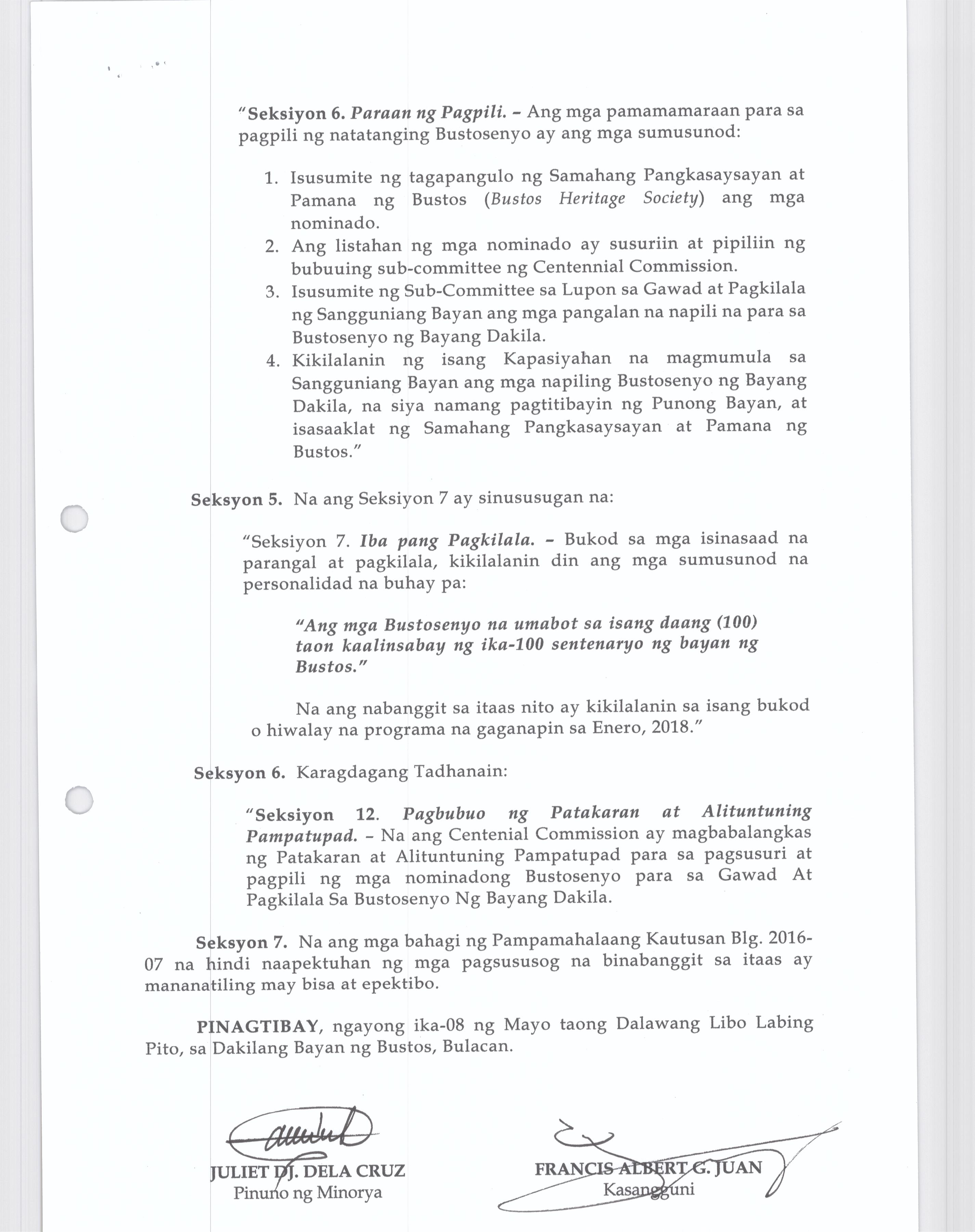 Isang kautusang nagpapatibay sa pagpaparangal sa mga Natatanging Bustosenyo para sa nalalapit na pagdiriwang ng Iika Isang Daan Taon ng Bayan ng Busto...