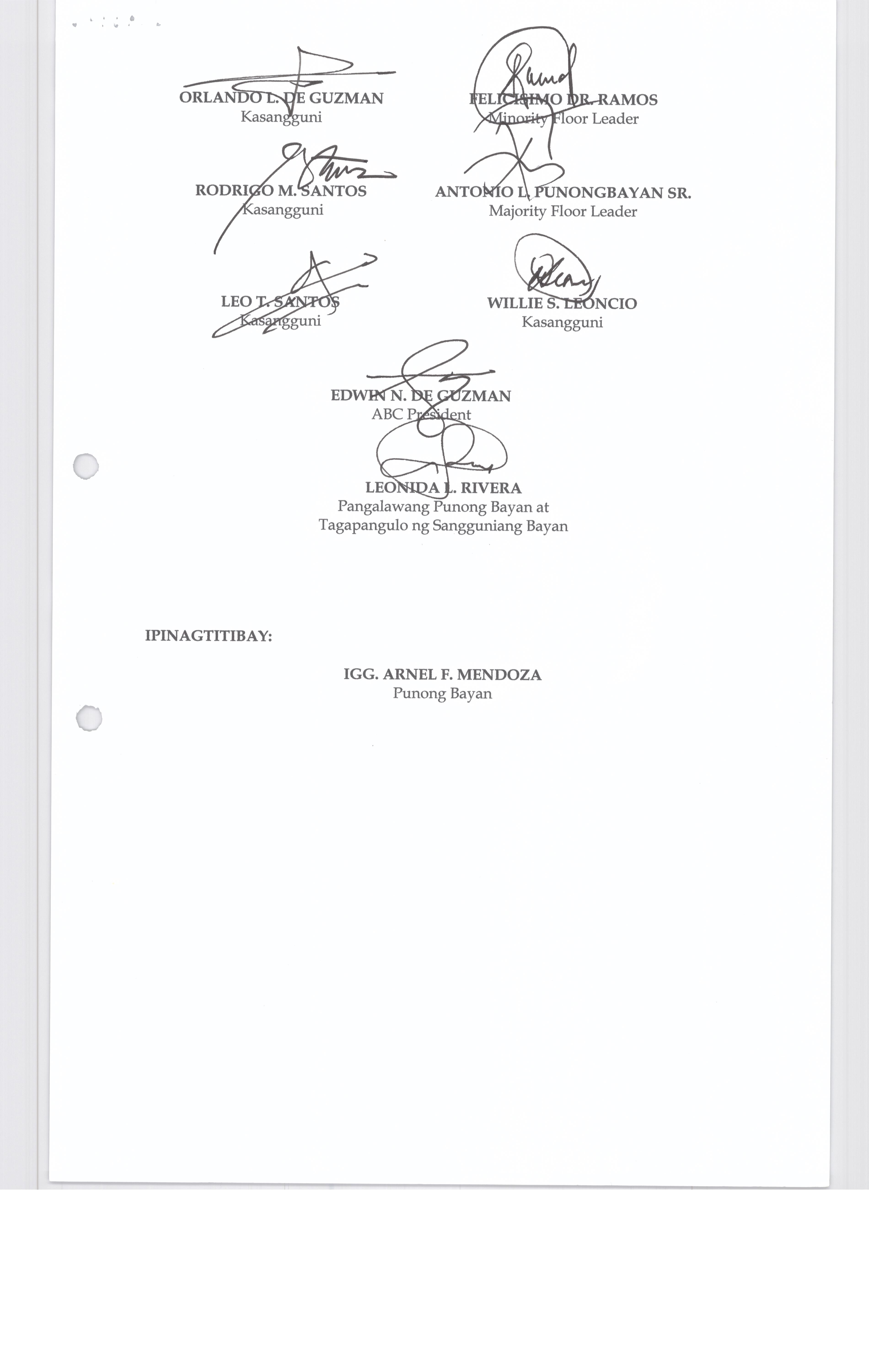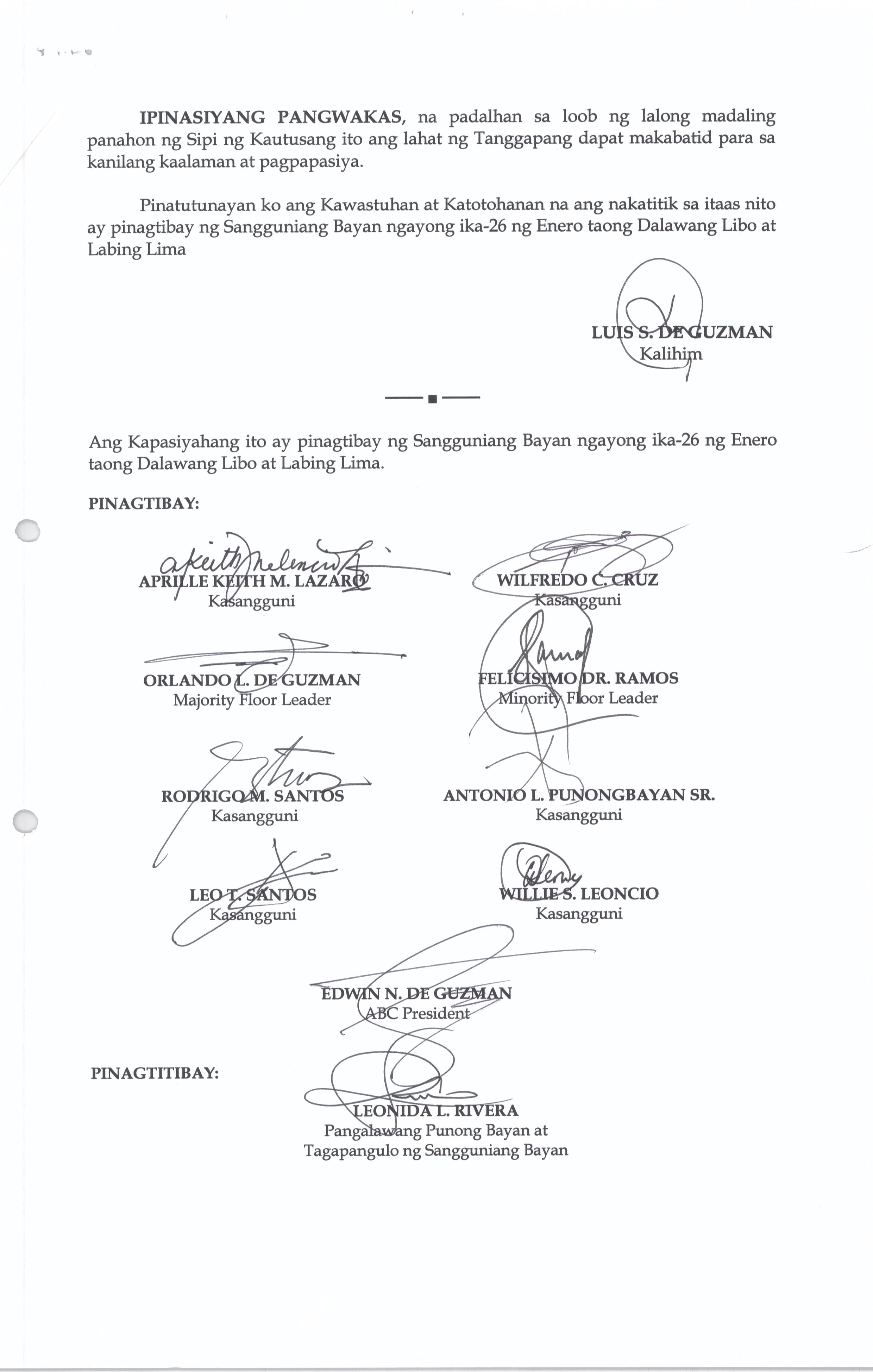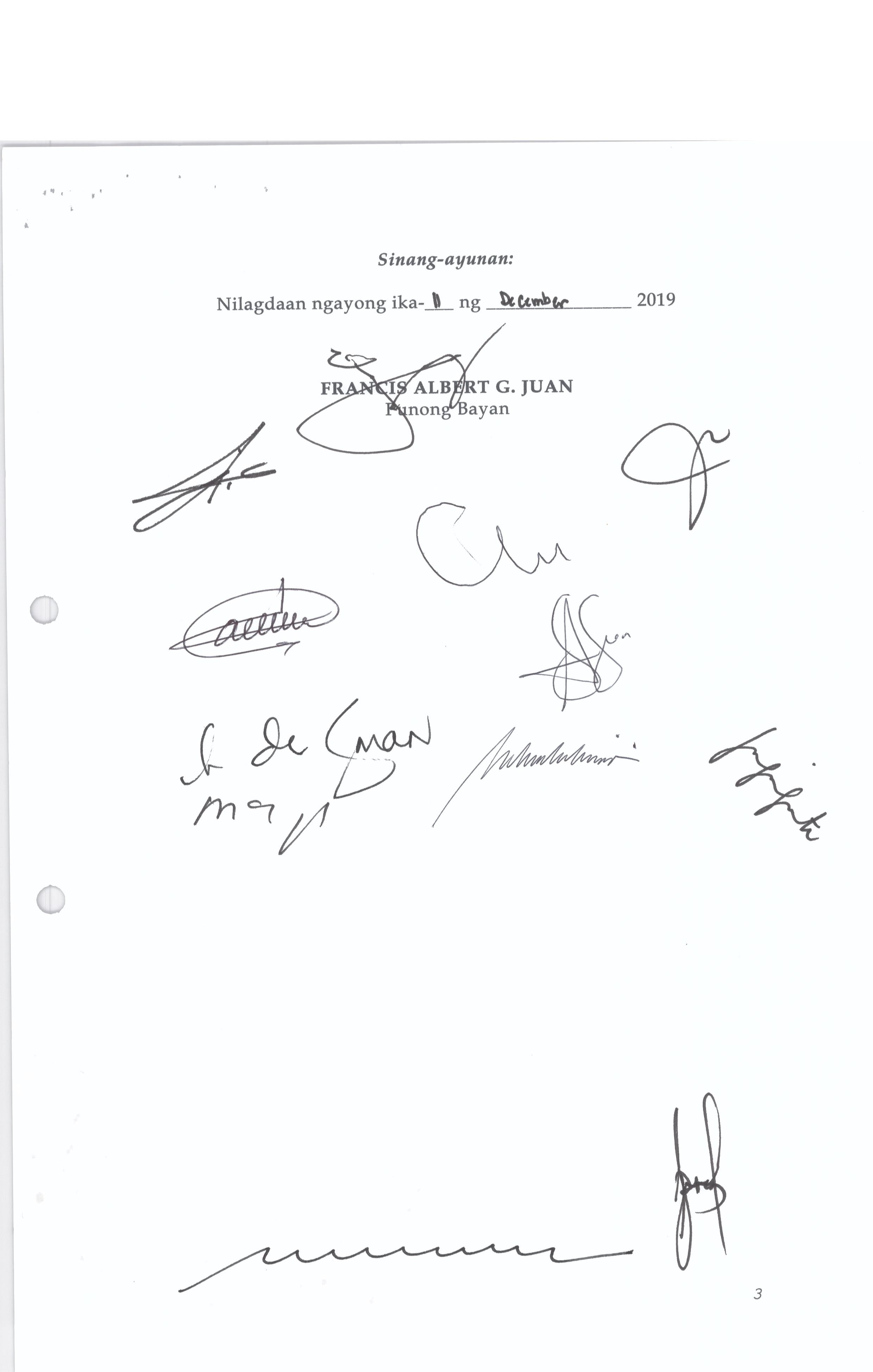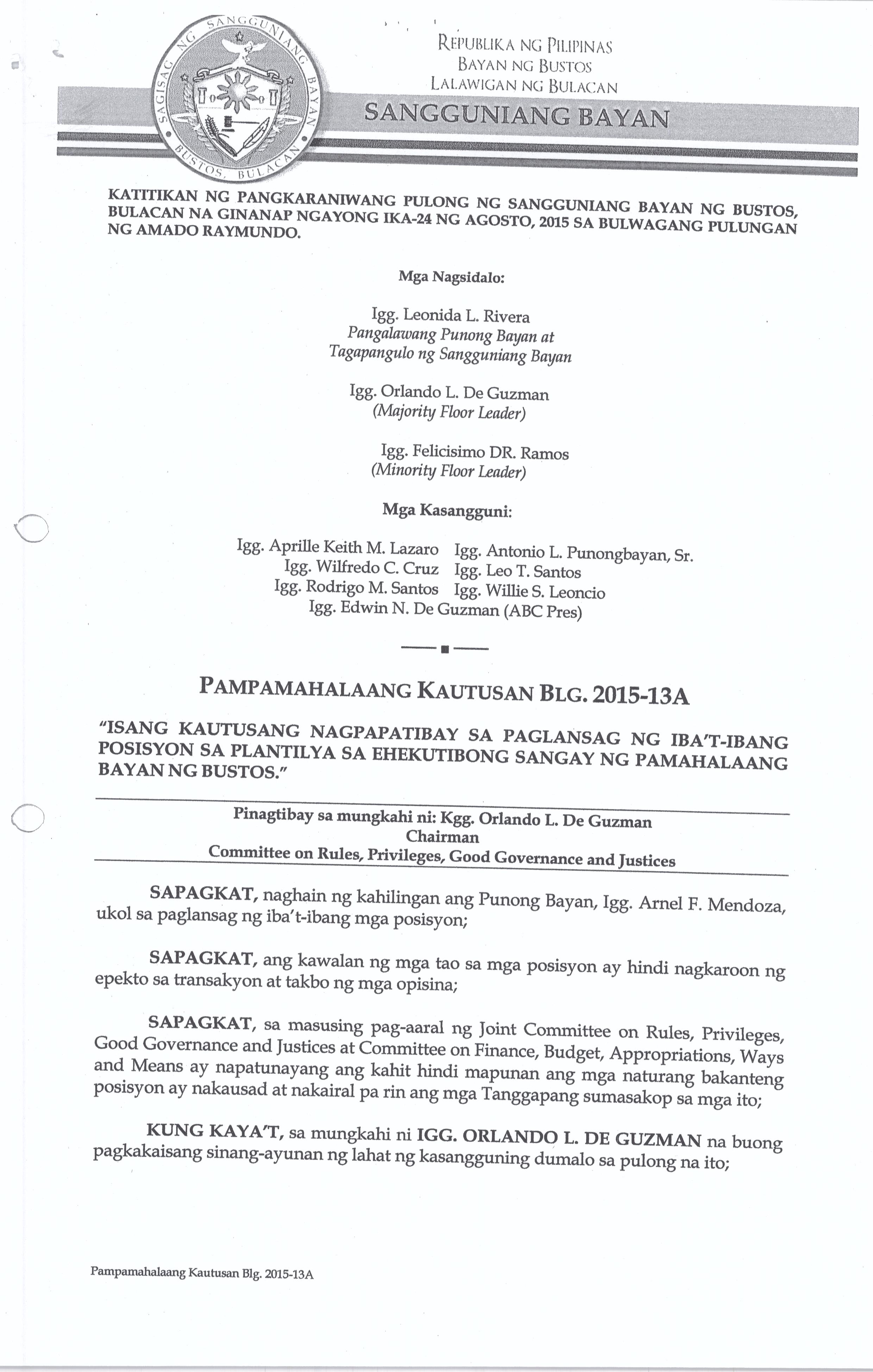 Isang Kautusang nagpapatibay sa Paglansag sa iba’t-ibang Posisyon sa Plantilya sa EhekutibongSangay ng Pamahalaang Bayan.