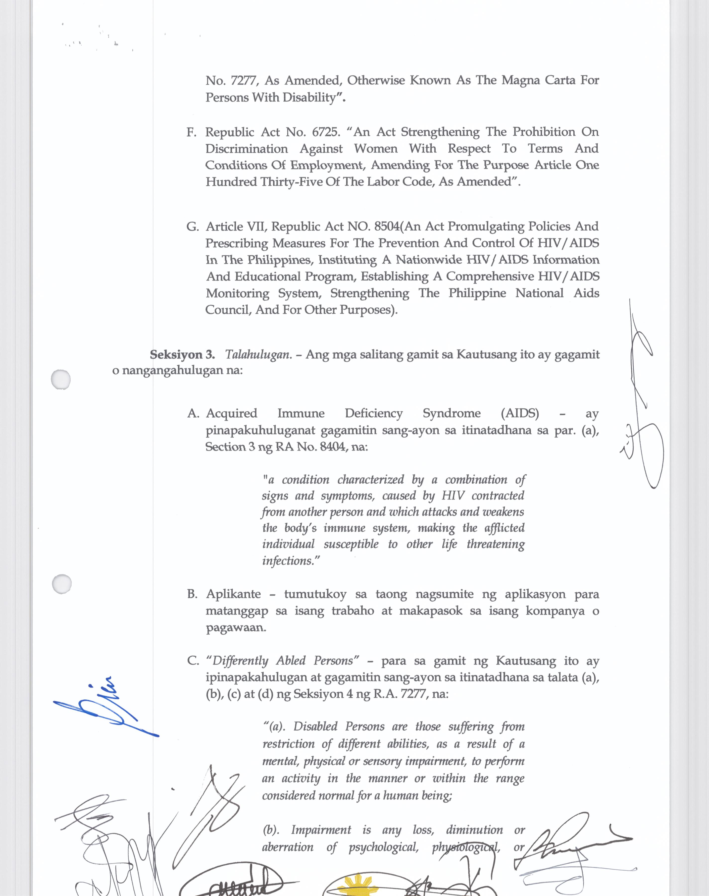 Isang Kautusang nagpapatibay sa Paglansag ng mga Posisyon na Ticket Checker na may salary Grade 3(1) at AdministrativeAidelll ( Driver l) na may Salar...
