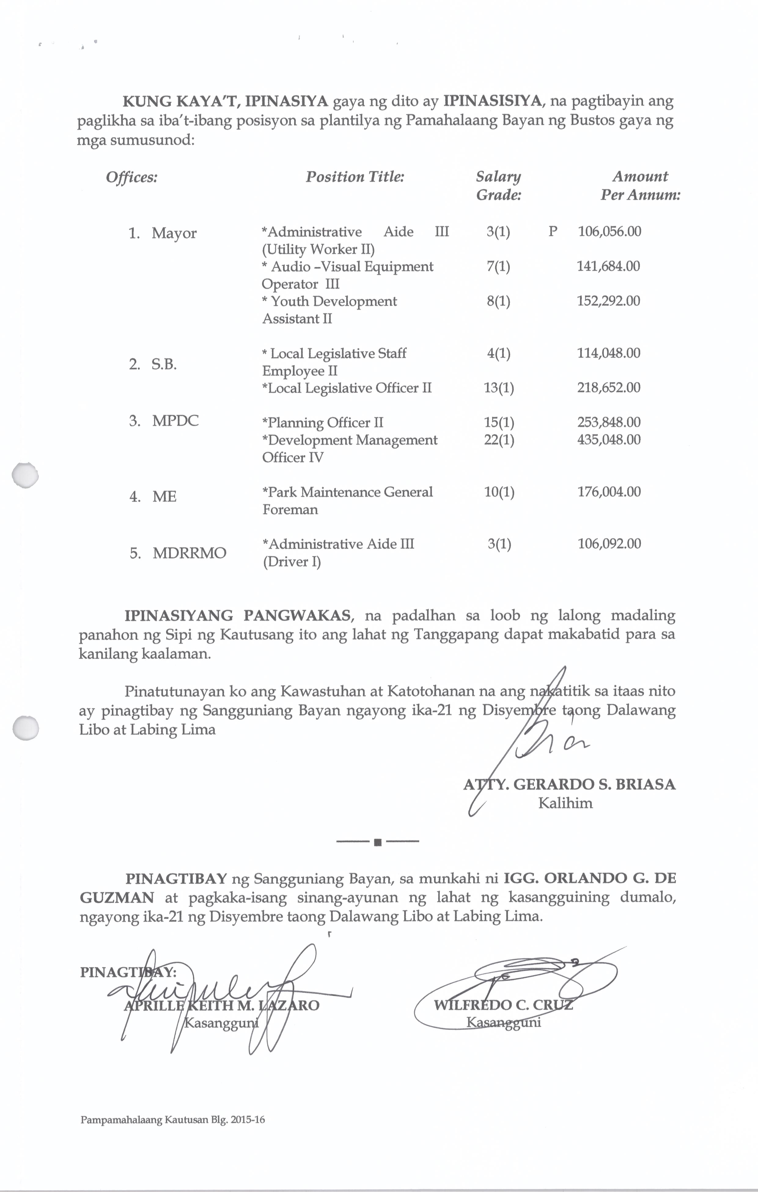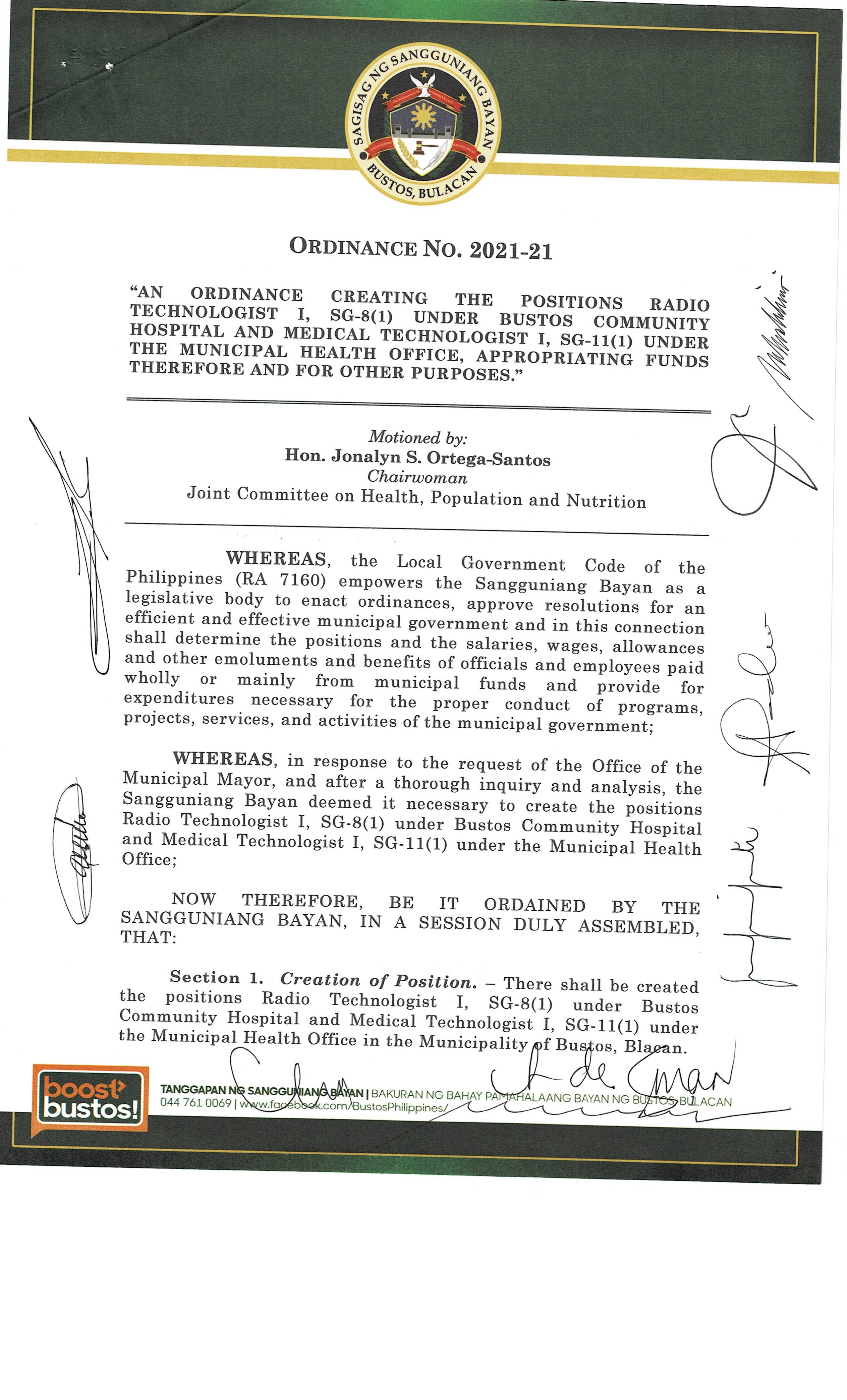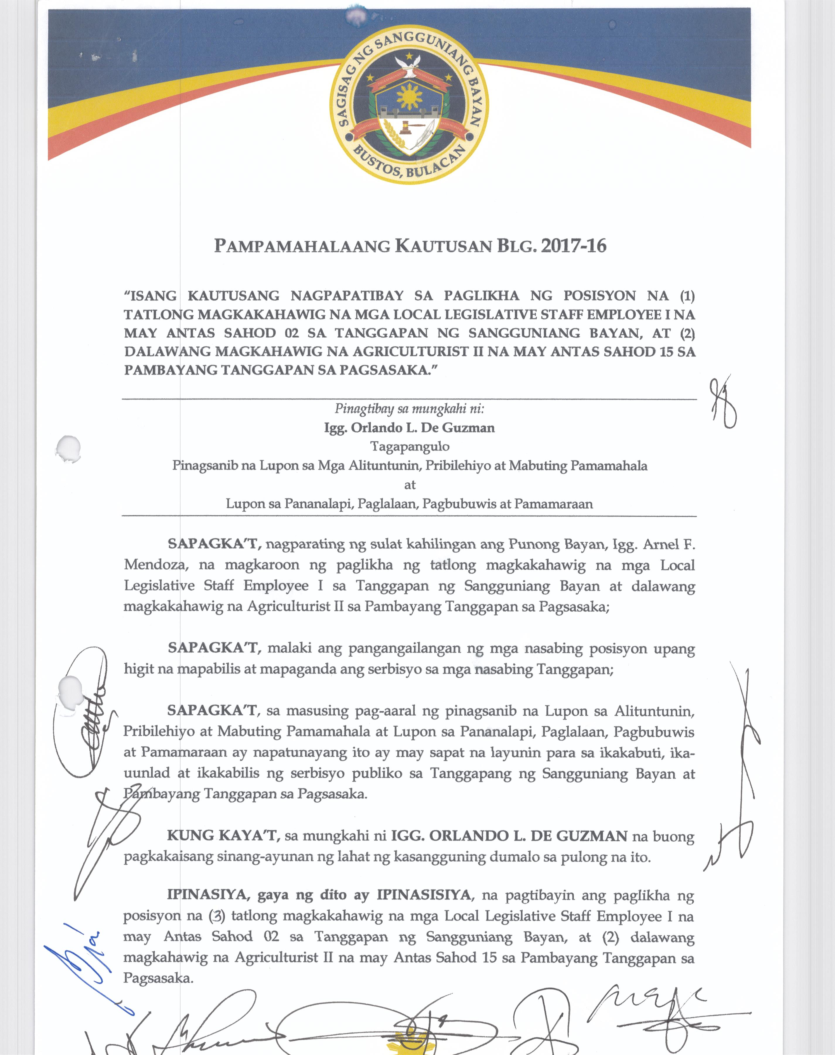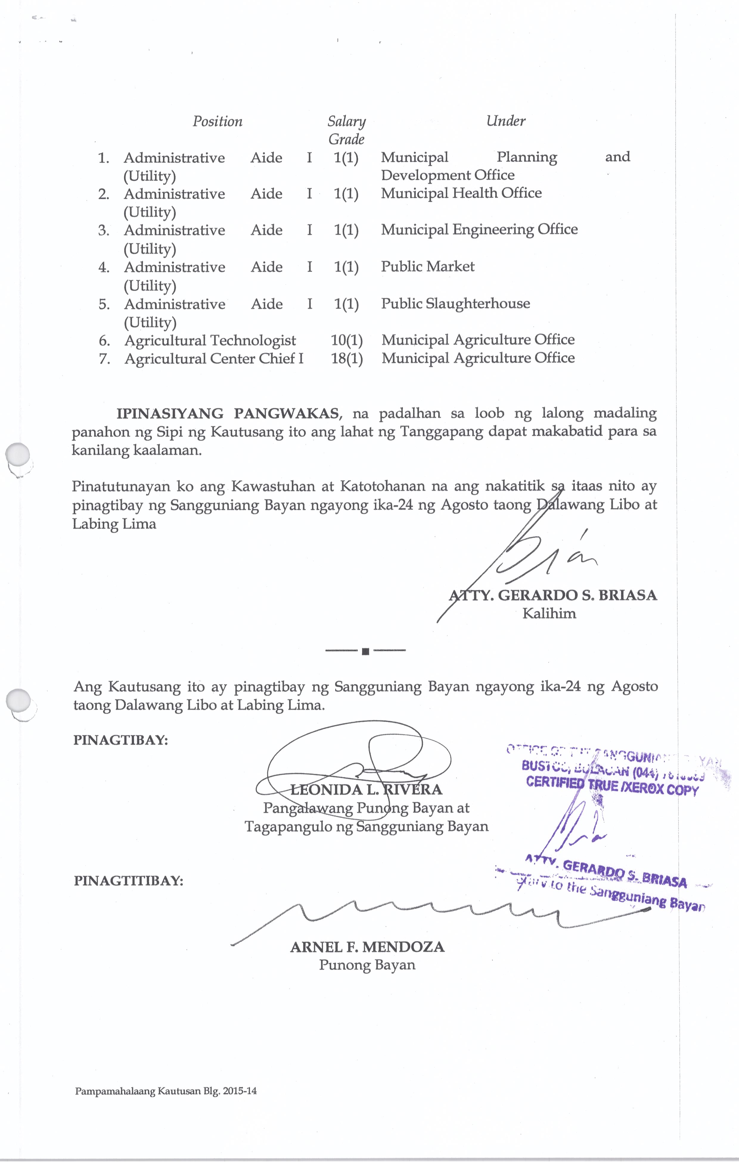 Isang Kautusang nagpapatibay sa Paglikha ng Iba’t-Ibang Posisyon sa Plantilya ng Pamahalaang Bayan ng Bustos.