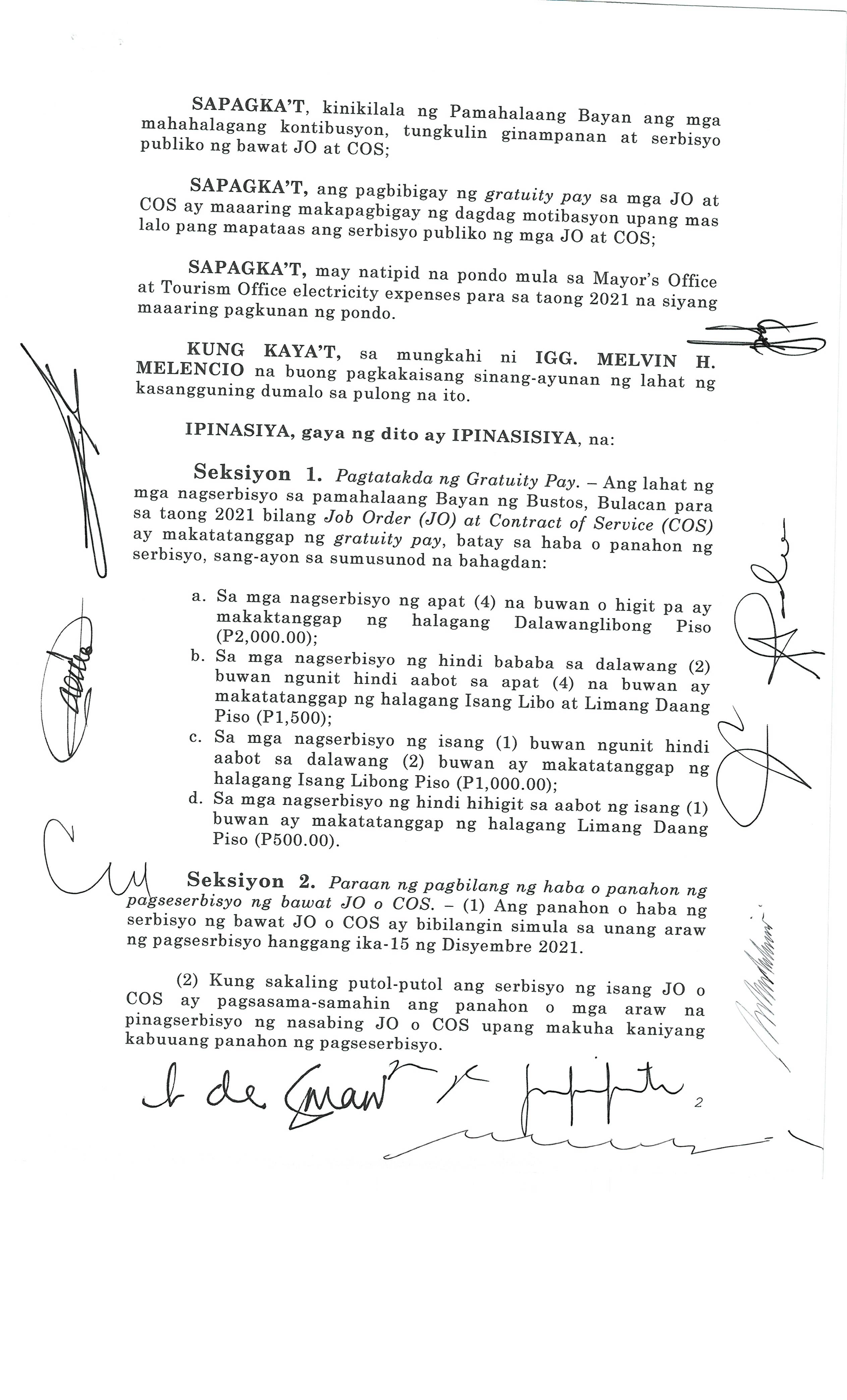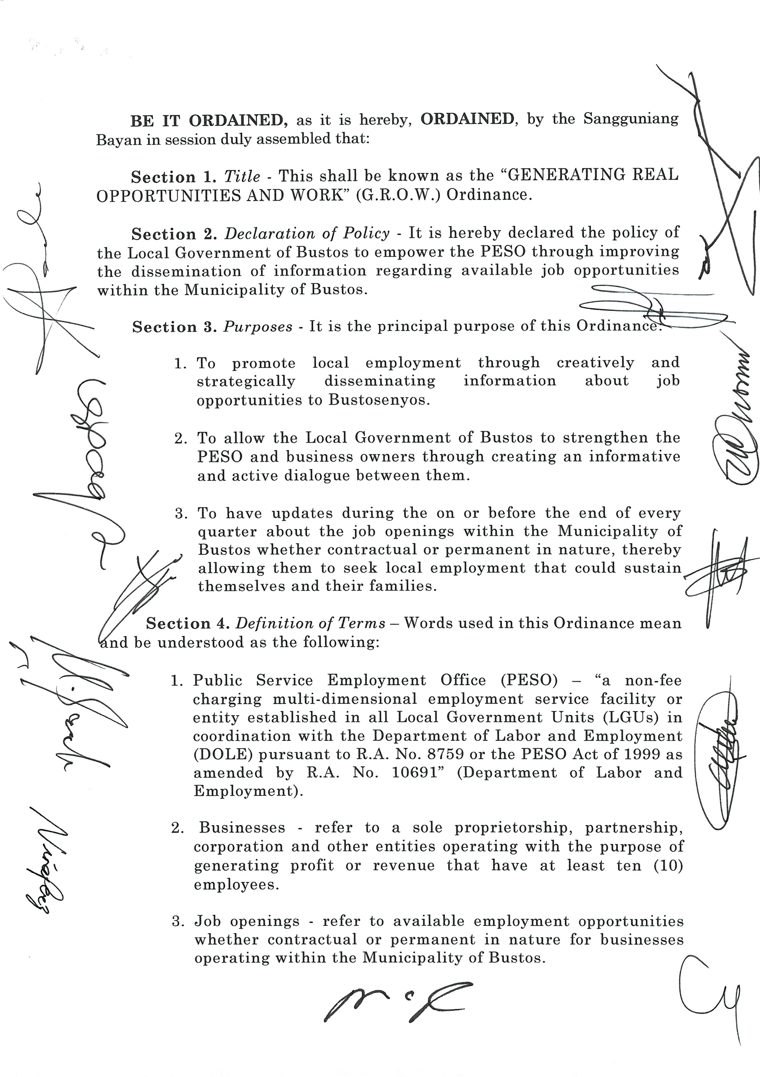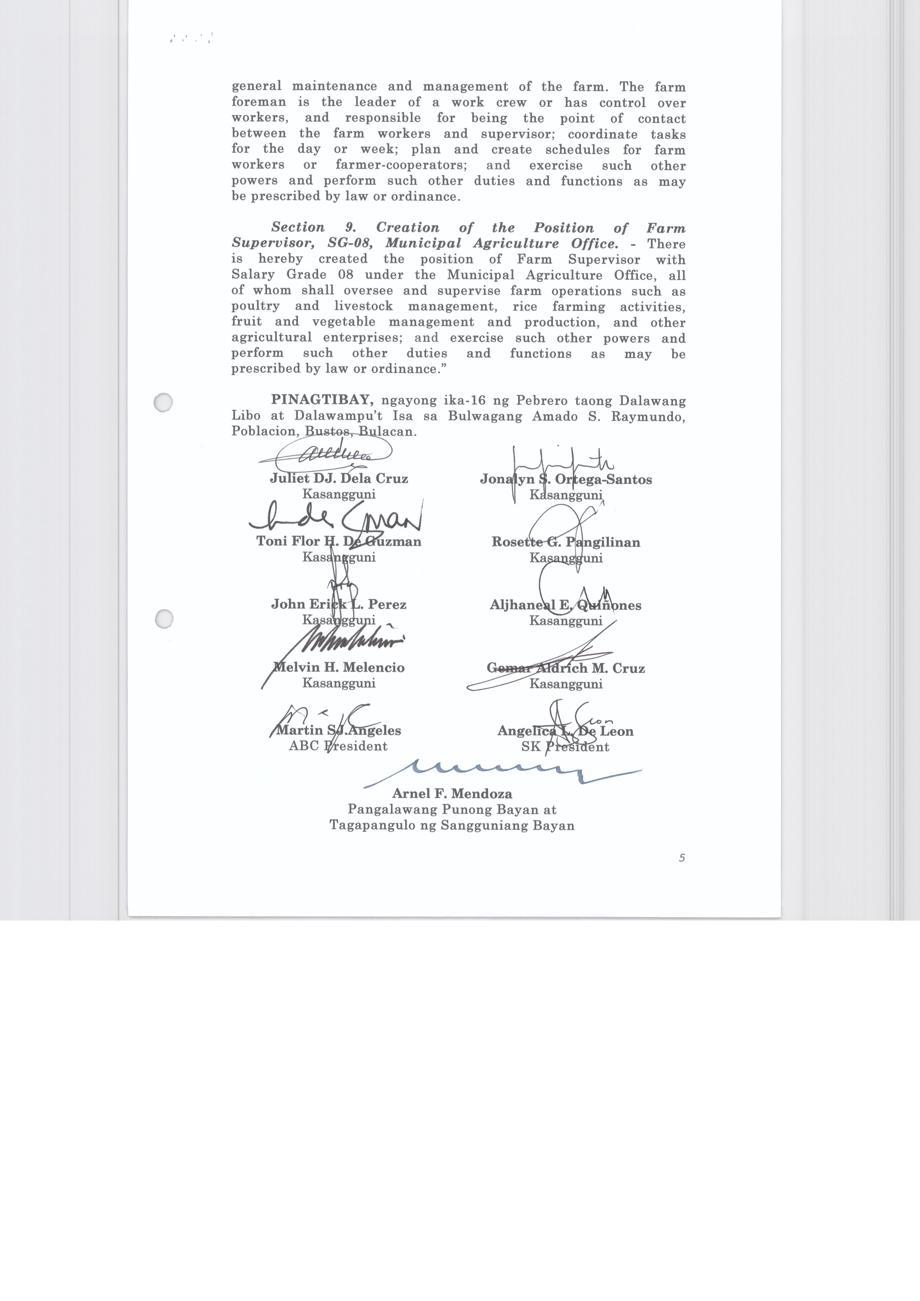 Isang Kautusang nagpapatibay sa Paglikha ng Iba’t-Ibang Posisyon sa Plantilya ng Pamahalaang Bayan ng Bustos.