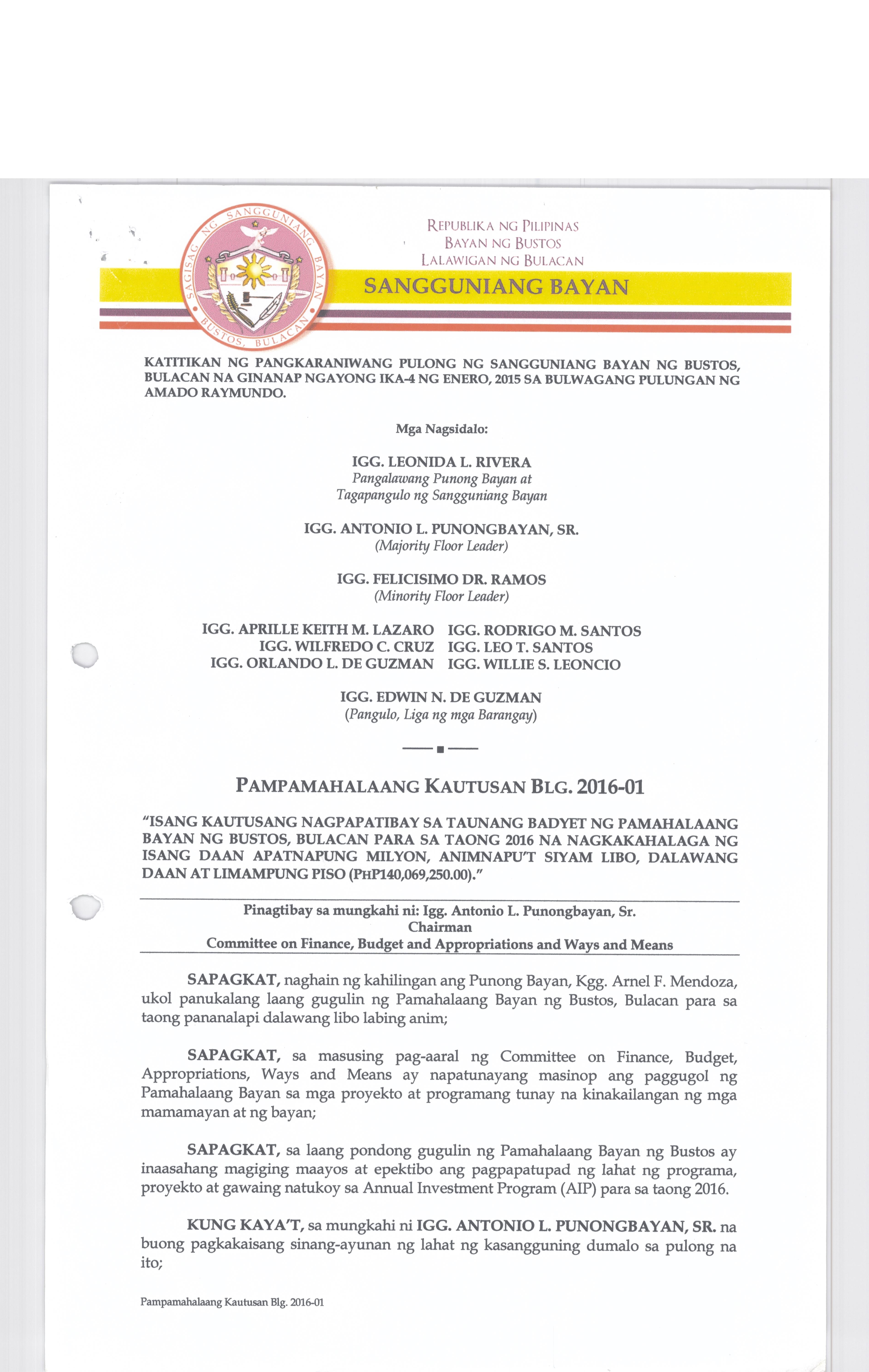 Isang Kautusang Nagpapatibay sa TaunangBadyet ng Pamahalaang Bayan ng Bustos, Bulacan Para sa Taong 2016 ng Php. 140,069,250.00