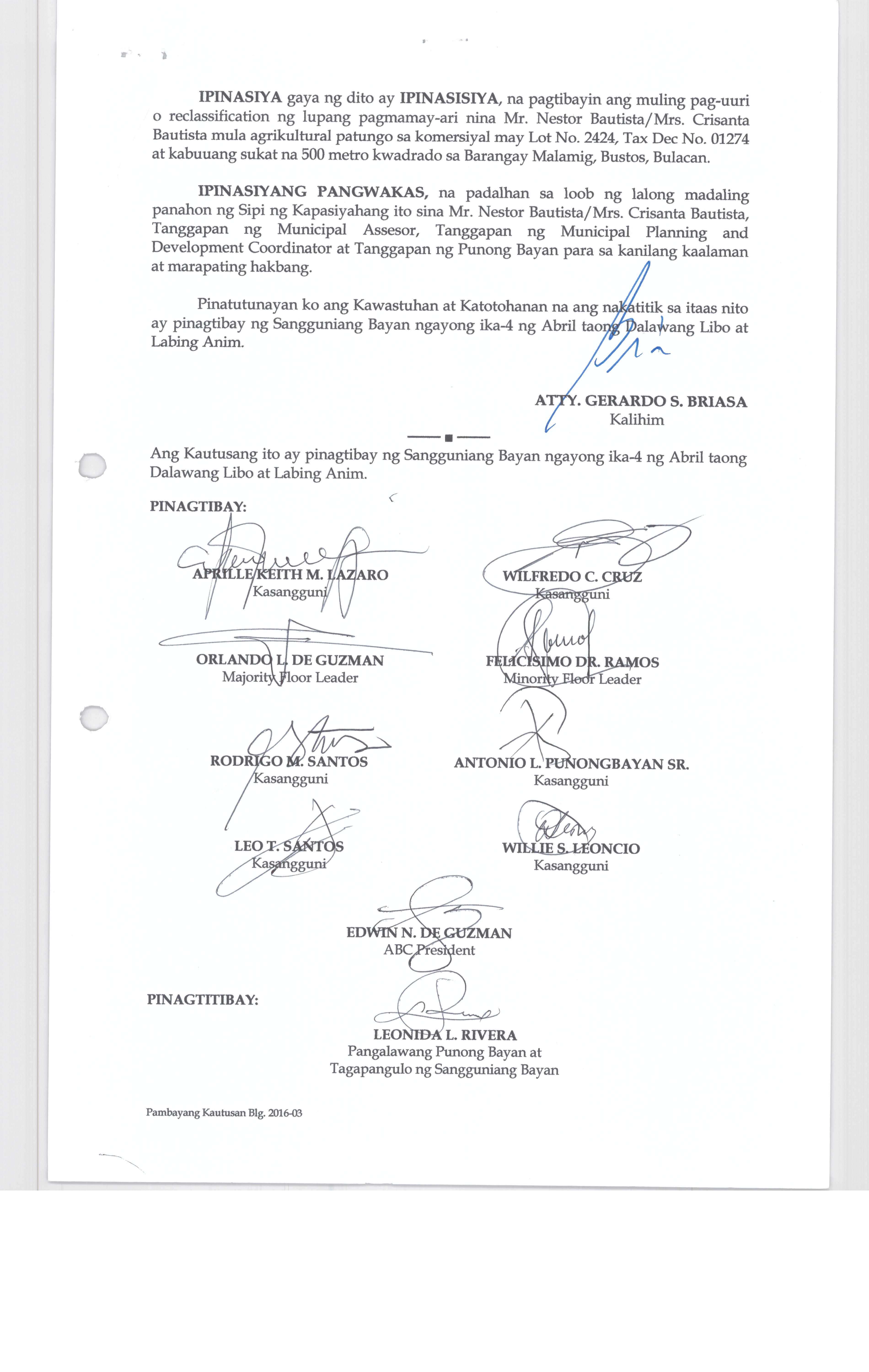 Isang Kautusang nagpapatibay sa muling pag-uuri o re-classification ng lupang pag-mamay-arinina Mr. Nestor Bautista/Mrs. Crisanta Bautista mula komersiyal na may sukat na 500 sqm. sa Barangay Malamig Bustos, Bulacan