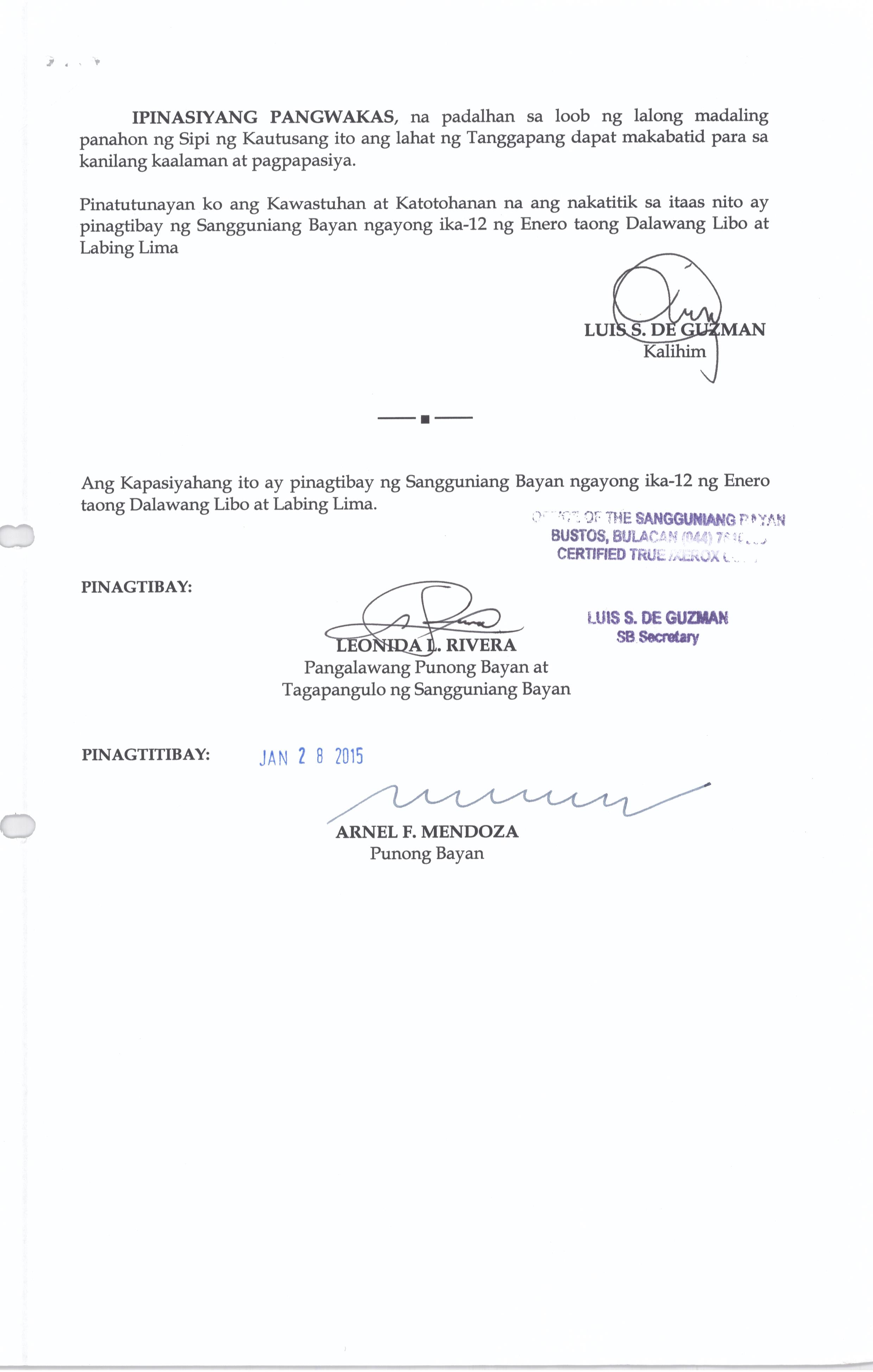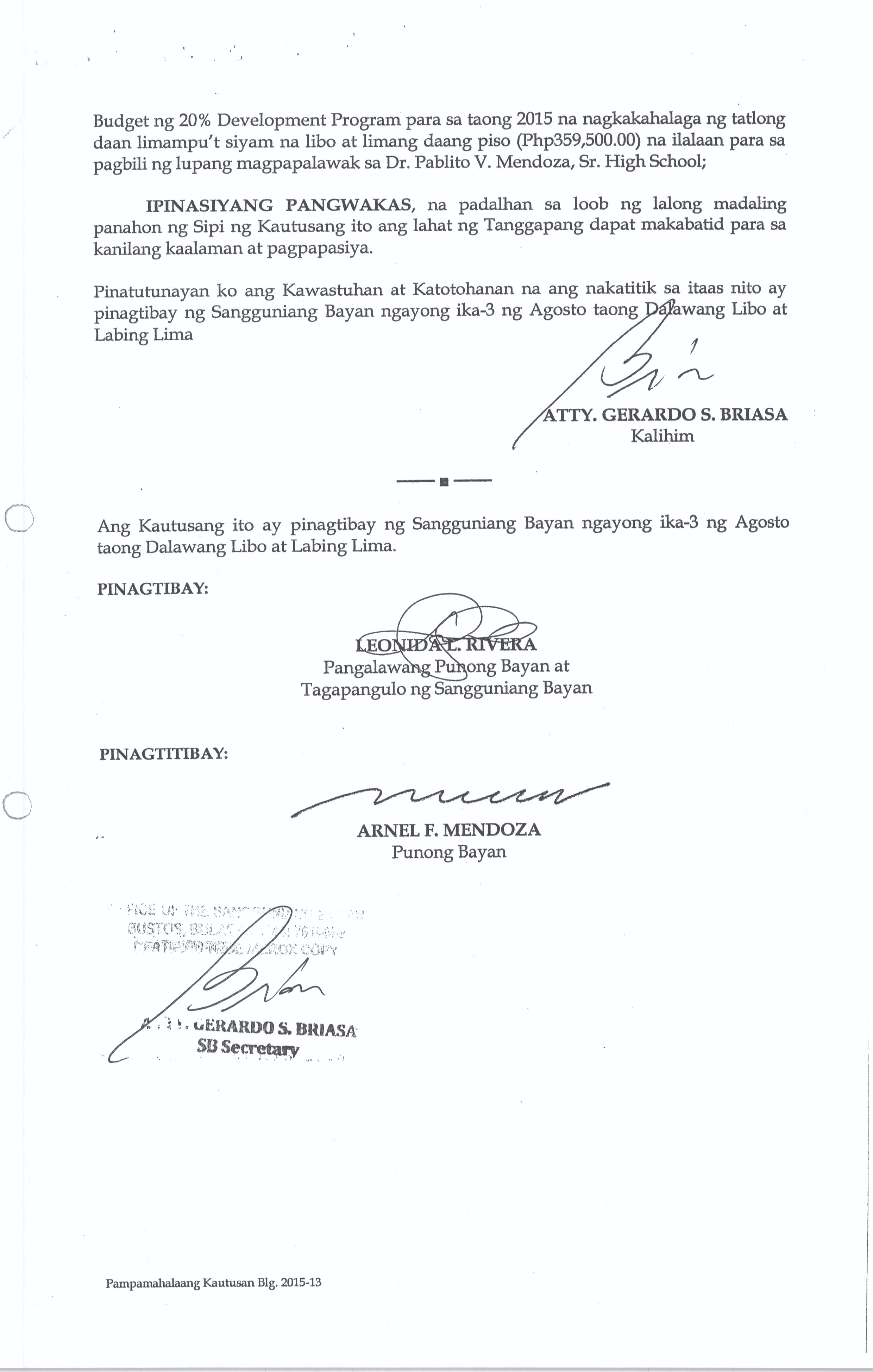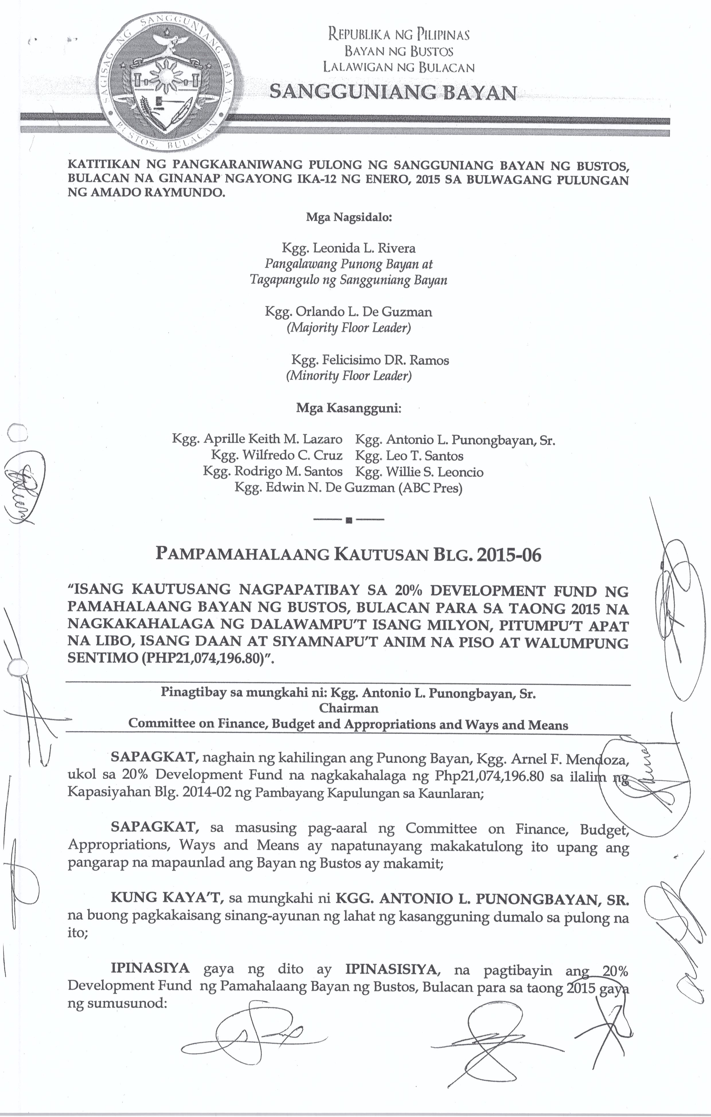 Isang Kautusang Nagpapatibay sa 20% Development Fund ng Pamahalaang Bayan ng Bustos Bulacan para sa Taong 2015 na nagkakahalaga ng Php.21,074,196.80.
