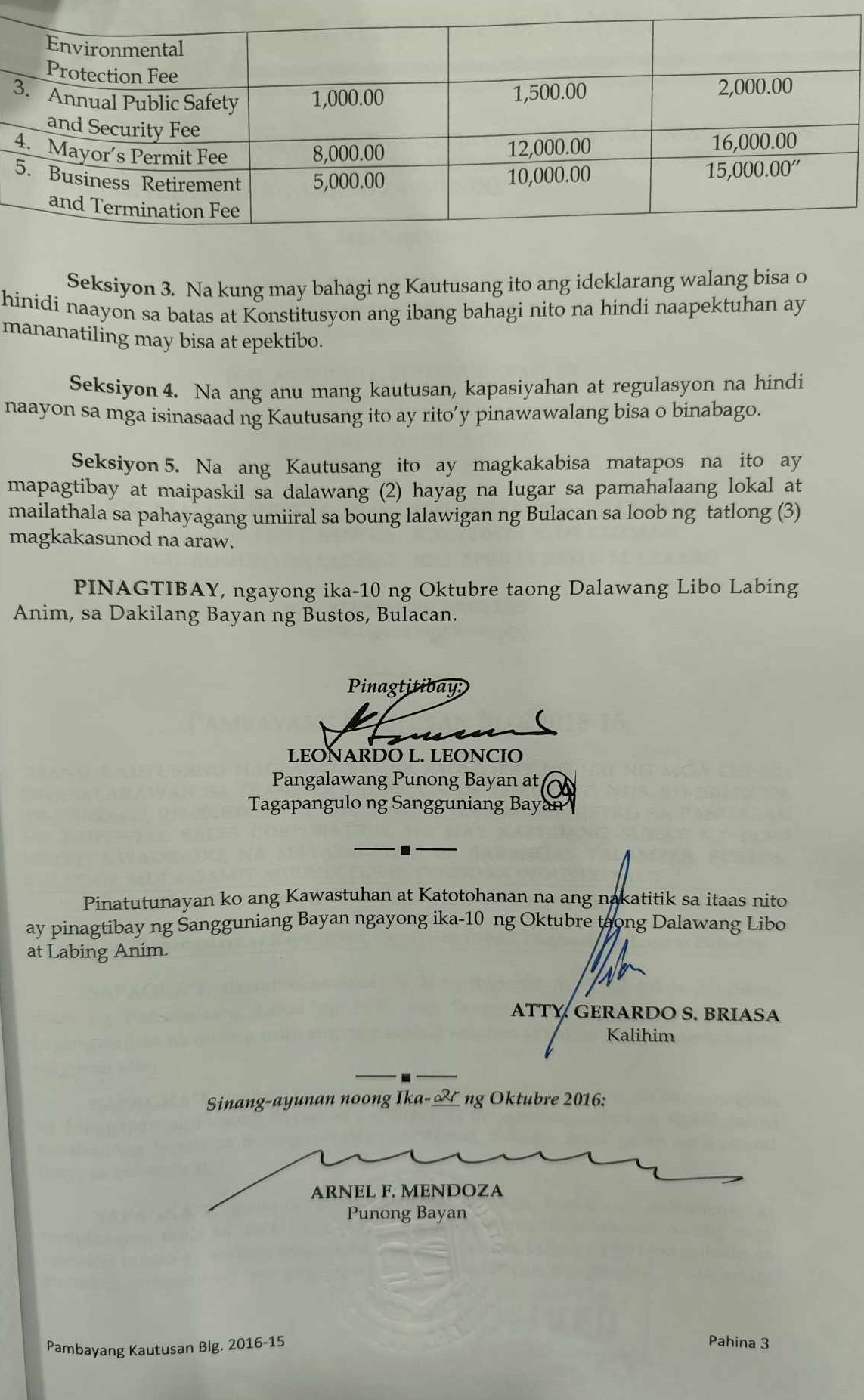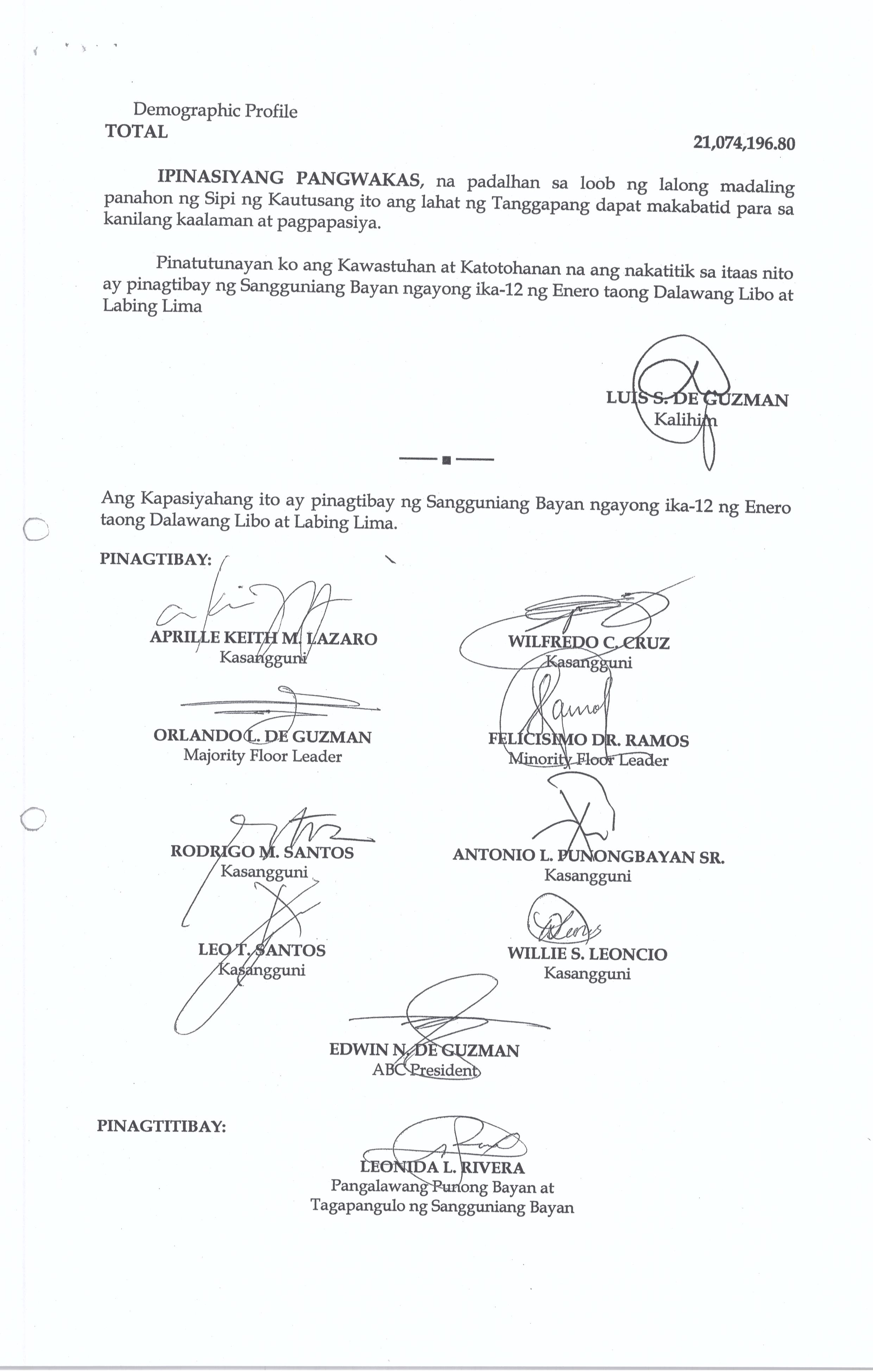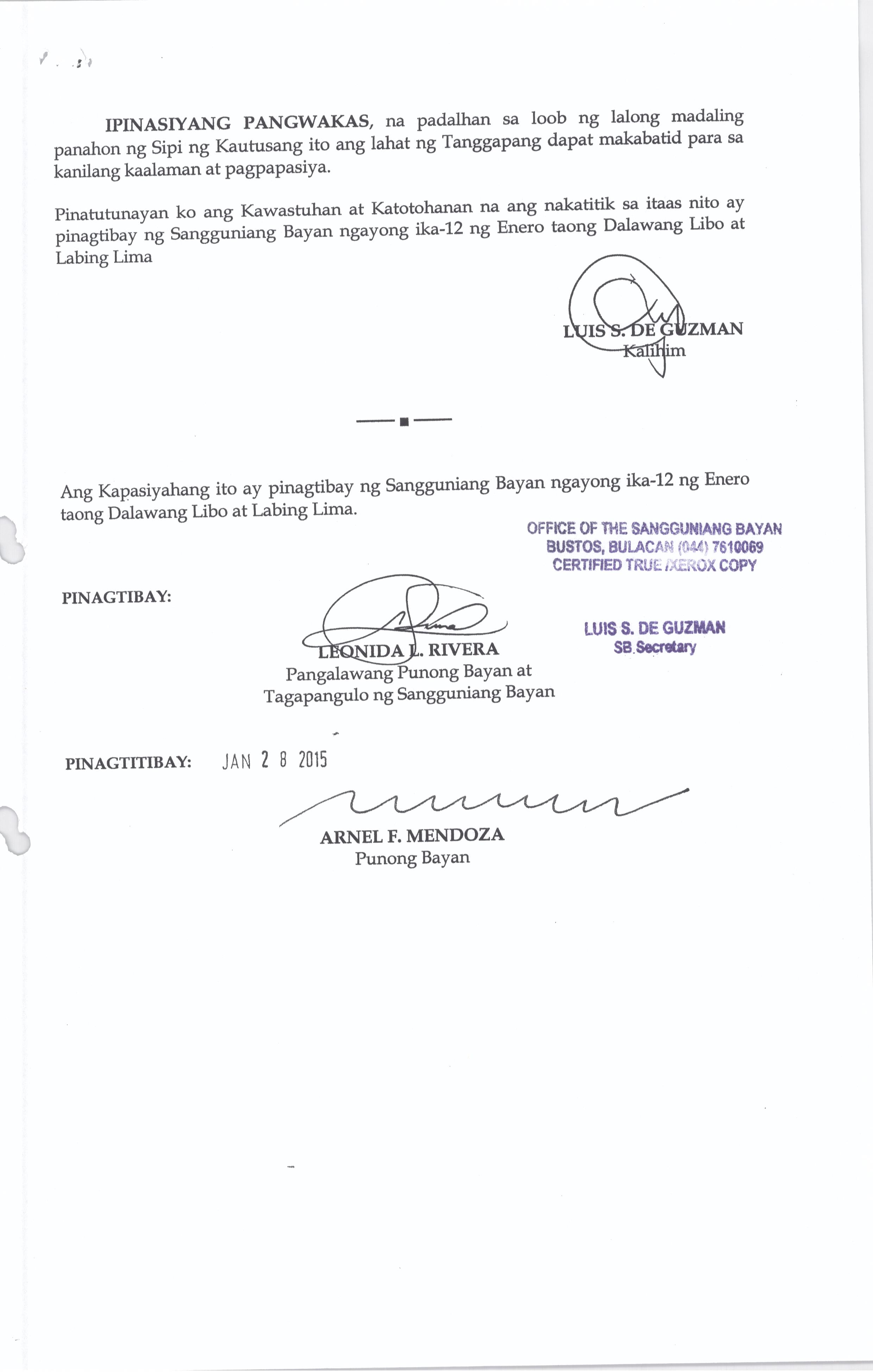 Isang Kautusang Nagpapatibay sa 20% Development Fund ng Pamahalaang Bayan ng Bustos Bulacan para sa Taong 2015 na nagkakahalaga ng Php.21,074,196.80.