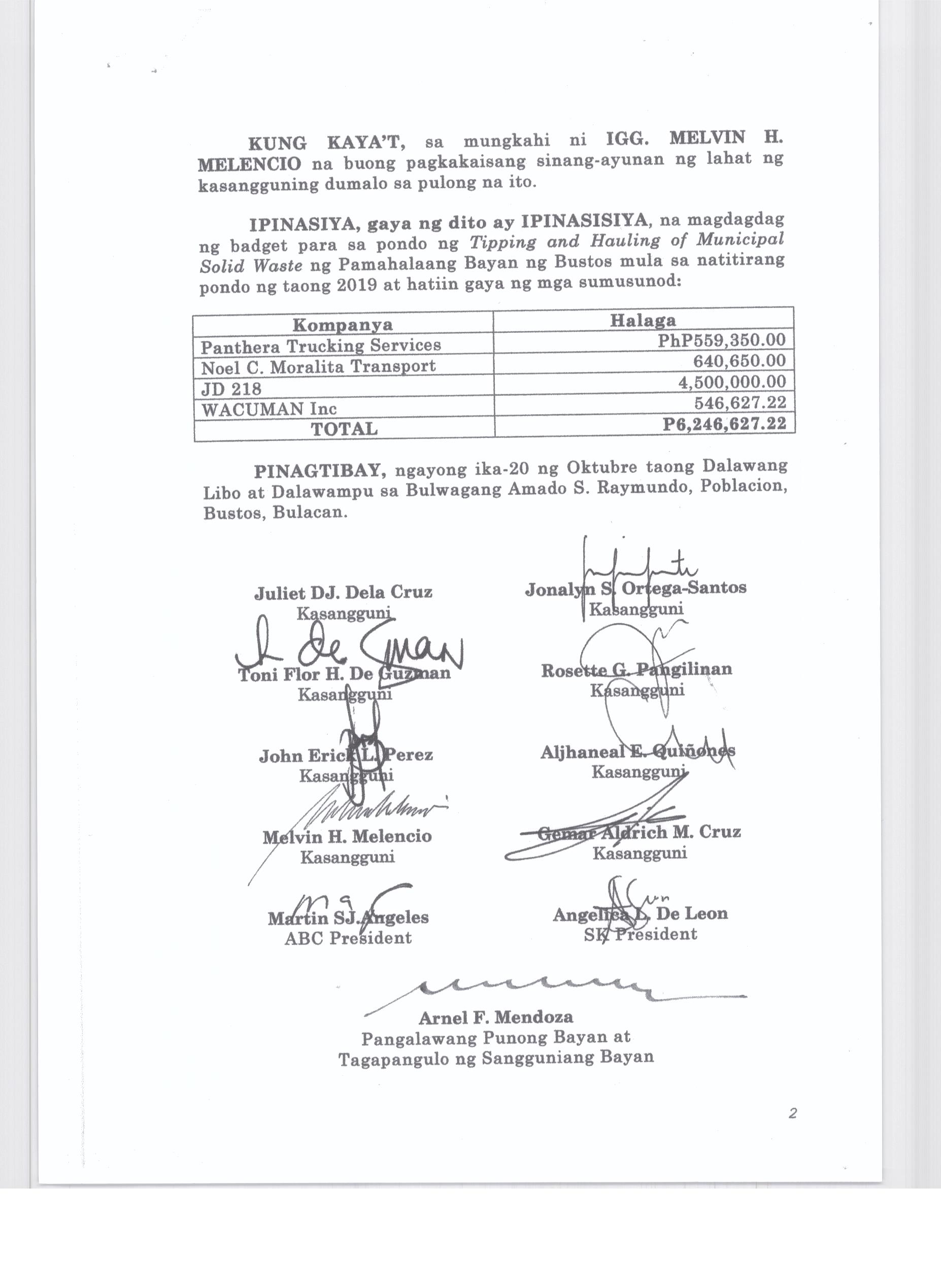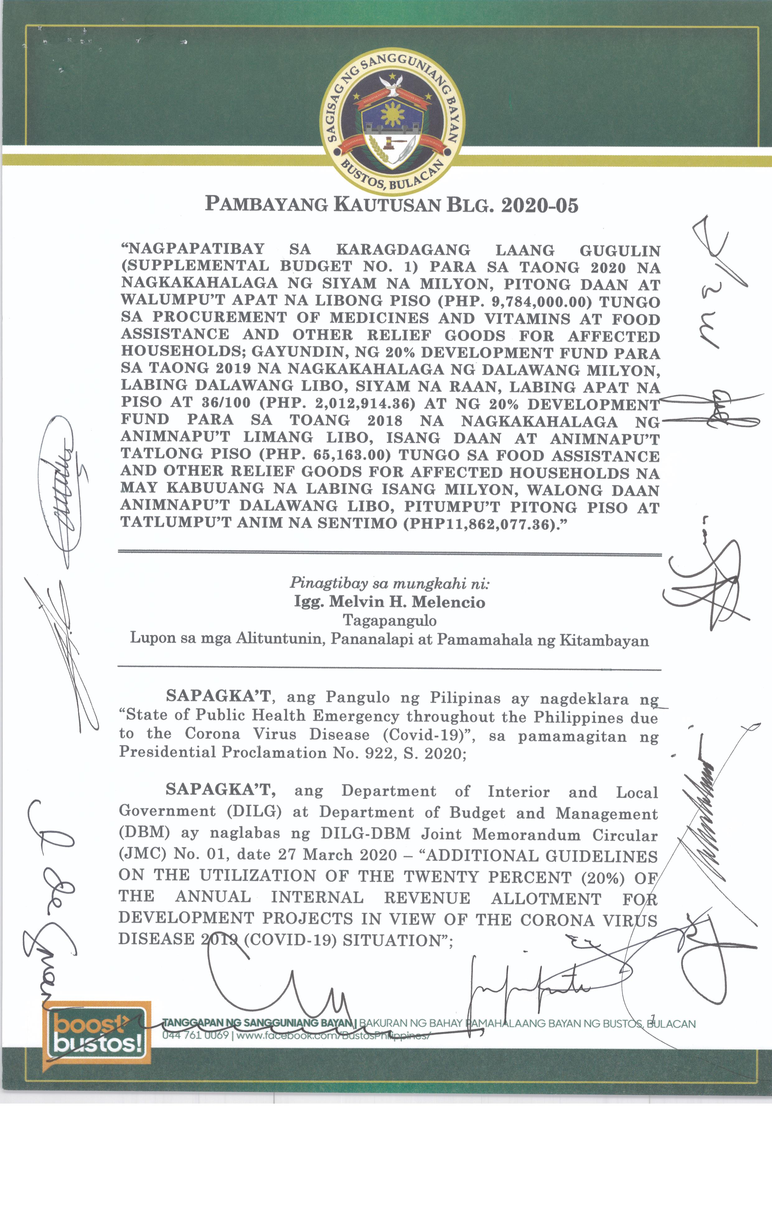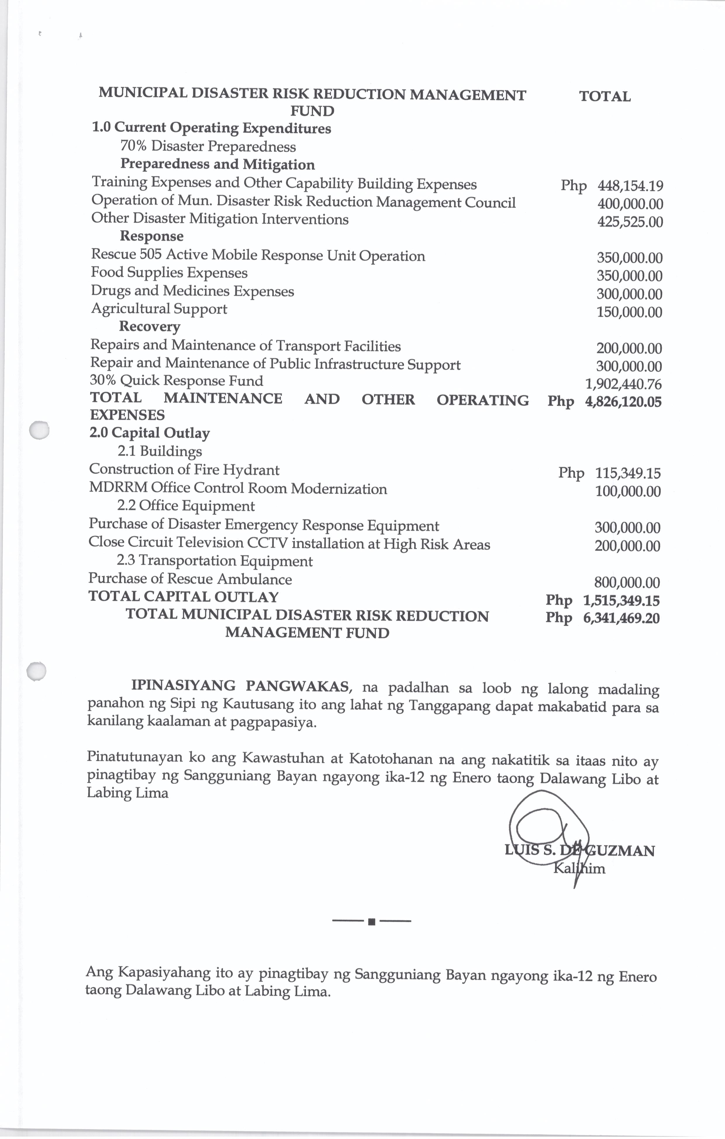 Isang Kautusang Nagpapatibay sa 5% Calamity Fund ng Pamahalaang Bayan ng Bustos Bulacan na nagkakahalaga ng Php.6,341,469.20