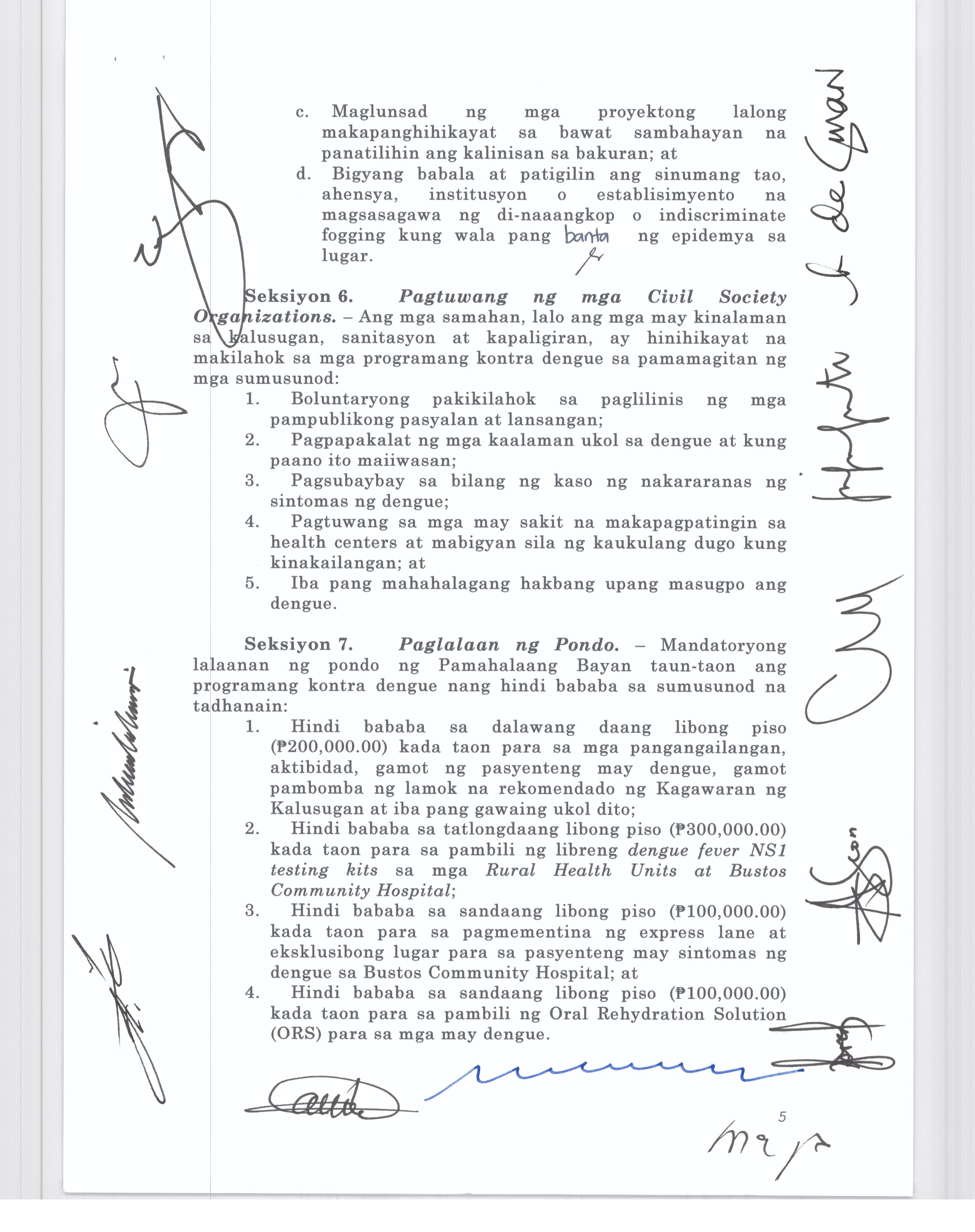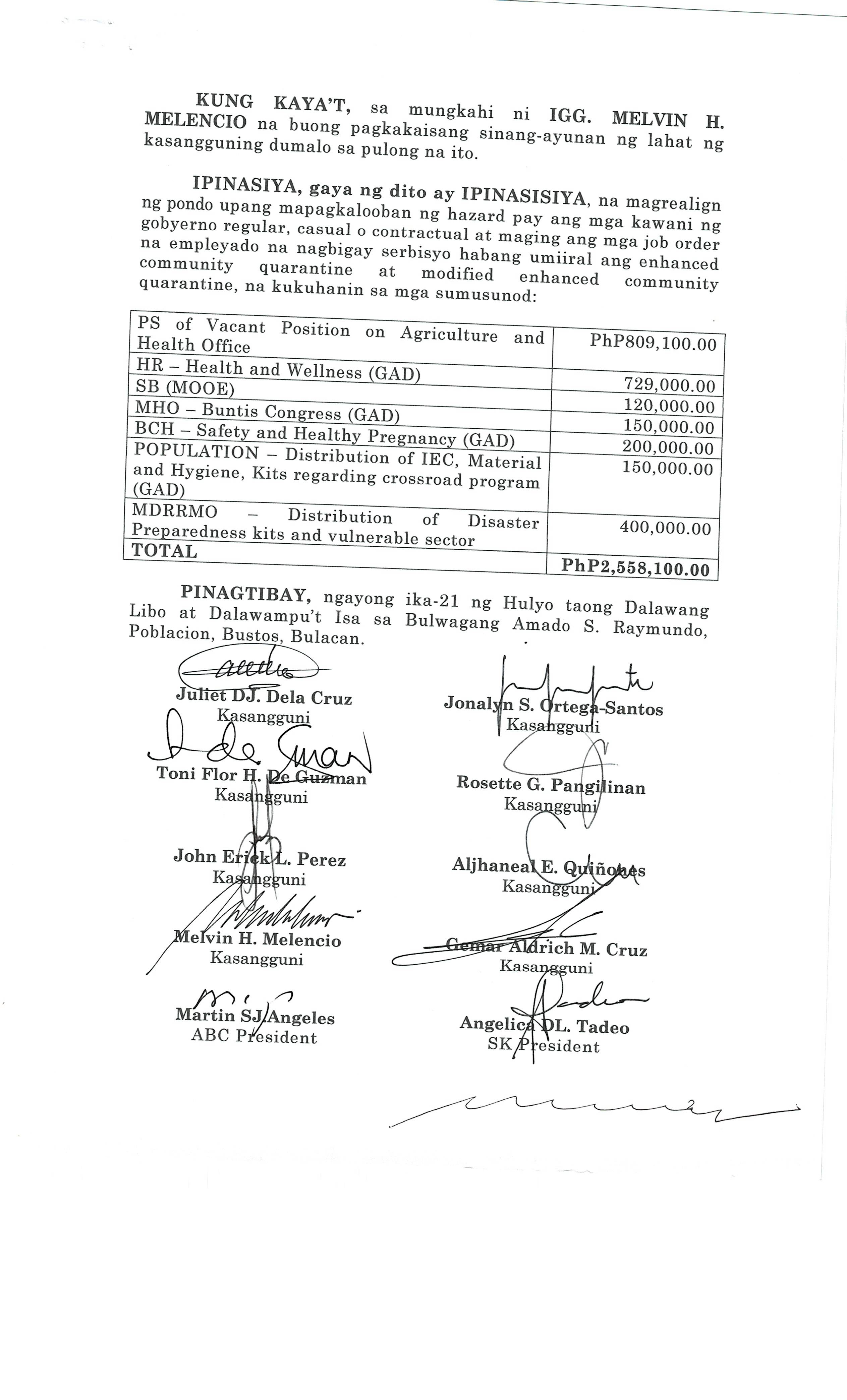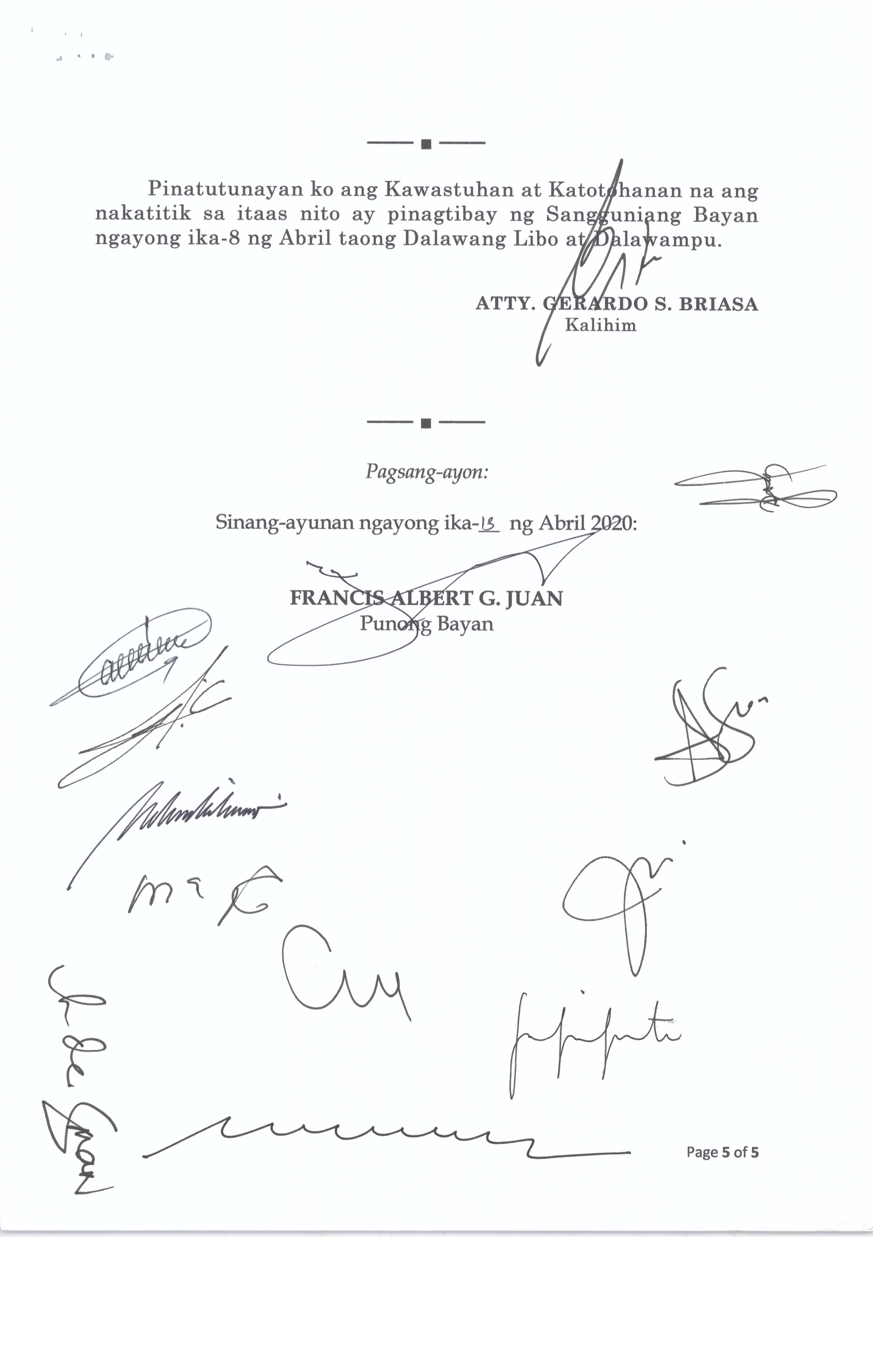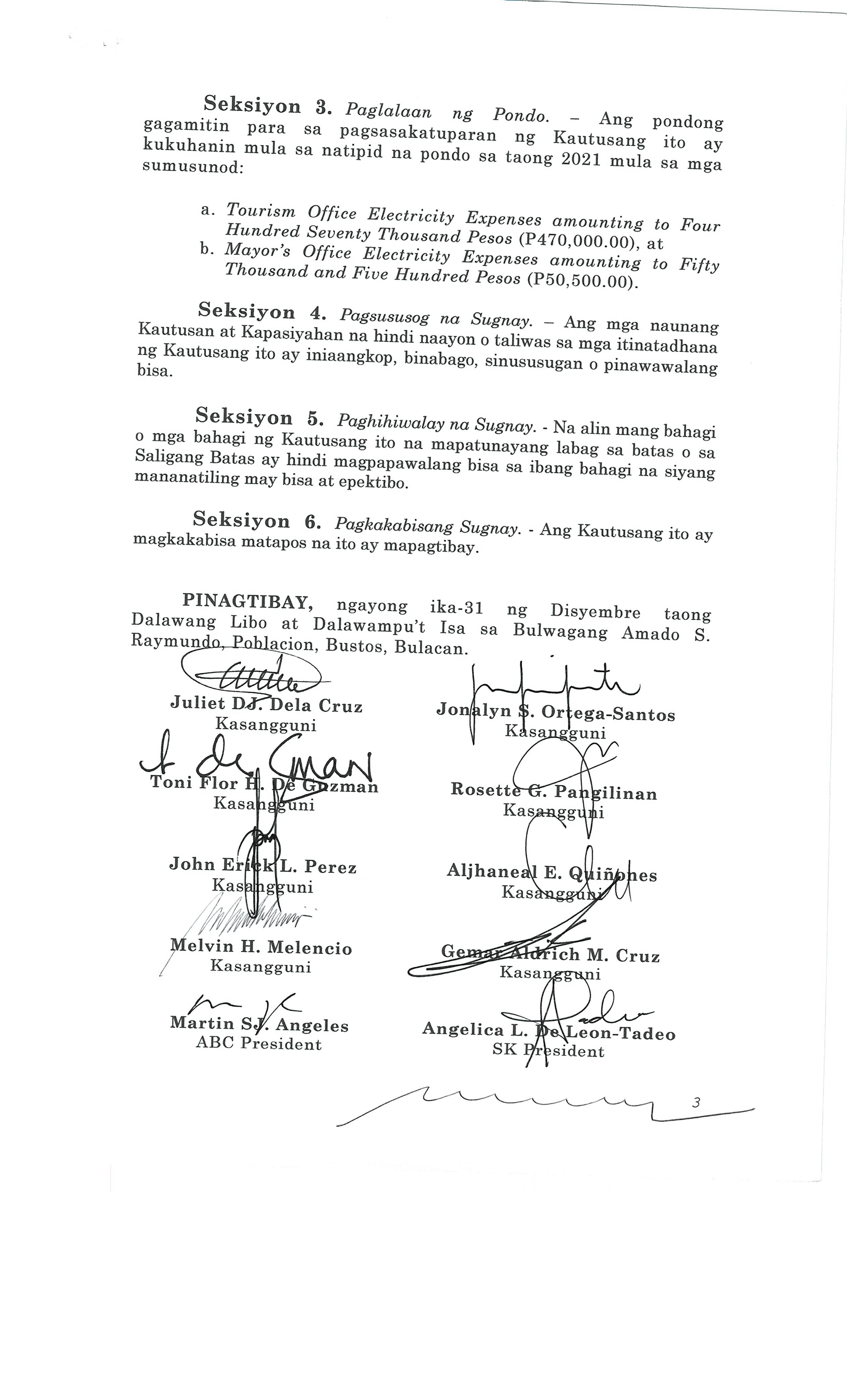 Isang Kautusang Nagpapatibay sa 5% Calamity Fund ng Pamahalaang Bayan ng Bustos Bulacan na nagkakahalaga ng Php.6,341,469.20