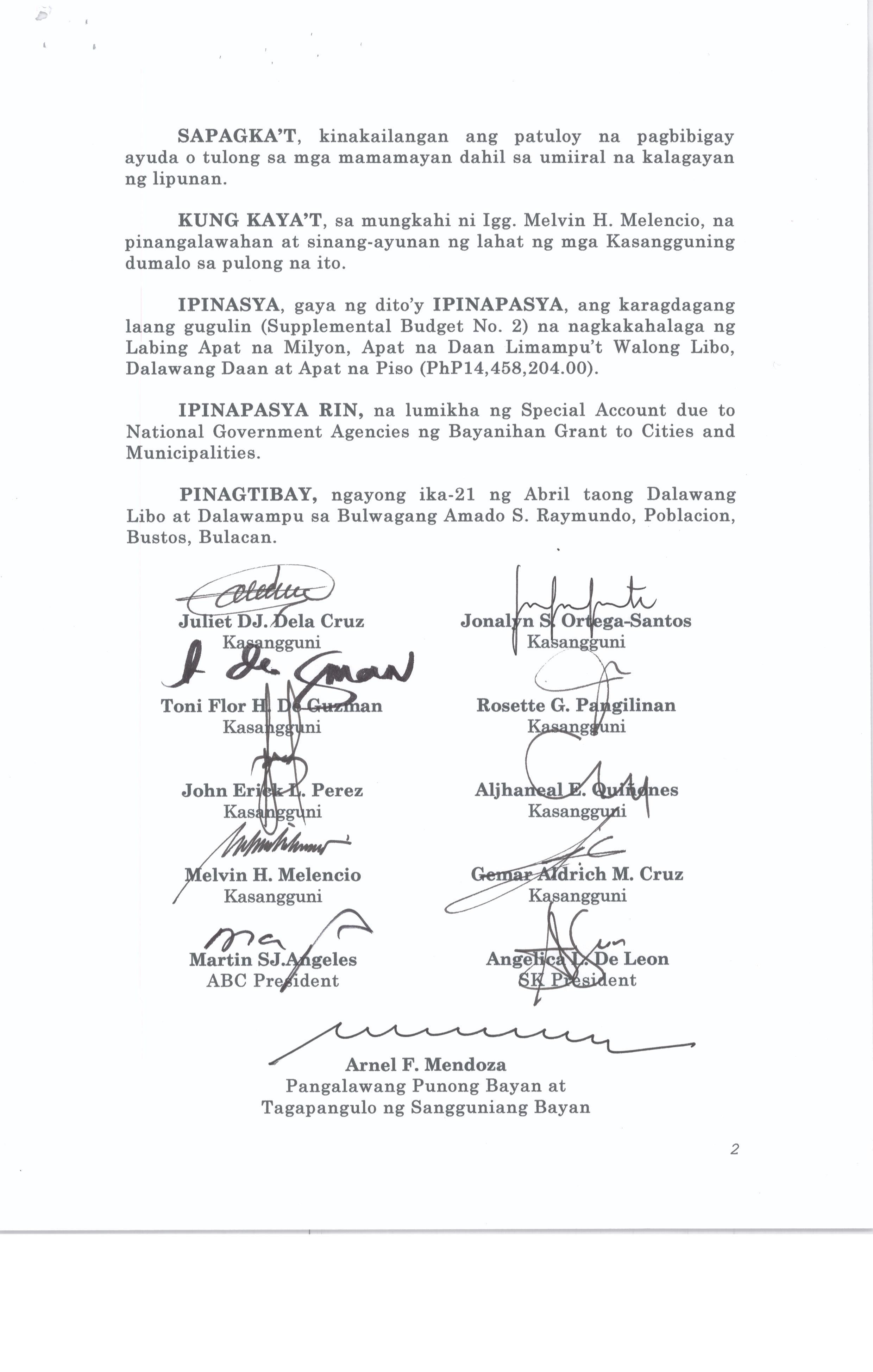 Isang Kautusang Nagpapatibay sa Kapasiyahan Blg. 2015-02 ng Pambayang Kapulungan na nauukol sa Supplemental Budget ng 20% Development Program para sa ...