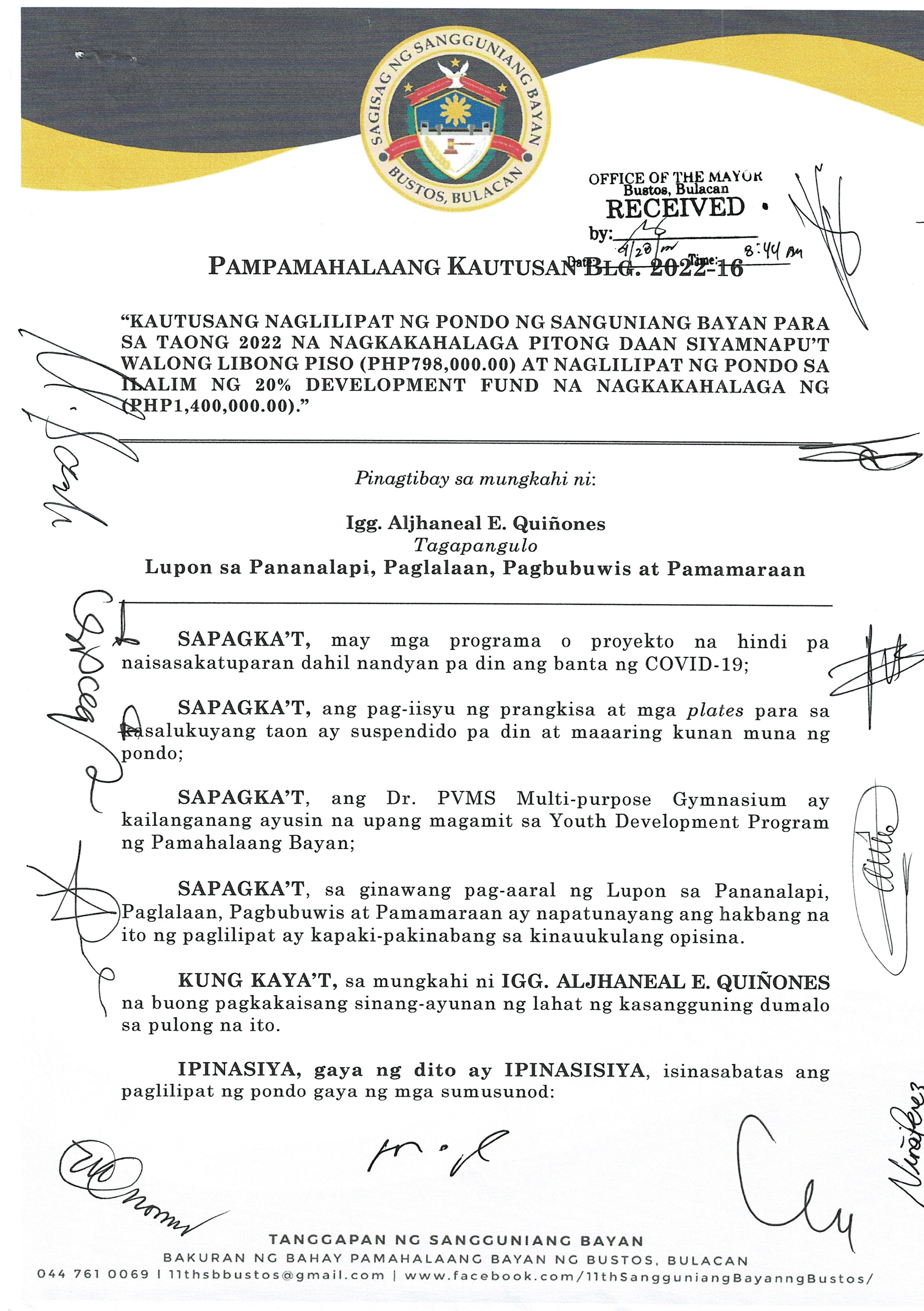 Kautusang naglilipat ng pondo sa ilalim ng 20% development fund na nagkakahalaga ng pitong milyon at siyam na daang libong piso (PHP7,900,000.00)