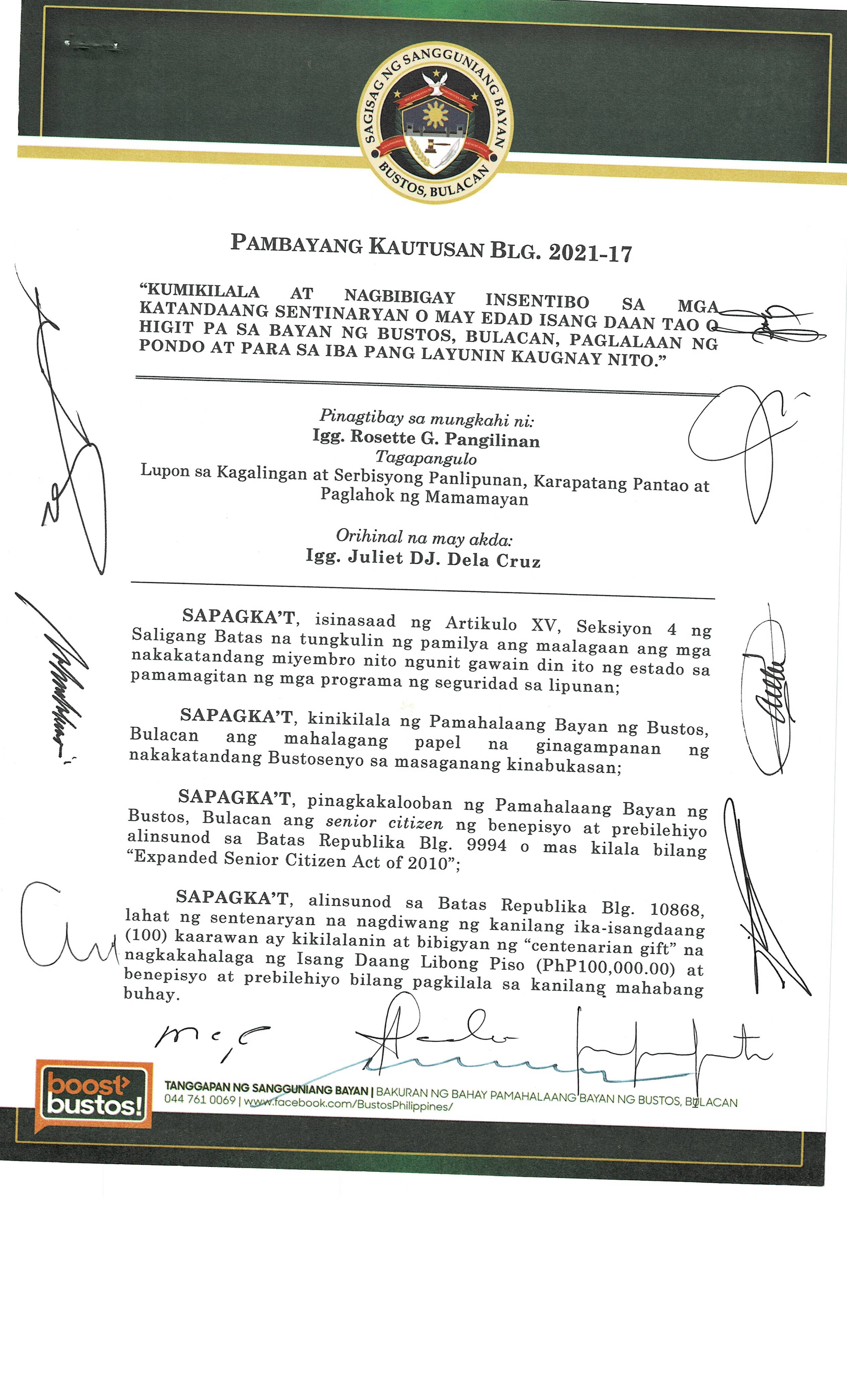 Isang kautusang nagpapatibay sa pagpaparangal sa mga Natatanging Bustosenyo para sa nalalapit na pagdiriwang ng Iika Isang Daan Taon ng Bayan ng Bustos at nagtatakda ng mga alituntunin para dito.
