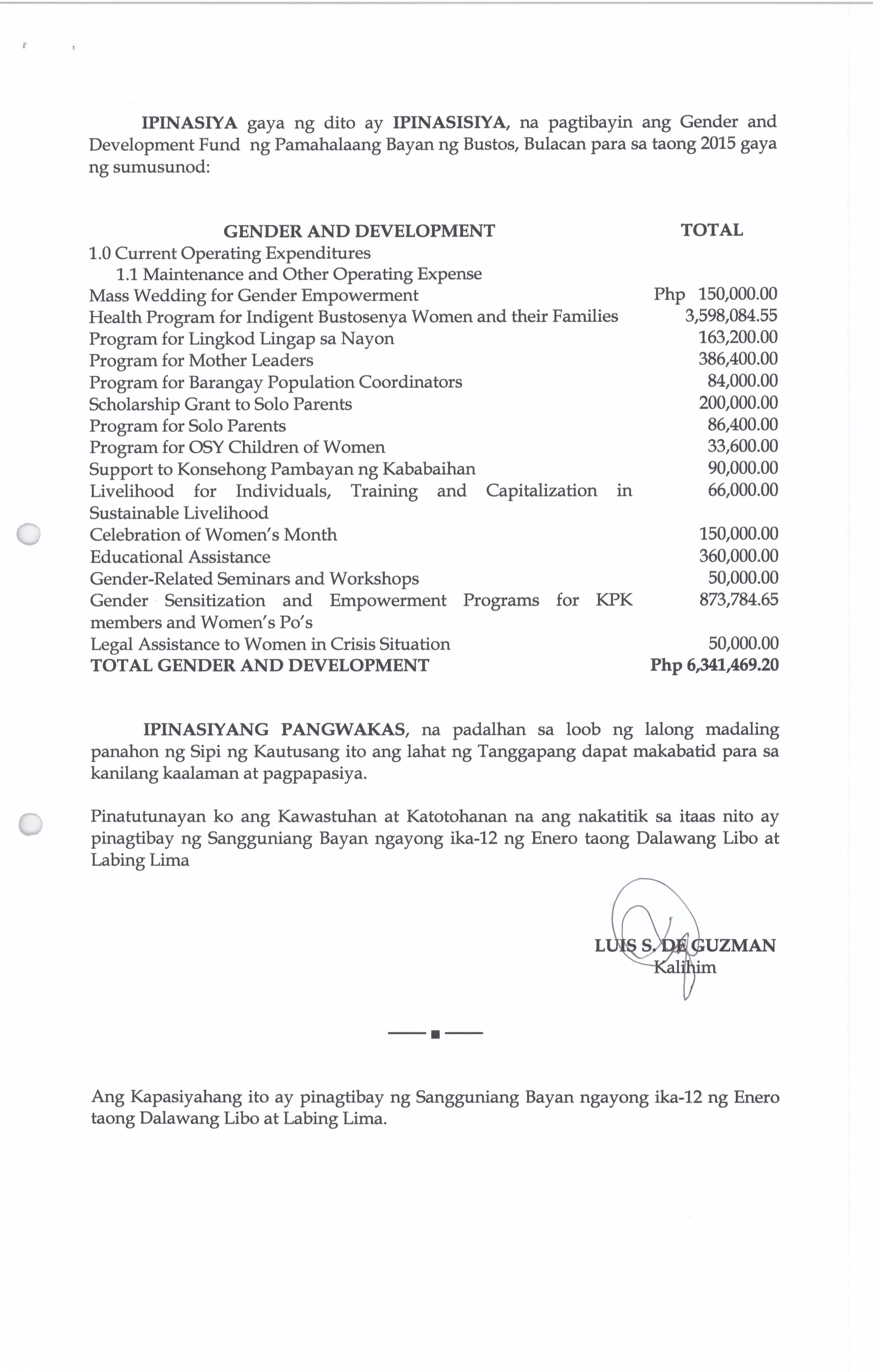 Isang Kautusang Nagpapatibay sa Gender and Development Fund ng Pamahalaang Bayan ng Bustos Para sa Taong 2015 na nagkakahalaga ng Php.6,315,944.20