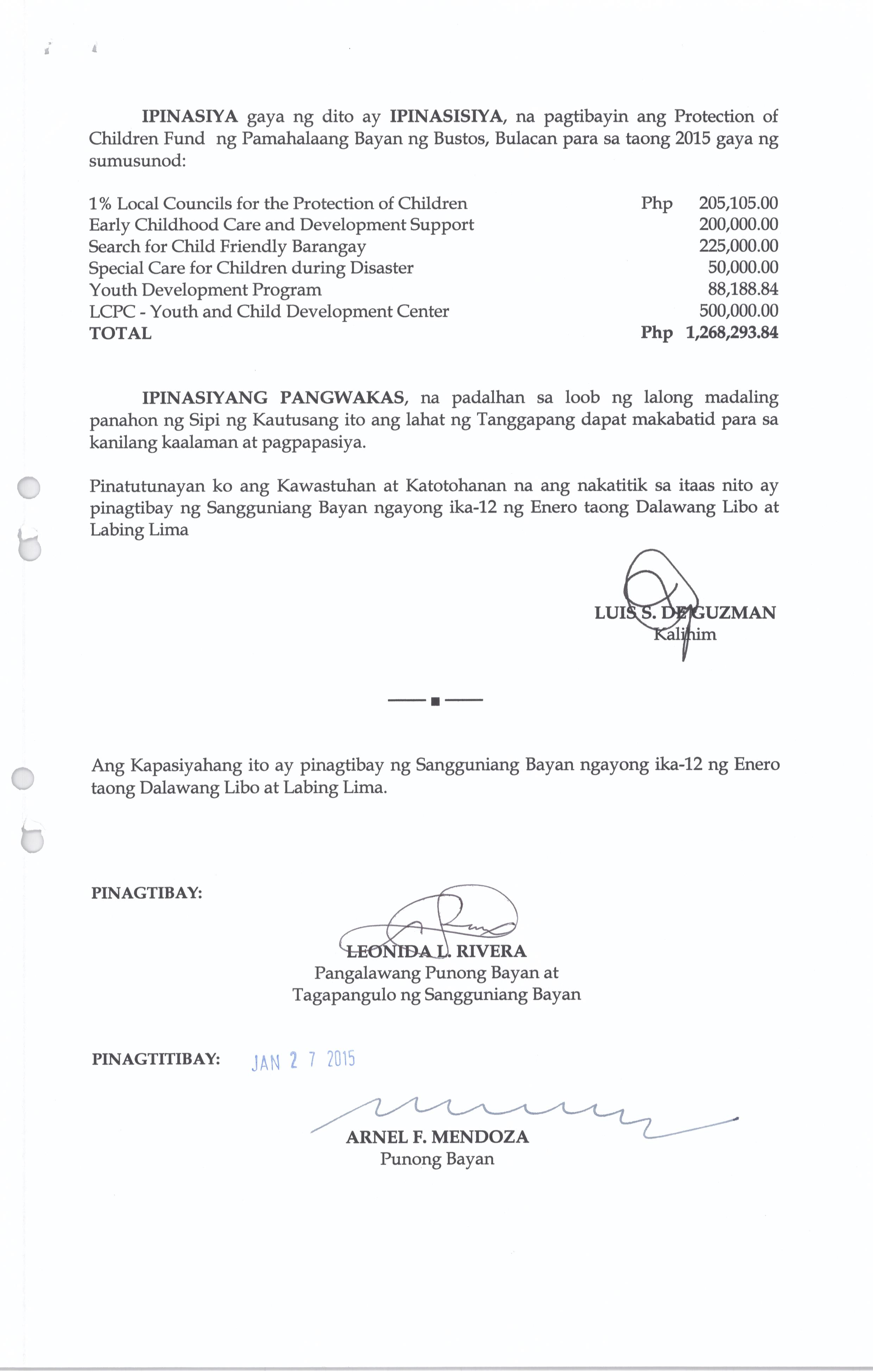 Isang kautusang Nagpapatibay sa Protection of Children Fund ng Pamahalaang Bayan ng Bustos para sa Taong 2015 na nagkakahalaga ng Php.1,268,293.84