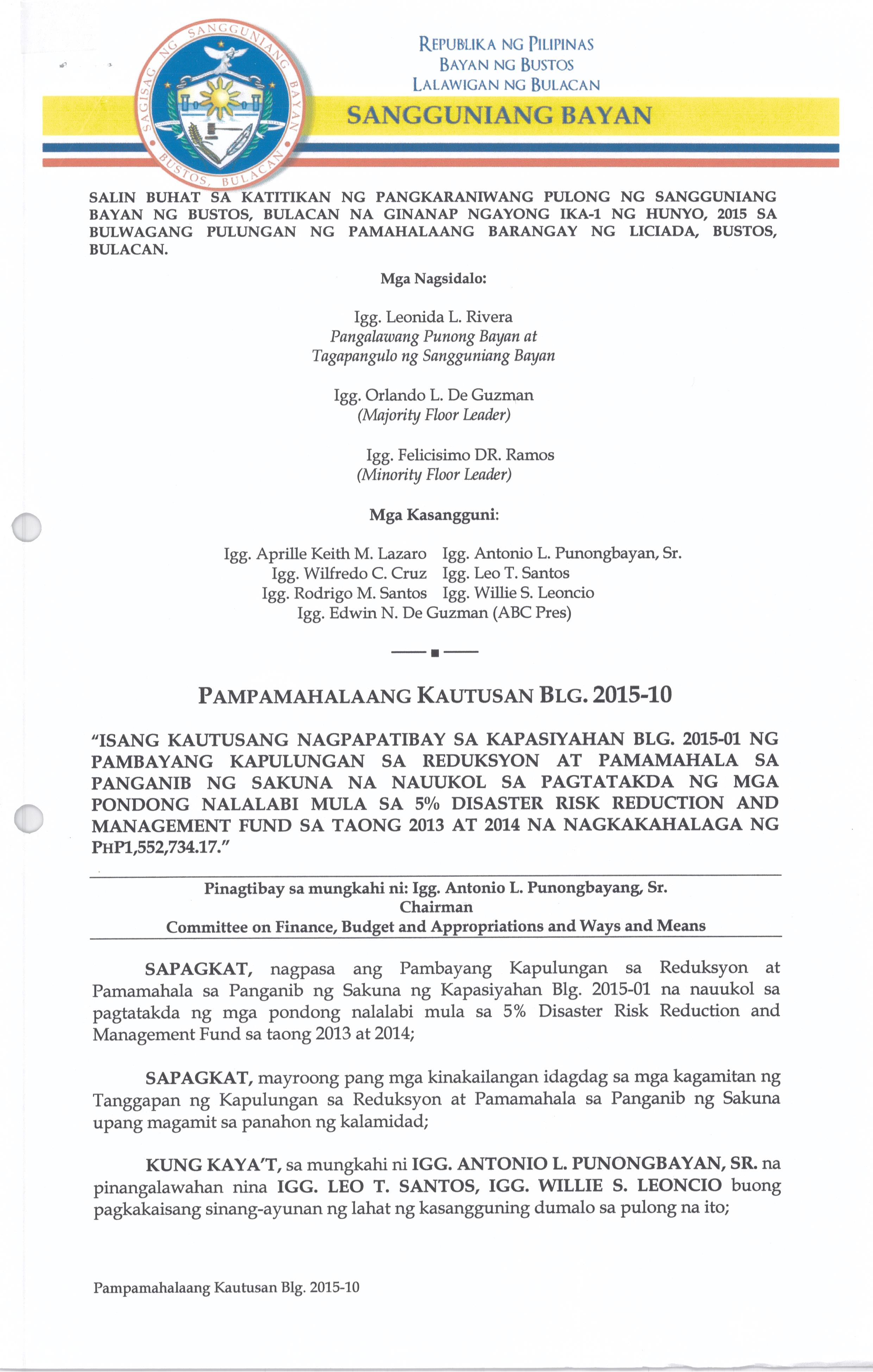 Isang Kautusang Nagpapatibay sa Kapasiyahan Blg. 2015-01 ng Pambayang Kapulungan sa Reduksyon at Pamamahala sa Panganib ng Sakuna na nauukol sa Pagtatakda ng mga PondongNalalabi mula sa 5% Disaster Risk and Reduction and Management Fund sa Taong 2013 at 2014 na nagkakahalaga ng Php. 1,552,734.17.