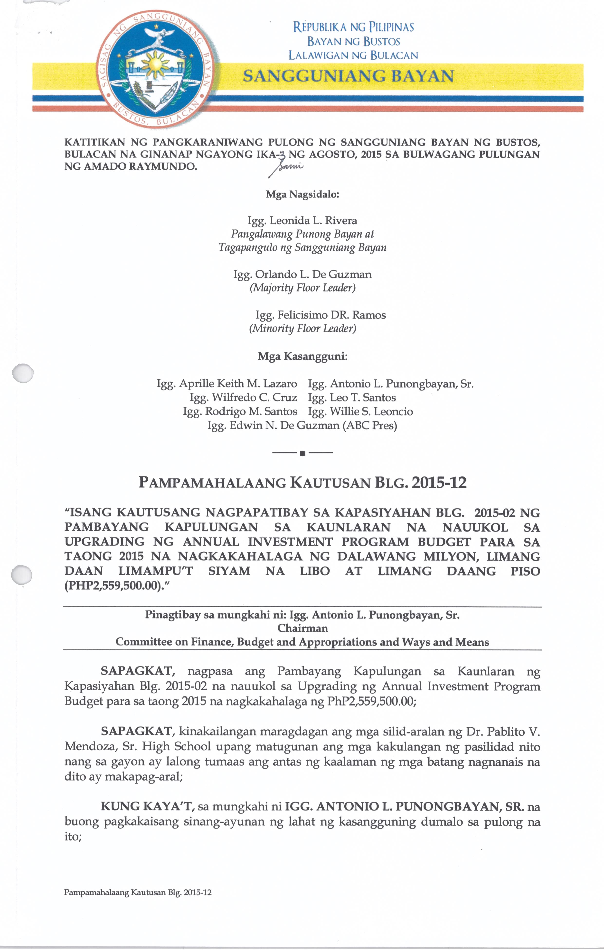 Isang Kautusang Nagpapatibay sa Kapasiyahan Blg. 2015-02 ng Pambayang Kapulungan sa Kaunlaran na nauukol sa Upgrading ng Annual Investment Program Budget para sa Taong 2015 na nagkakahalaga ng Php.2,559,500.00.