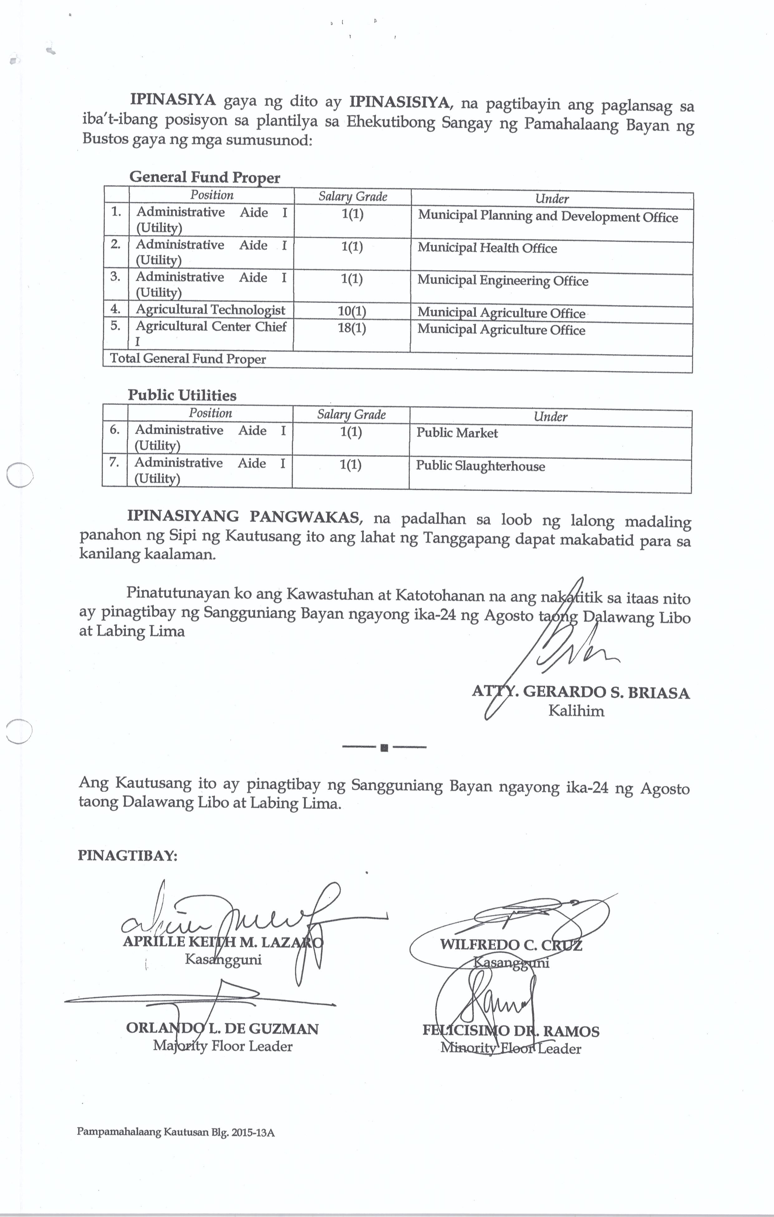 Isang Kautusang nagpapatibay sa Paglikha ng Psisyon na Administrative Aide lll (Driver 1) na may Salary Grade 3(1) at Administrative Aide l (Utility Worker 1 ) na may Salary Grade 1 (1) sa Ilalimn ng tanggapan ng Sangguniang Bayan