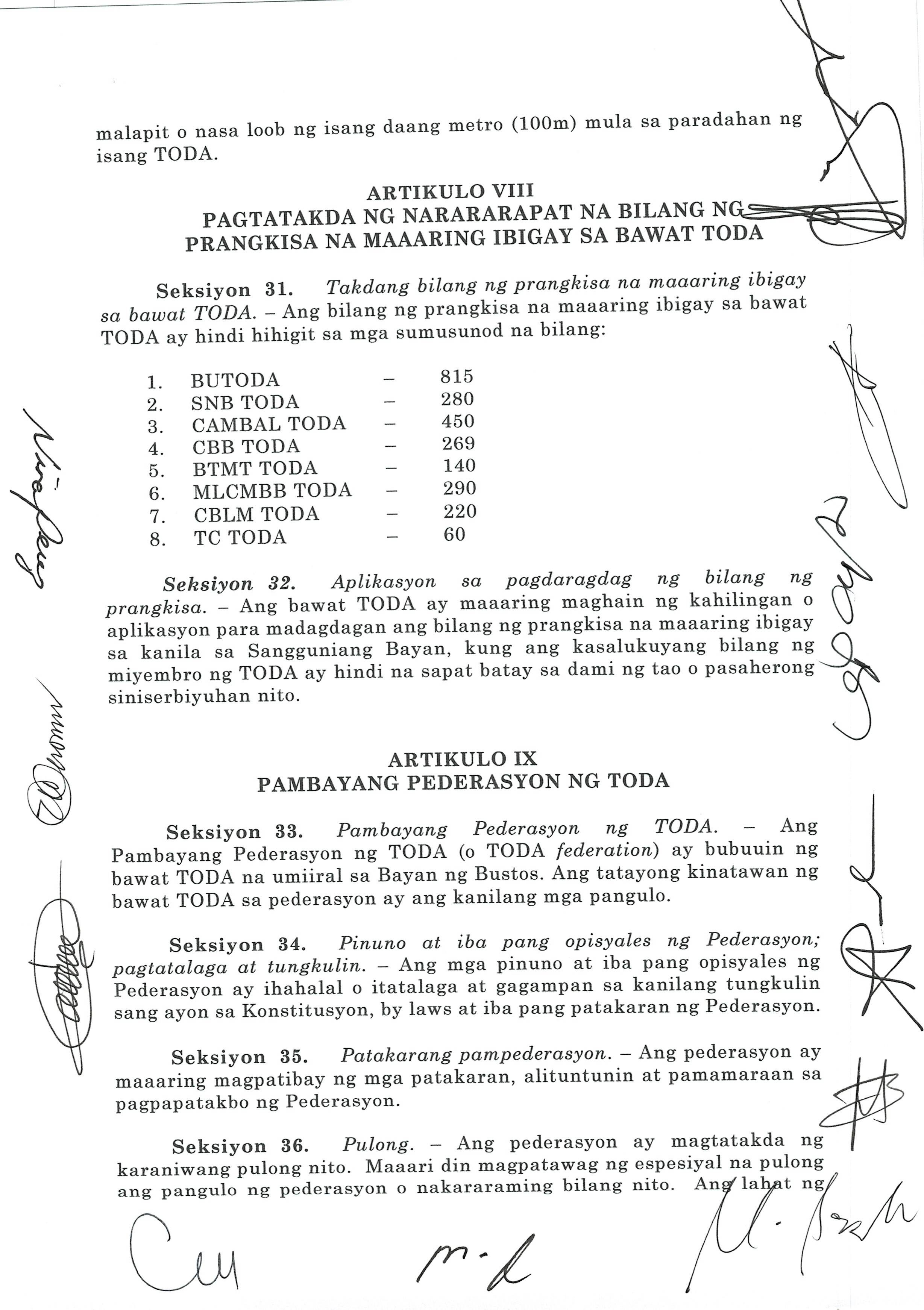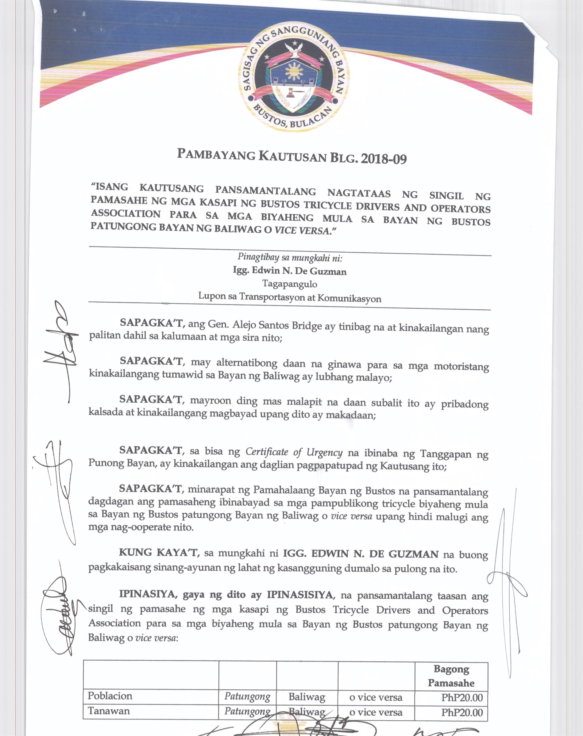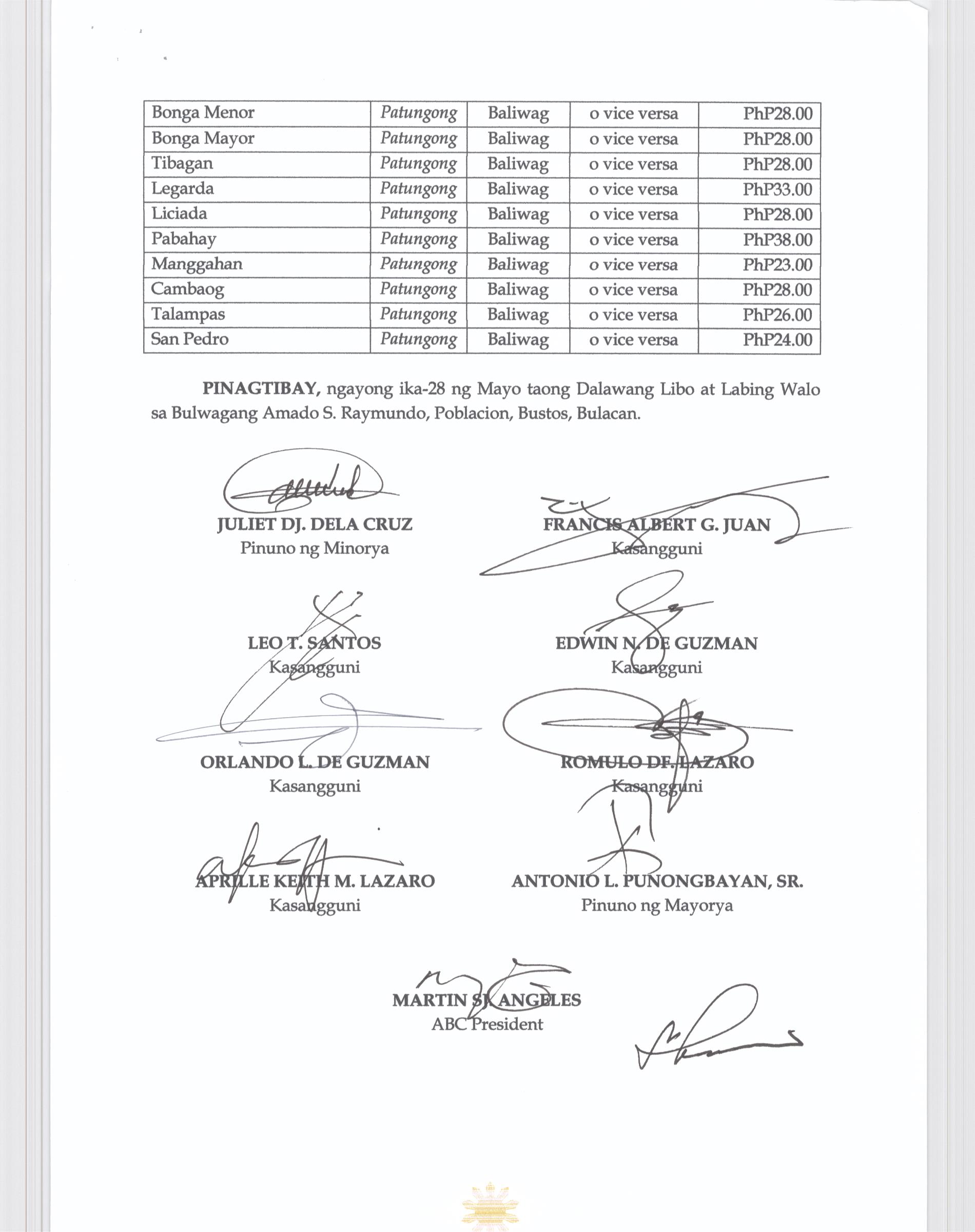 NAGTATAKDA NG BAGONG SINGIL NG PAMASAHE O 'FARE MATRIX' NG MGA MIYEMBRO NG TODA SA BAYAN NG BUSTOS BULACAN