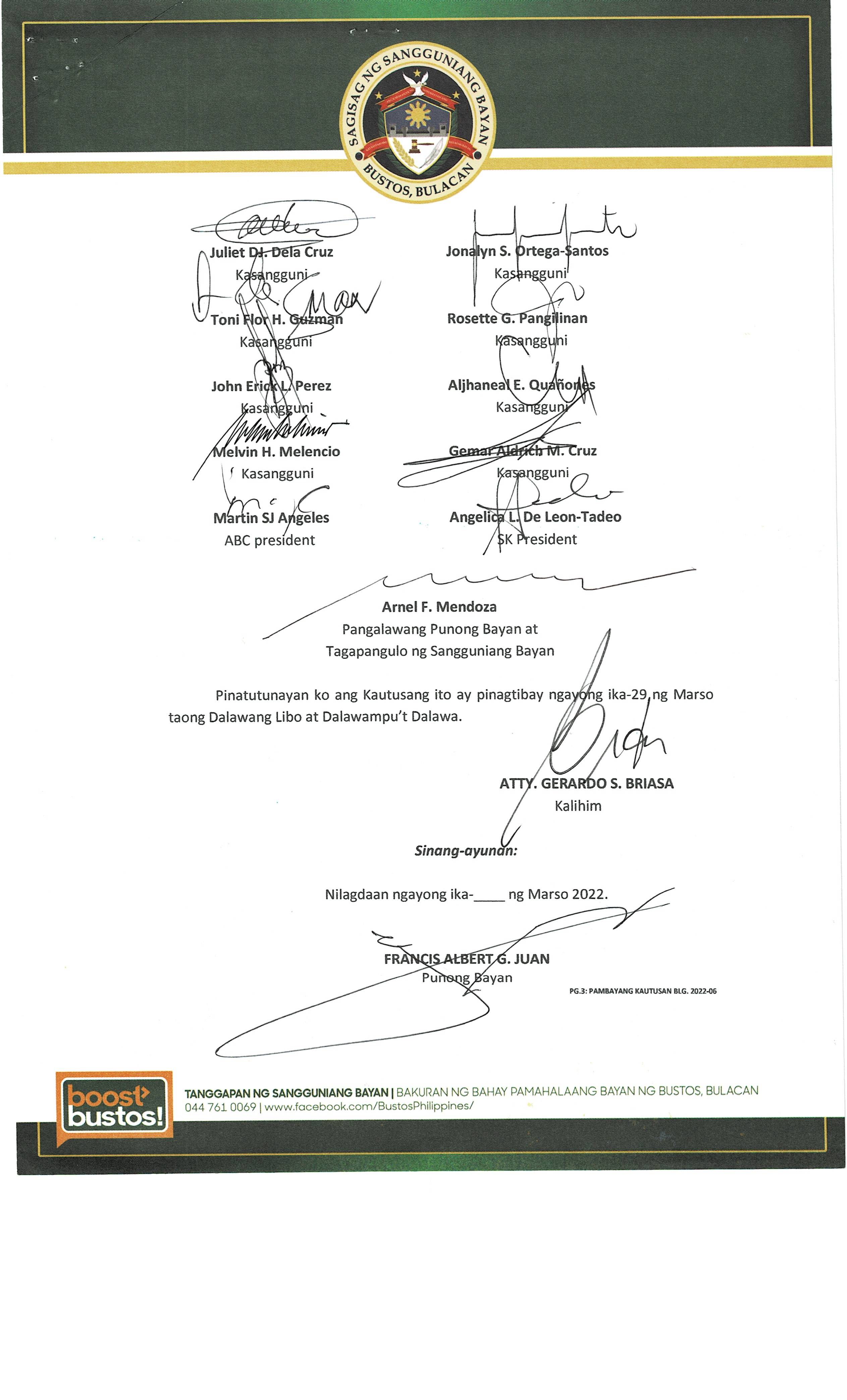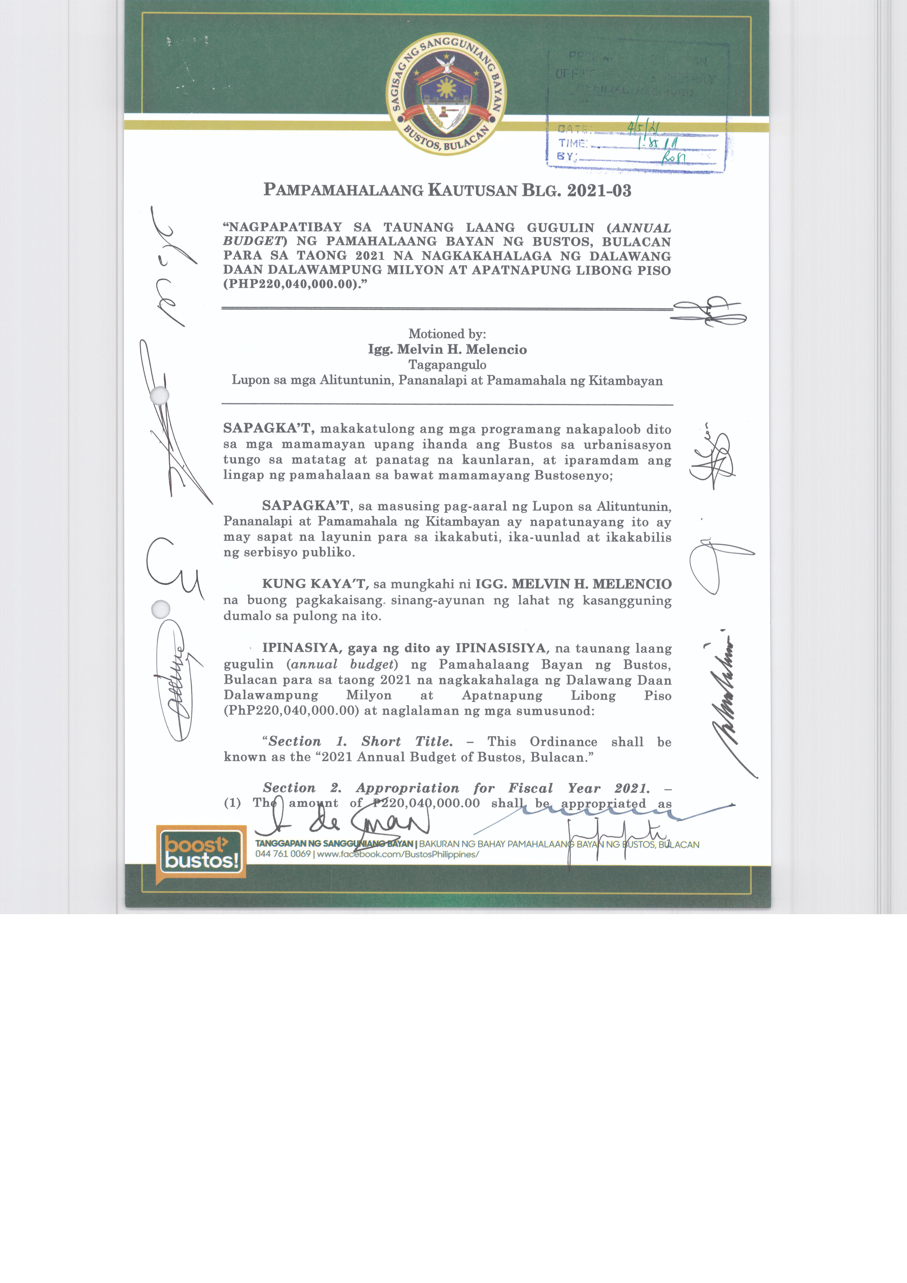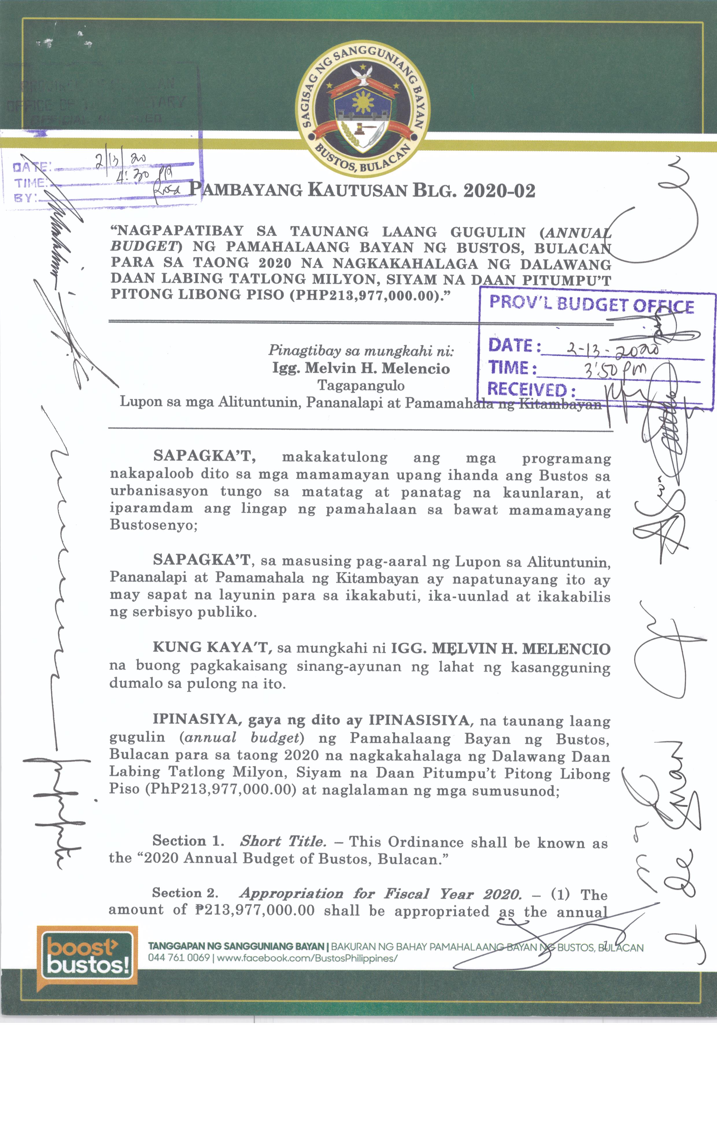 Napapatibay sa taunang laang guguling (annual budget) ng pamahalaang bayan ng bustos, bulacan para sa taong 2023 na nagkakahalaga ng dalawang daan pit...