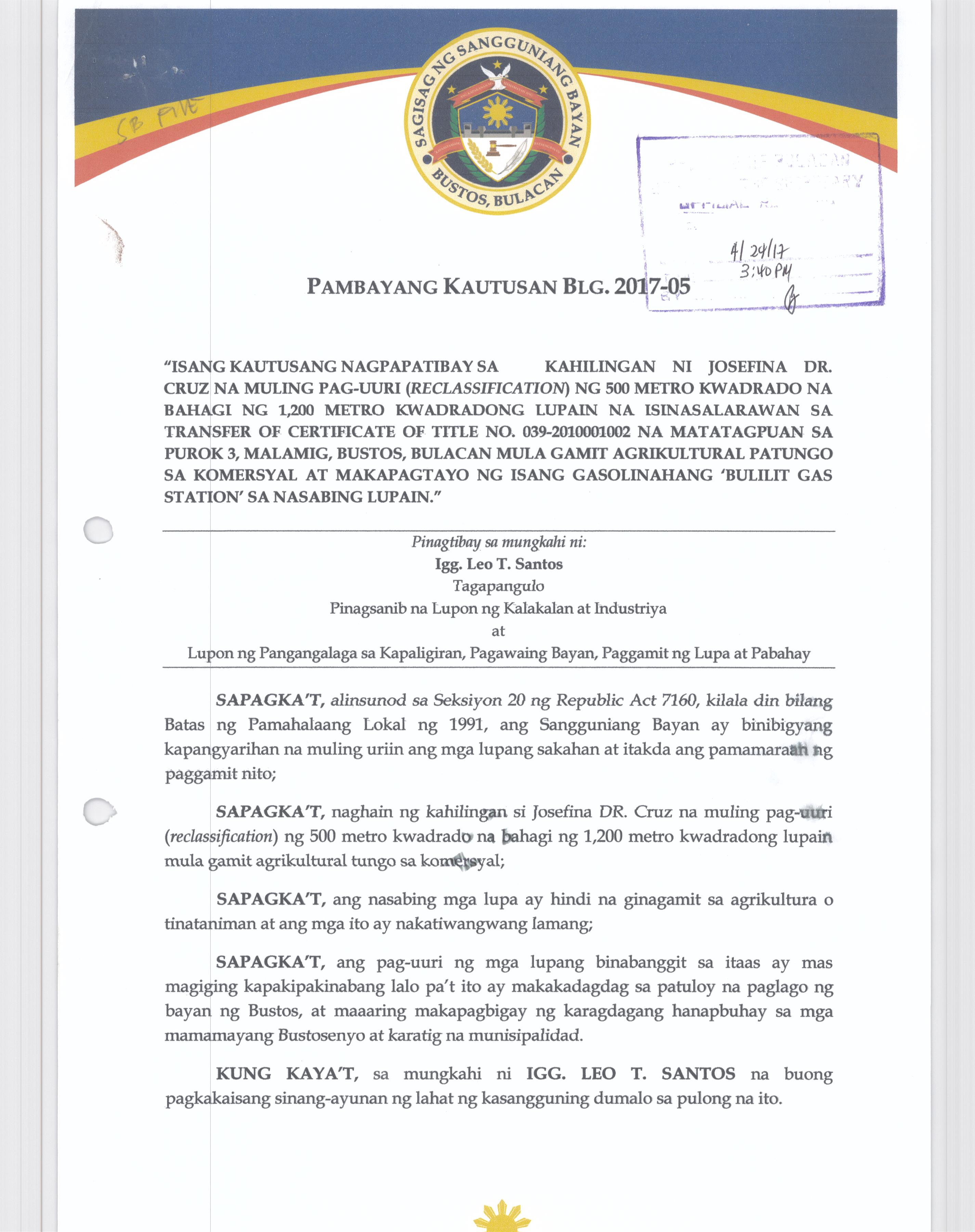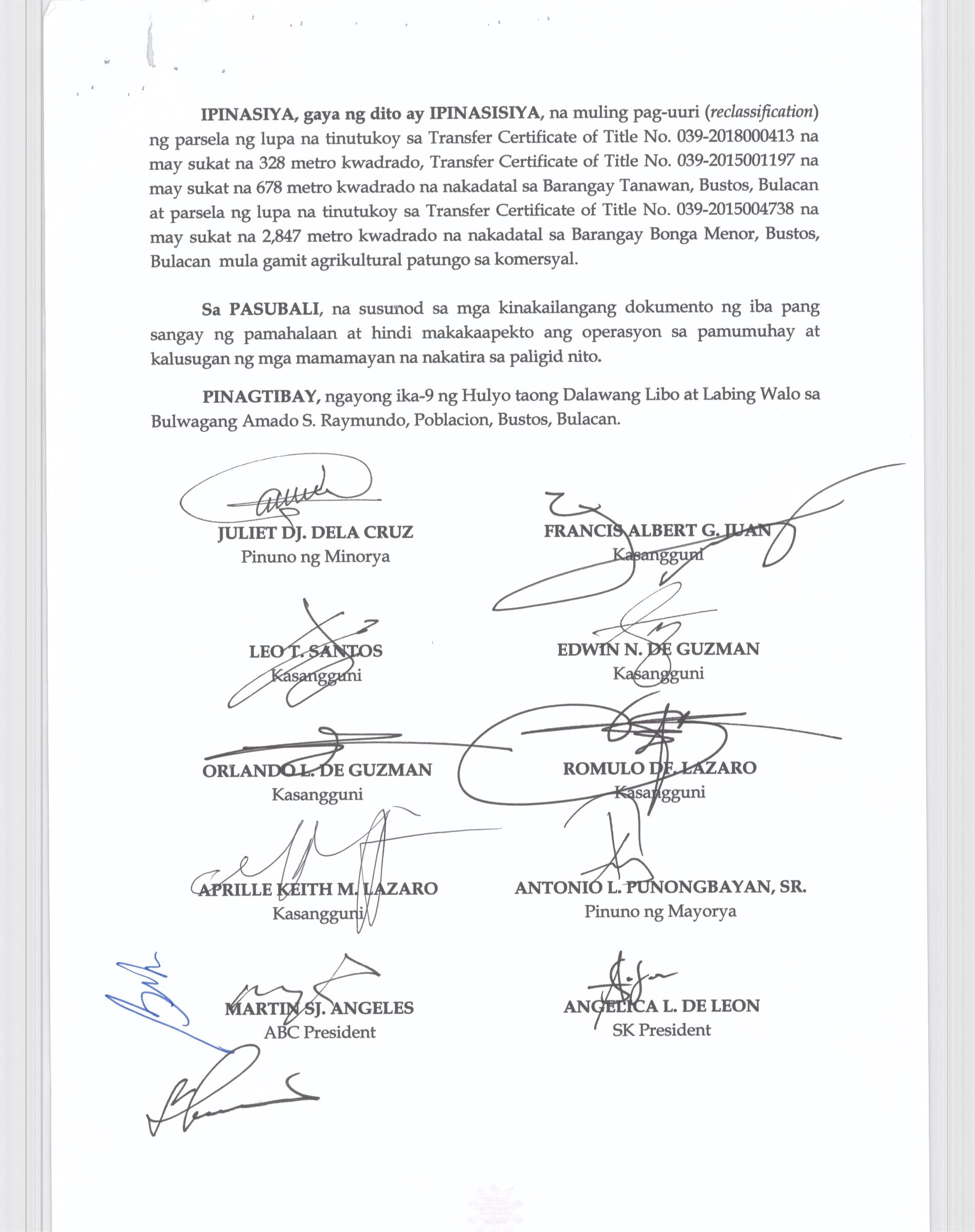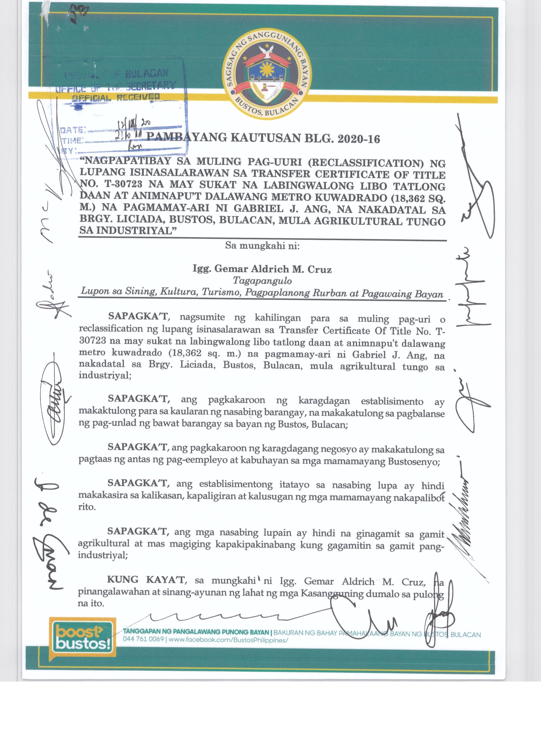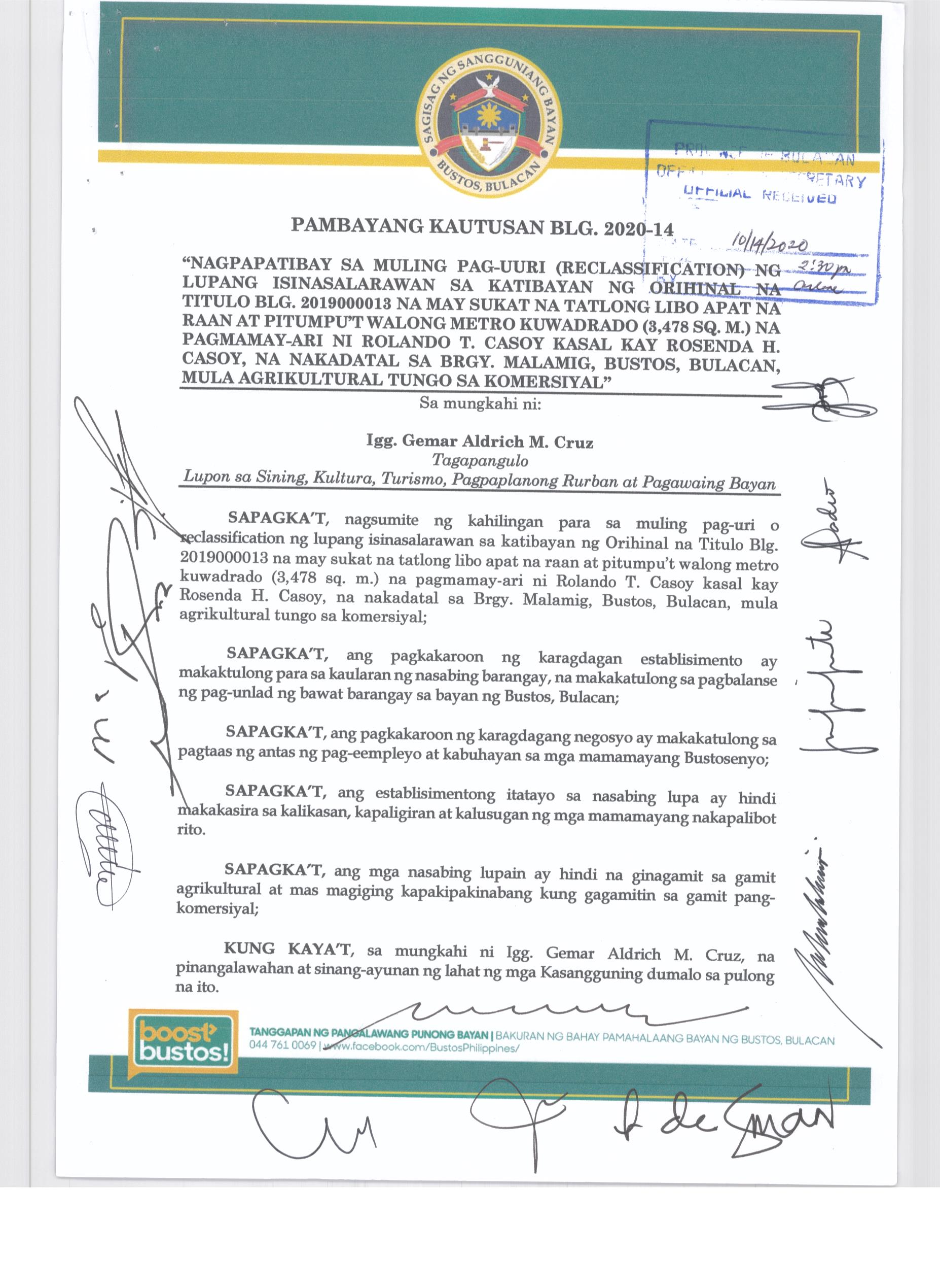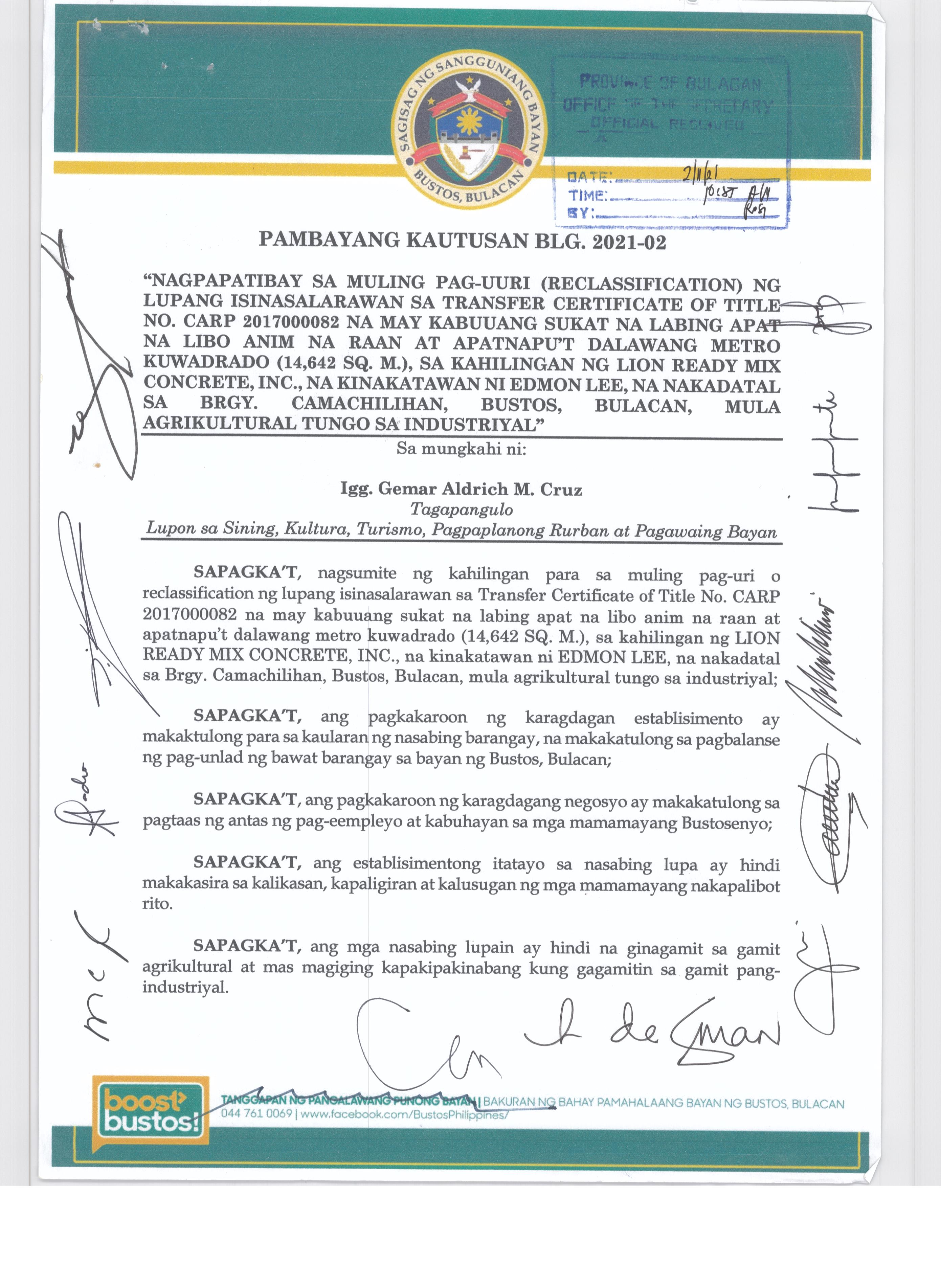 Pambayang Kautusang nagpapatibay sa kahilingan ni G. Adrian G. Santiago na muling pag-uuri ng lupa sa Barangay Bonga Menor Bustos Bulacan na may sukat na 2 ektarya buhat sa kabuuangsukat na 4.3 ektarya na isinasalarawan sa Transfer Certificate Title No. 039-2016006393 (LOT 4-A of the Subd. Plan PSD-03-177744)