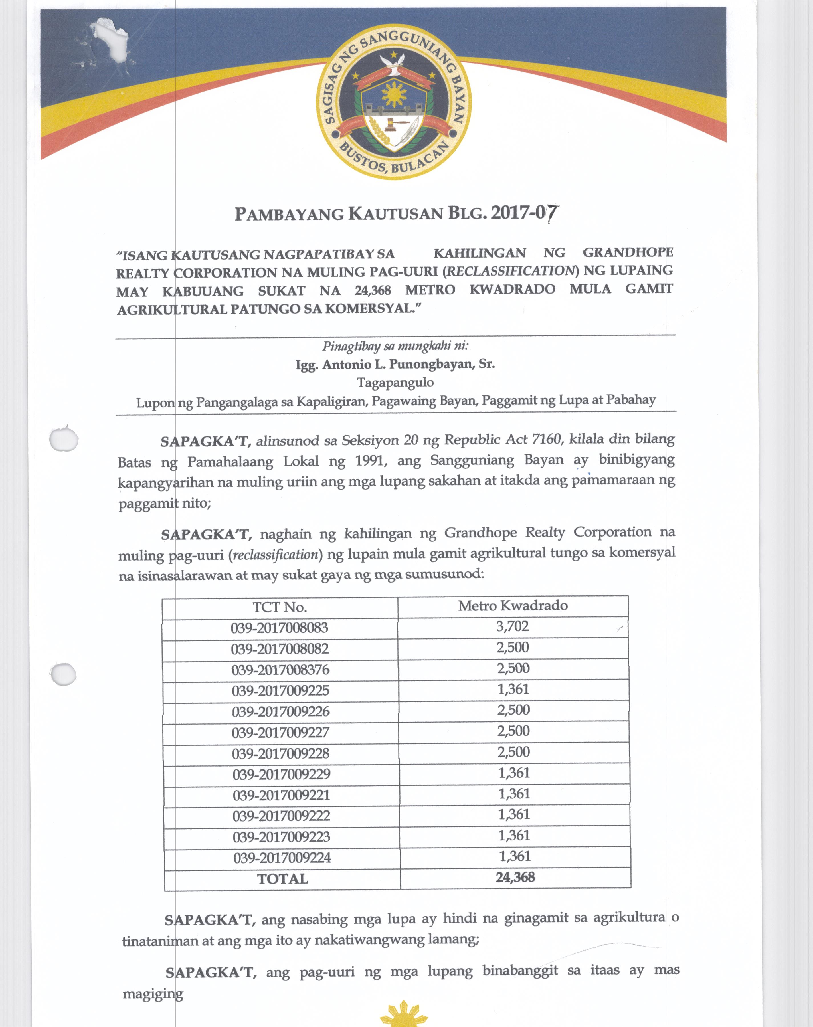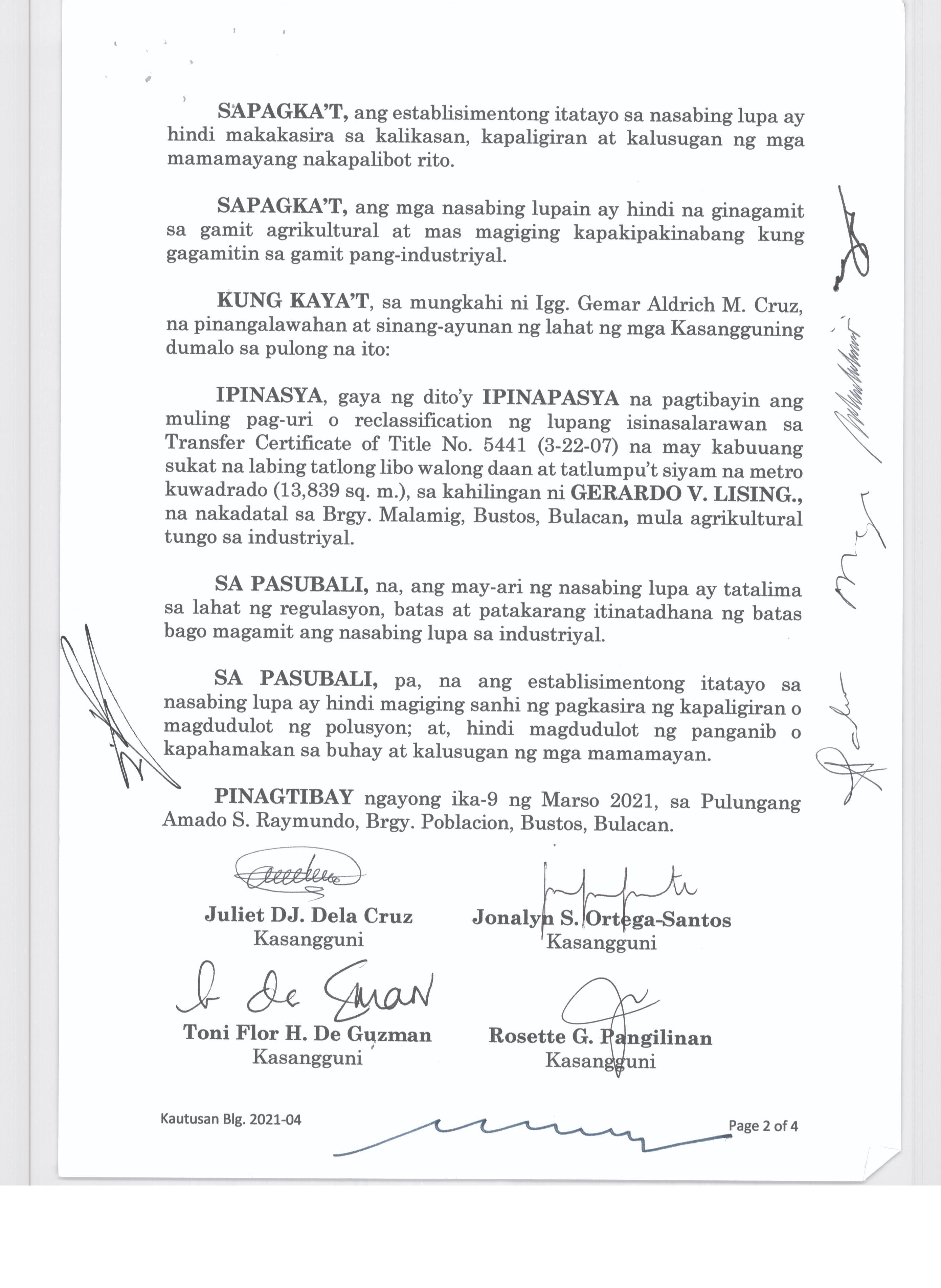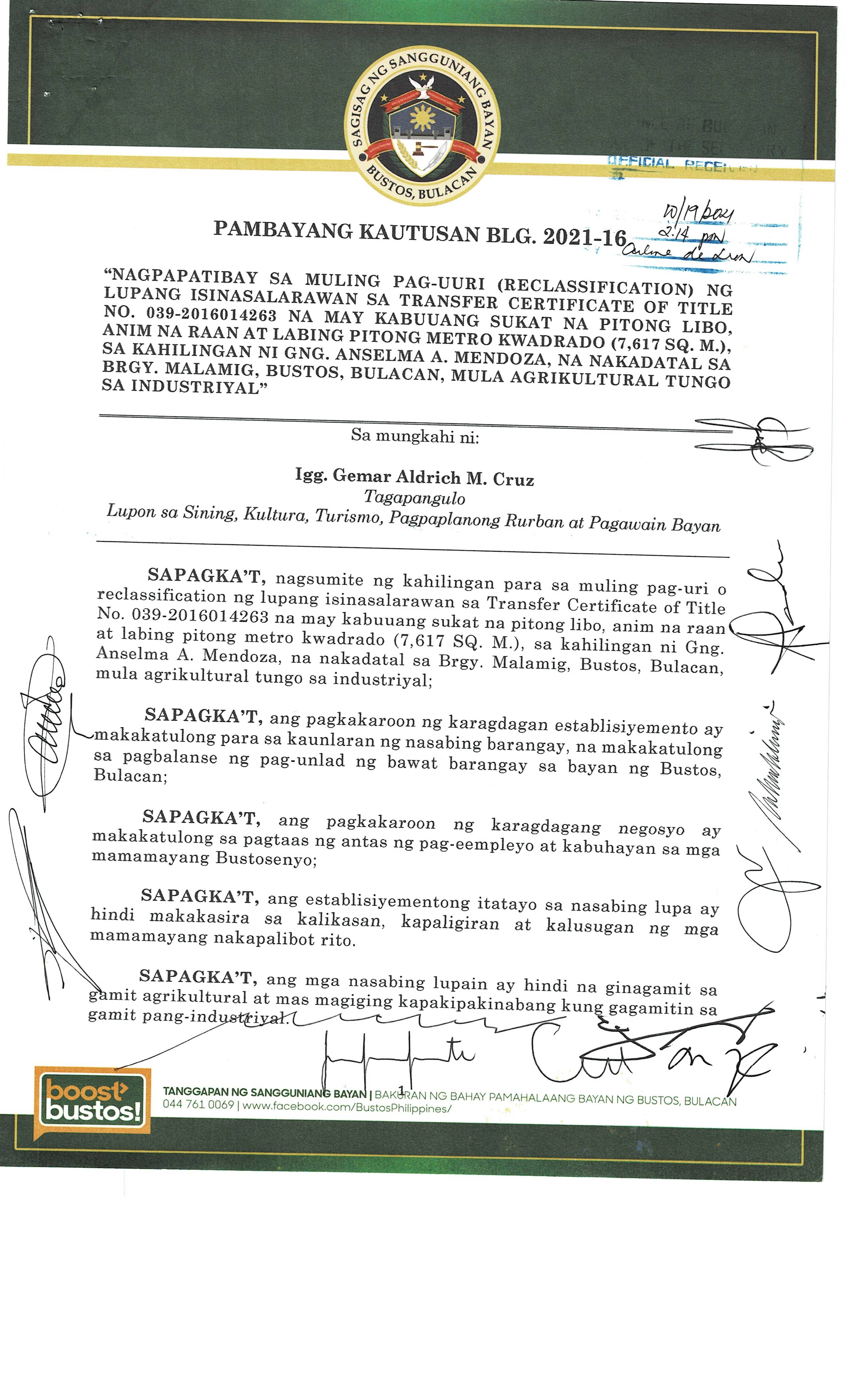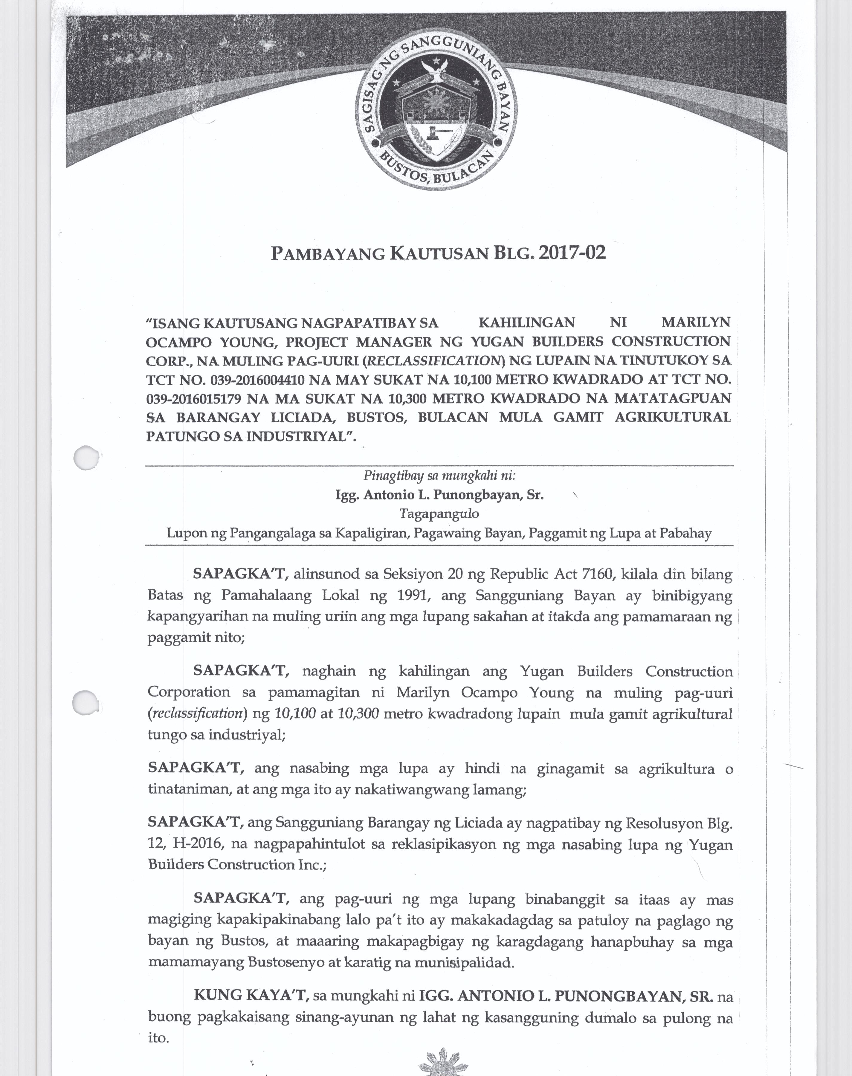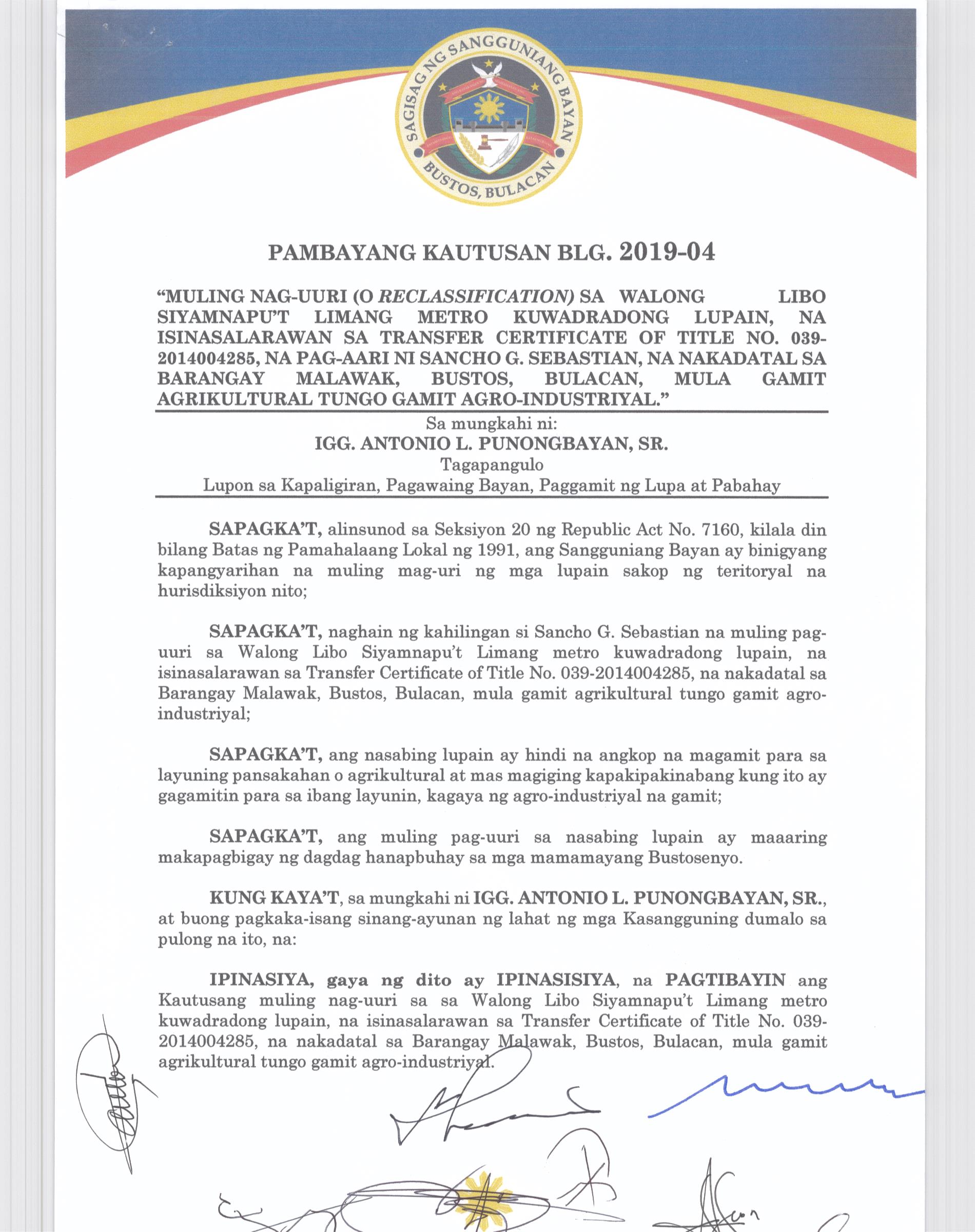 Pambayang Kautusang nagpapatibay sa kahilingan ni G. Adrian G. Santiago na muling pag-uuri ng lupa sa Barangay Bonga Menor Bustos Bulacan na may sukat na 2 ektarya buhat sa kabuuangsukat na 4.3 ektarya na isinasalarawan sa Transfer Certificate Title No. 039-2016006393 (LOT 4-A of the Subd. Plan PSD-03-177744)