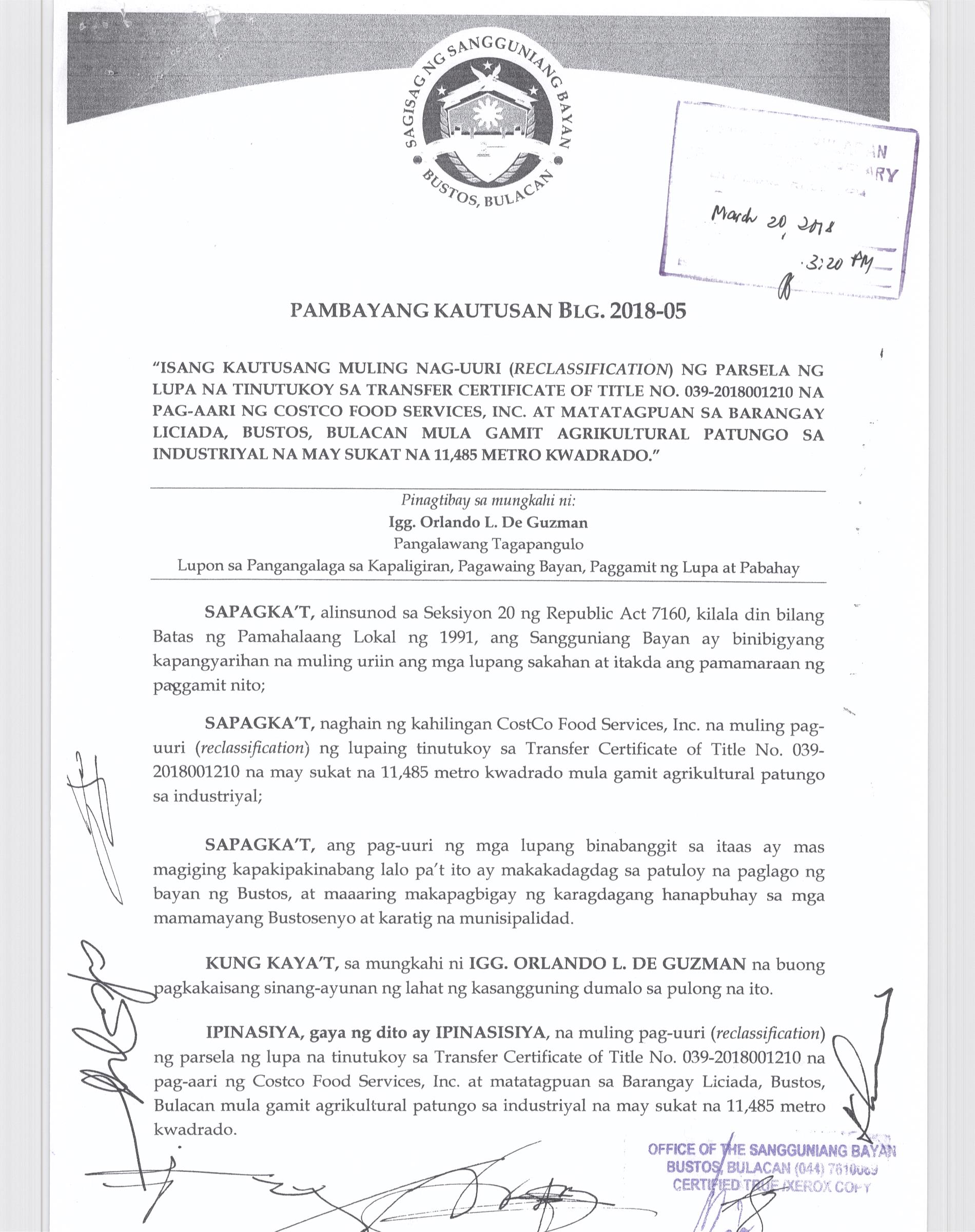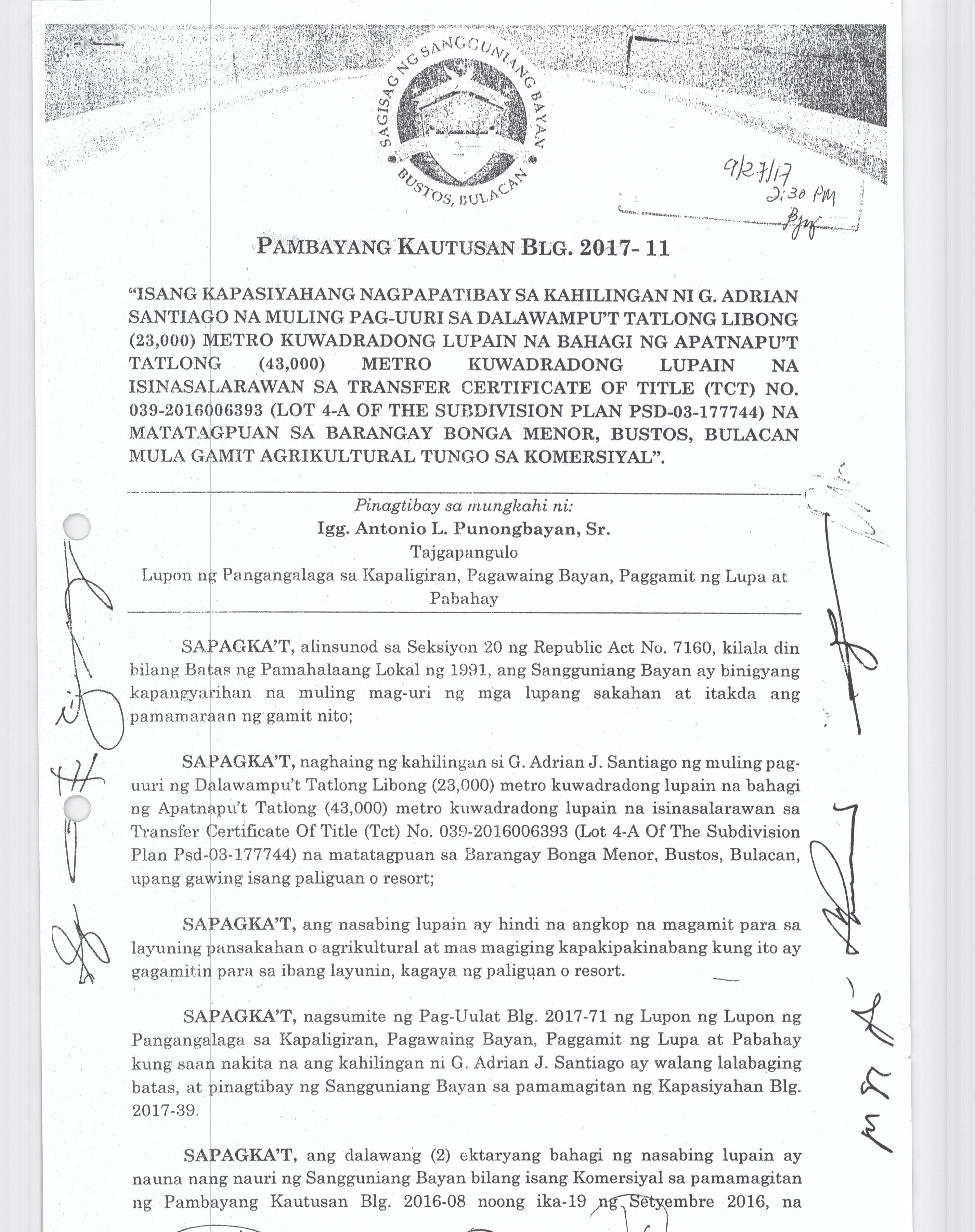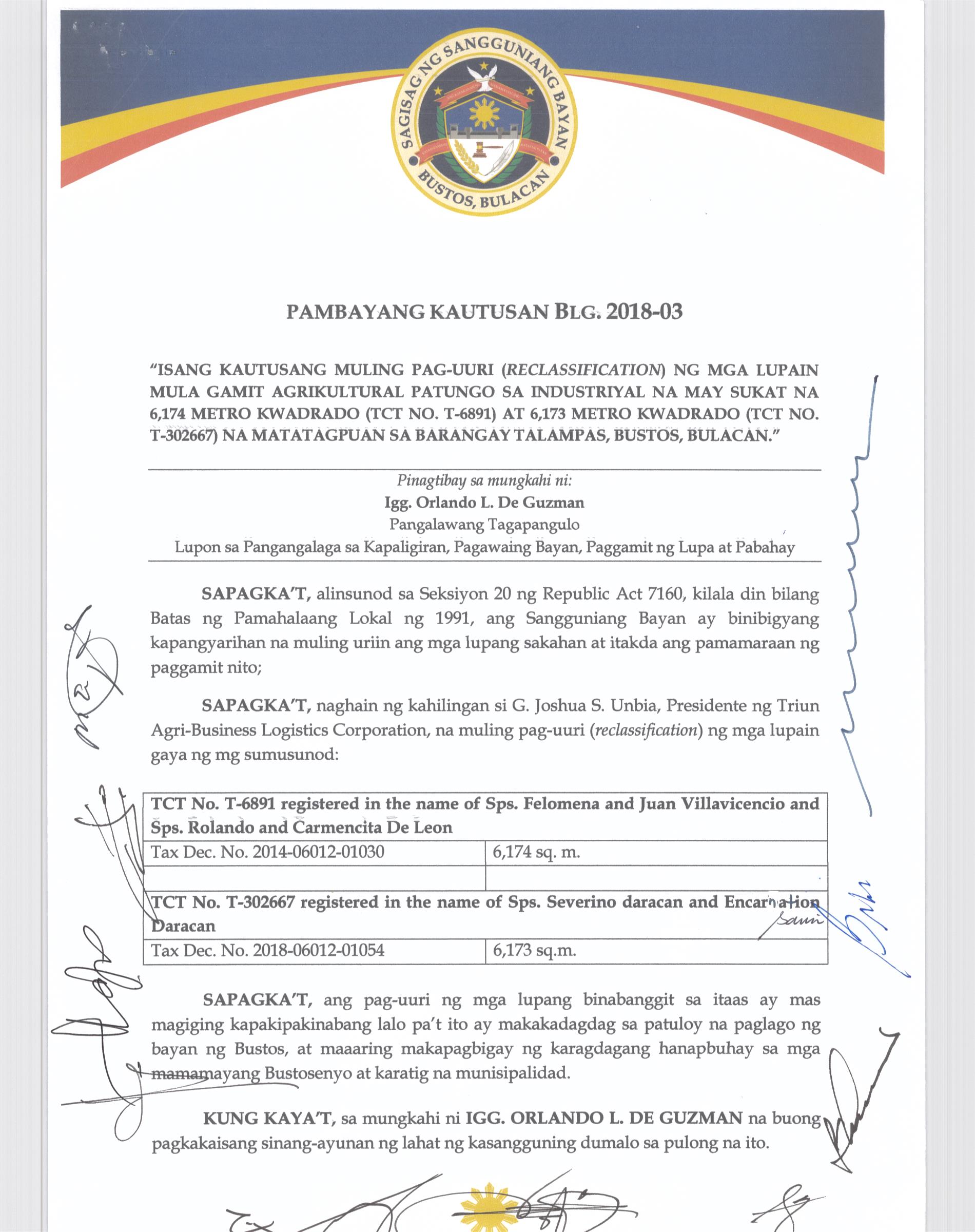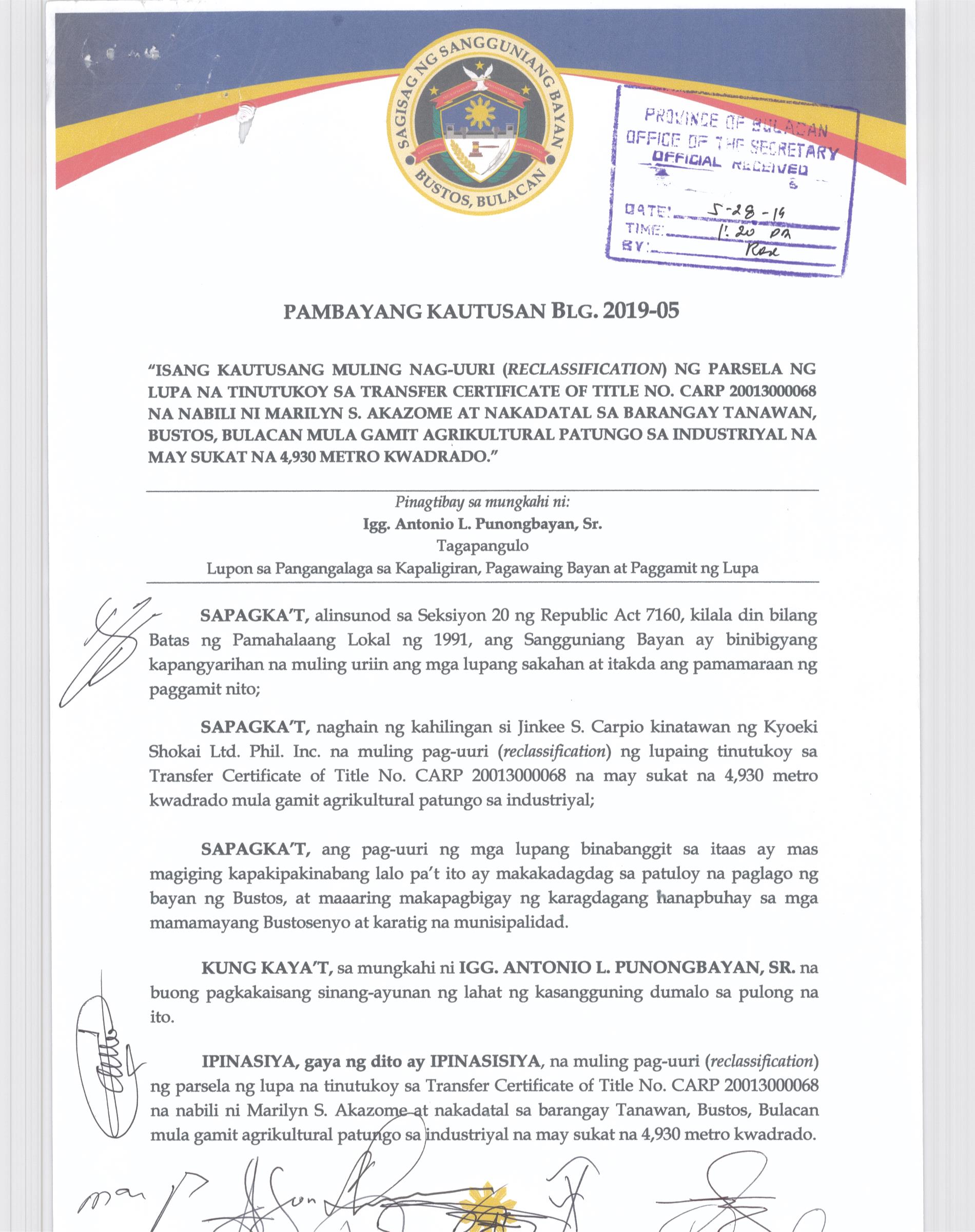 Pambayang Kautusang nagpapatibay sa kahilingan ni G. Adrian G. Santiago na muling pag-uuri ng lupa sa Barangay Bonga Menor Bustos Bulacan na may sukat na 2 ektarya buhat sa kabuuangsukat na 4.3 ektarya na isinasalarawan sa Transfer Certificate Title No. 039-2016006393 (LOT 4-A of the Subd. Plan PSD-03-177744)