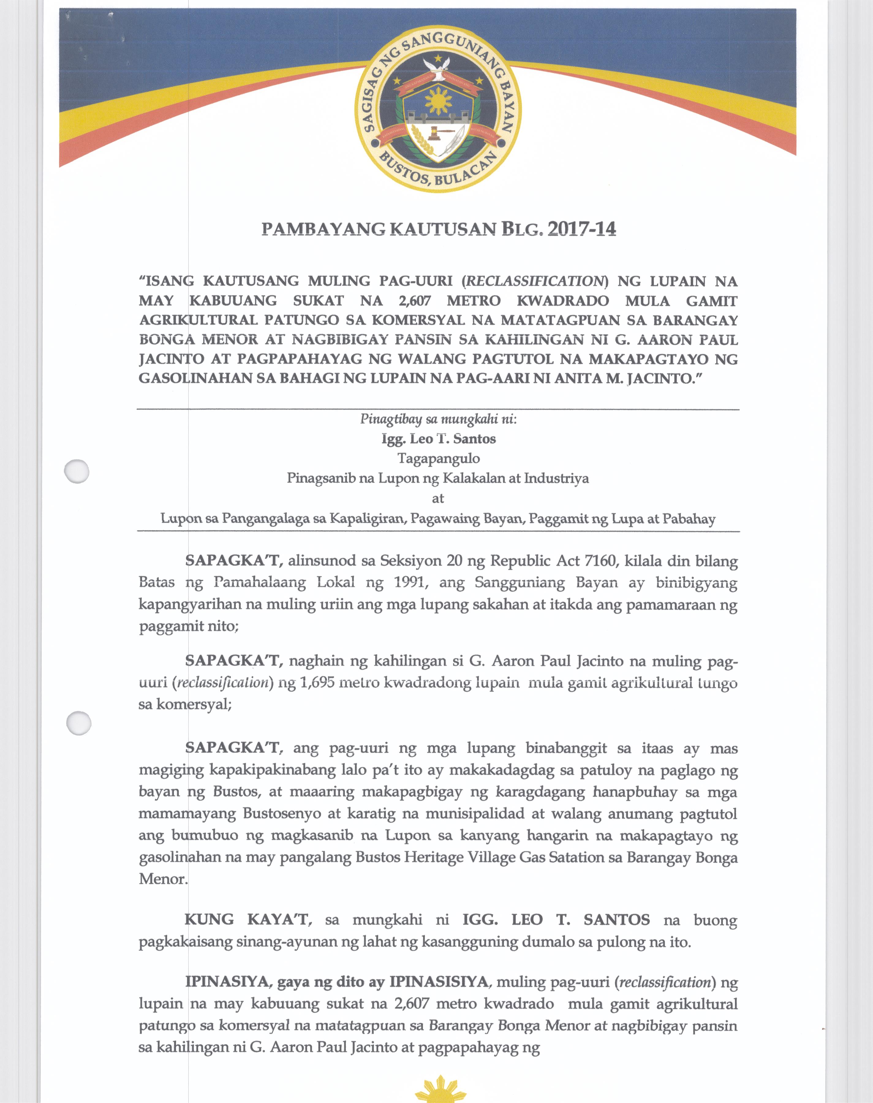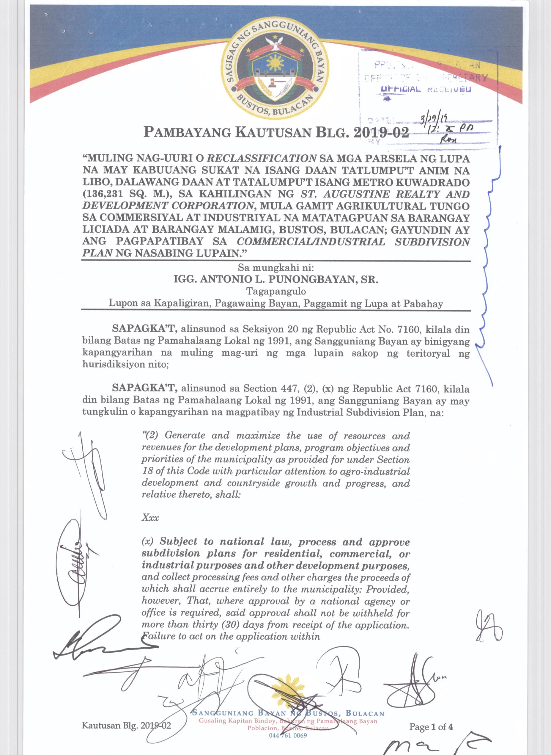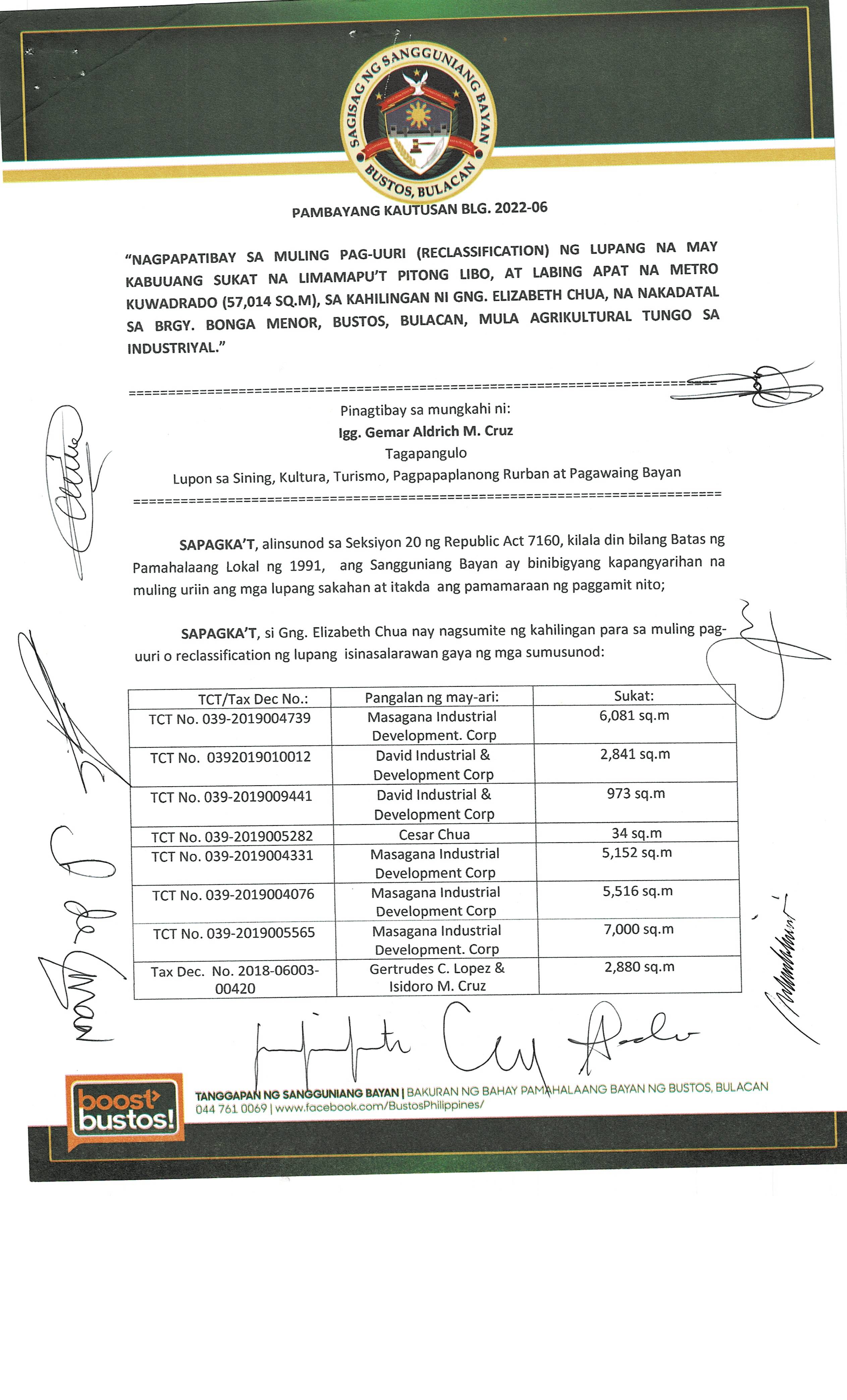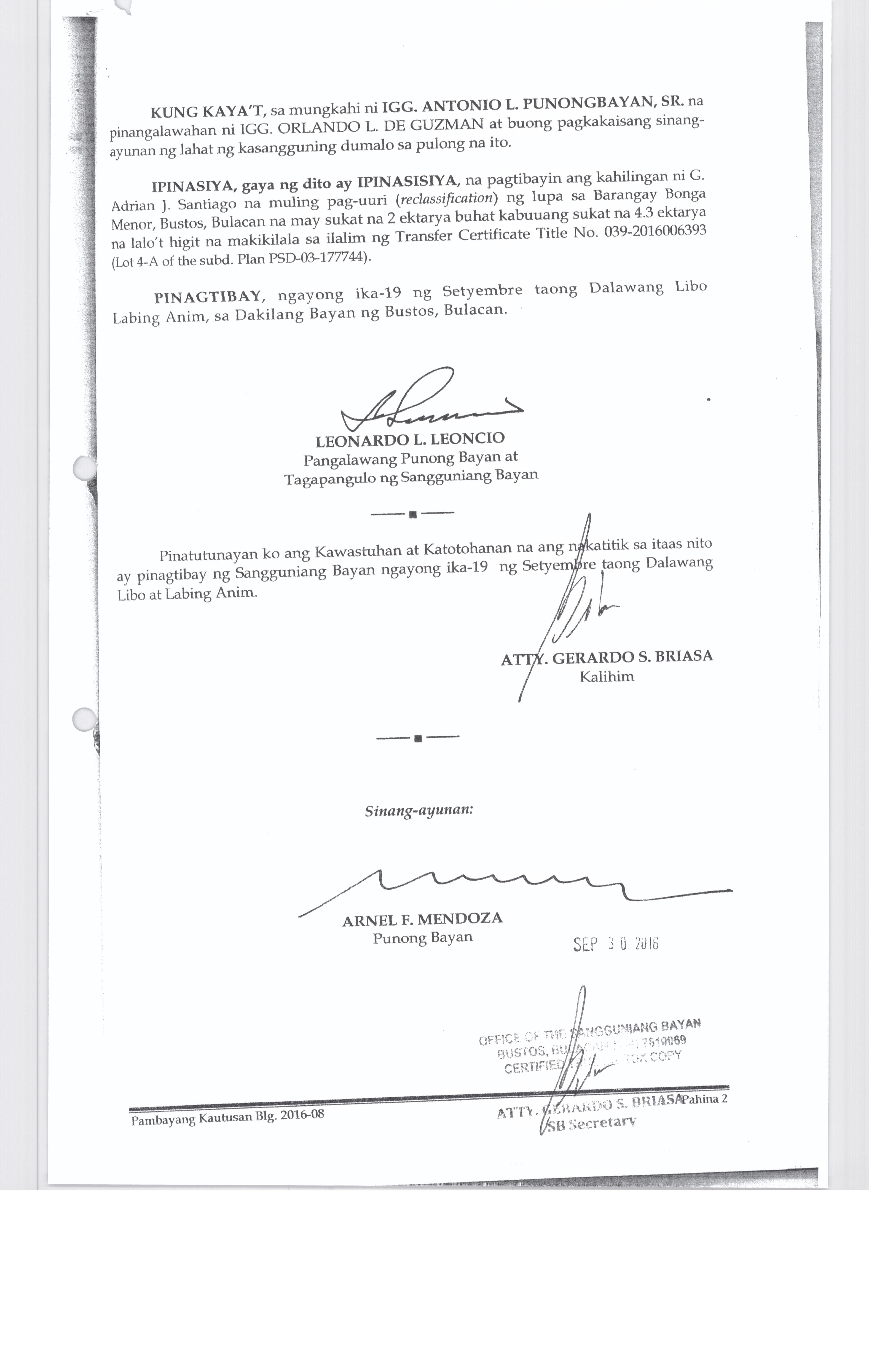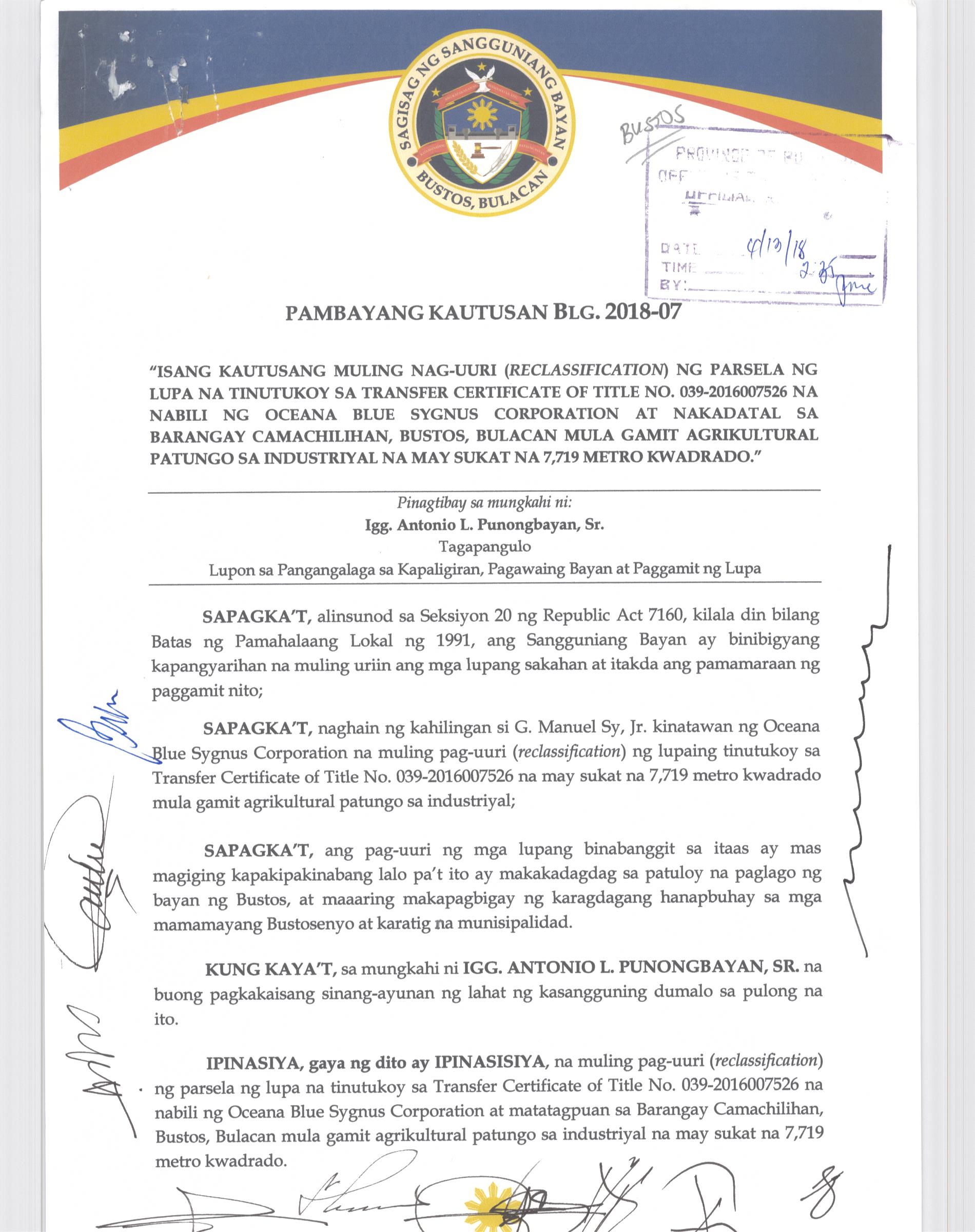 Pambayang Kautusang nagpapatibay sa kahilingan ni G. Adrian G. Santiago na muling pag-uuri ng lupa sa Barangay Bonga Menor Bustos Bulacan na may sukat na 2 ektarya buhat sa kabuuangsukat na 4.3 ektarya na isinasalarawan sa Transfer Certificate Title No. 039-2016006393 (LOT 4-A of the Subd. Plan PSD-03-177744)