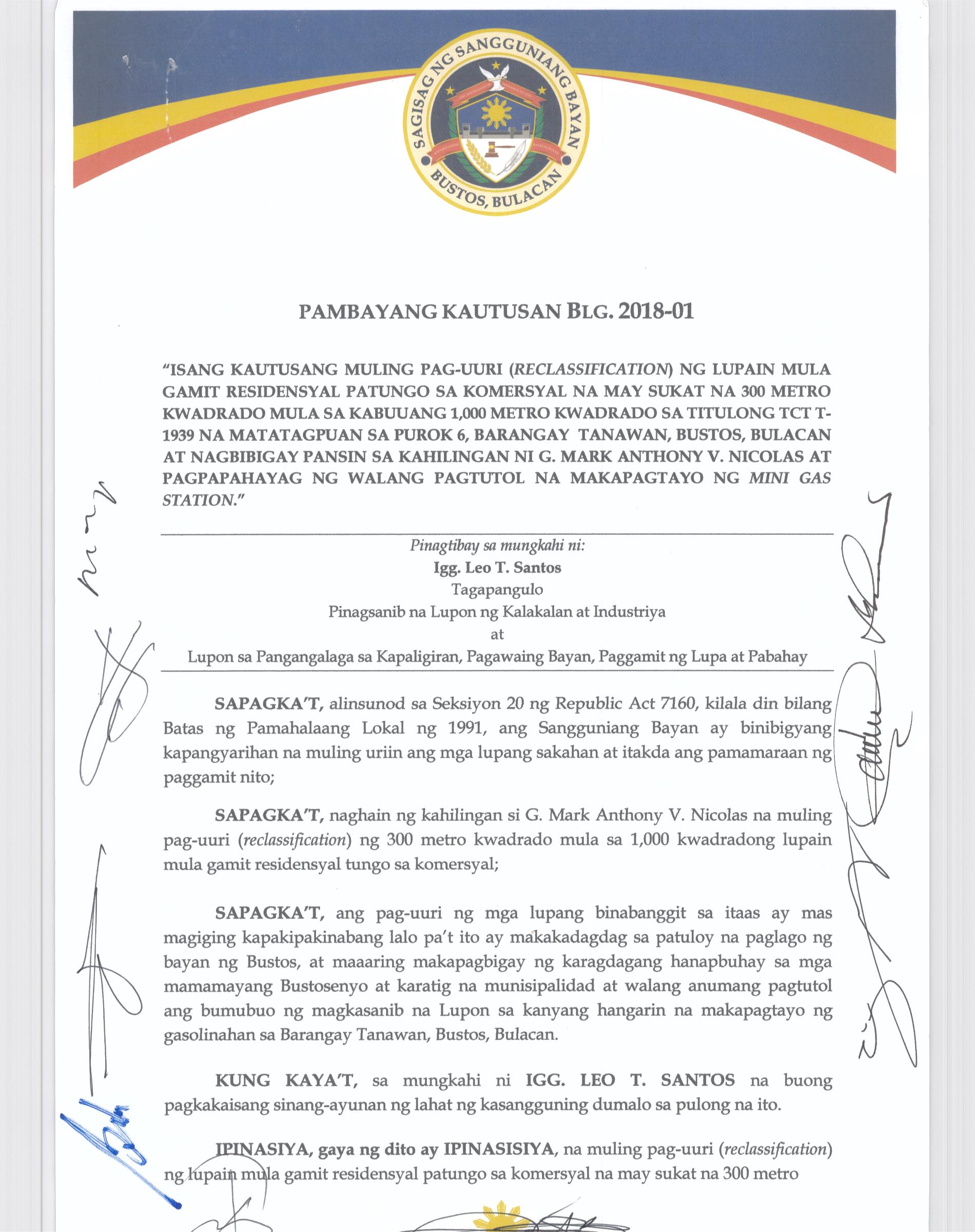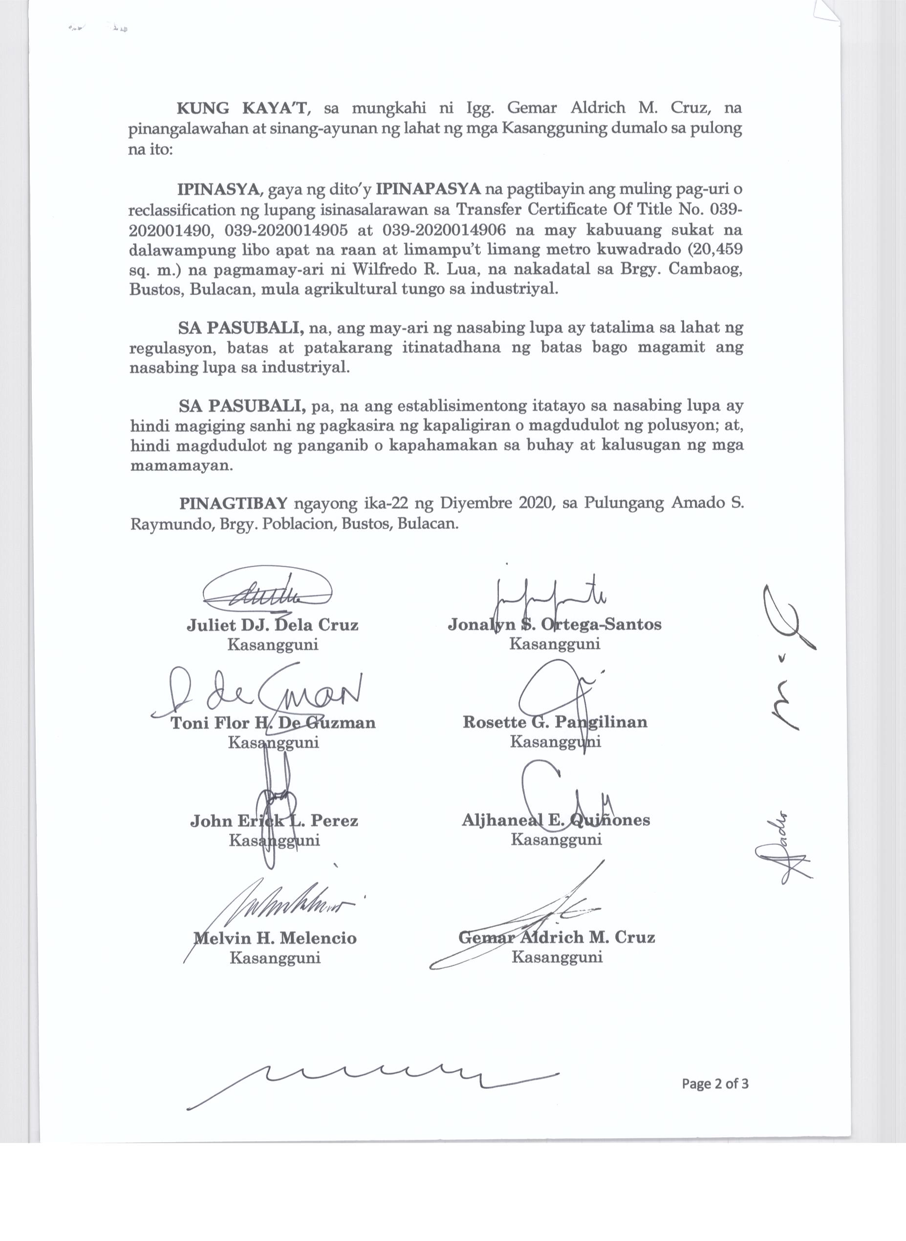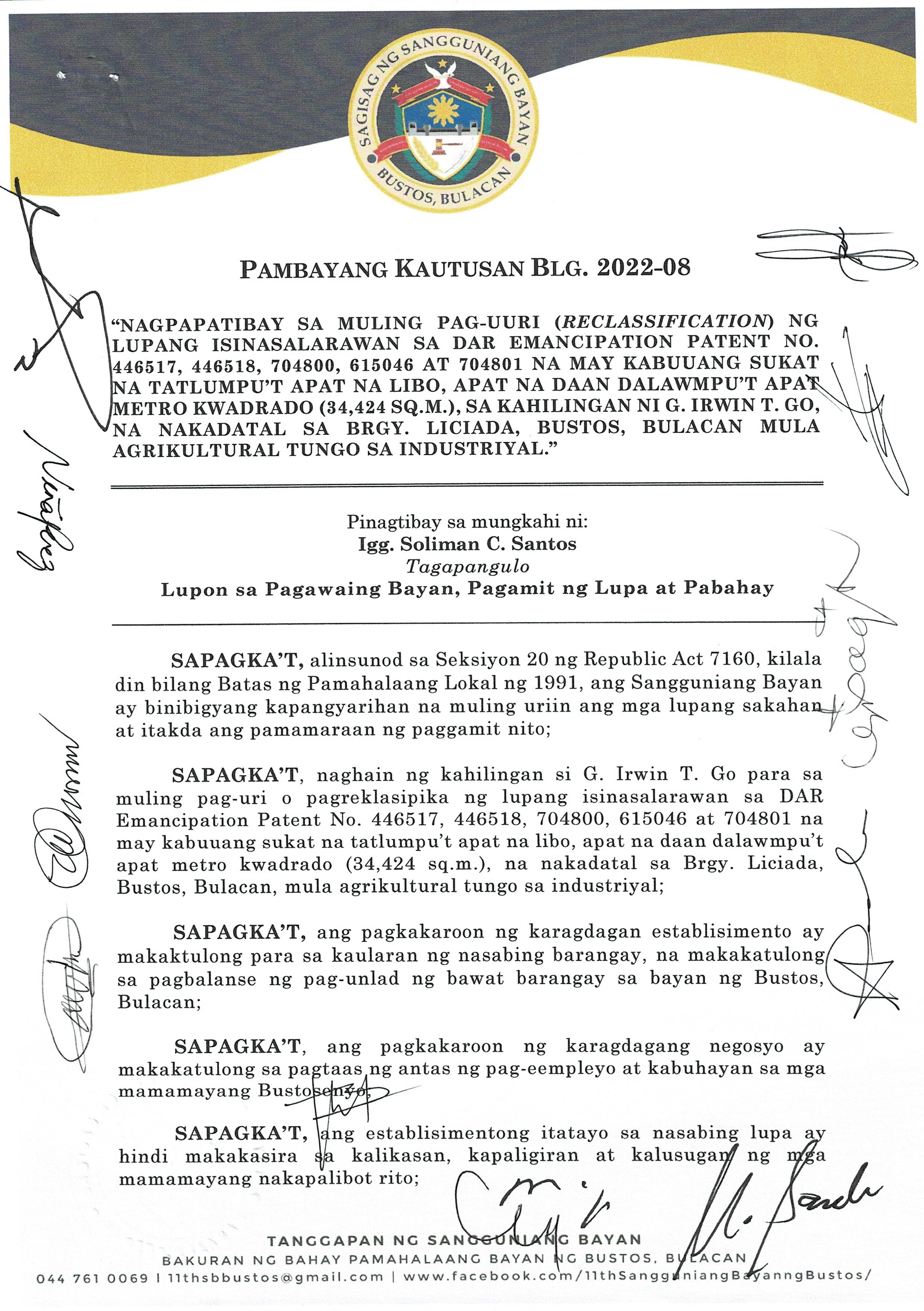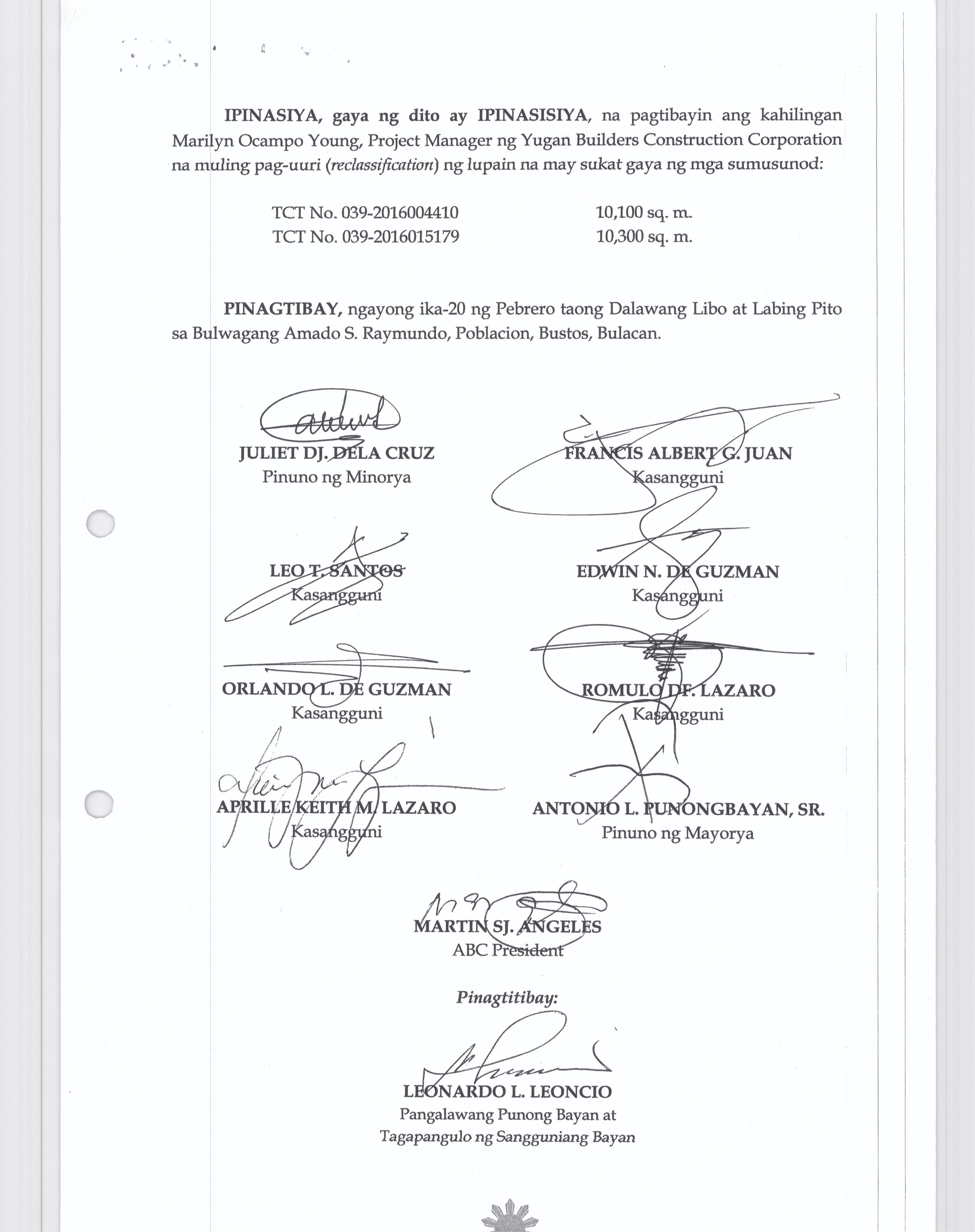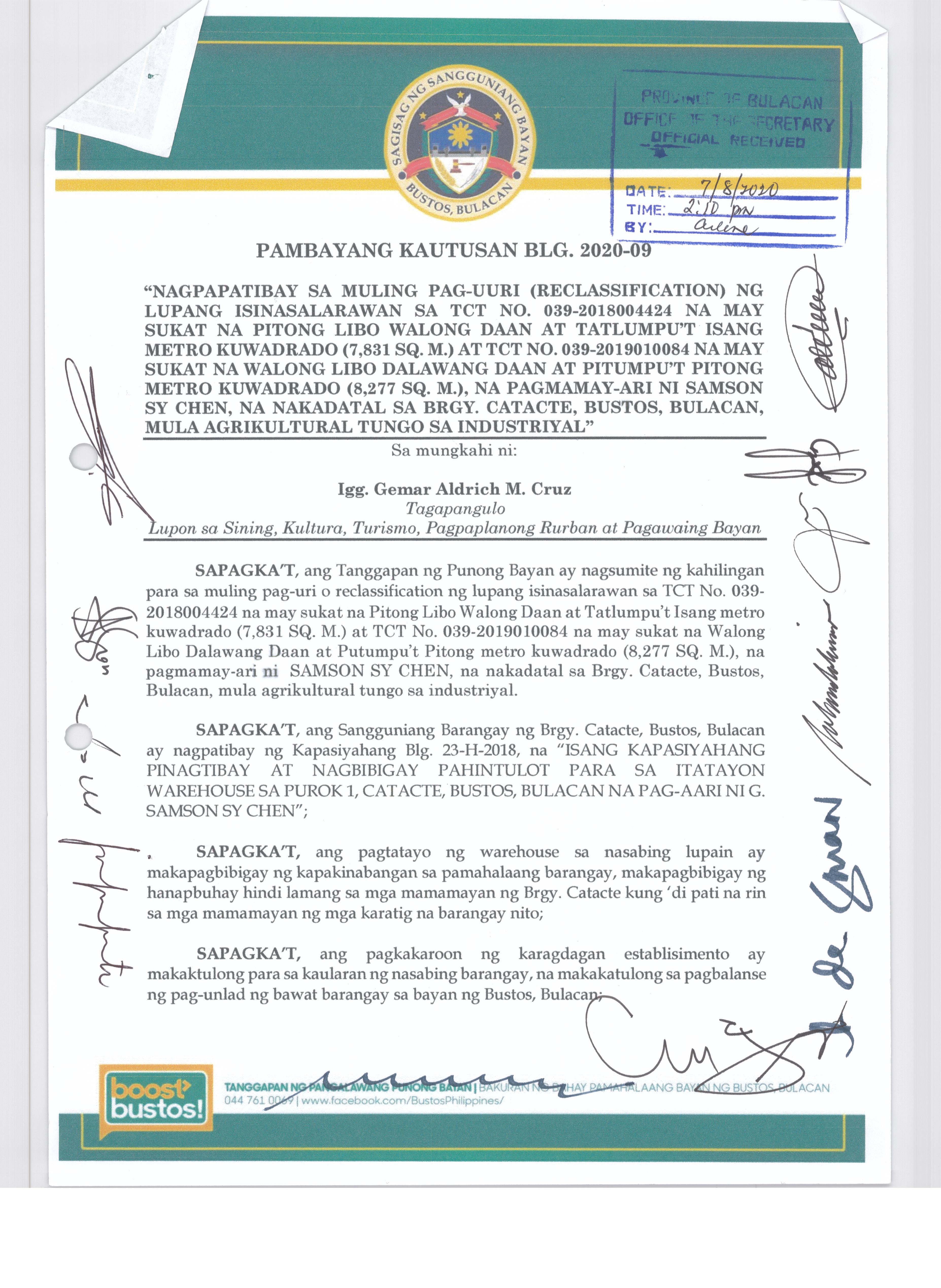 Pambayang Kautusang nagpapatibay sa kahilingan ni G. Adrian G. Santiago na muling pag-uuri ng lupa sa Barangay Bonga Menor Bustos Bulacan na may sukat na 2 ektarya buhat sa kabuuangsukat na 4.3 ektarya na isinasalarawan sa Transfer Certificate Title No. 039-2016006393 (LOT 4-A of the Subd. Plan PSD-03-177744)