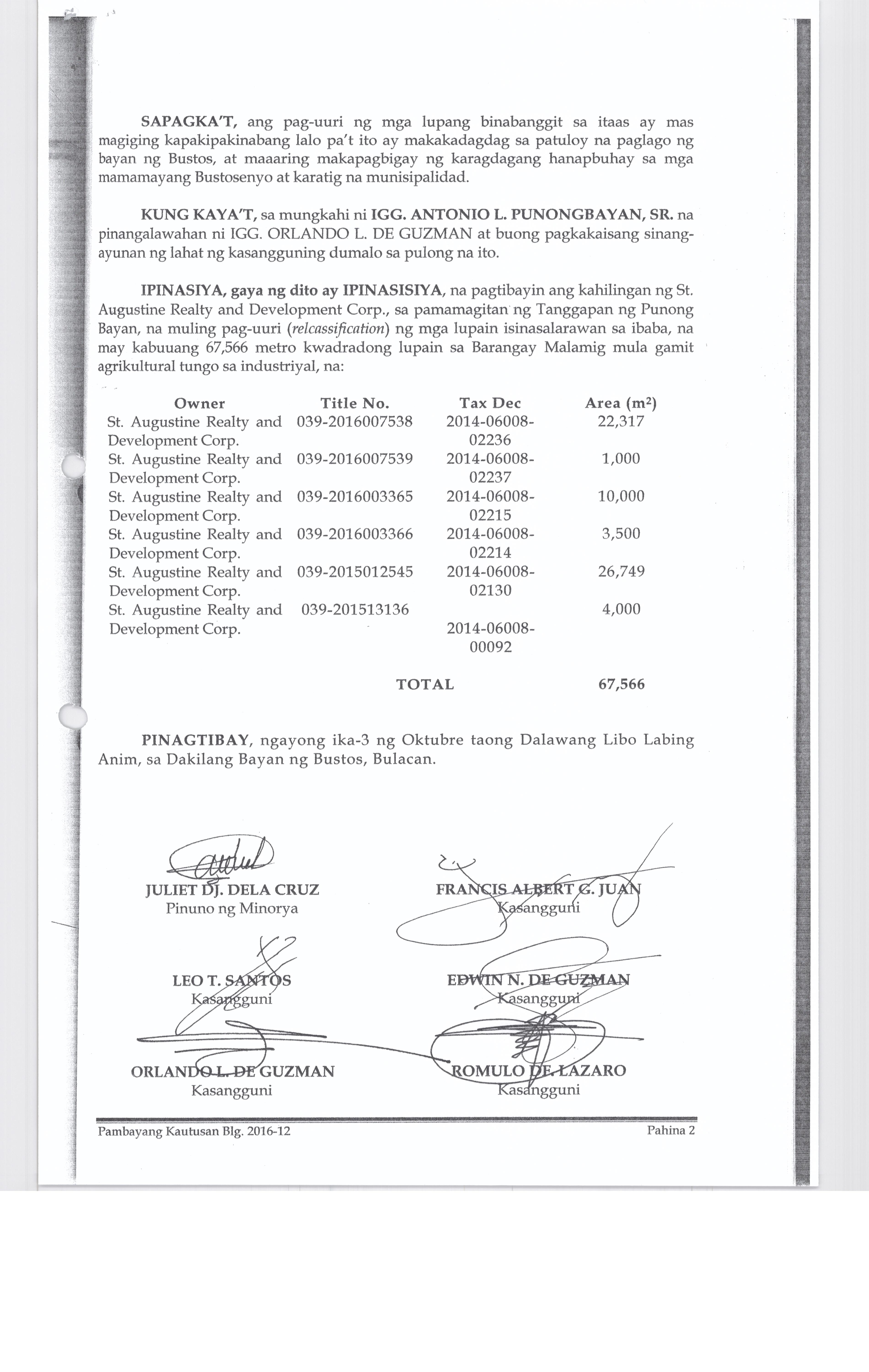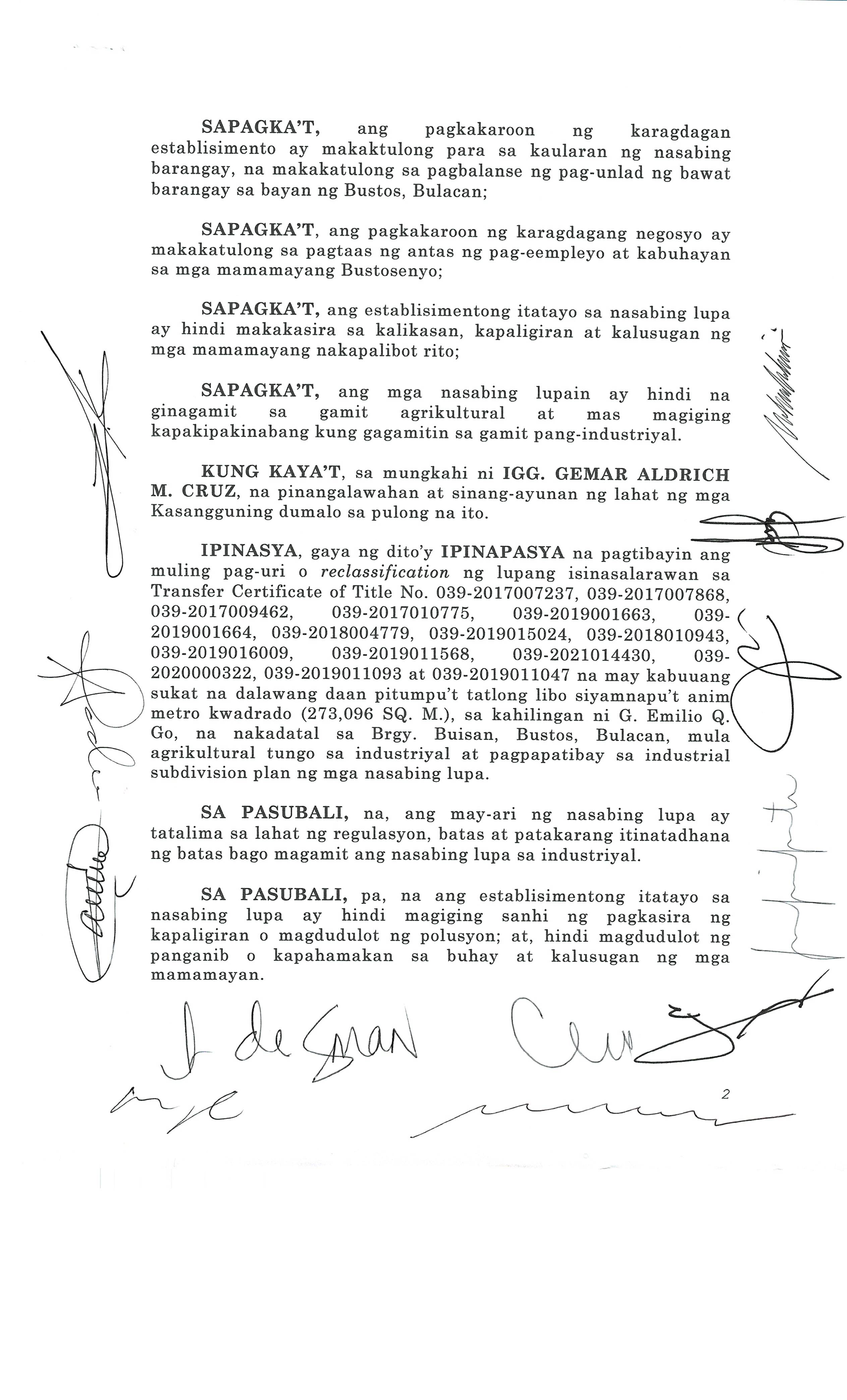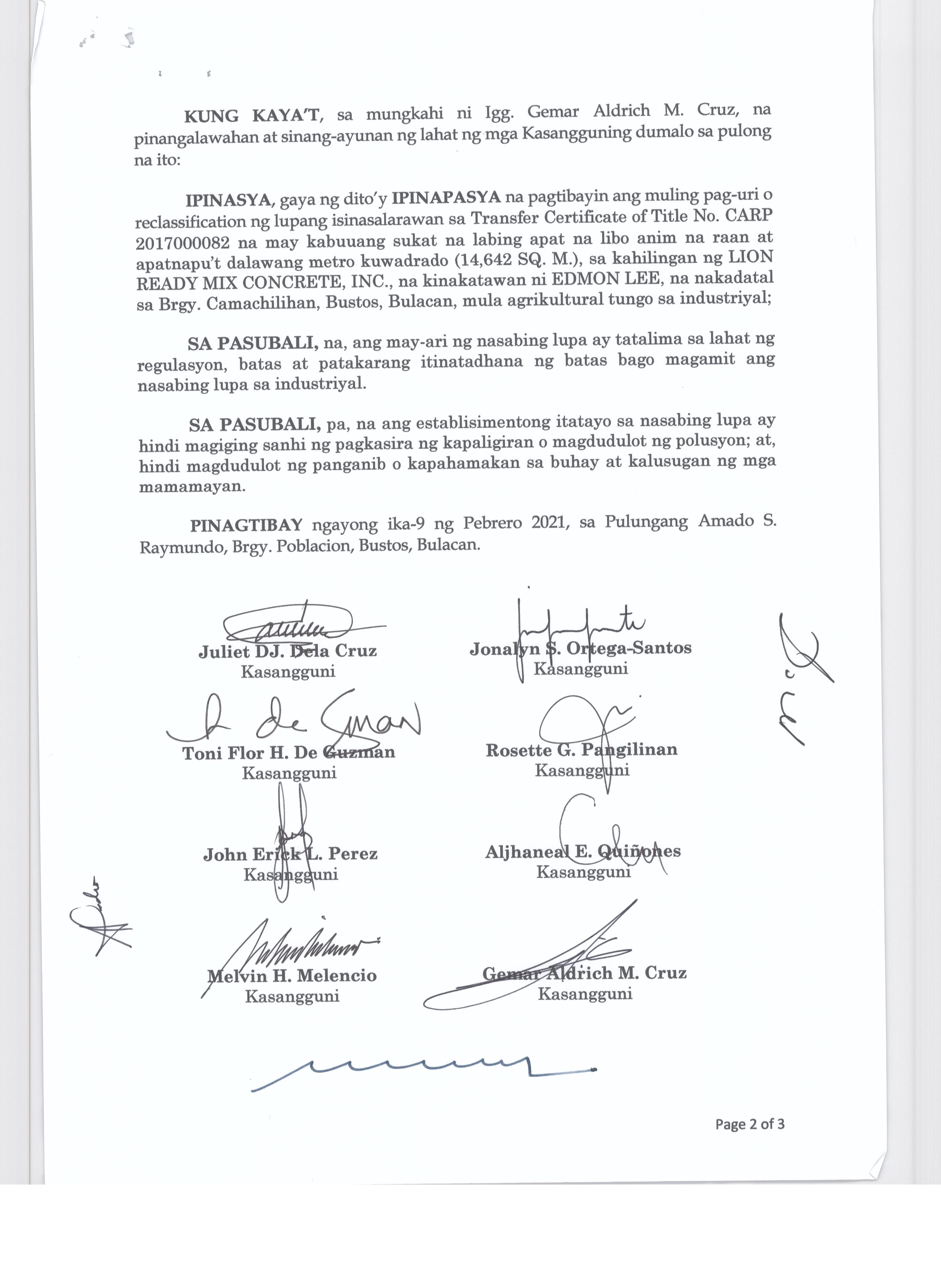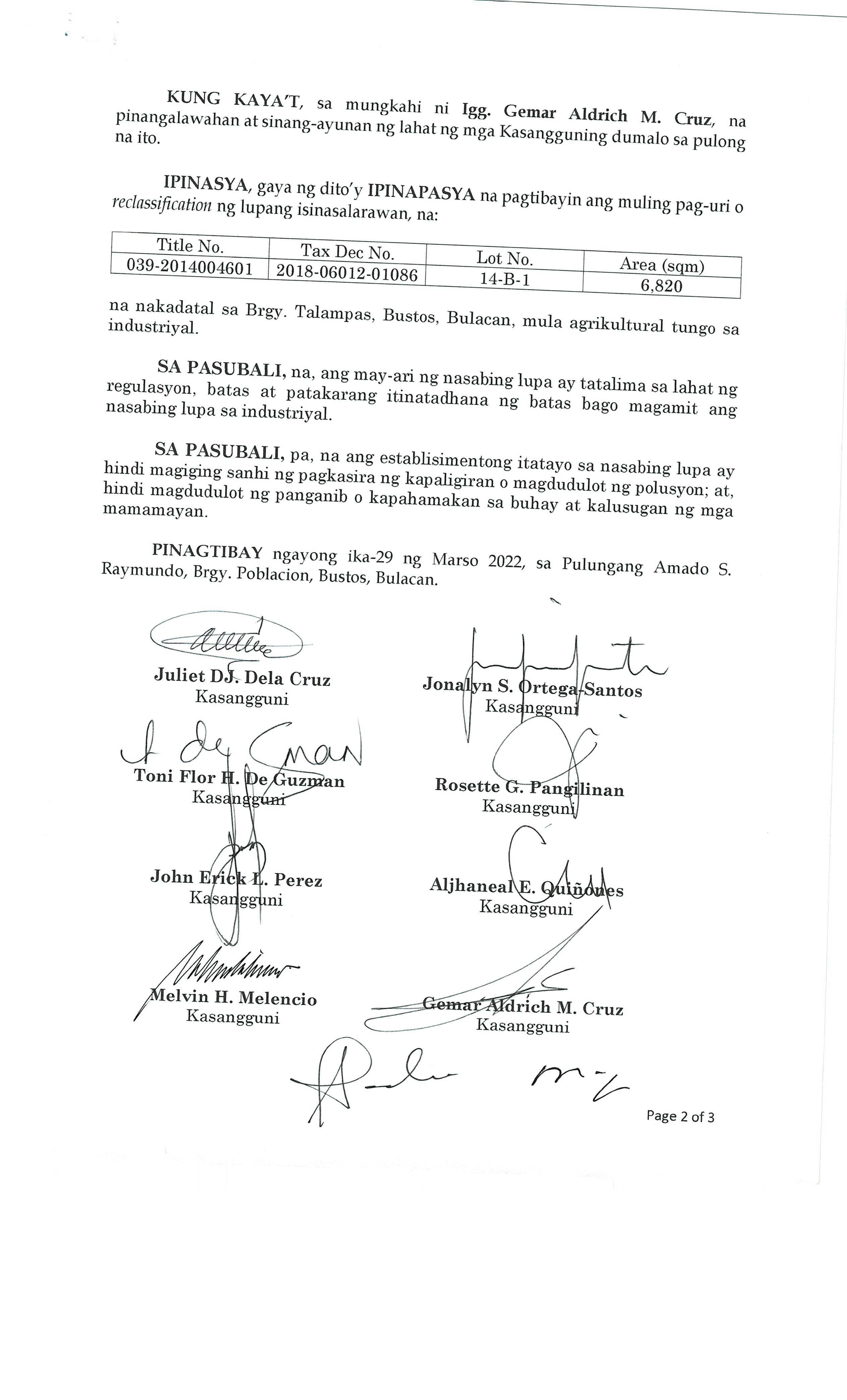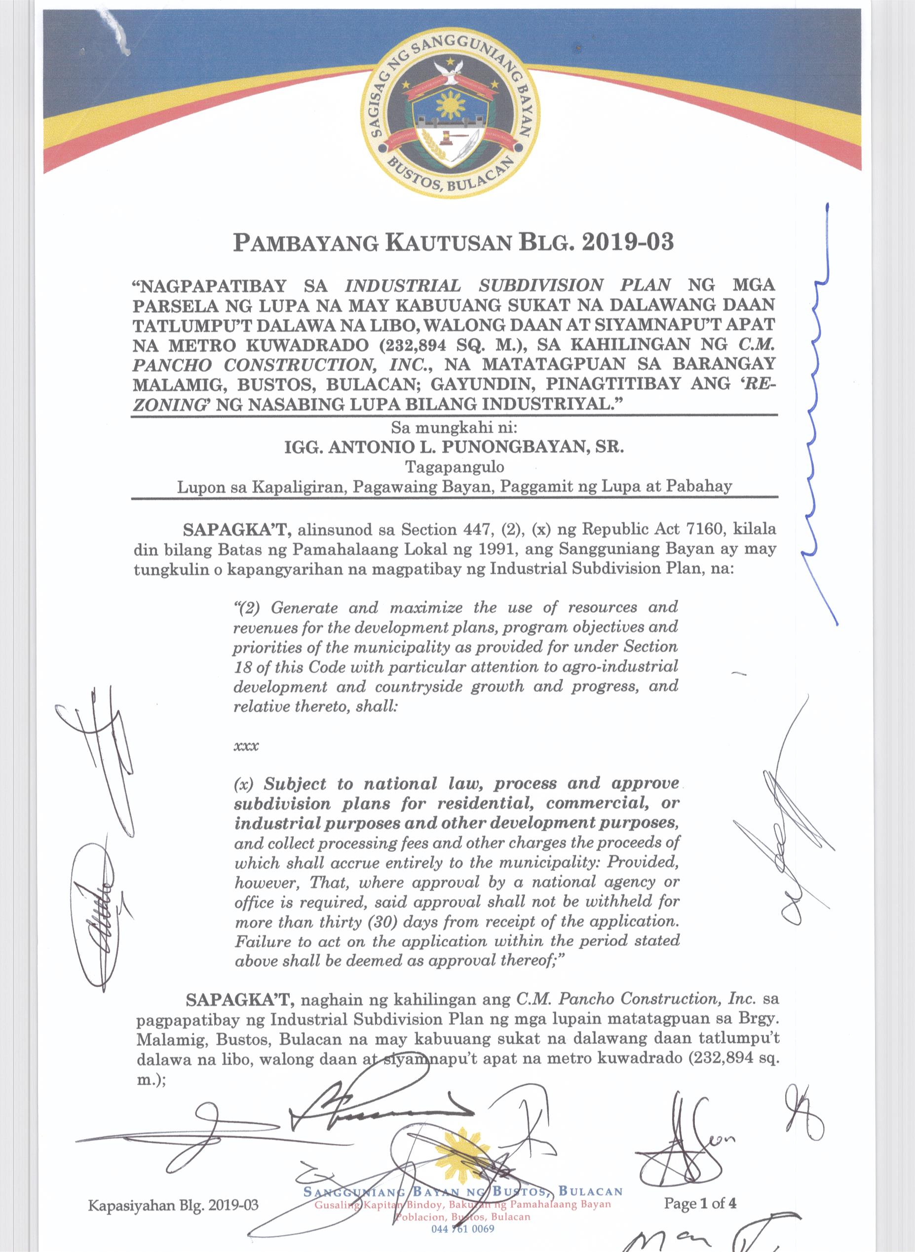 Pambayang Kautusang nagpapatibay sa kahilingan ni G. Adrian G. Santiago na muling pag-uuri ng lupa sa Barangay Bonga Menor Bustos Bulacan na may sukat na 2 ektarya buhat sa kabuuangsukat na 4.3 ektarya na isinasalarawan sa Transfer Certificate Title No. 039-2016006393 (LOT 4-A of the Subd. Plan PSD-03-177744)