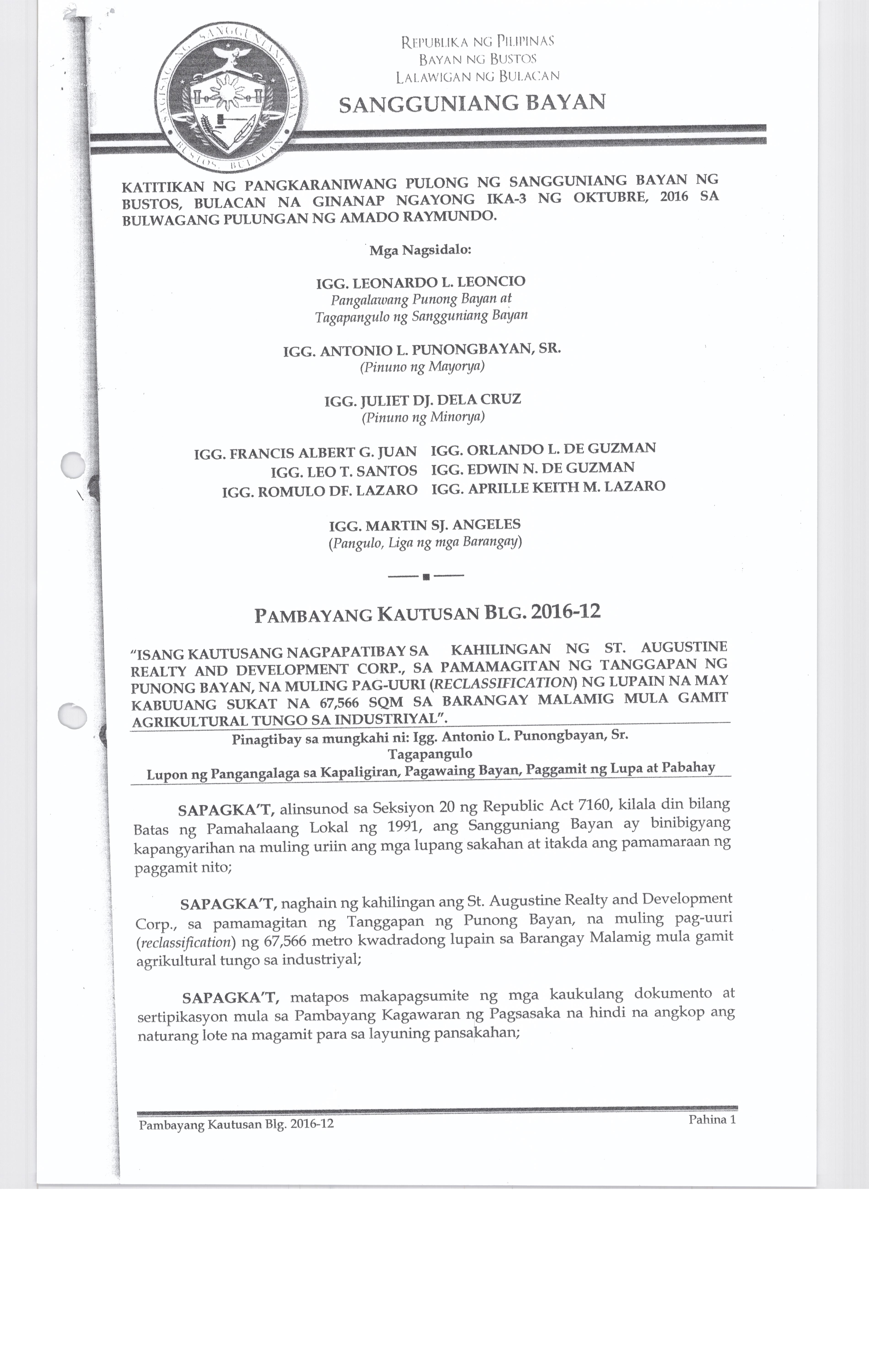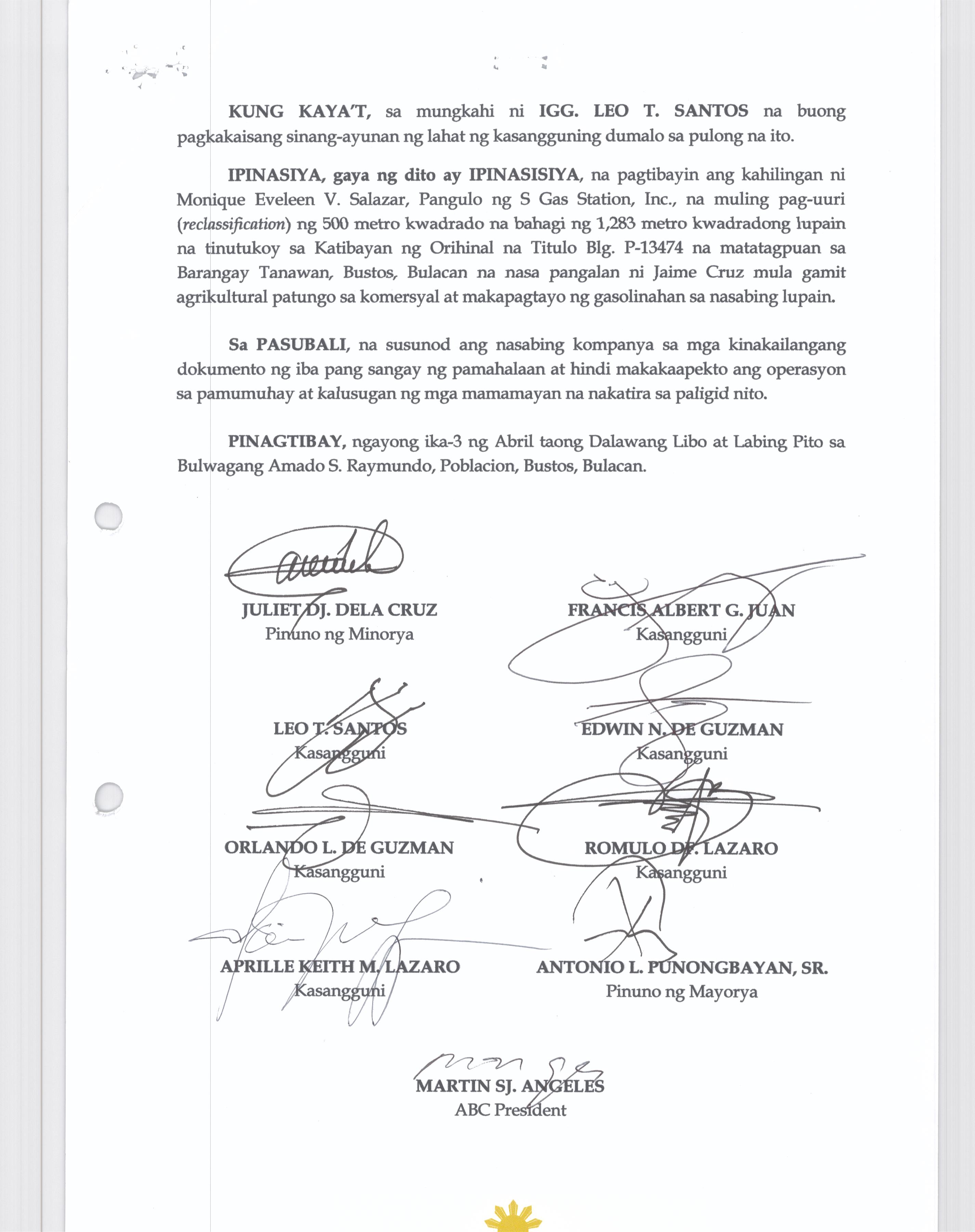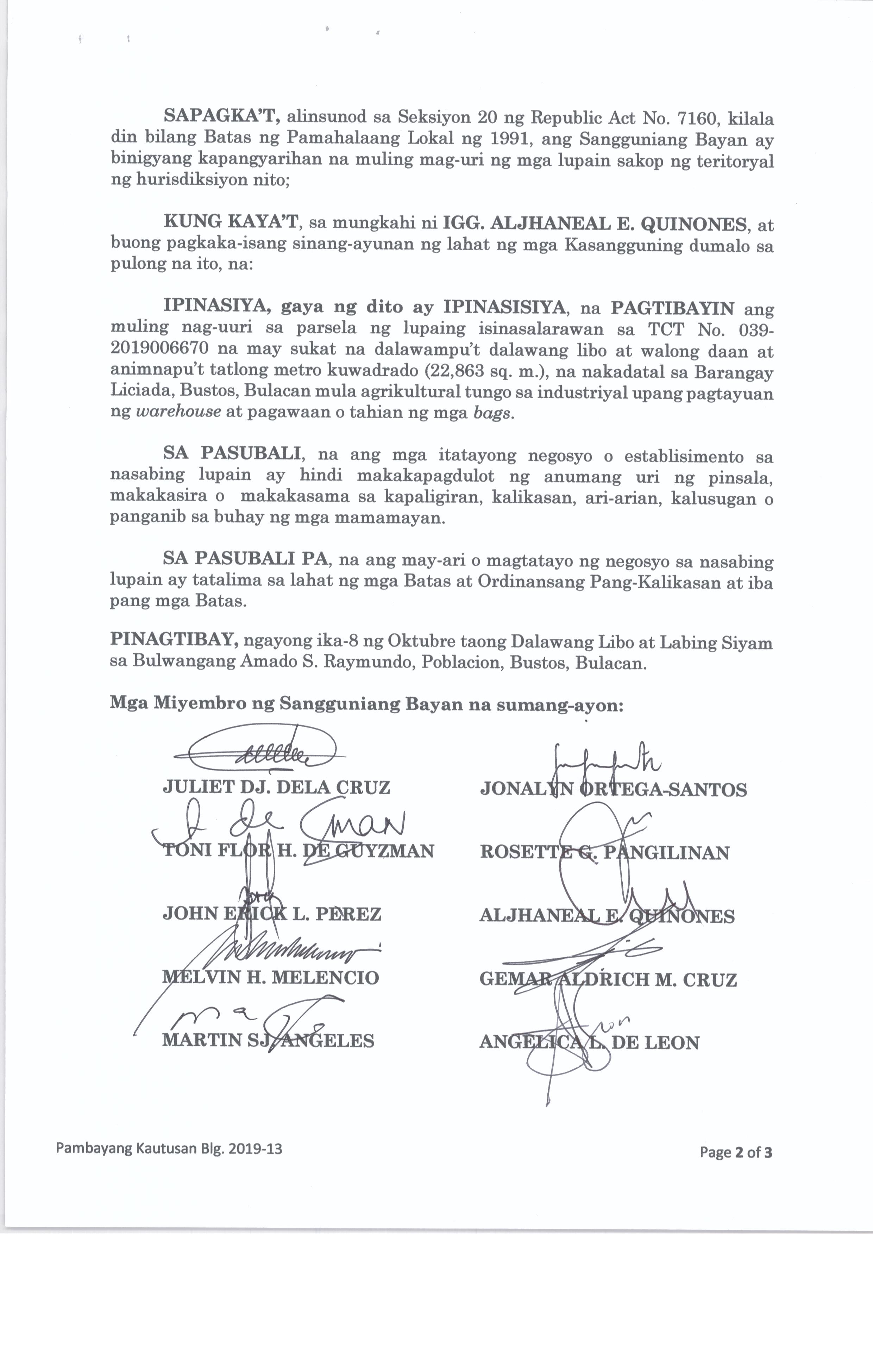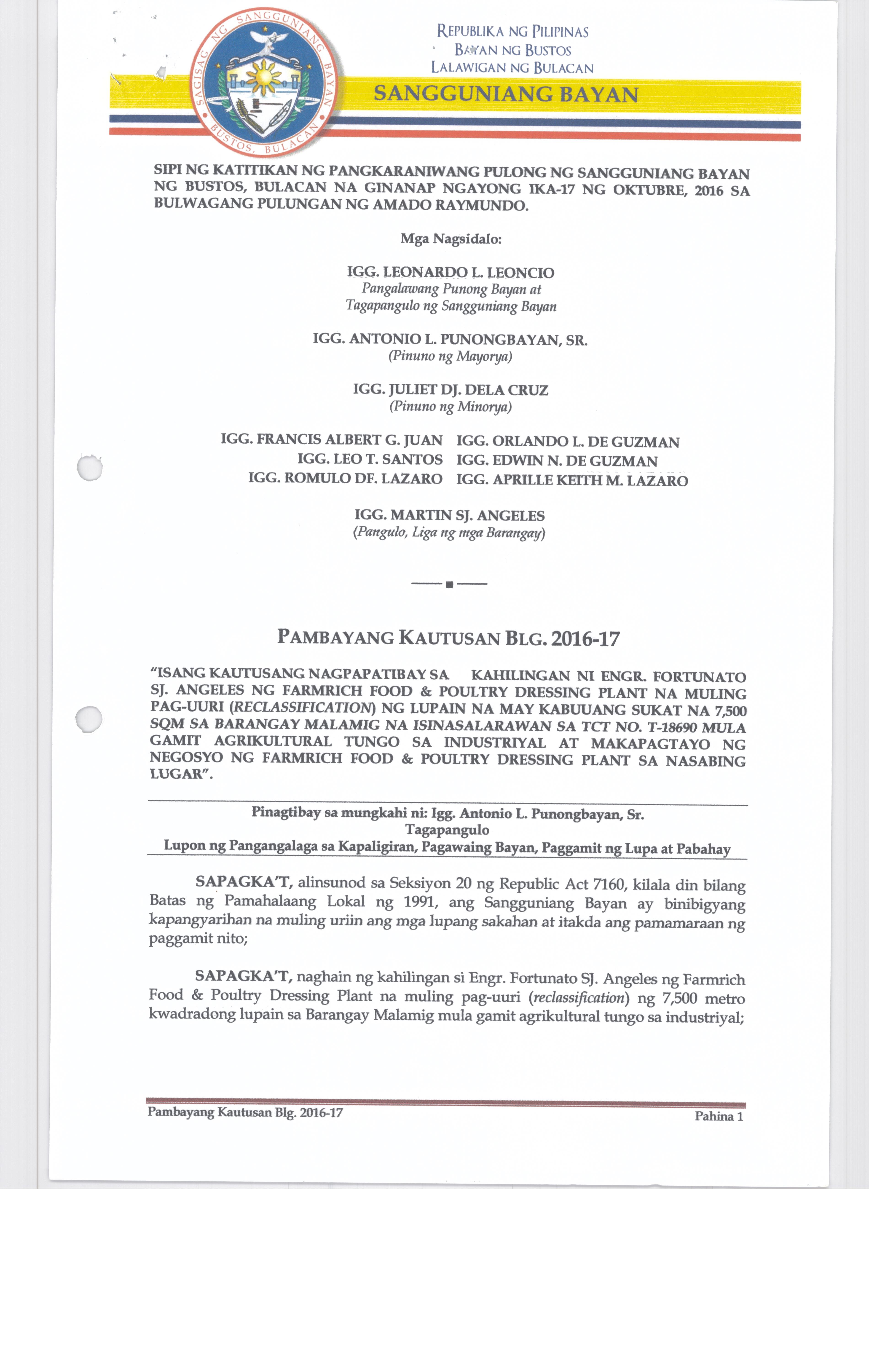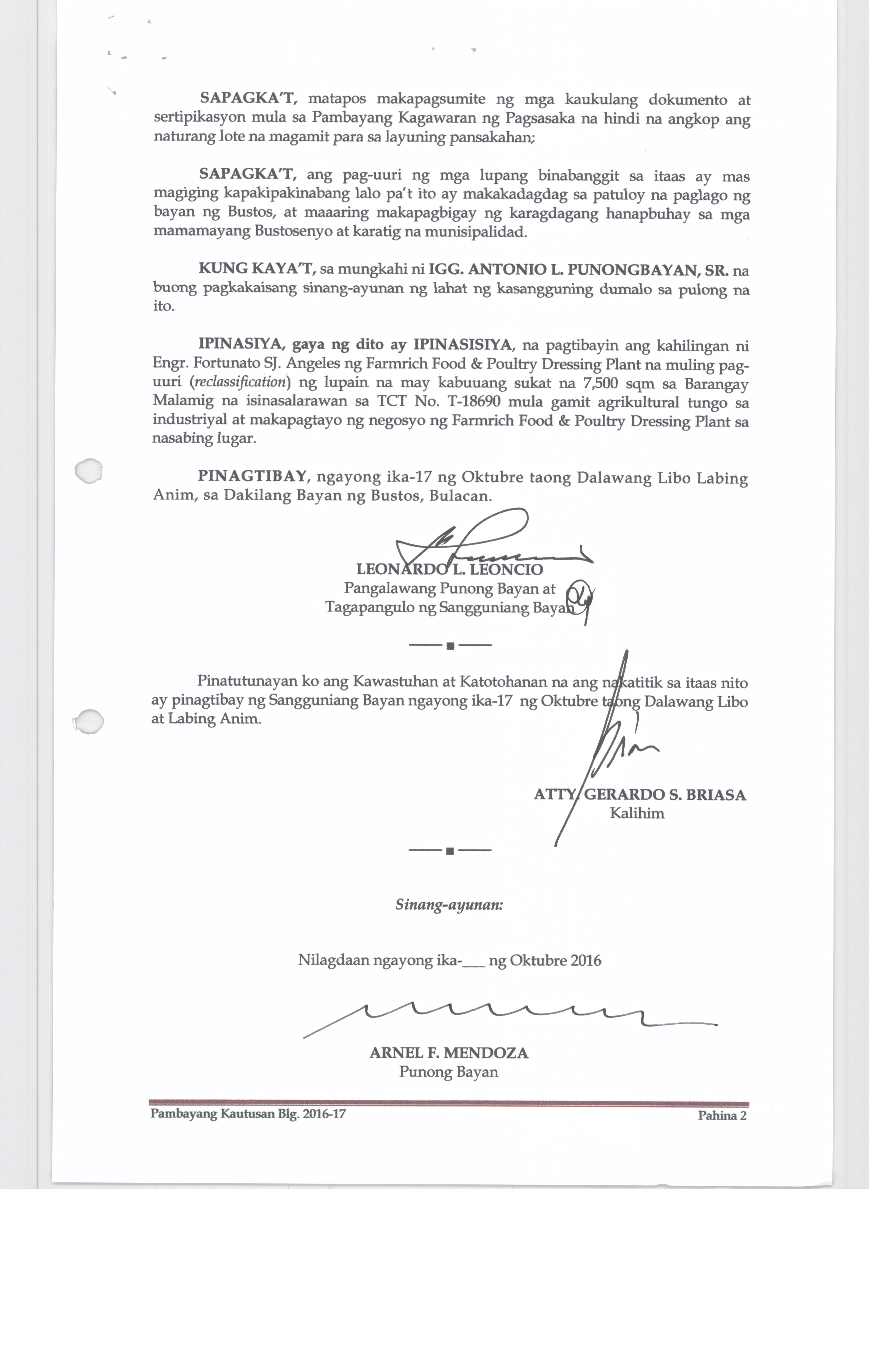 Pambayang Kautusang nagpapatibay sa kahilingan ni G. Adrian G. Santiago na muling pag-uuri ng lupa sa Barangay Bonga Menor Bustos Bulacan na may sukat na 2 ektarya buhat sa kabuuangsukat na 4.3 ektarya na isinasalarawan sa Transfer Certificate Title No. 039-2016006393 (LOT 4-A of the Subd. Plan PSD-03-177744)