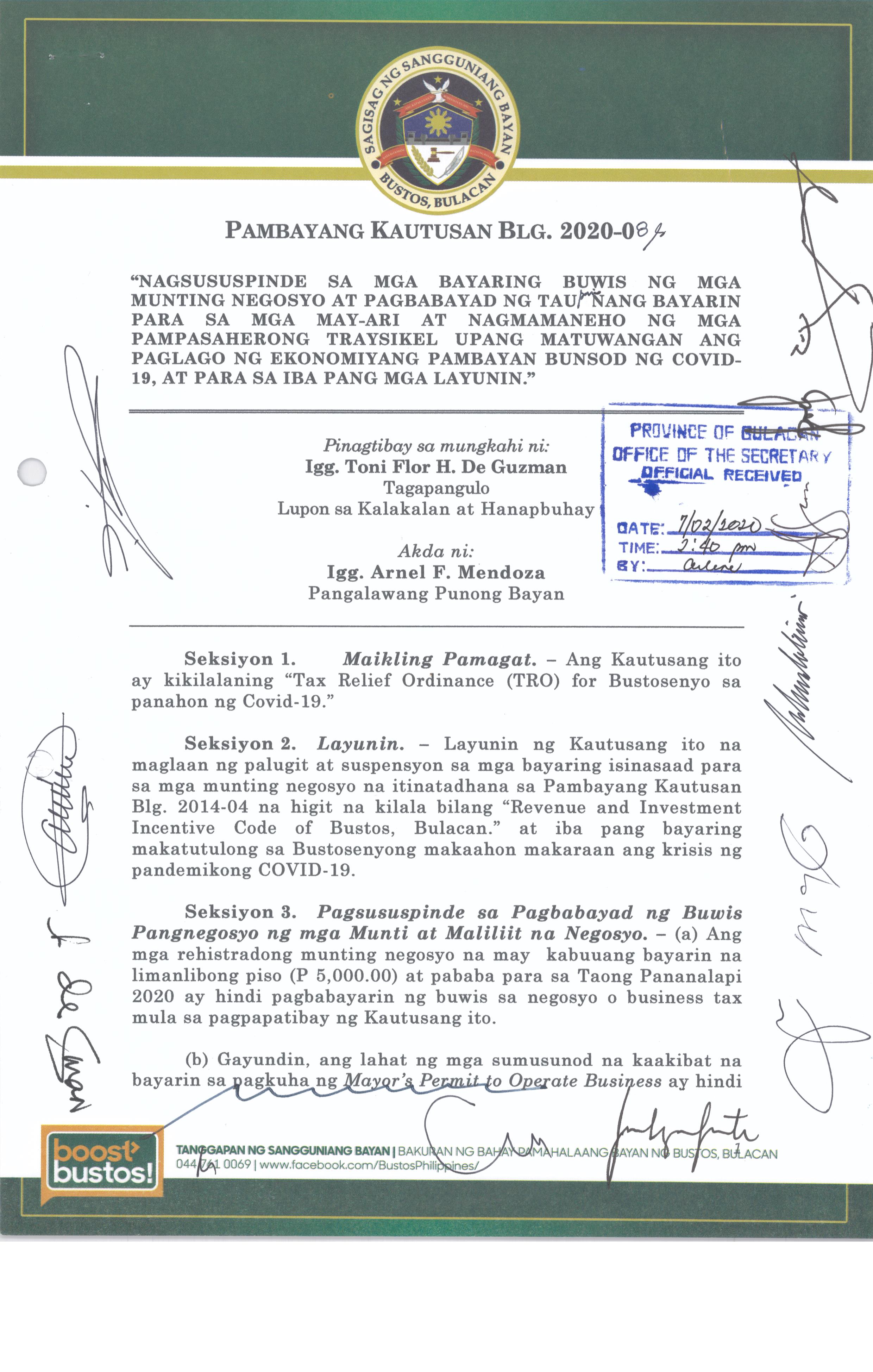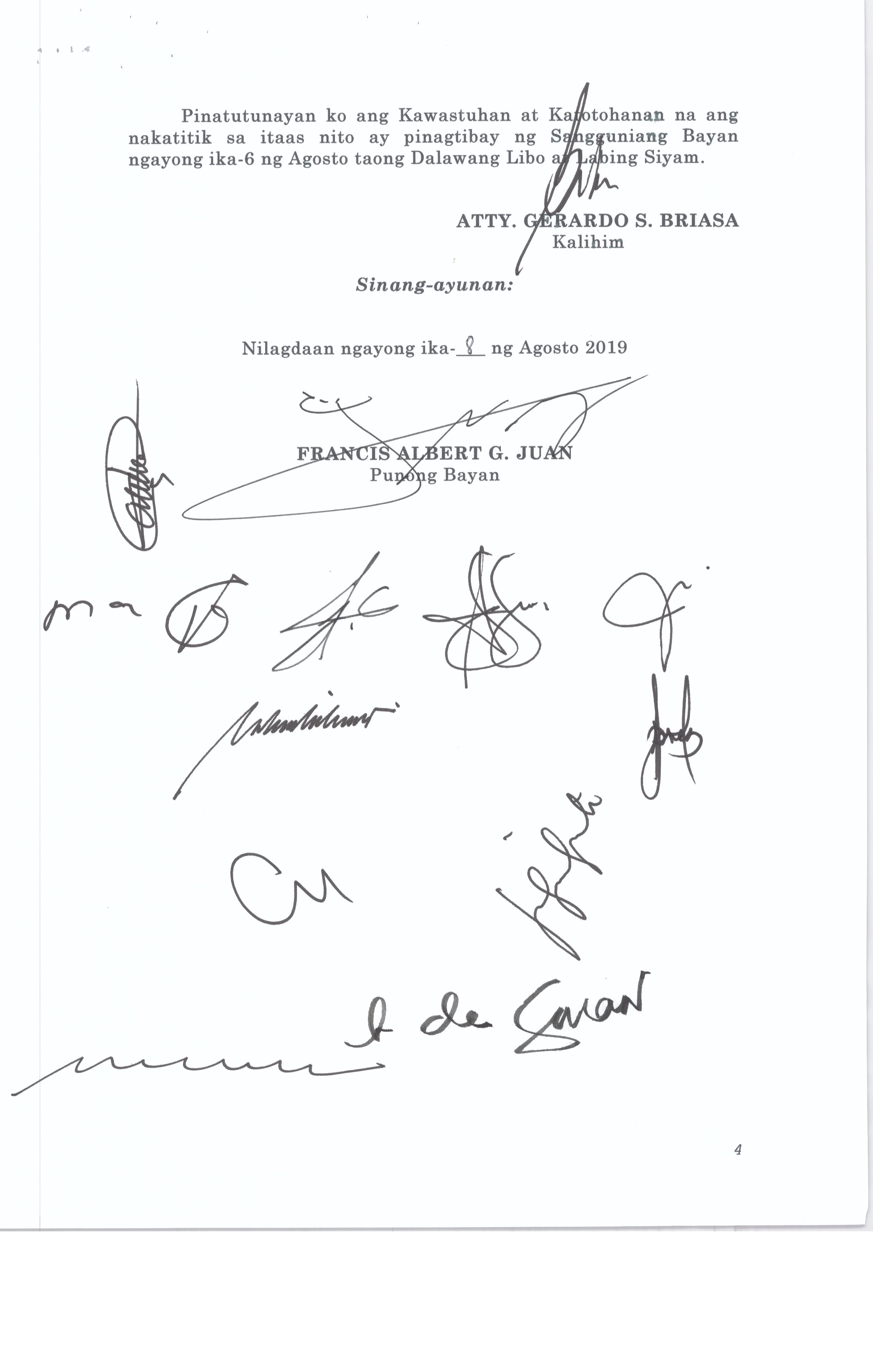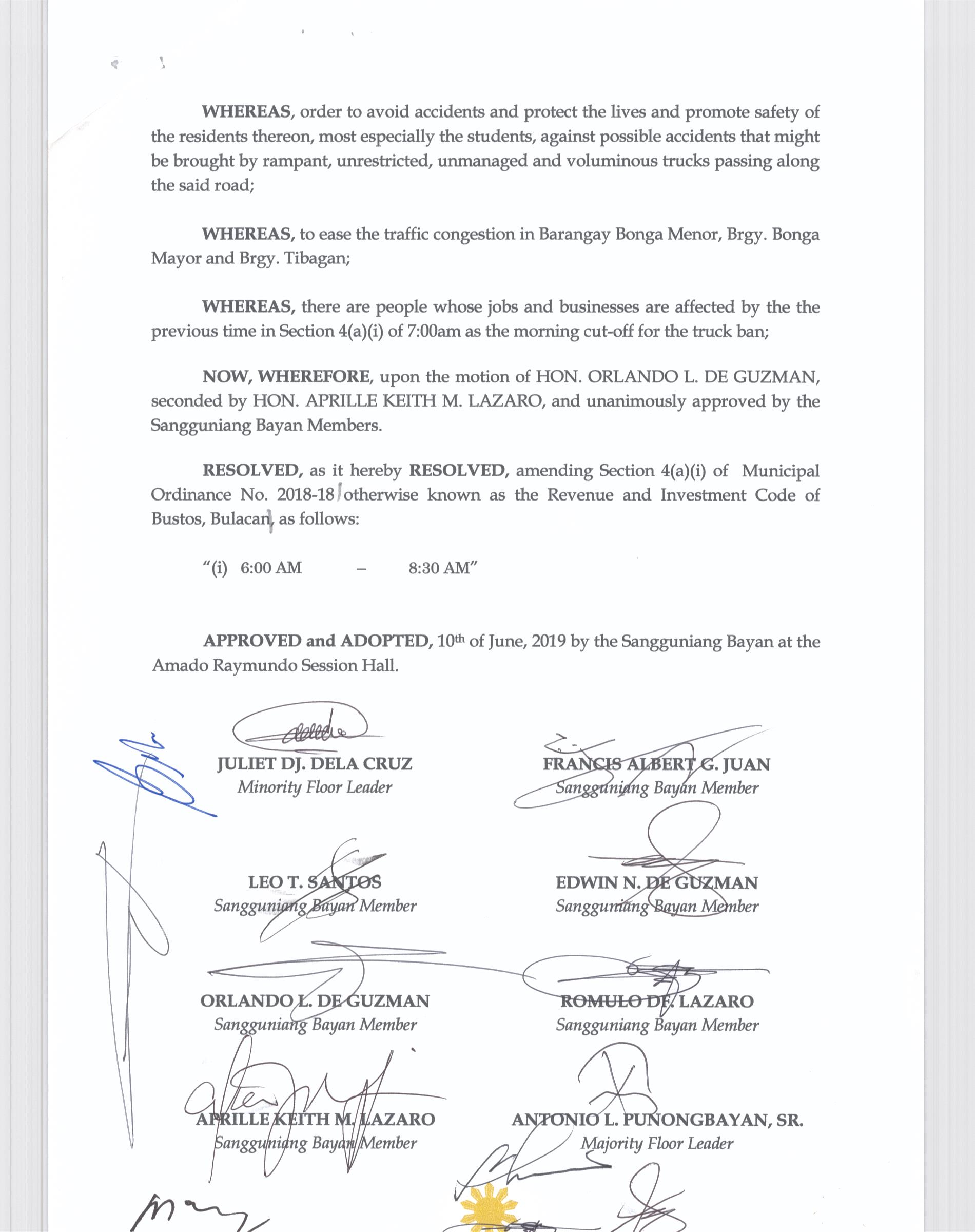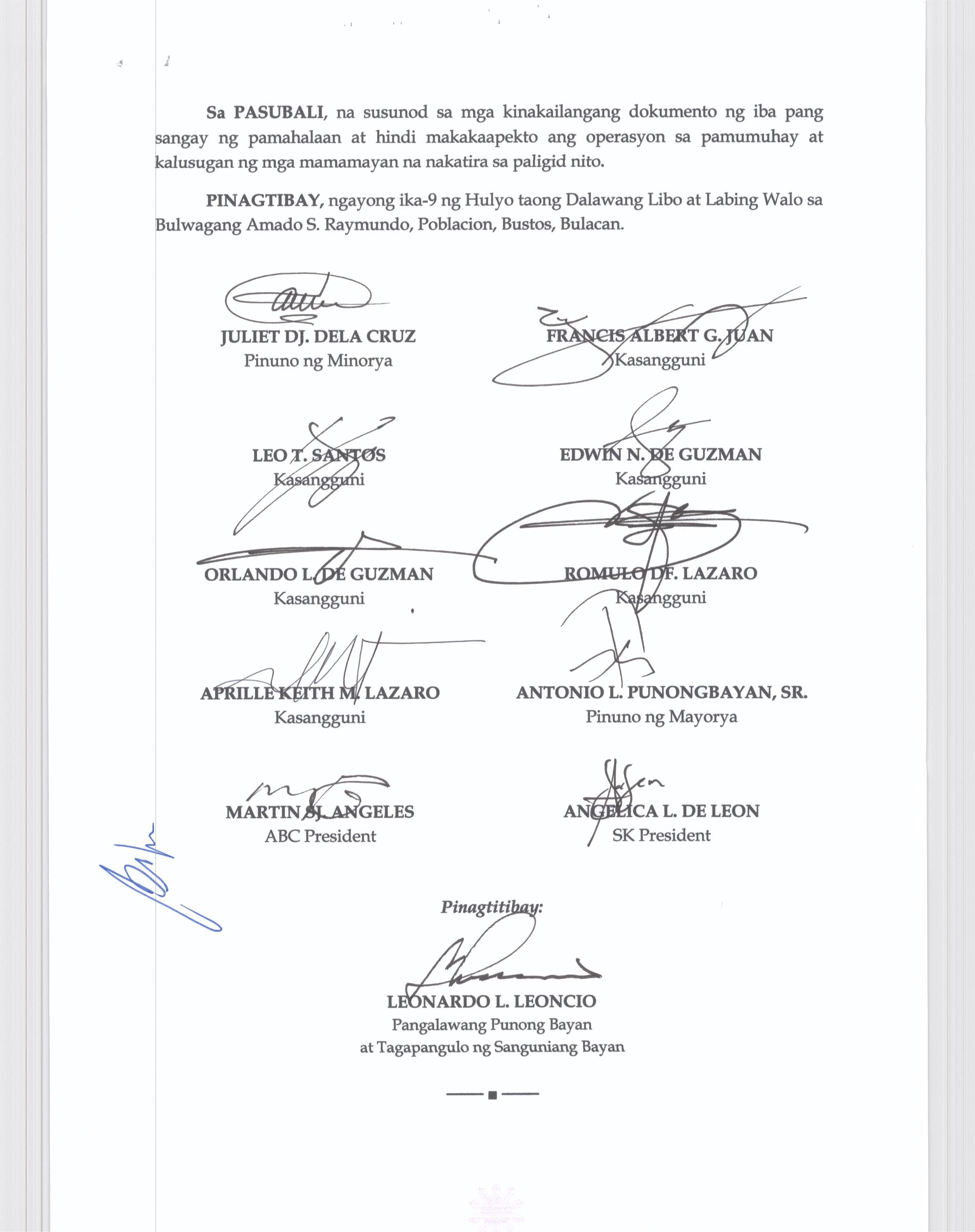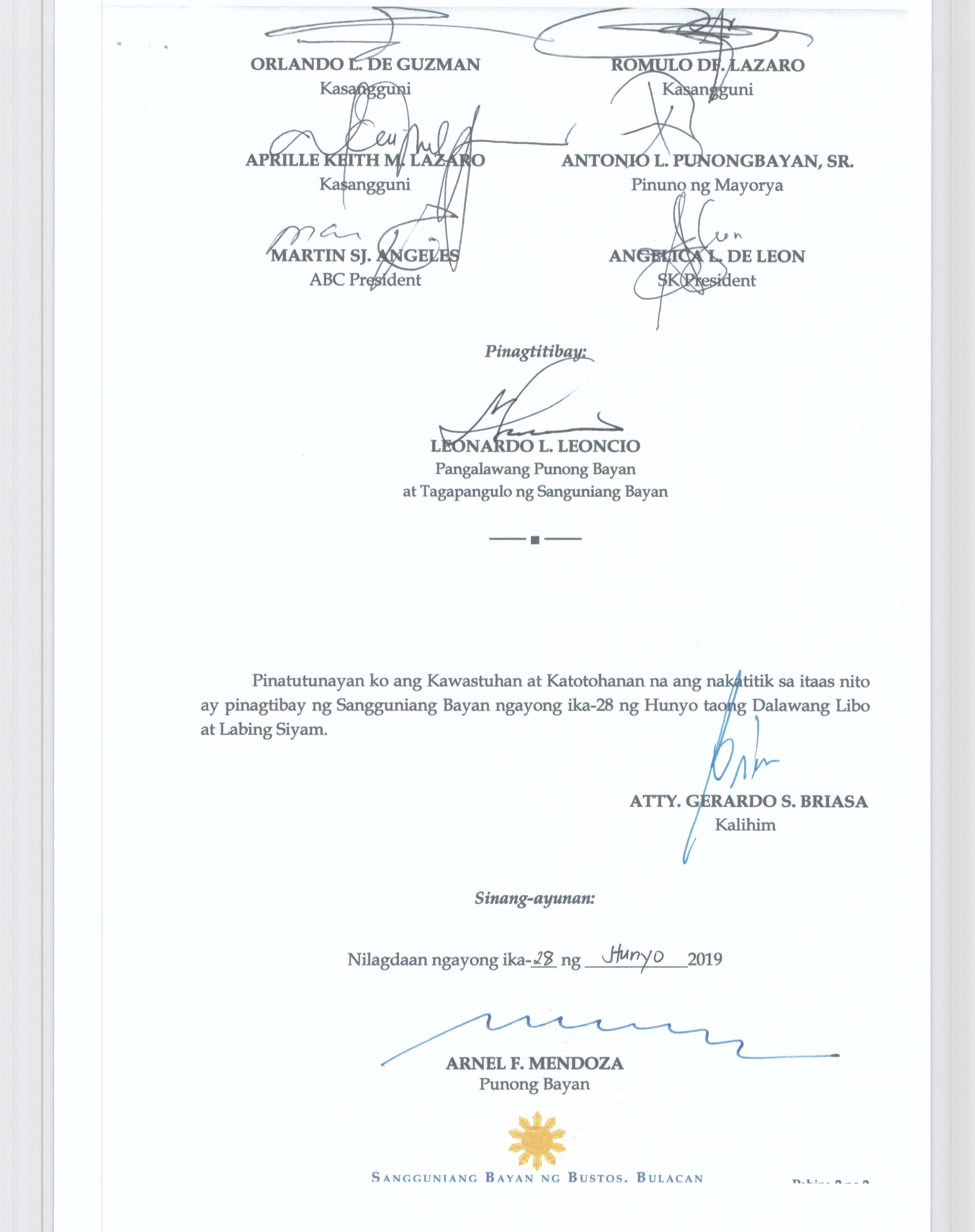 Pambayang Kautusang nagpapatibay sa kahilingan ni G. Adrian G. Santiago na muling pag-uuri ng lupa sa Barangay Bonga Menor Bustos Bulacan na may sukat na 2 ektarya buhat sa kabuuangsukat na 4.3 ektarya na isinasalarawan sa Transfer Certificate Title No. 039-2016006393 (LOT 4-A of the Subd. Plan PSD-03-177744)