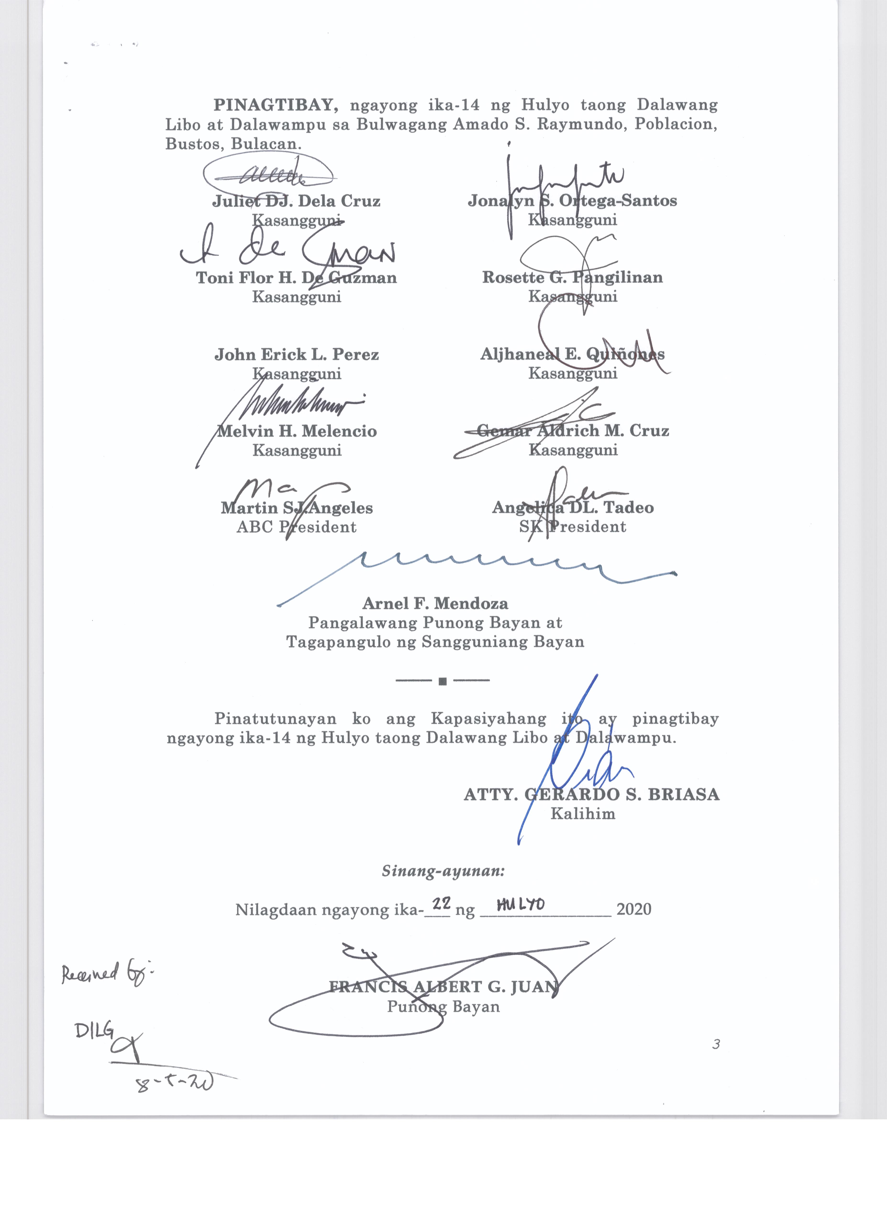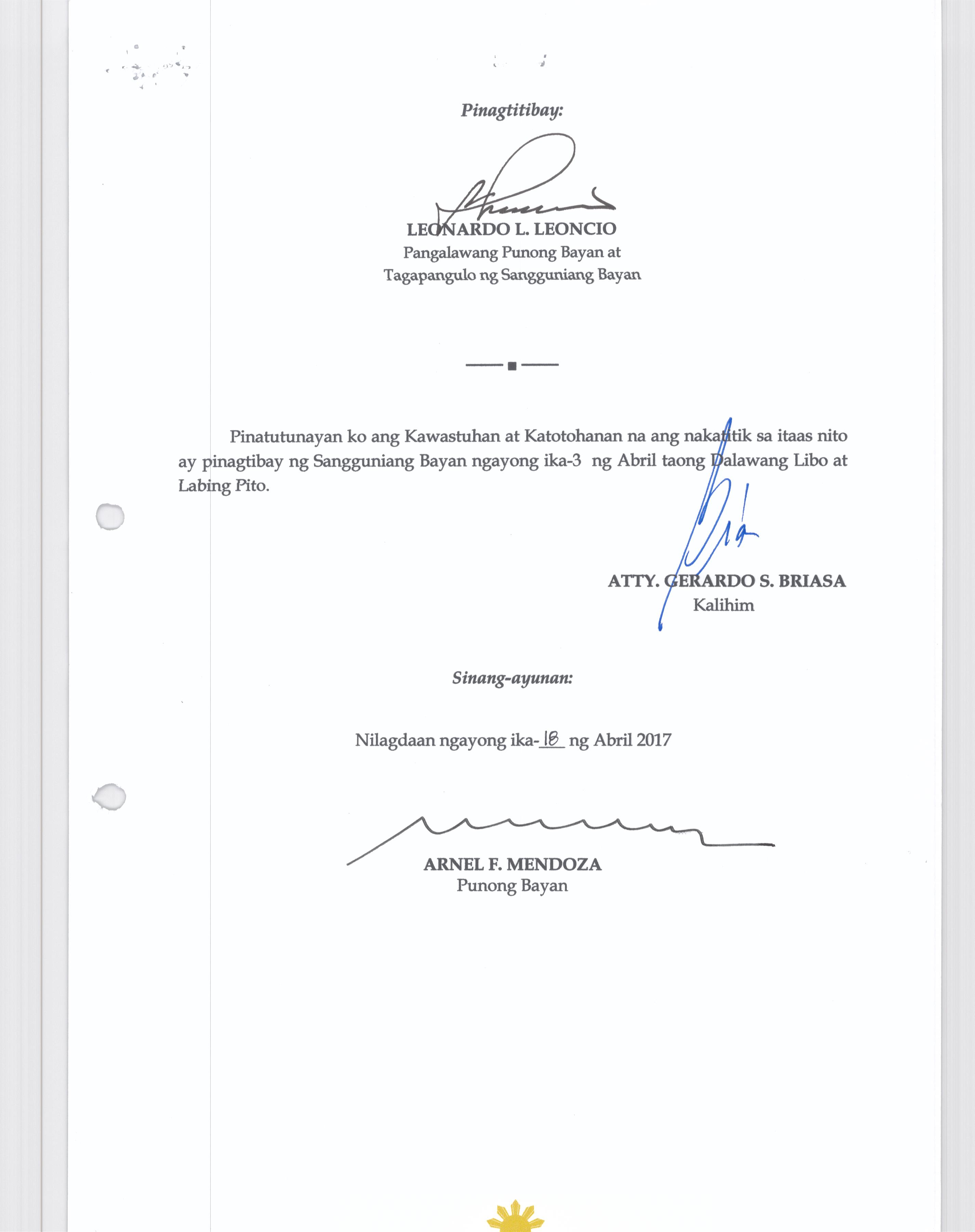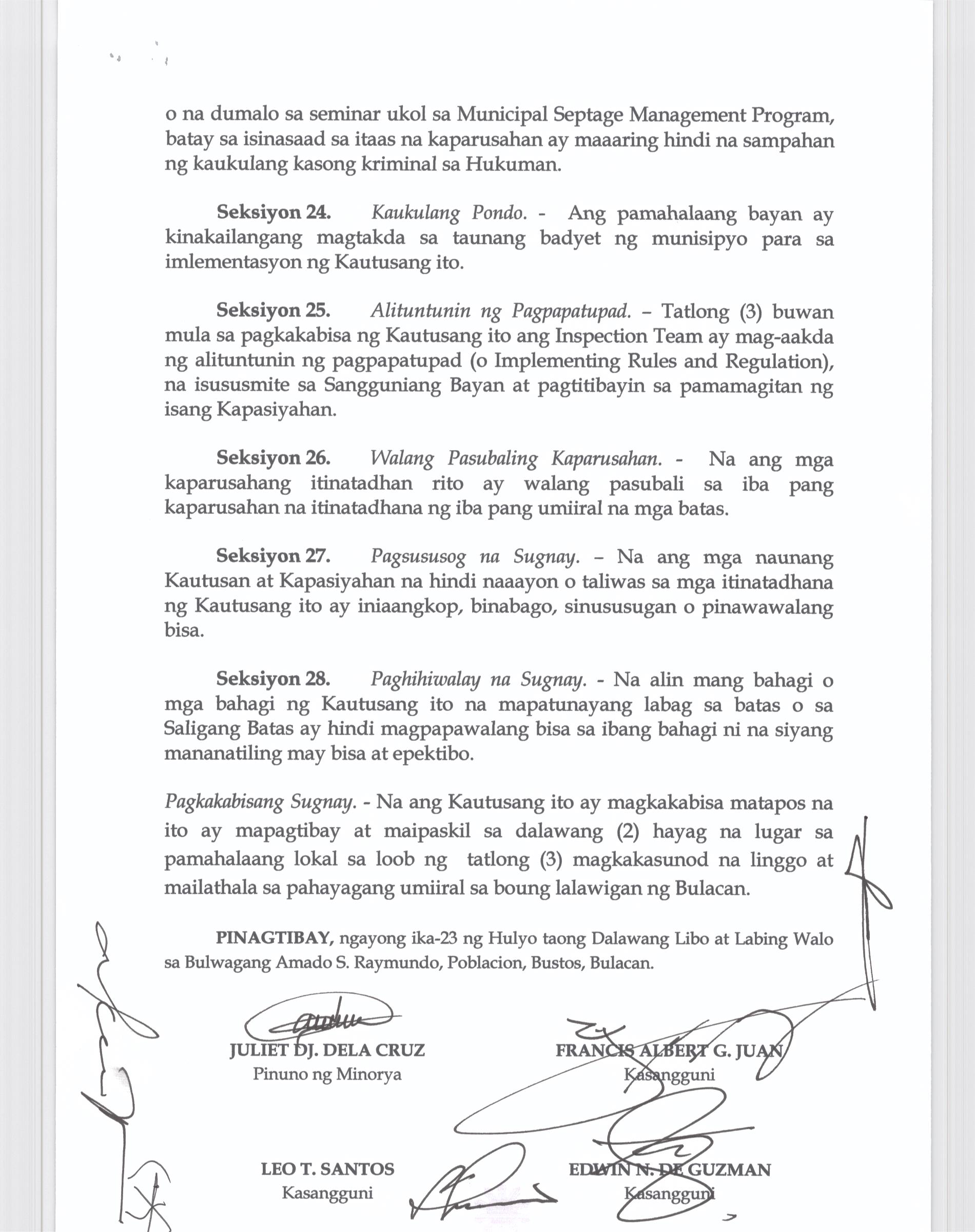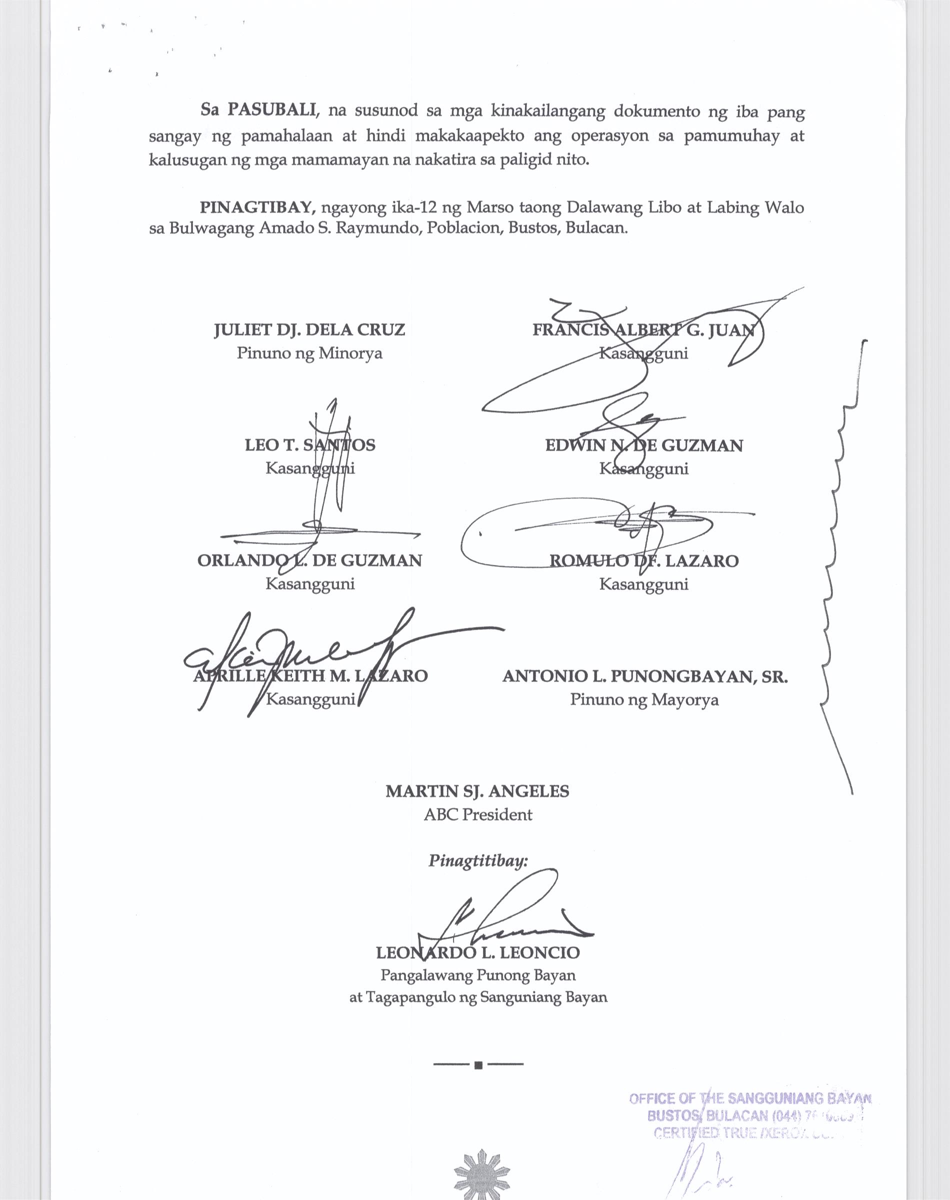 Pambayang Kautusang nagpapatibay sa kahilingan ni G. Adrian G. Santiago na muling pag-uuri ng lupa sa Barangay Bonga Menor Bustos Bulacan na may sukat na 2 ektarya buhat sa kabuuangsukat na 4.3 ektarya na isinasalarawan sa Transfer Certificate Title No. 039-2016006393 (LOT 4-A of the Subd. Plan PSD-03-177744)