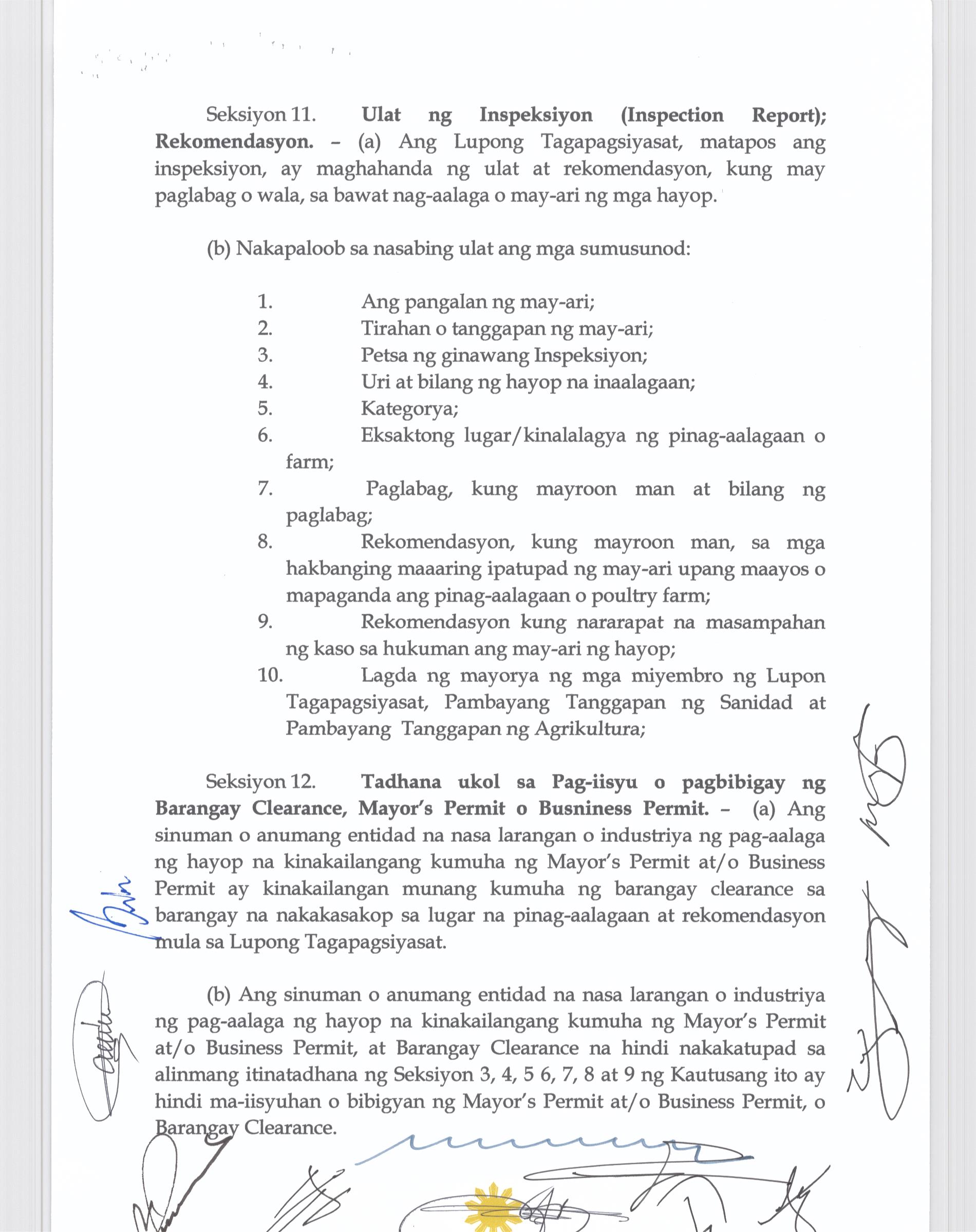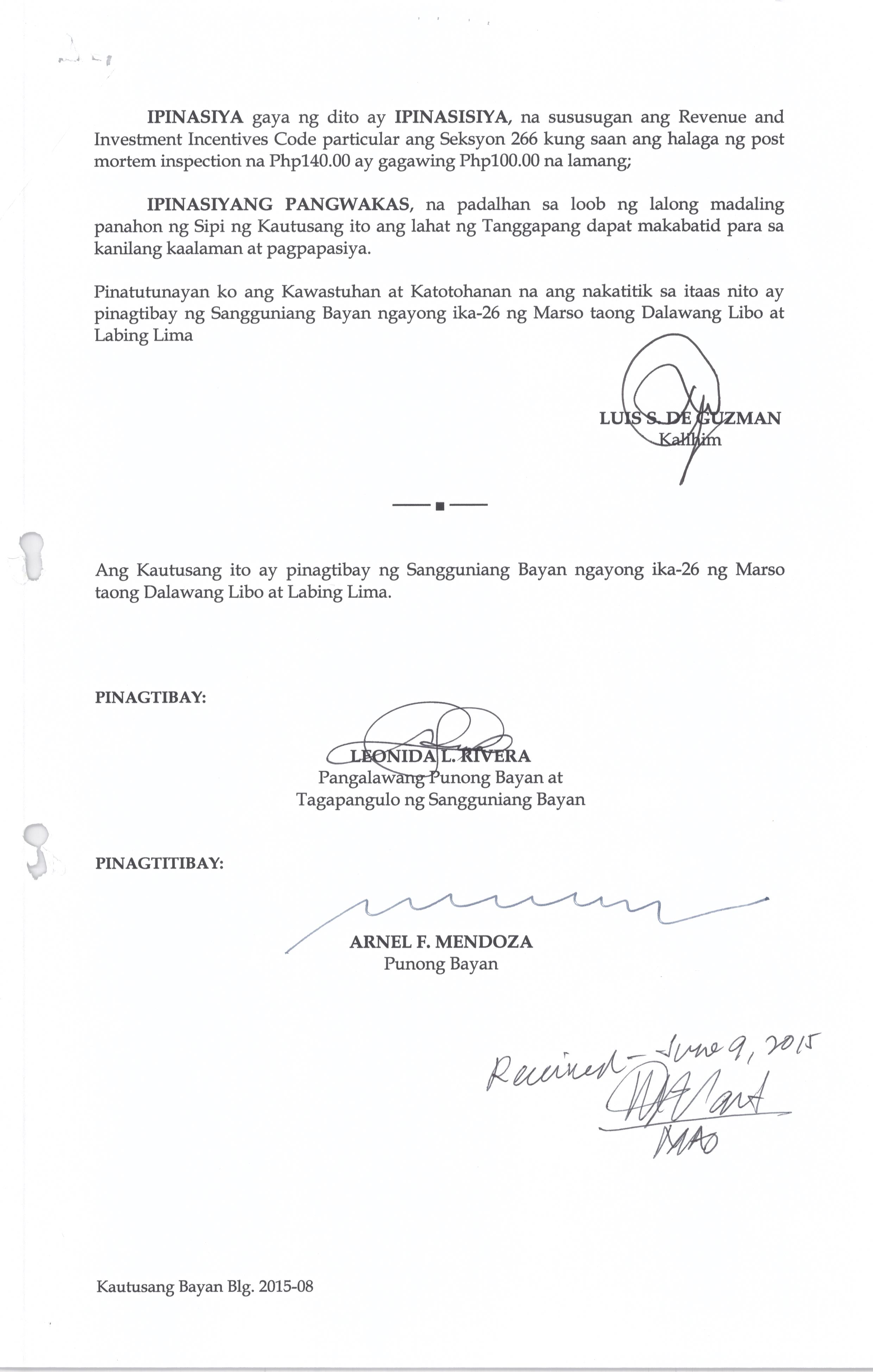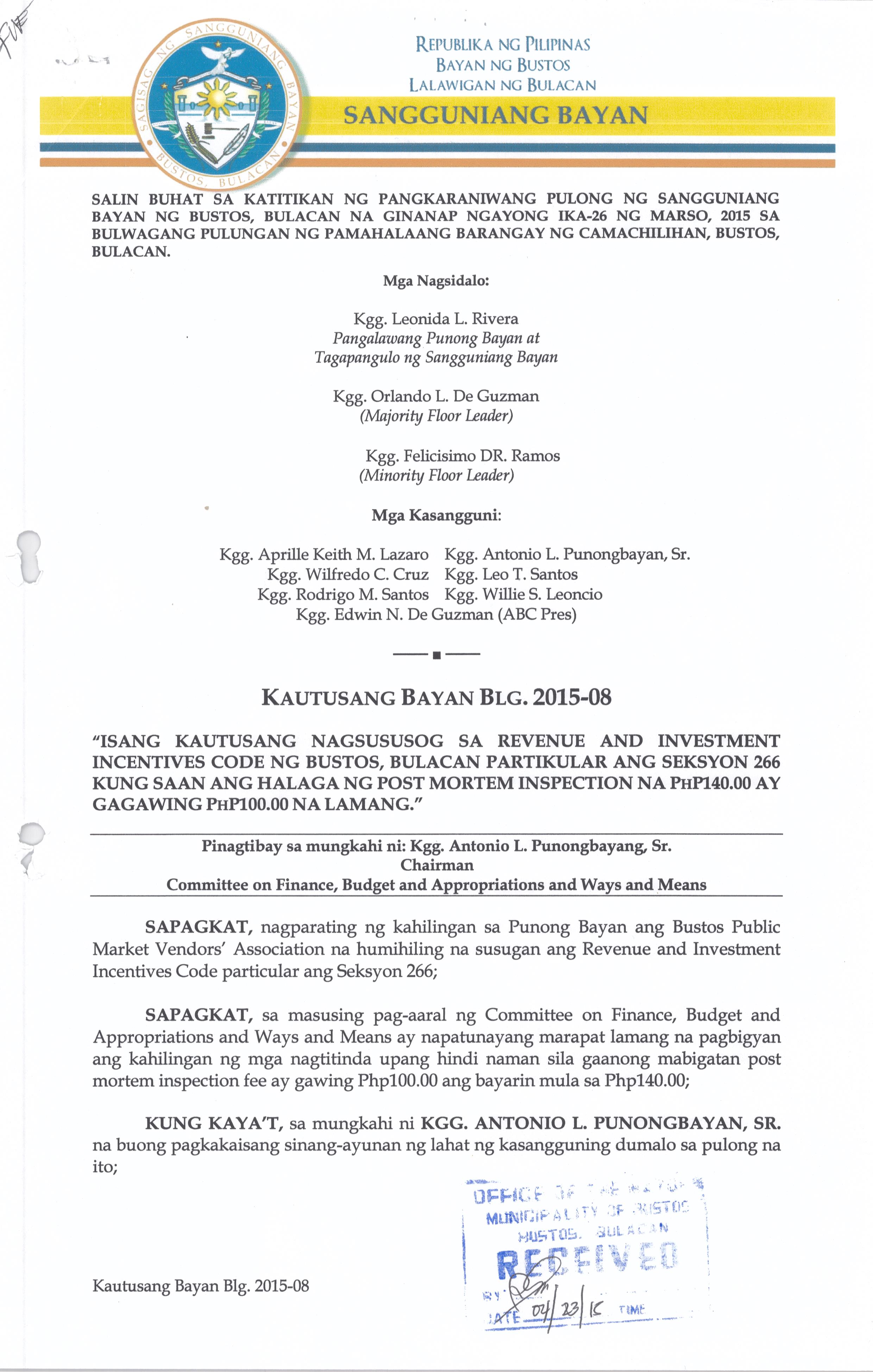 Isang kautusang Nagsususog sa Revenue and Investment Incentives Code ng Bustos BUalcan, Partikular sa Section 266 kung saan ang halaga ng Post Mortem Inspection na Php. 140.00 ay Gagawaing Php.100.00 na lamang.